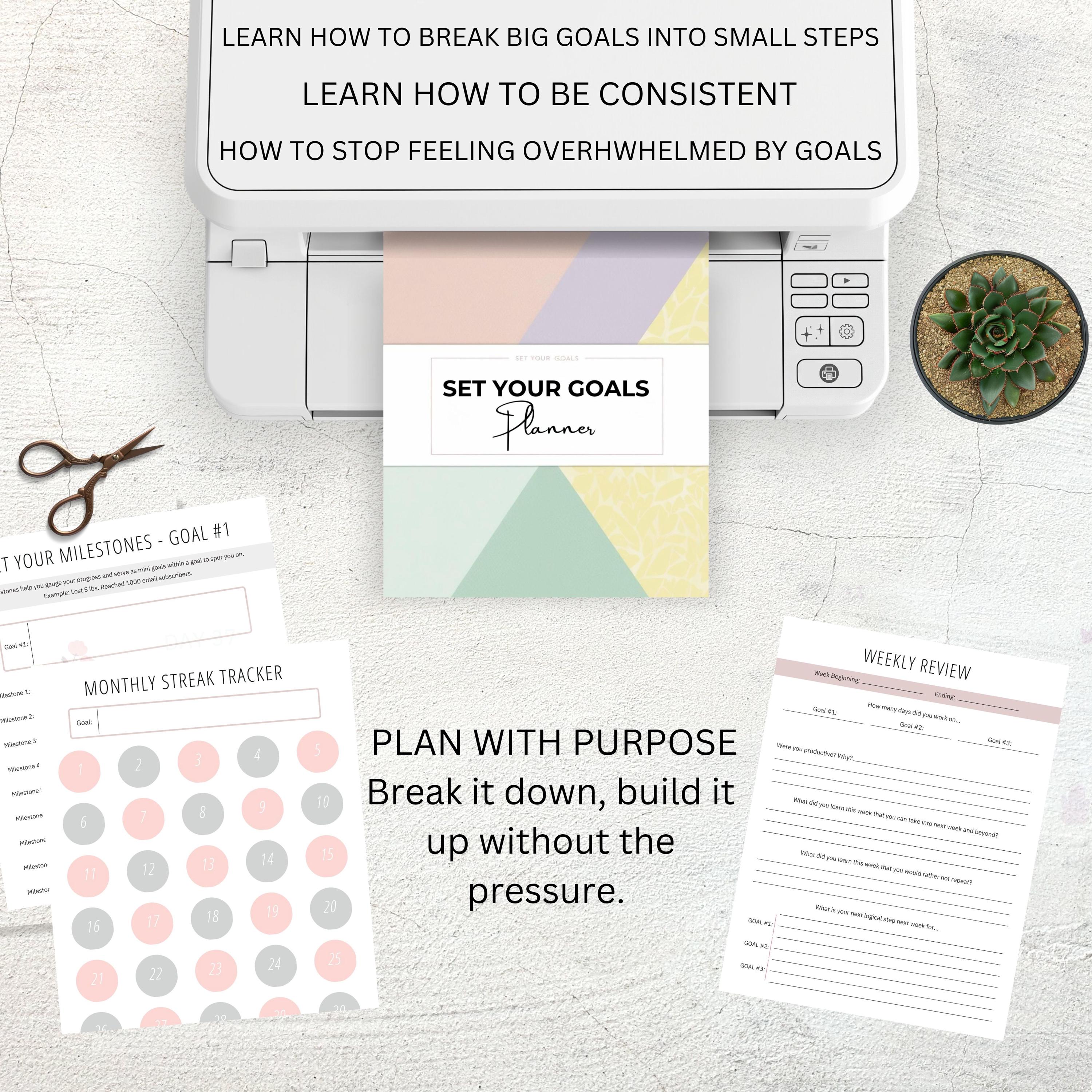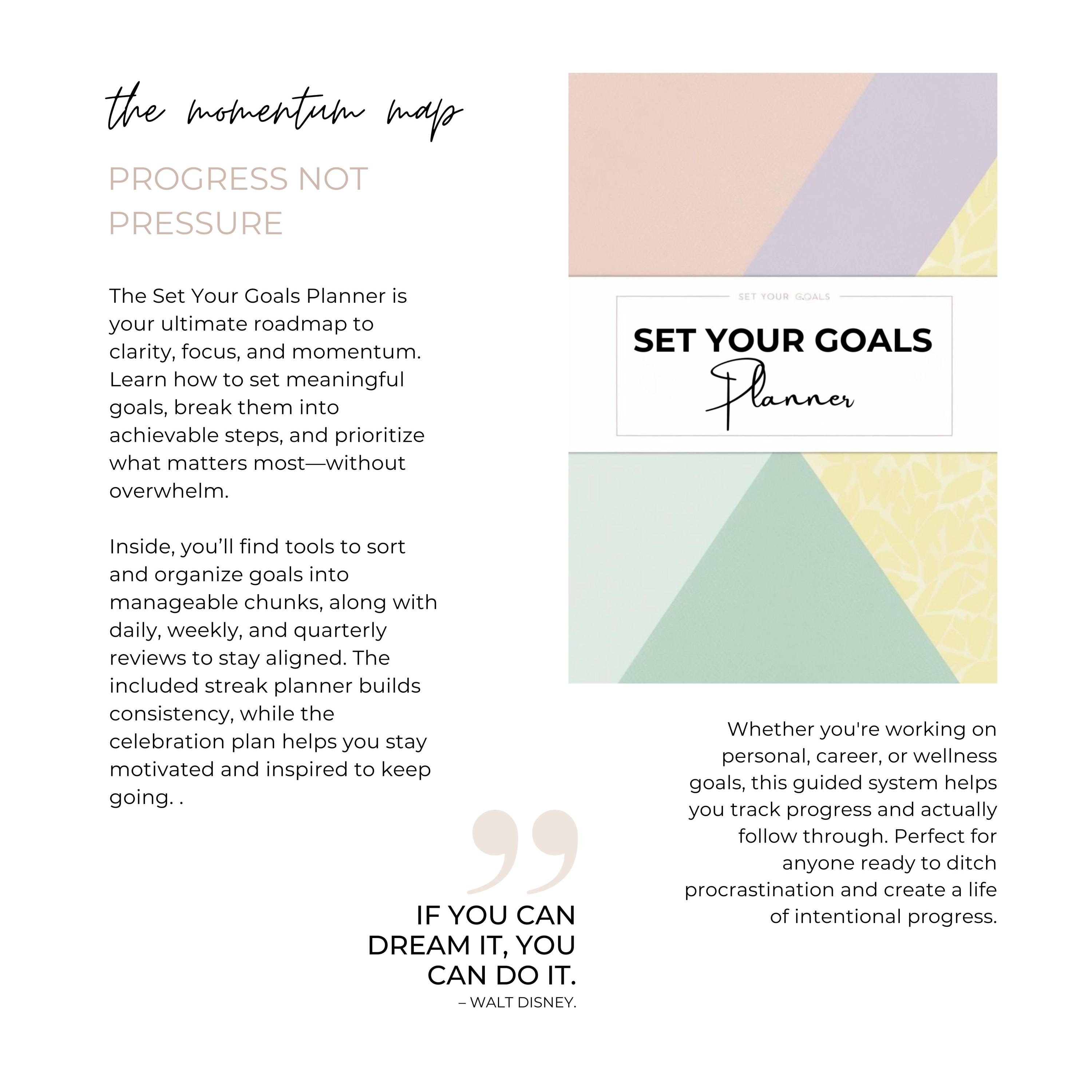 The Set Your Goals Planner is your ultimate roadmap to clarity, focus, and momentum. Learn how to set meaningful goals, break them into achievable steps, and prioritize what matters most without overwhelm. Inside, you’ll find tools to sort and organize goals into manageable chunks, along with daily, weekly, and quarterly reviews to stay aligned. The included streak planner builds consistency, while the celebration plan helps you stay motivated and inspired to keep going. Whether you're working on personal, career, or wellness goals, this guided system helps you track progress and actually follow through. Perfect for anyone ready to ditch procrastination and create a life of intentional progress.