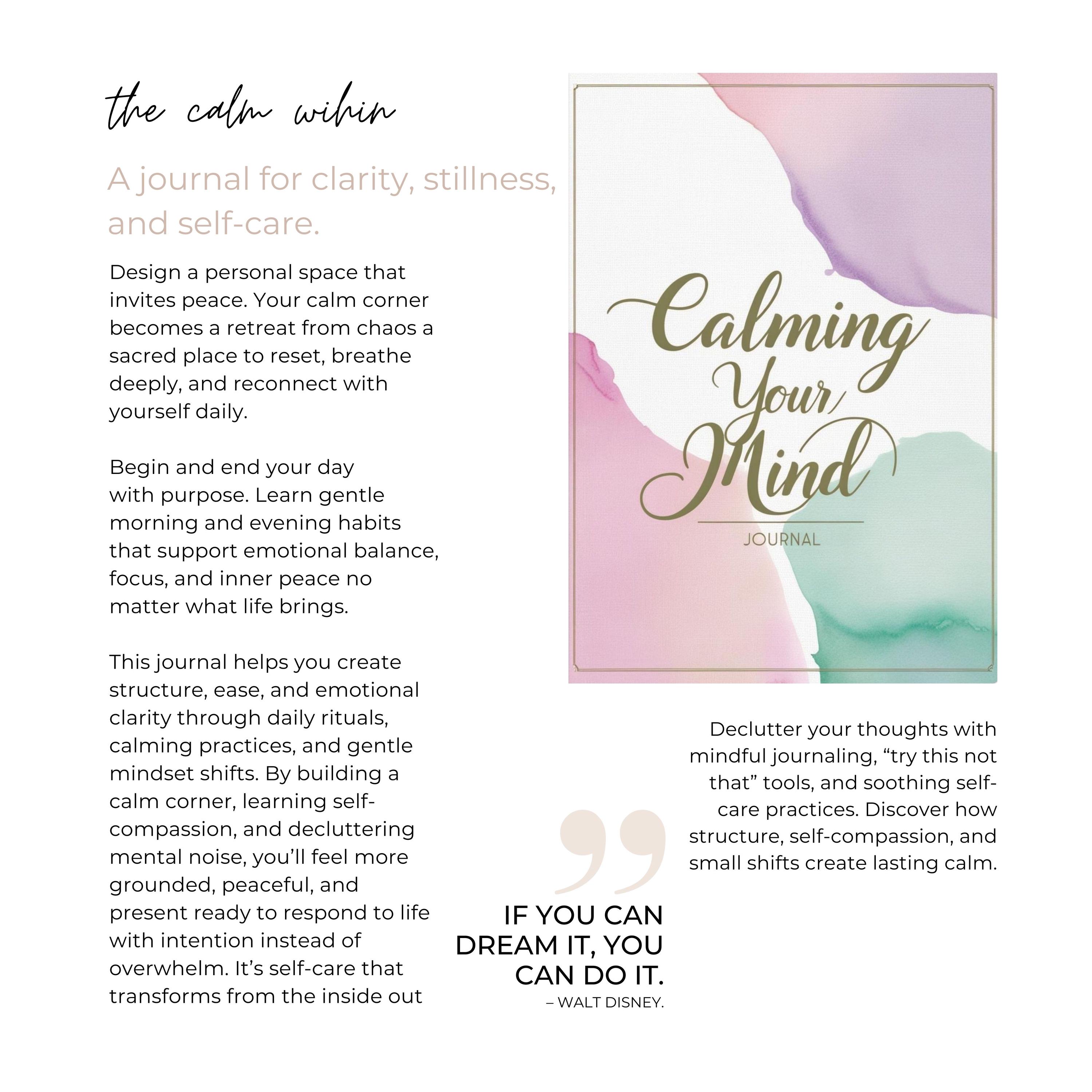 The Calm Your Mind Journal is your daily sanctuary for creating peace, structure, and self-compassion. If you're feeling overwhelmed or craving a life reset, this guided journal helps you design a calming corner, build rituals to start and end your day right, and declutter your mind with intentional practices. Explore soothing “try this not that” methods, self-care rituals, and mindset shifts that bring clarity and healing. Whether you're seeking emotional balance, spiritual connection, or practical calm, this journal is a powerful step toward a happier, more grounded you. Ideal for women looking to create meaningful routines and reclaim peace one page at a time.