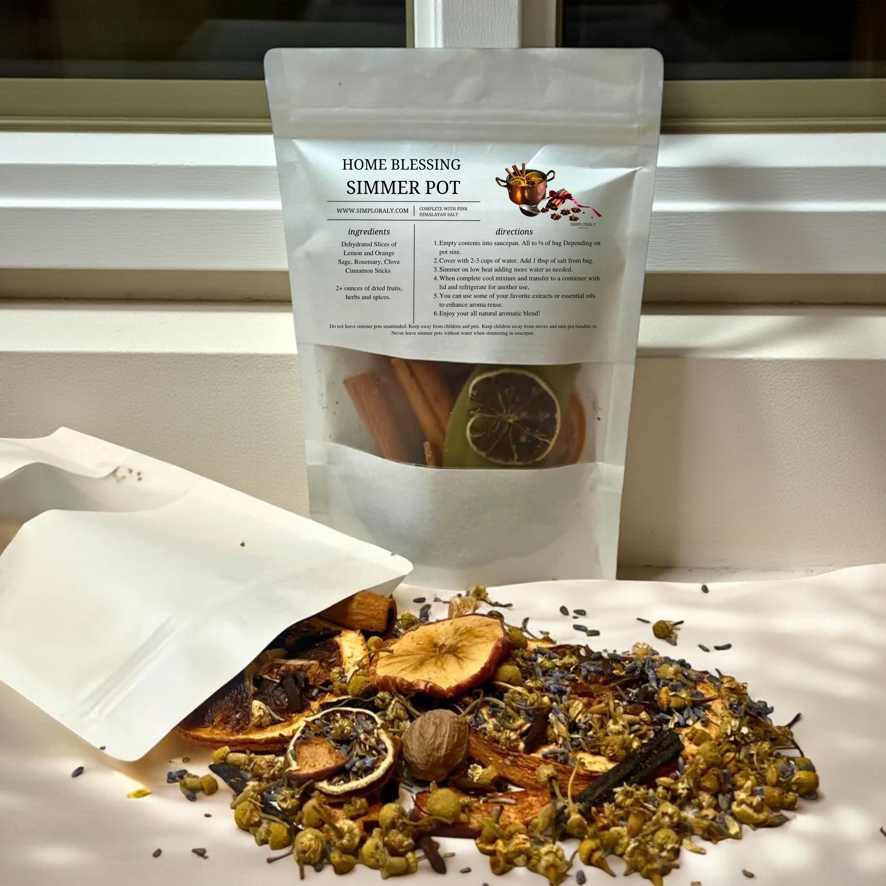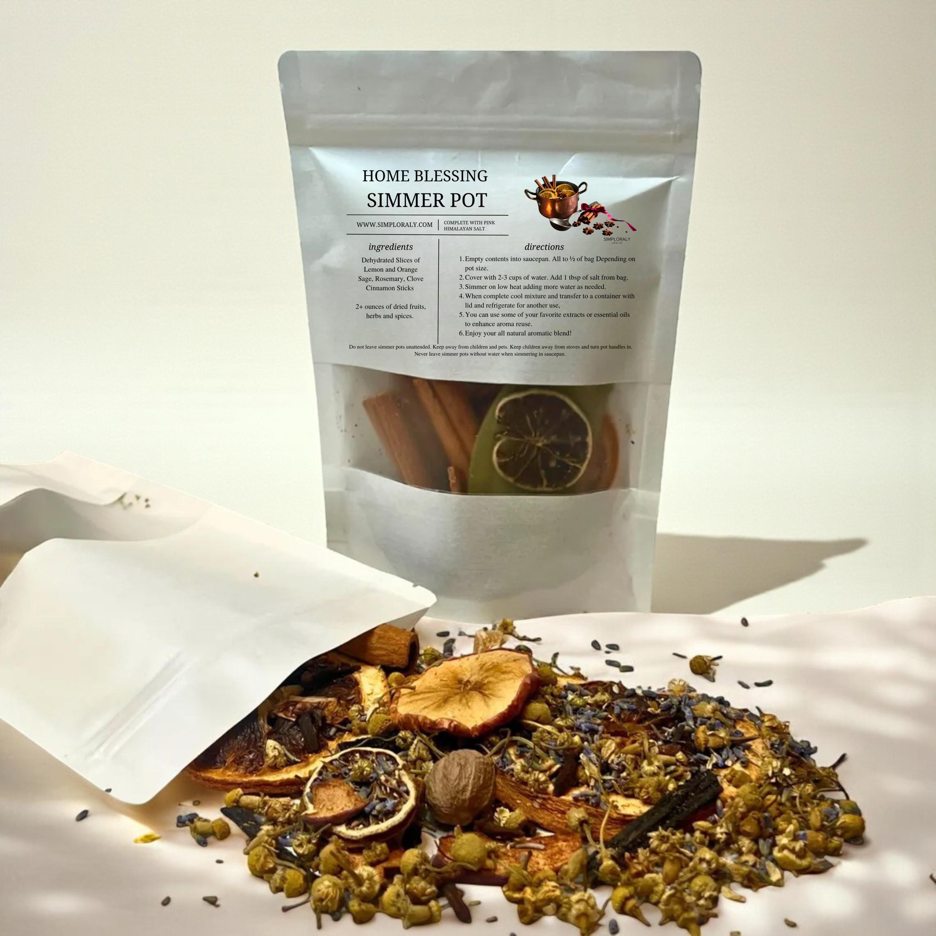 • One botanical simmer pot blend (approx. 4.3oz dried mix)
