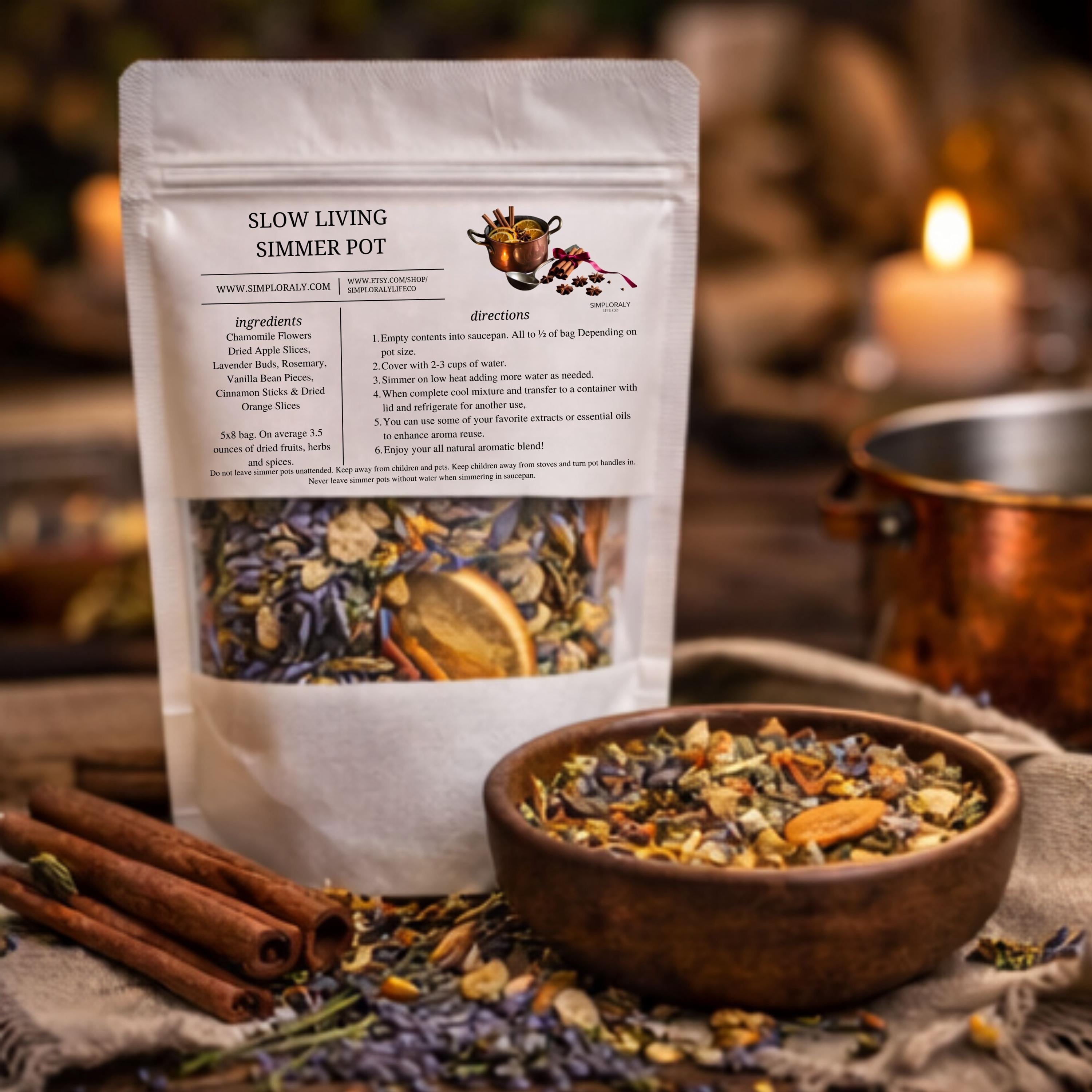 A slow living home ritual for the woman who craves peace, presence, and deeper meaning inside her everyday moments. These botanical simmer pot blends are handcrafted to restore calm to the home, soften the nervous system, and shift the energy of a space without synthetic fragrances or artificial dyes.