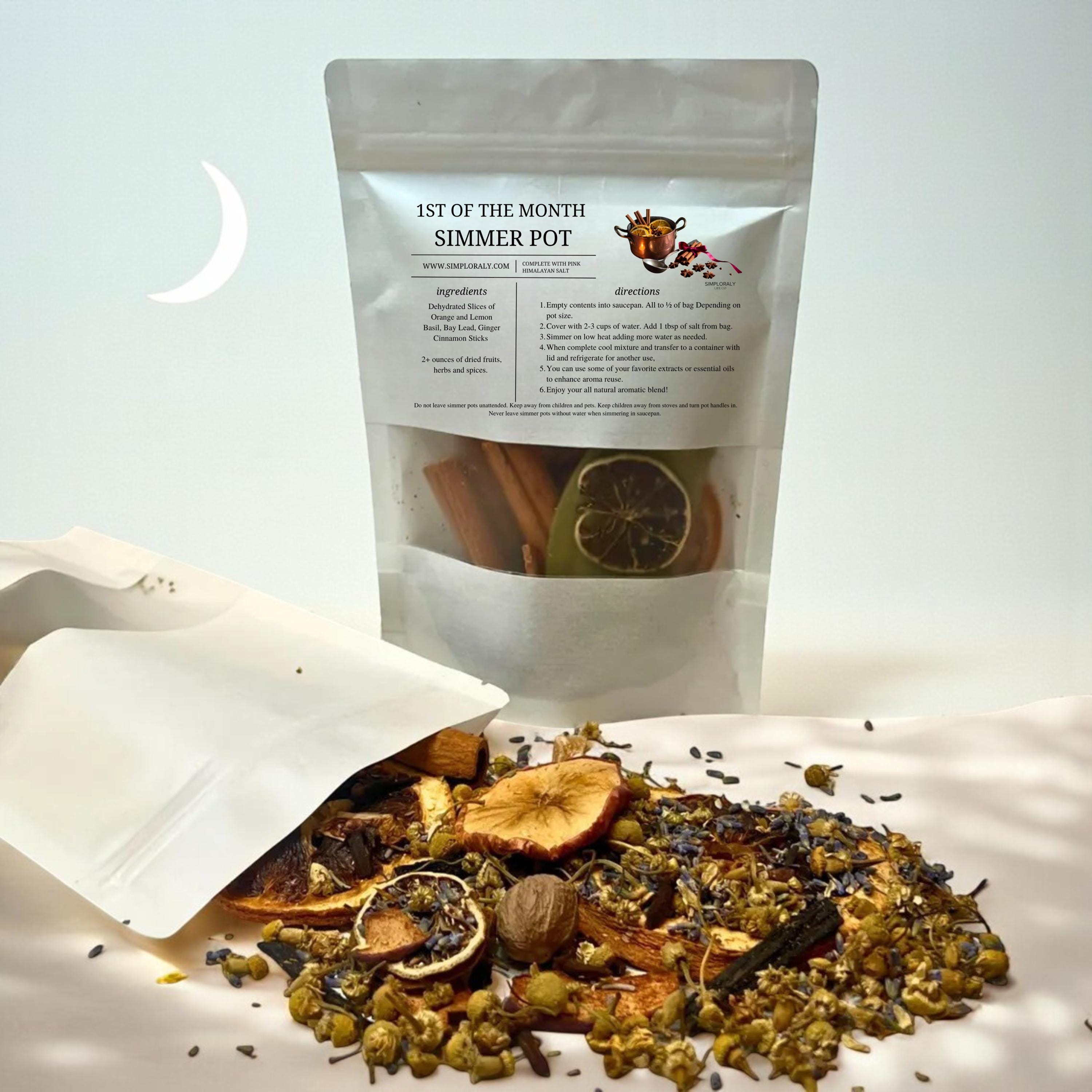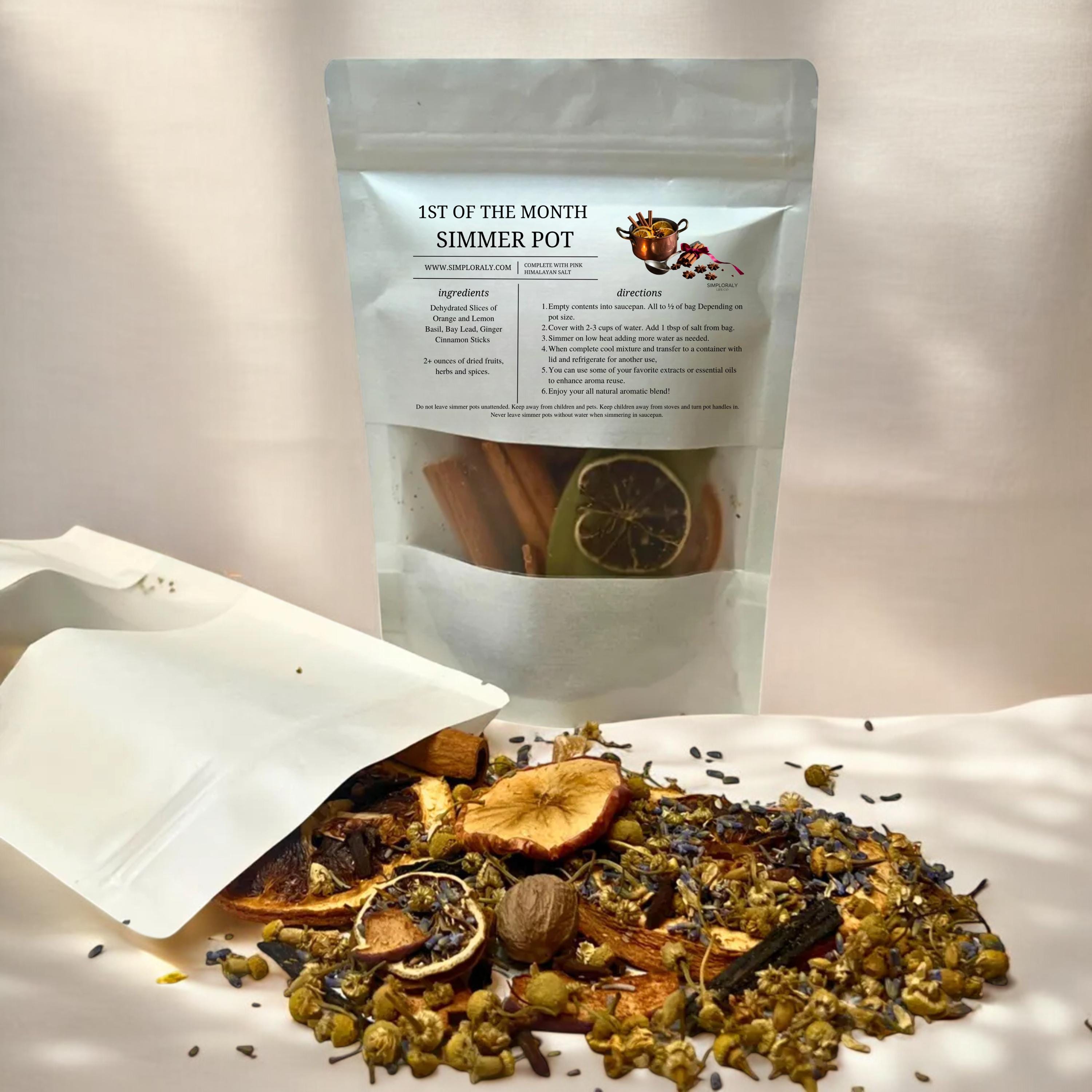 • One botanical simmer pot blend (approx. 4.3oz dried mix)