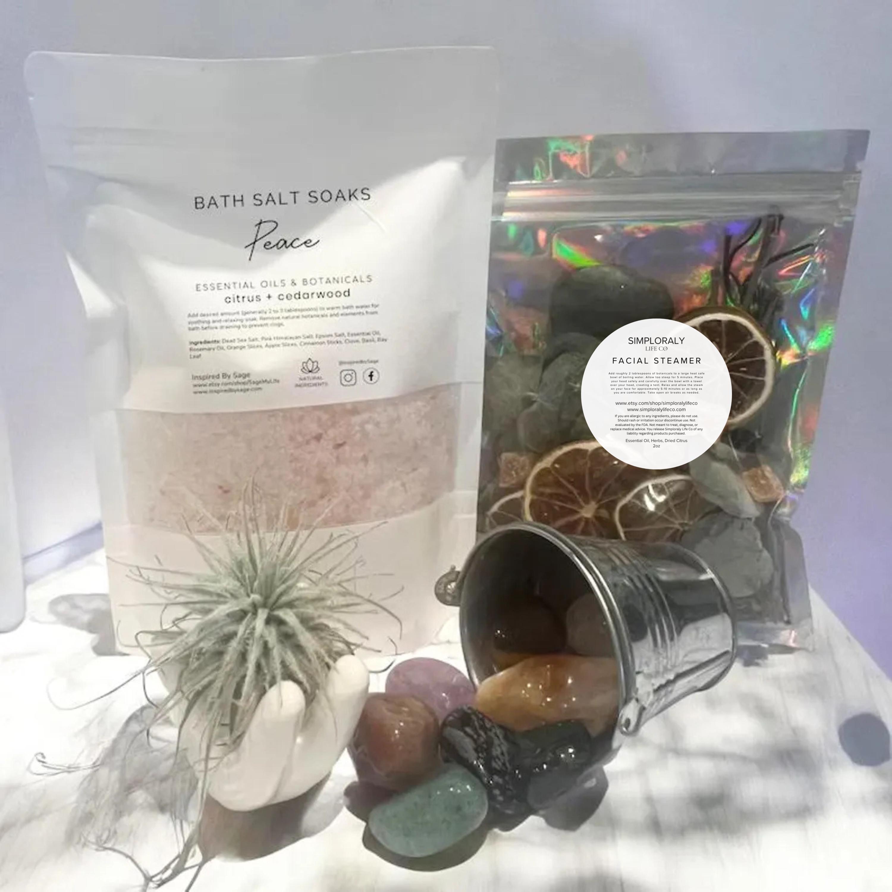 Experience tranquility with the Botanical Wellness Gift Set. This soothing botanical bath salts soak and facial steamer features 7 healing crystals, a tillandsia air plant, and a ceramic hand plant holder. Amplify your rituals and relaxation with this harmonious set designed for peace and balance. A thoughtful gift for self-care, spiritual connection, or calming the mind and body.