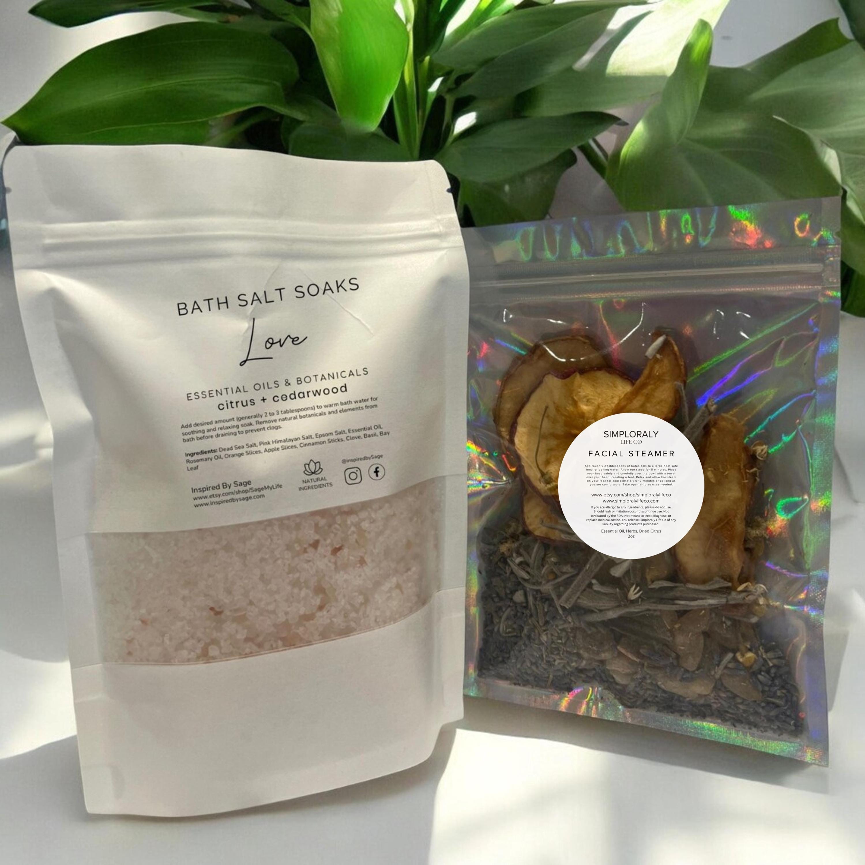 Infuse your bath with love and affection. This herbal bath salt soak and facial steamer set promotes self-love and romantic energy through a unique blend of herbs. Ideal for chakra balancing, calming rituals, and relaxation to open your heart to love and healing.