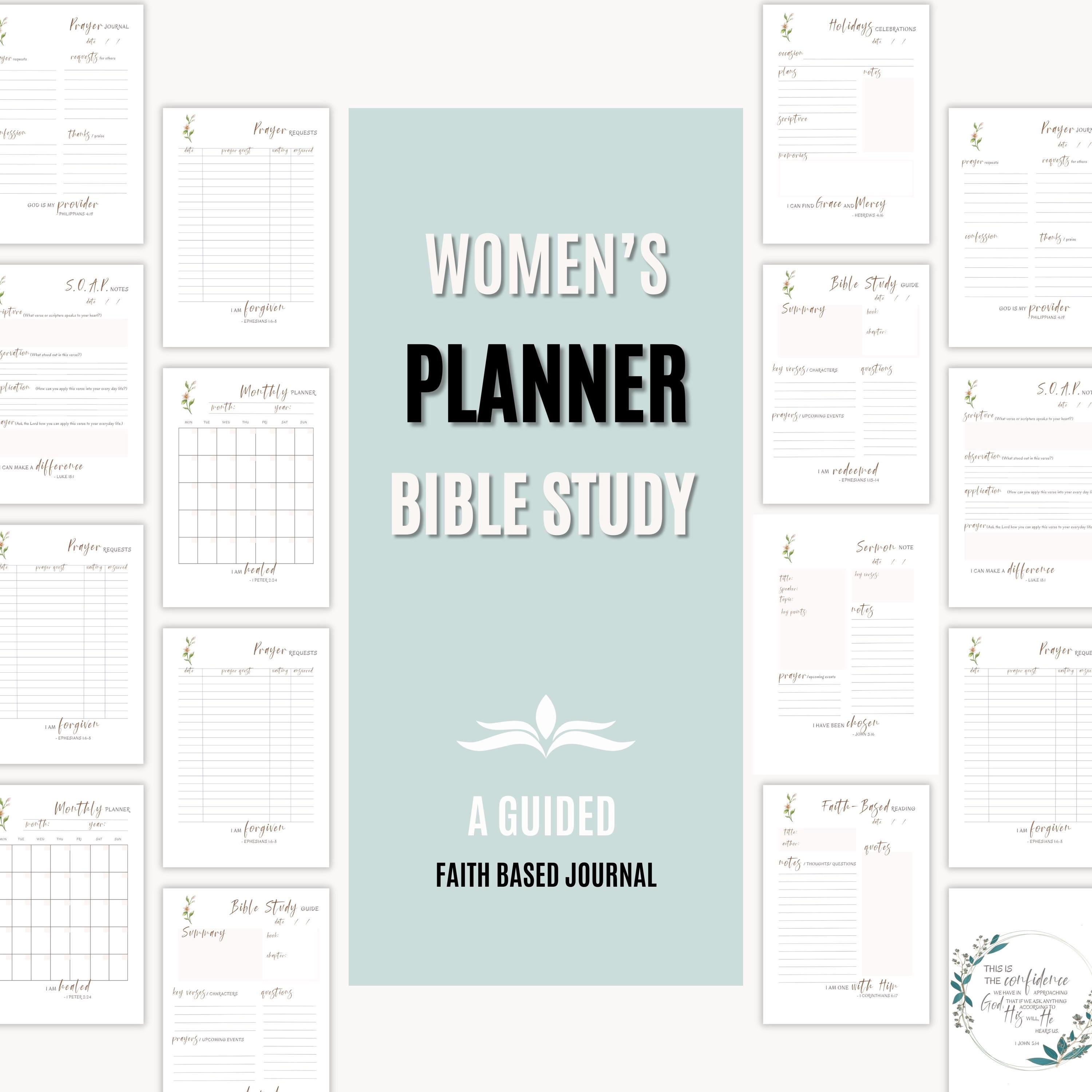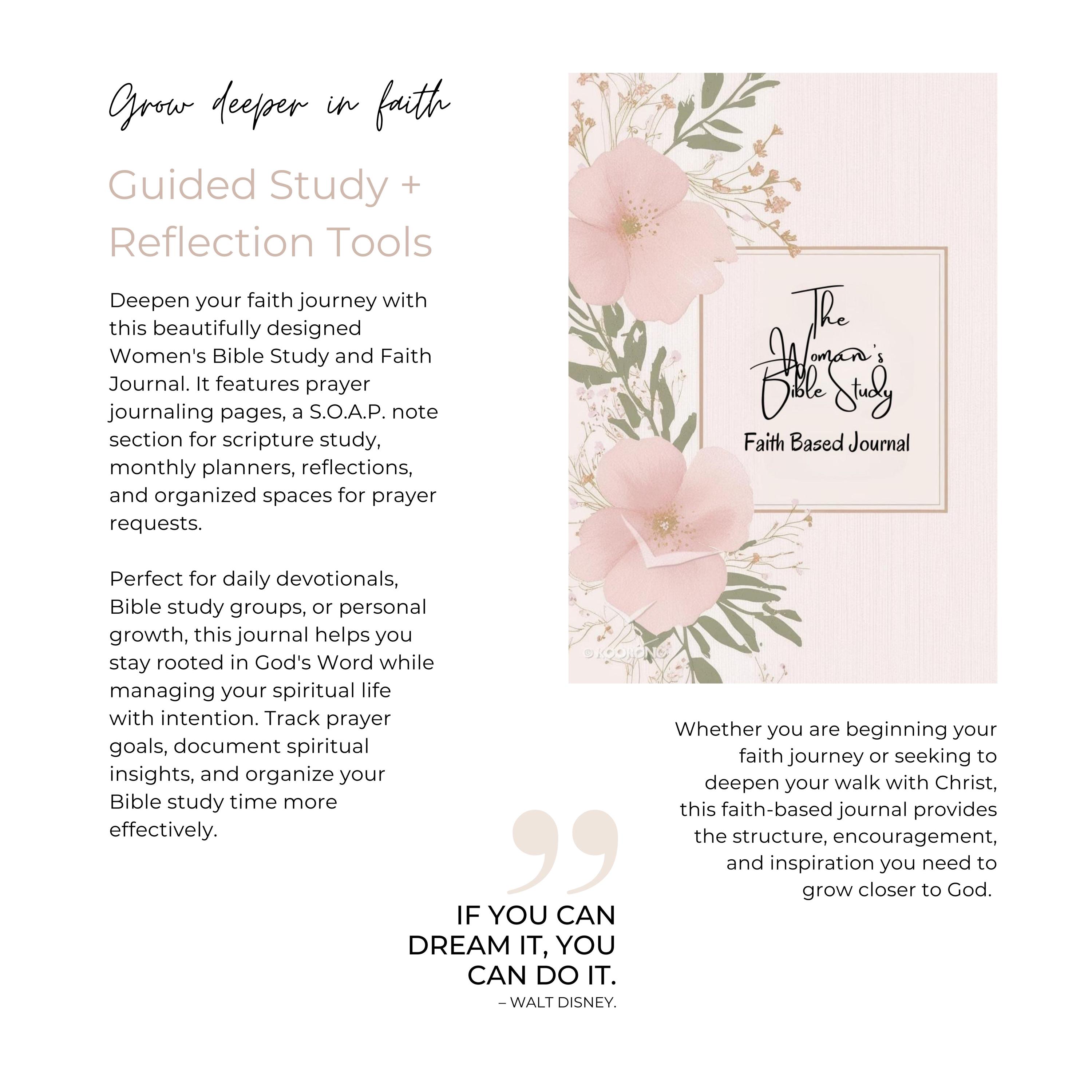 Deepen your faith journey with this beautifully designed Women's Bible Study and Faith Journal. It features prayer journaling pages, a S.O.A.P. note section for scripture study, monthly planners, reflections, and organized spaces for prayer requests. Perfect for daily devotionals, Bible study groups, or personal growth, this journal helps you stay rooted in God's Word while managing your spiritual life with intention. Track prayer goals, document spiritual insights, and organize your Bible study time more effectively. Whether you are beginning your faith journey or seeking to deepen your walk with Christ, this faith-based journal provides the structure, encouragement, and inspiration you need to grow closer to God.