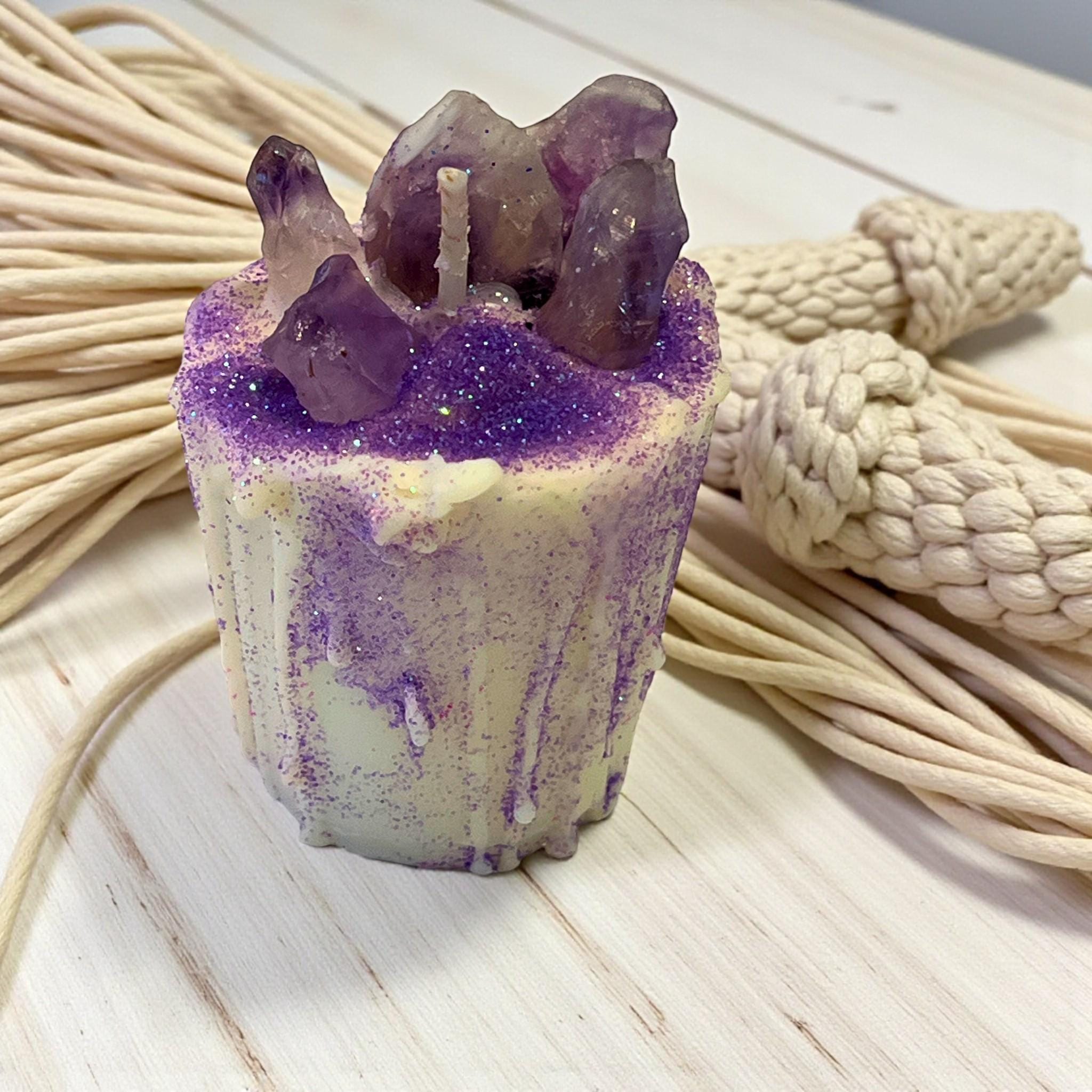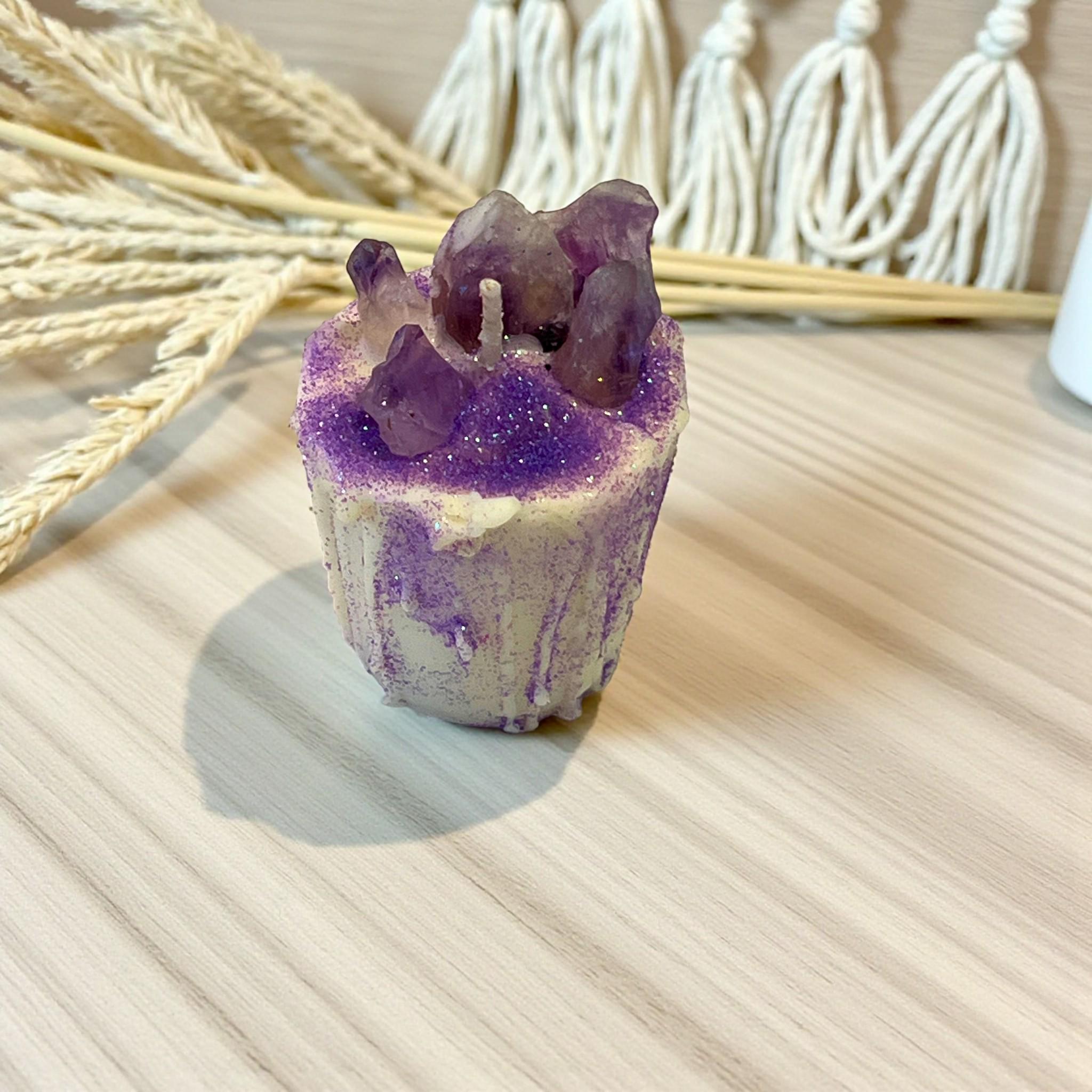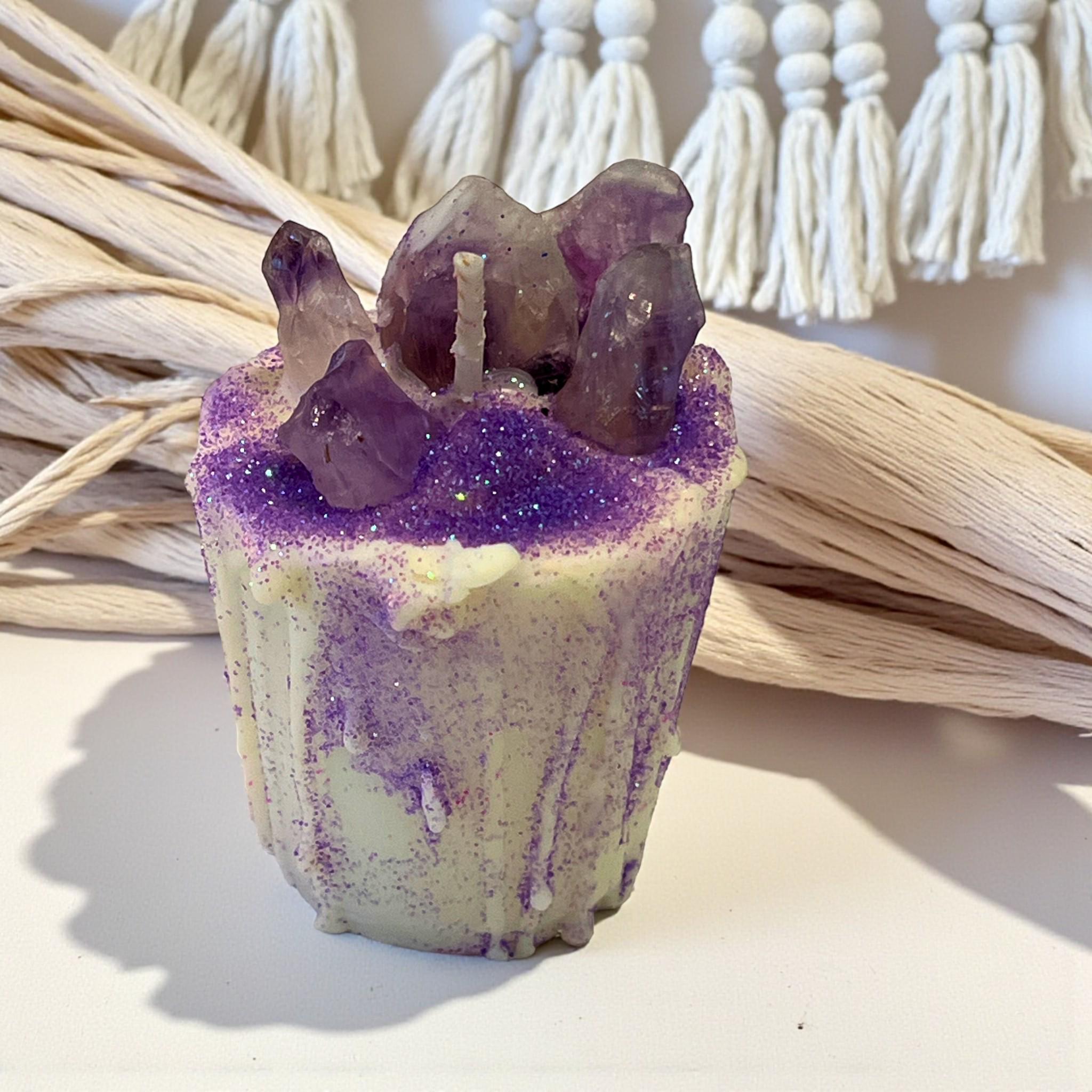 Bring calming energy and spiritual balance into your sacred space with this Amethyst Crystal Soy Wax Candle. Each handcrafted votive is designed with drip-style wax, shimmering purple glitter, and natural essential oils. Infused with genuine crystals, this candle is perfect for intention-setting, meditation, prayer, manifestation or adding peaceful energy and aroma to your home.