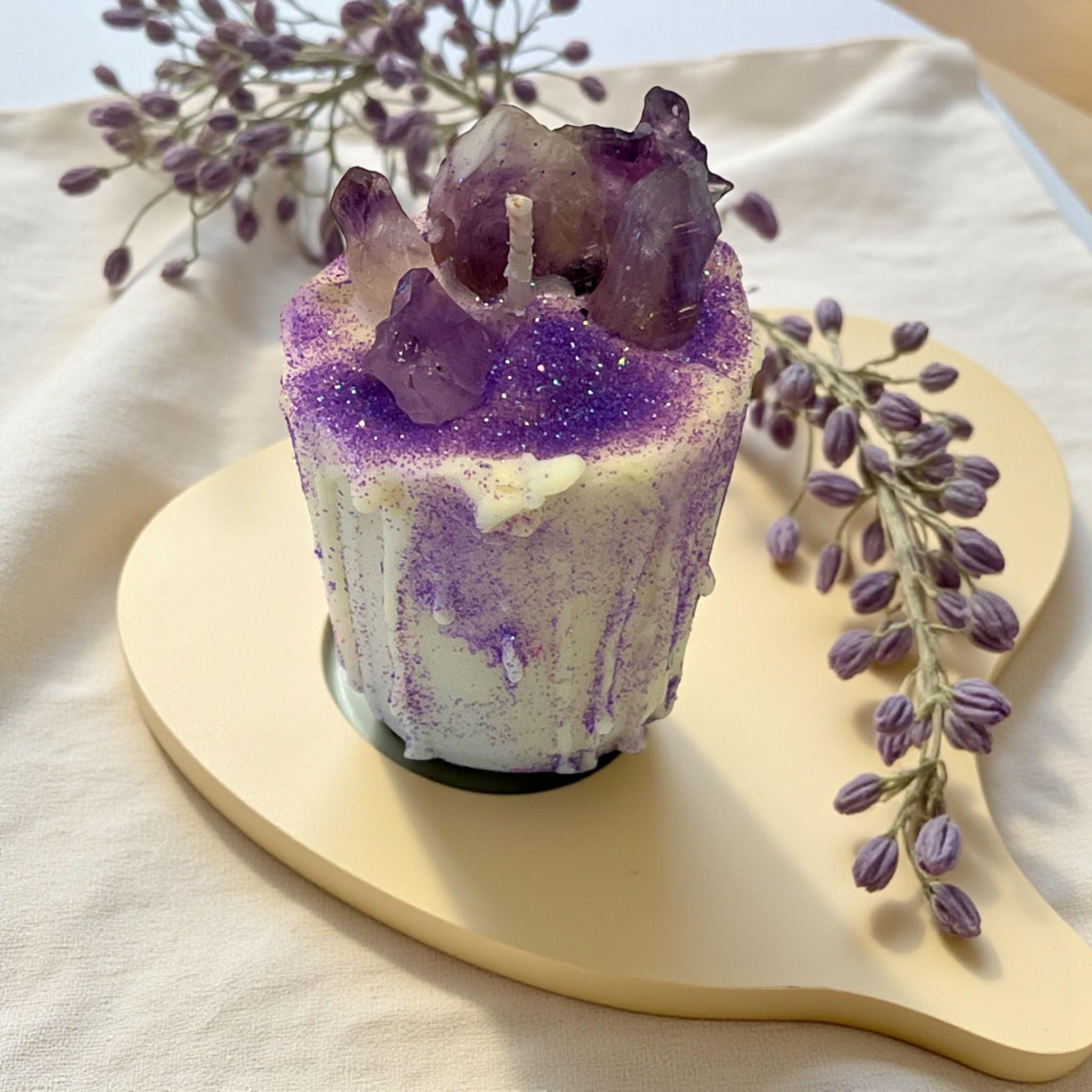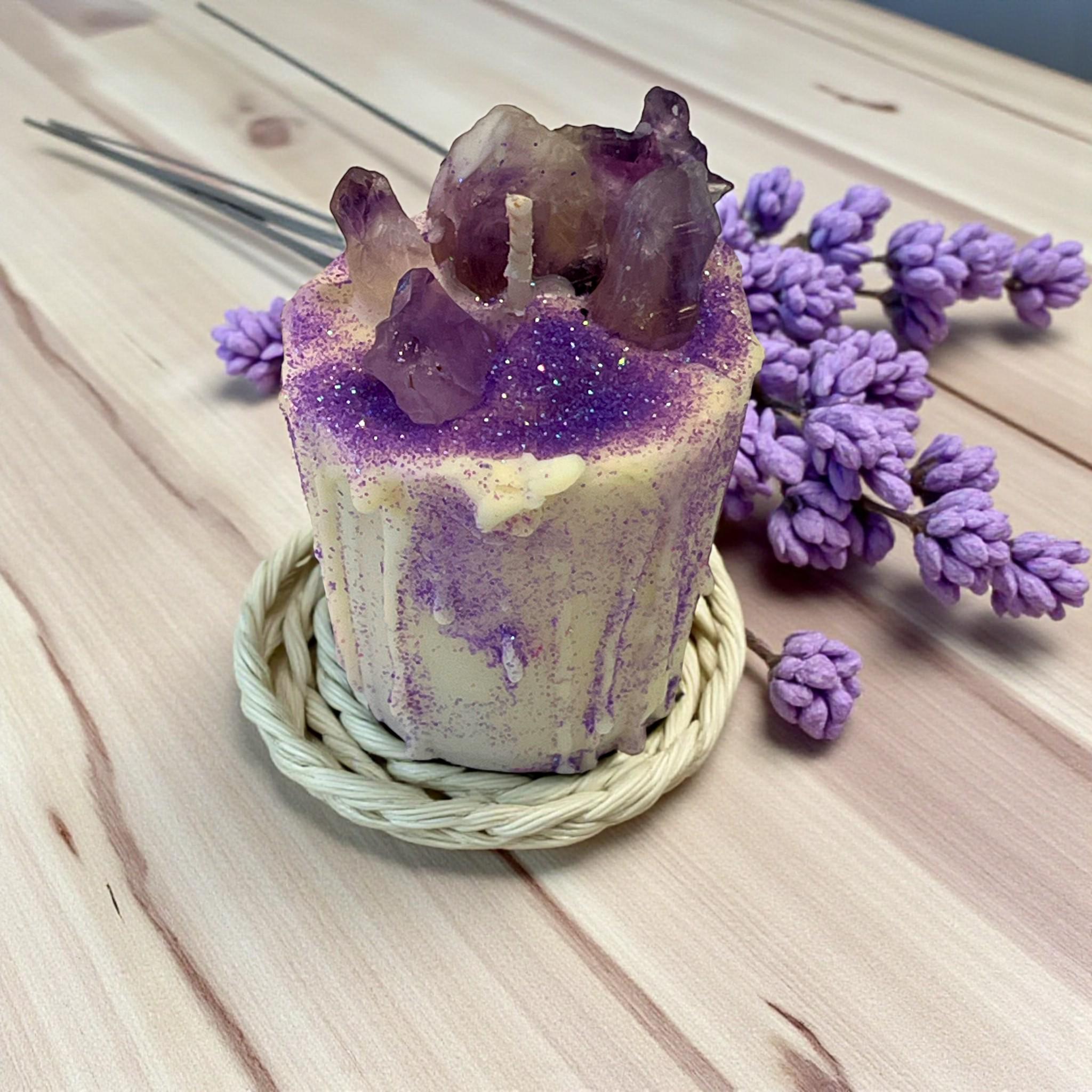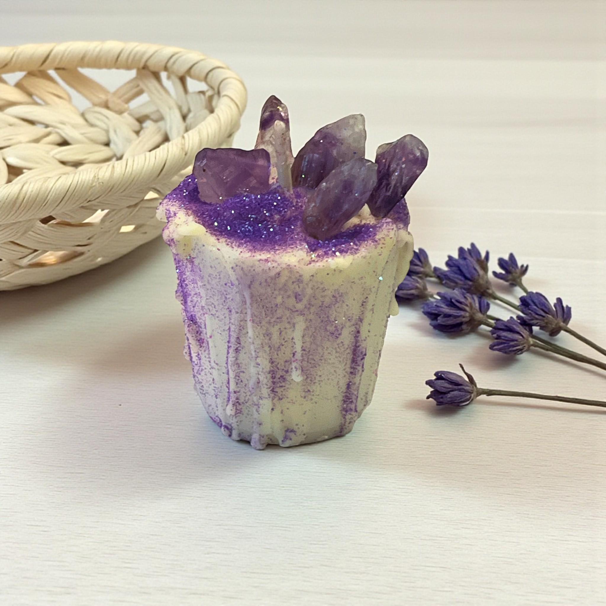 Bring calming energy and spiritual balance into your sacred space with this Amethyst Crystal Soy Wax Candle. Each handcrafted votive is designed with drip-style wax, shimmering purple glitter, and natural essential oils. Infused with genuine crystals, this candle is perfect for intention-setting, meditation, prayer, manifestation or adding peaceful energy and aroma to your home.