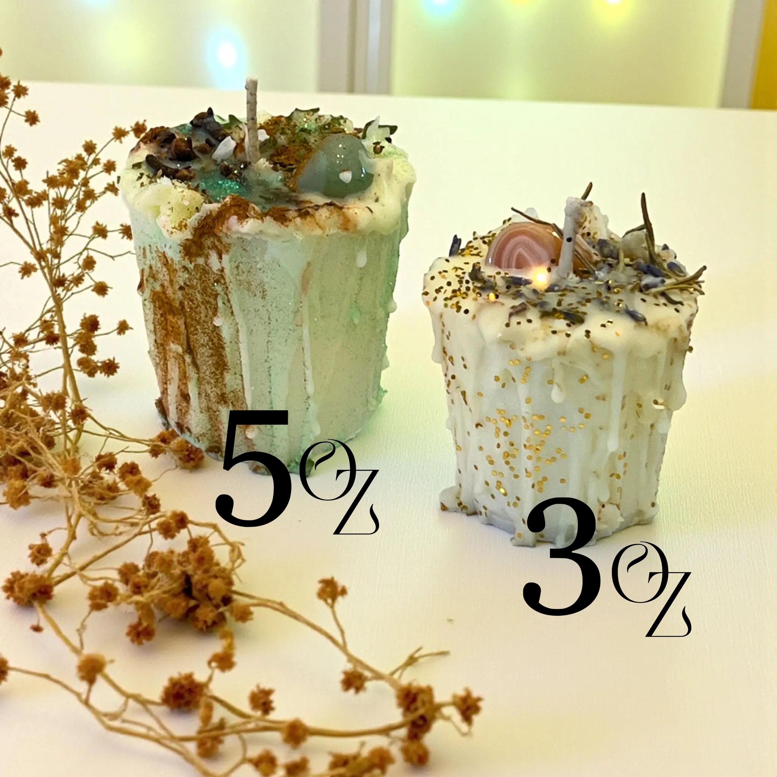 Always burn candles within sight especially with natural embeds, herbs or elements and watch for small flames so extinguish. Herbs will begin to sink as wax melts (normal). Keep away from children, pets, flammable items, and drafts. Use inside a heat-safe container or dish. Never burn more than 3–4 hours at a time. Trim wick between uses. Estimated burn time is 14-16 hours if you properly care for the candle as specified. Made at time of order or in small batches so slight color variations can occur from your screen color due to monitor settings. Remove leftover crystals with care once wax is cooled. Simply rinse with soapy water and reuse your crystal anytime, anywhere. Crystals, glitter, or decorative elements may shift during burning use in a fire-safe dish or container. Use caution when removing elements as wax is HOT. Remove when cooled and/or use a metal spoon to remove. Be sure to remove elements like crystals as they shift to avoid fire and/or small flames and damage. As with all candles or electric devices use responsibly, adhere to candle warnings.