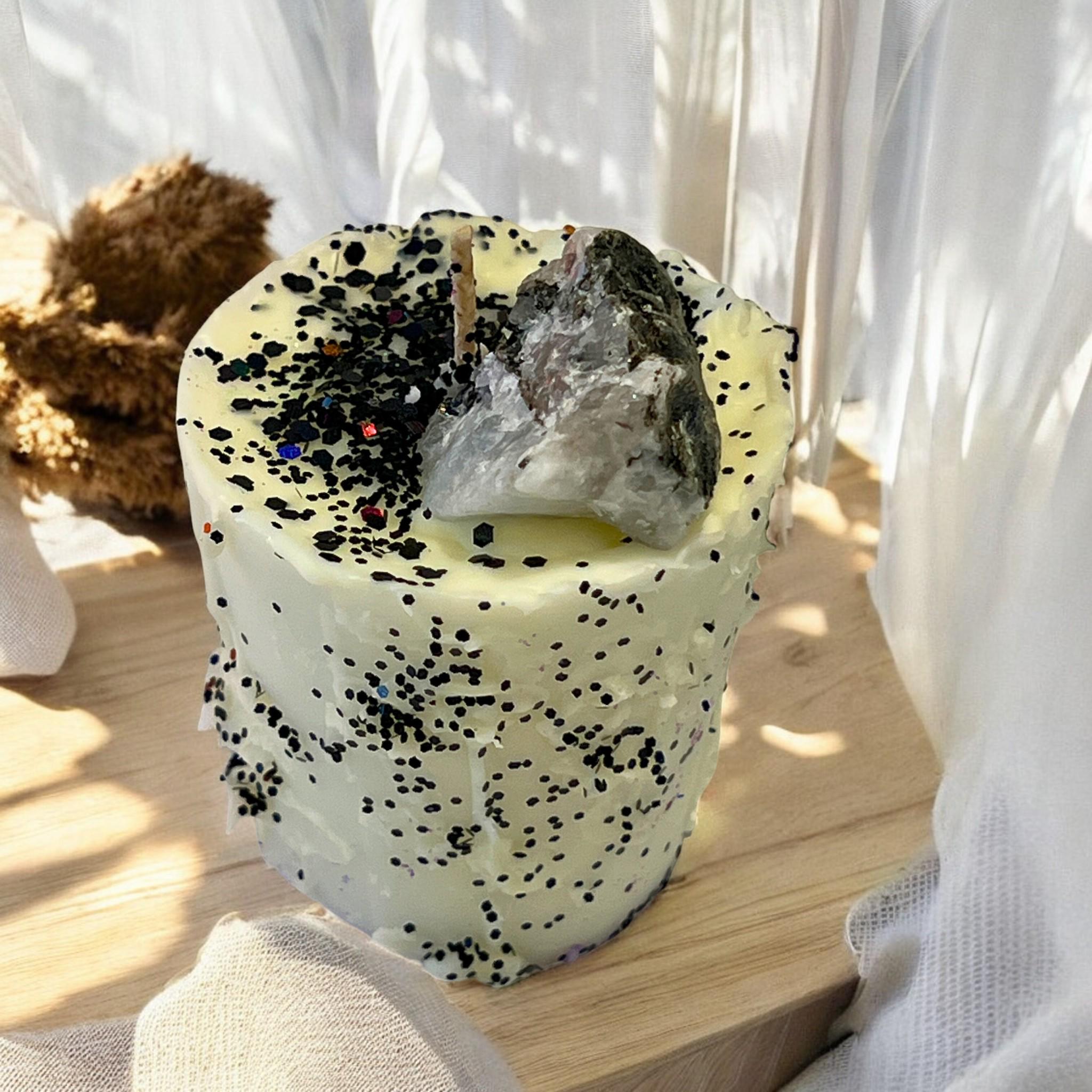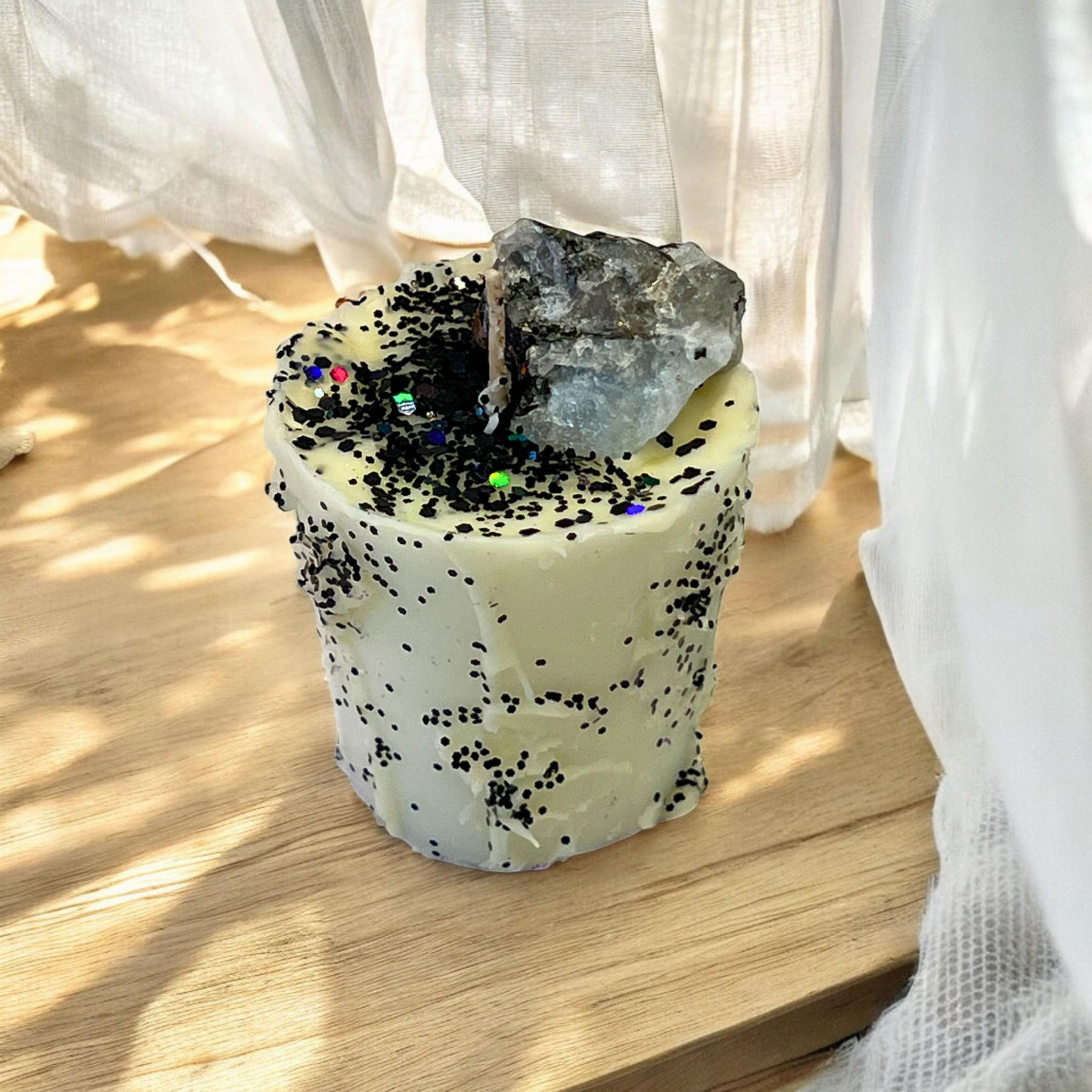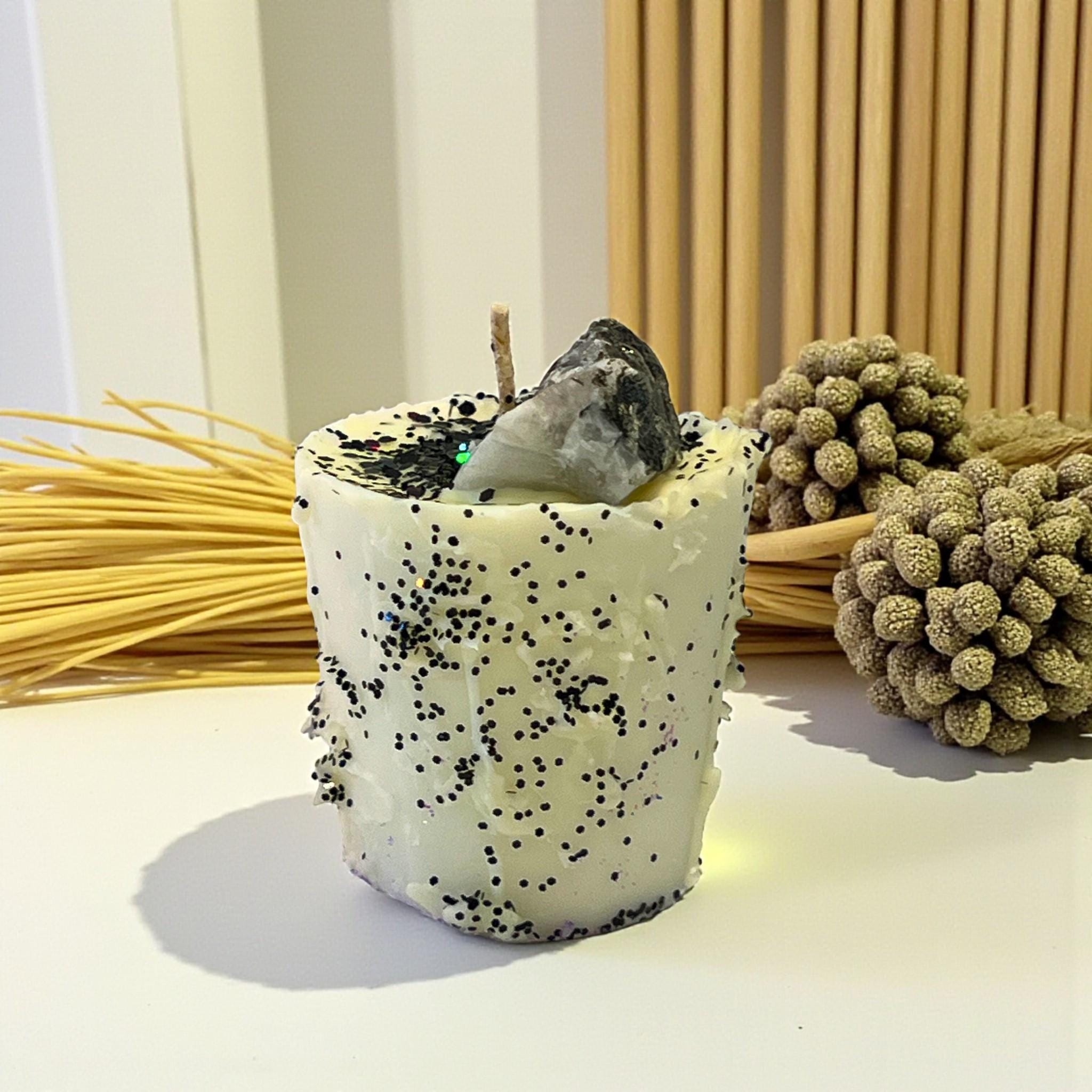 Awaken intuition and inner balance with this Moonstone Crystal Soy Wax Candle. Featuring a raw moonstone crystal and shimmering black glitter, this high-fragrance soy votive supports spiritual rituals, full moon intentions, and calming meditation practices.