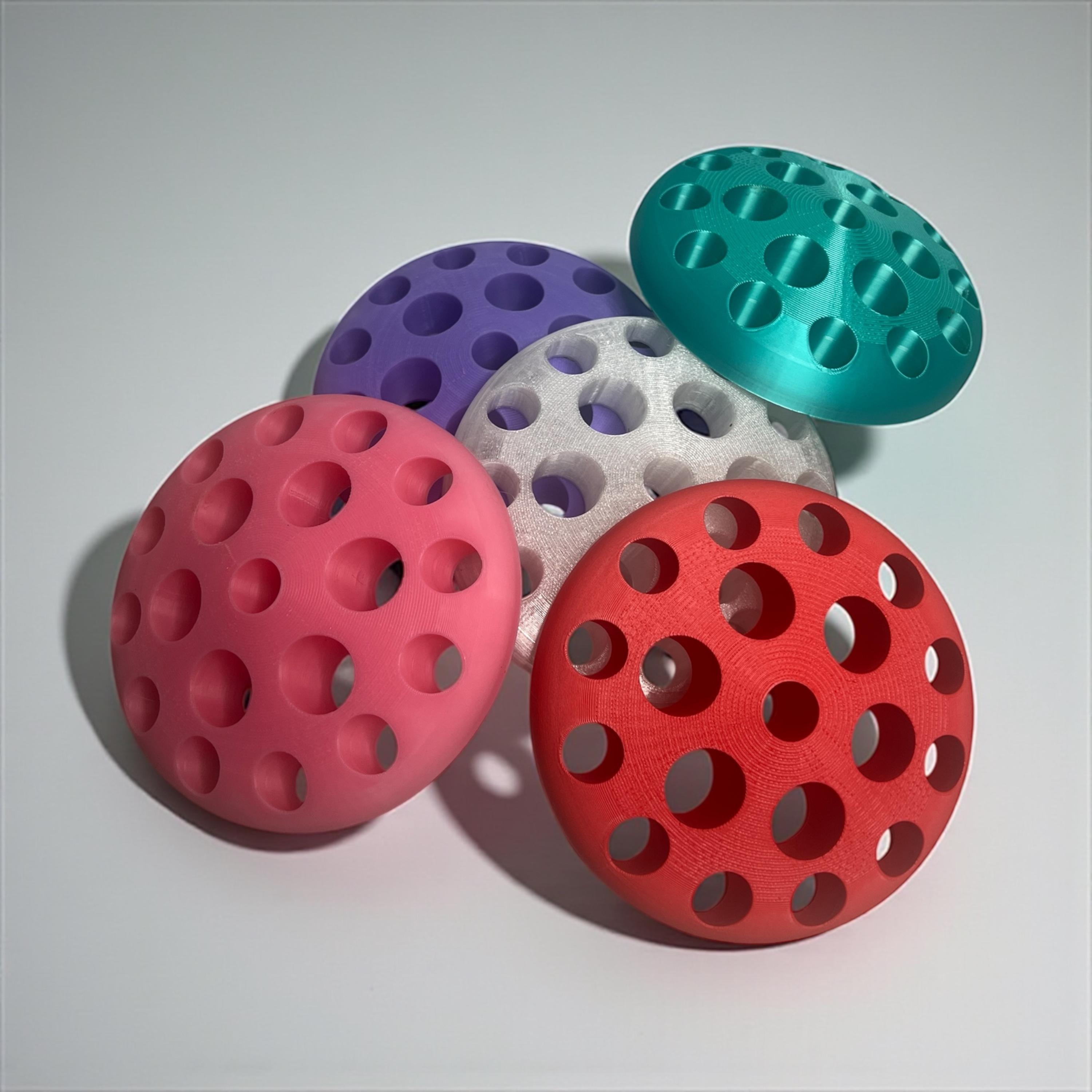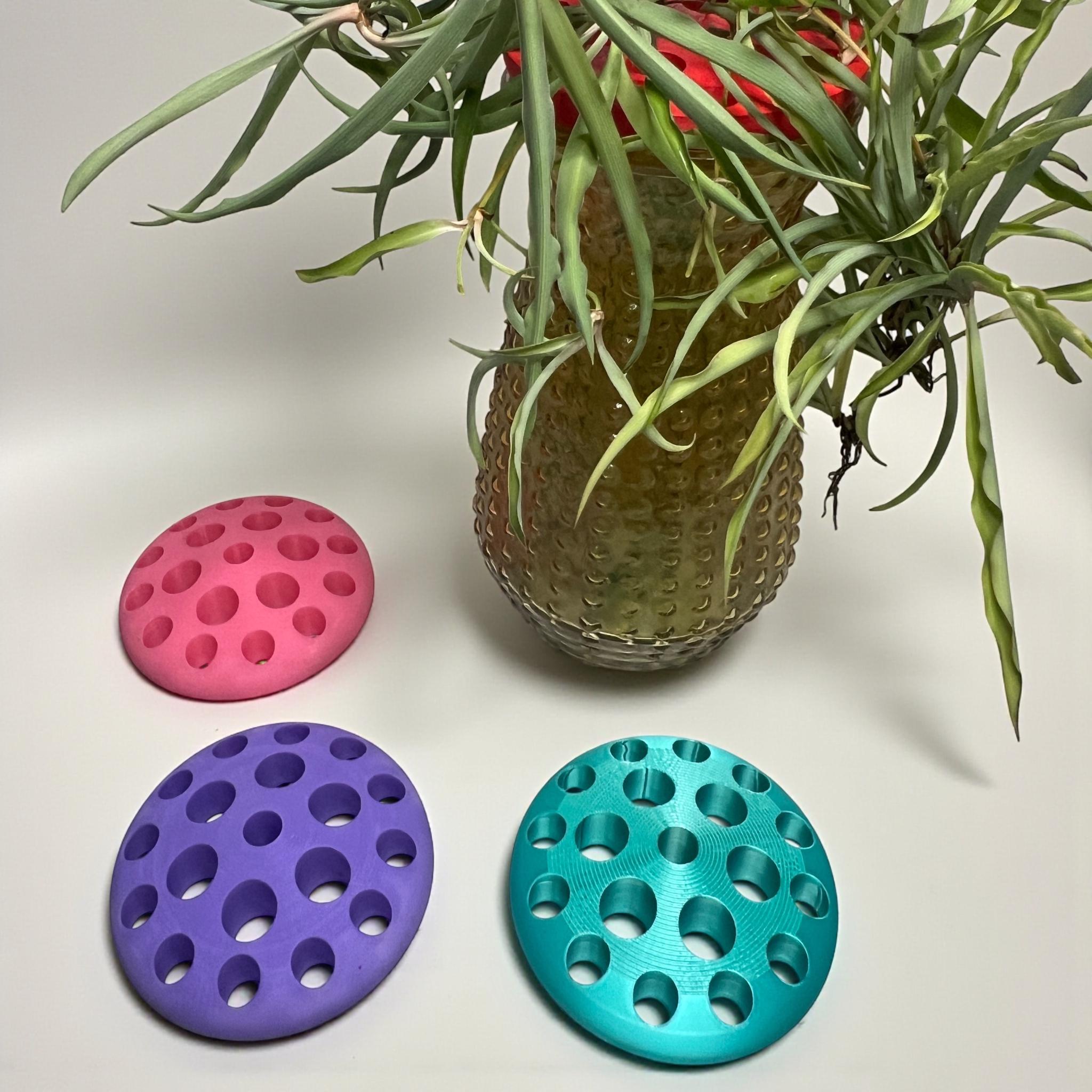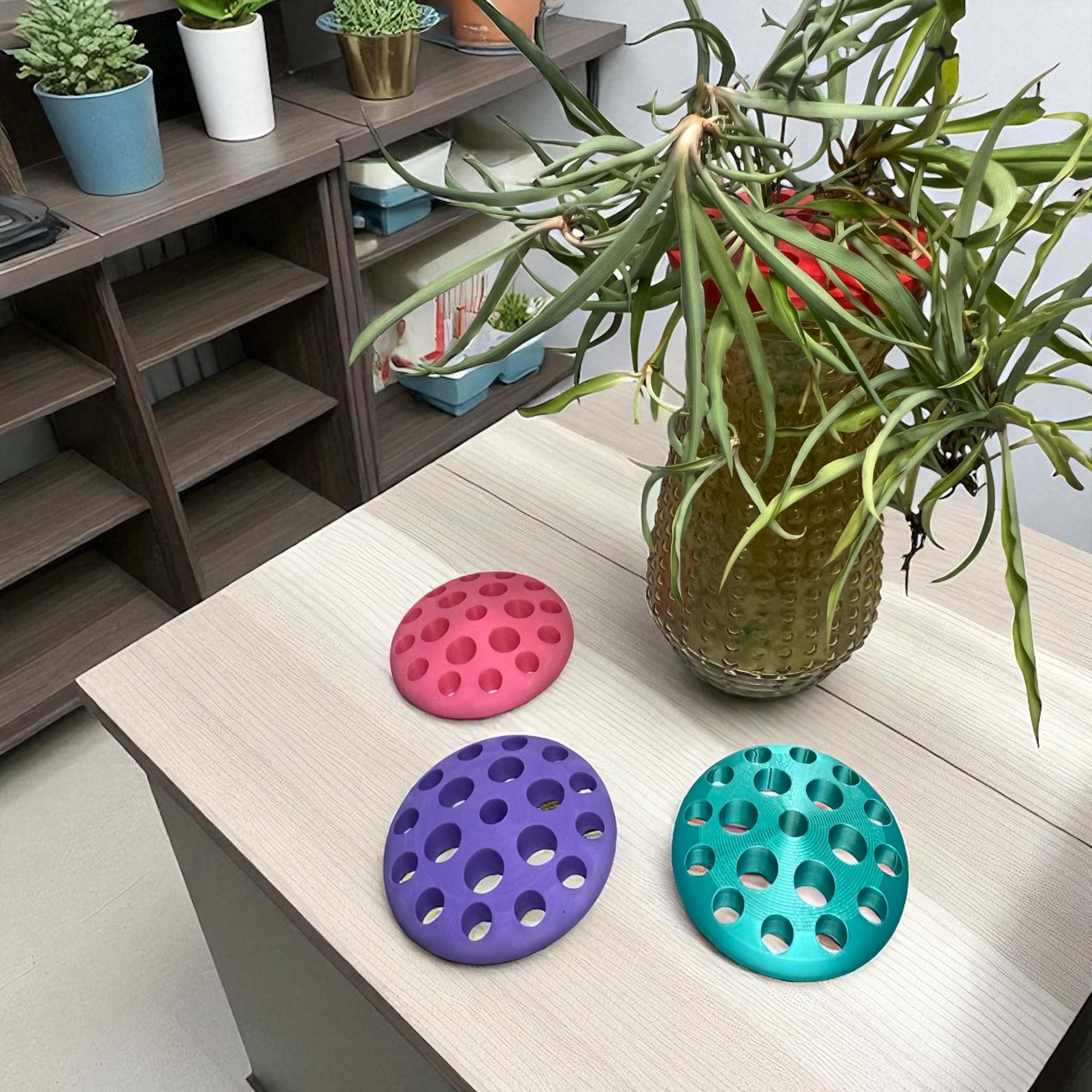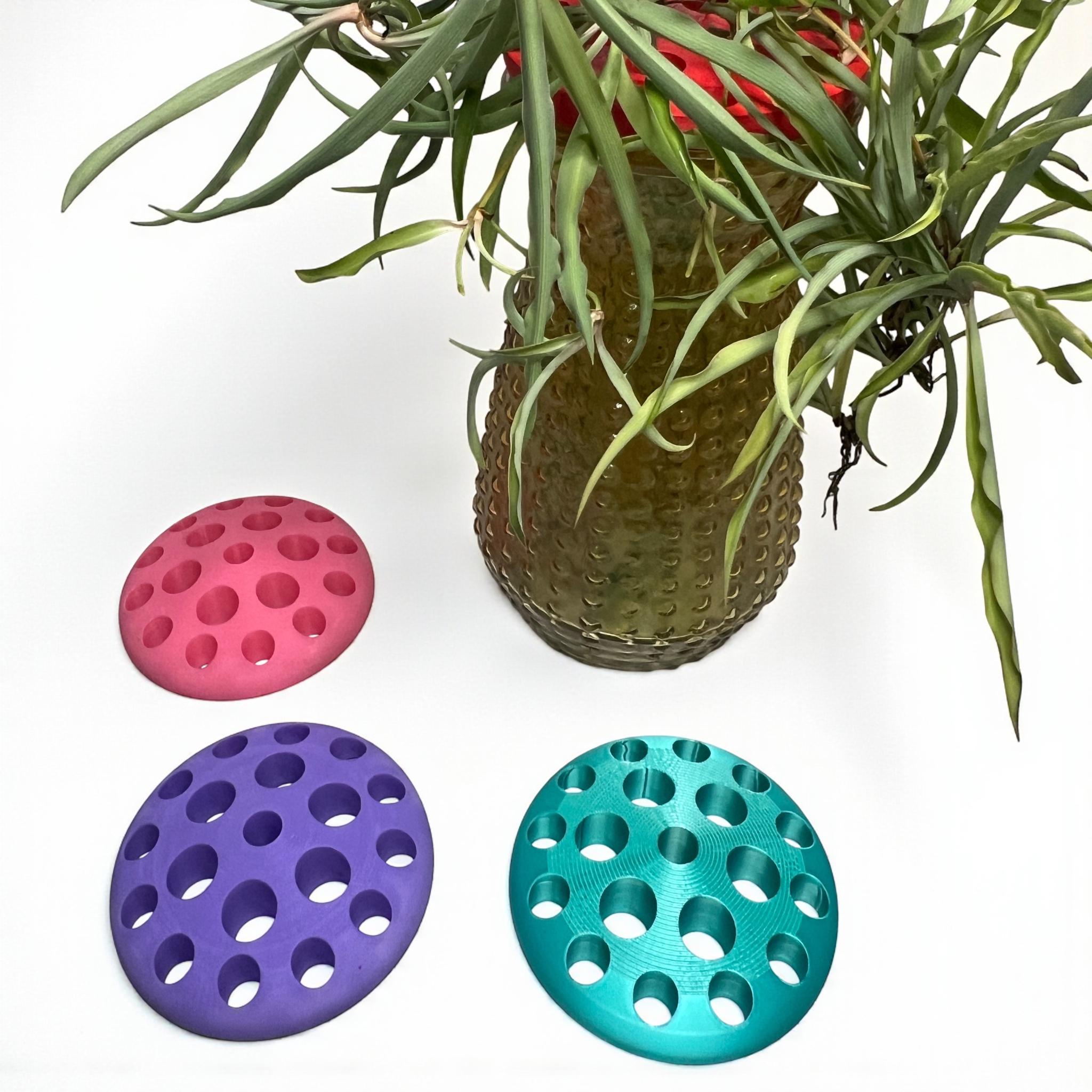 These flower frogs are 3D printed using PLA, a plant-based material made from renewable resources such as corn starch and sugarcane. PLA (Polylactic Acid) is known for being one of the most environmentally conscious printing materials available. It produces minimal odor or emissions during printing and is compostable under industrial conditions, making it a sustainable alternative to petroleum-based plastics.