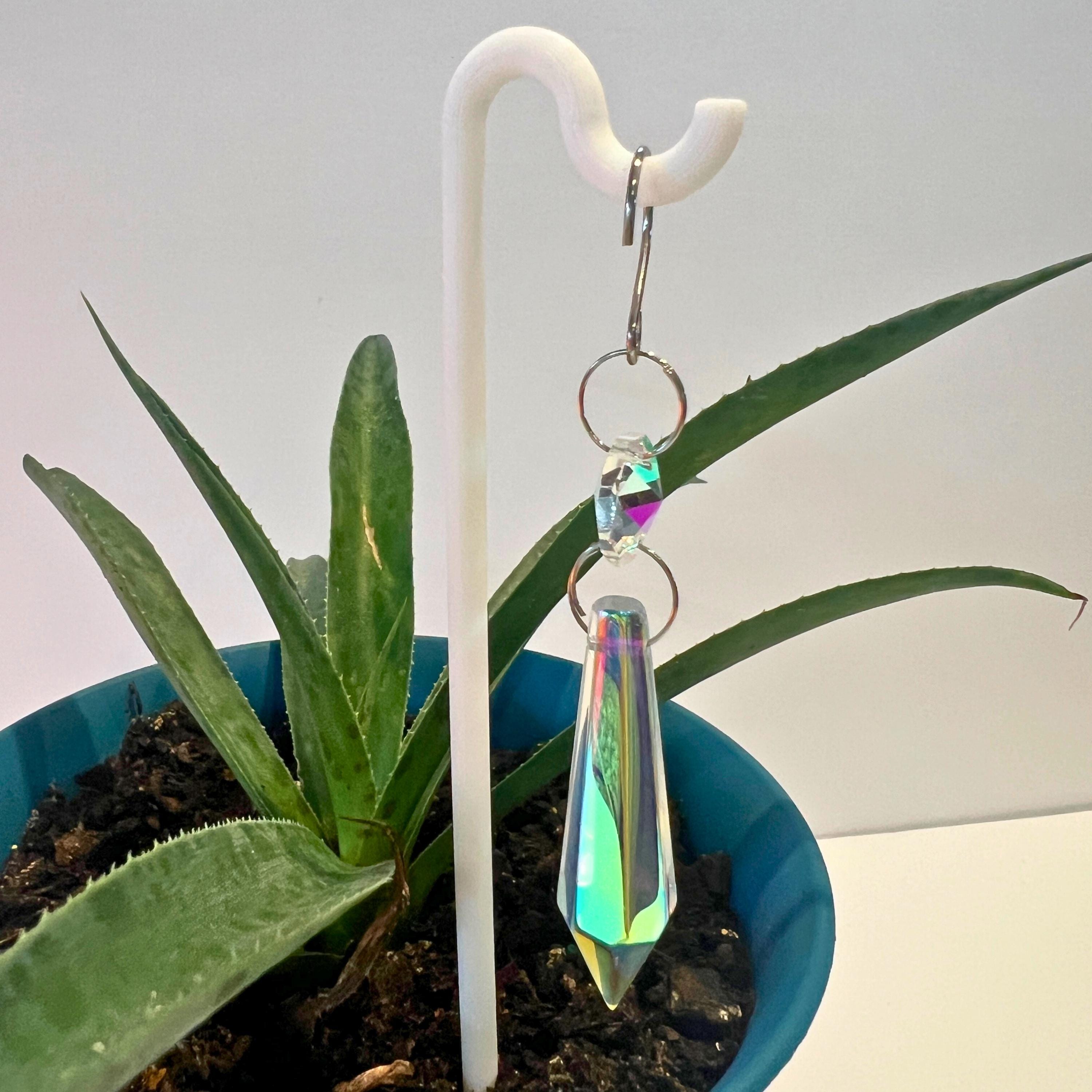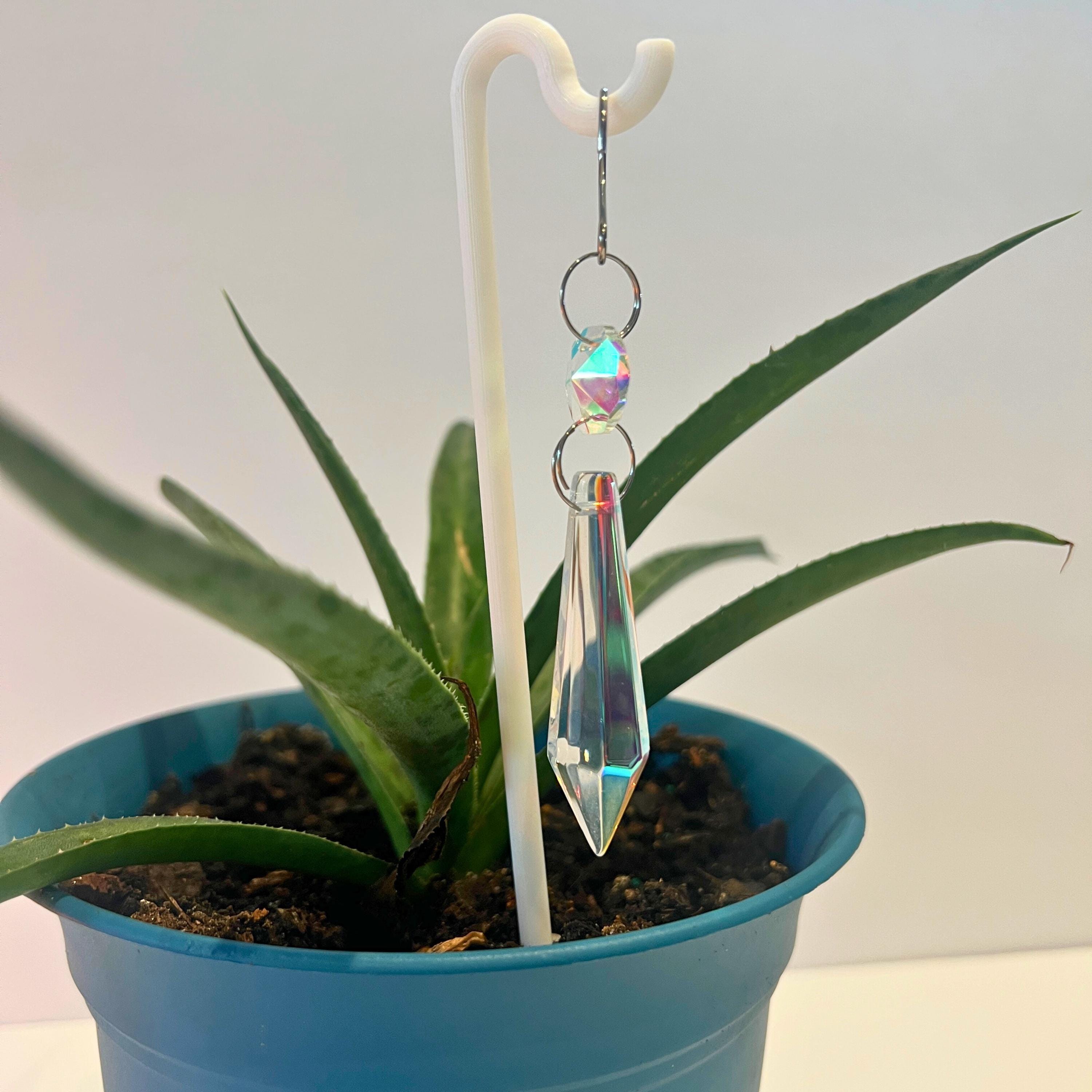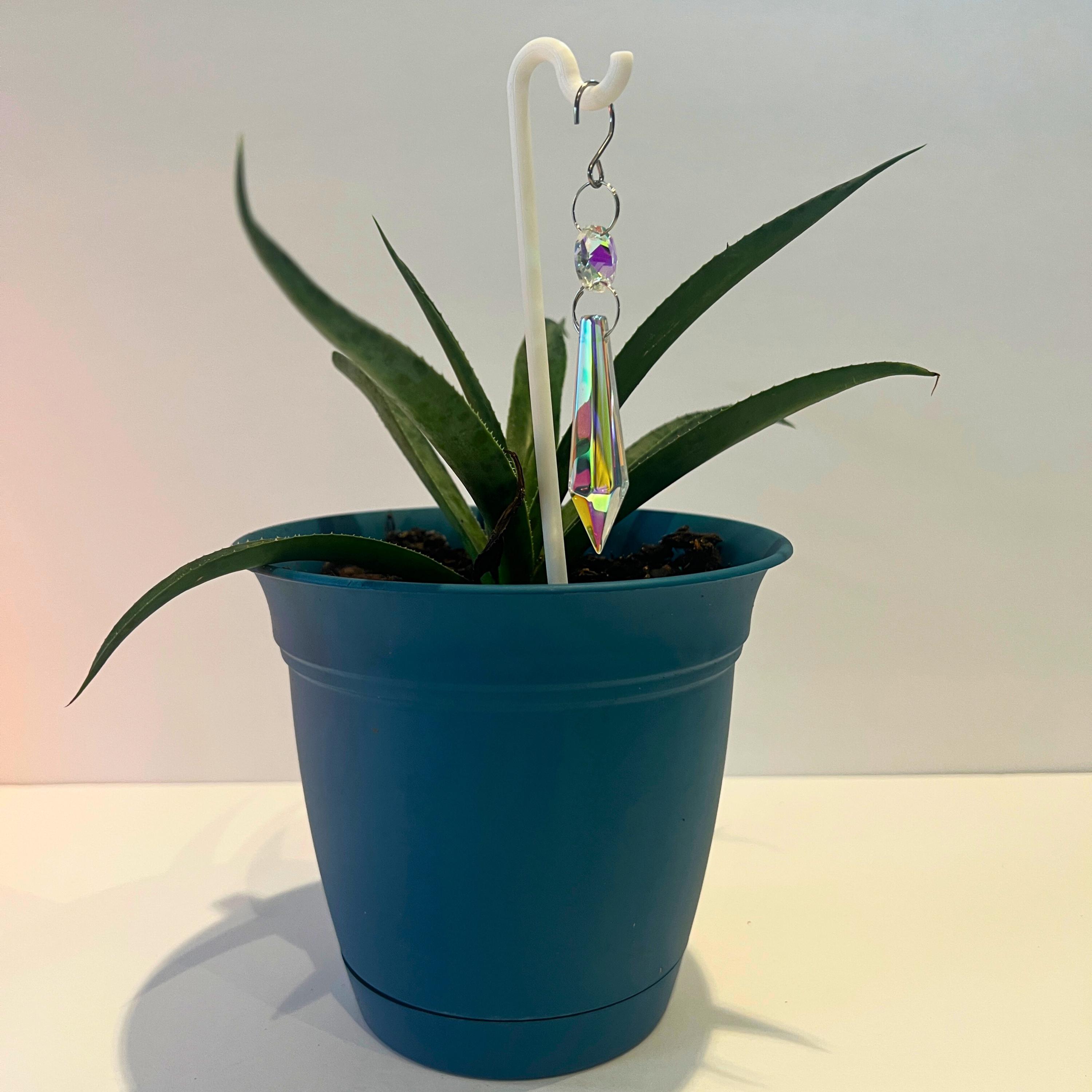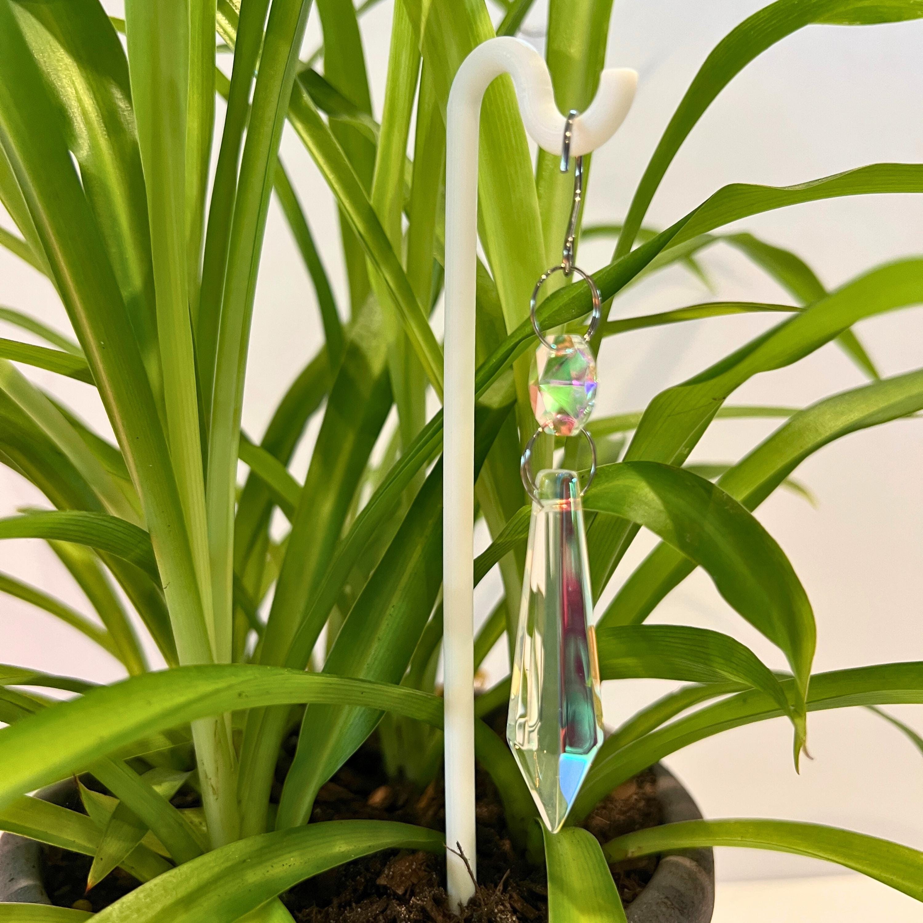 Prism Crystal Point Plant Sitter. 3D Printed Hook & Hanging Glass Crystal. Add a touch of light, love, and intention to your plants. Each Plant Pal Sitter features a genuine glass crystal point suspended from a 3D printed Shepherd’s Hook, designed to rest gently in your plant’s soil.