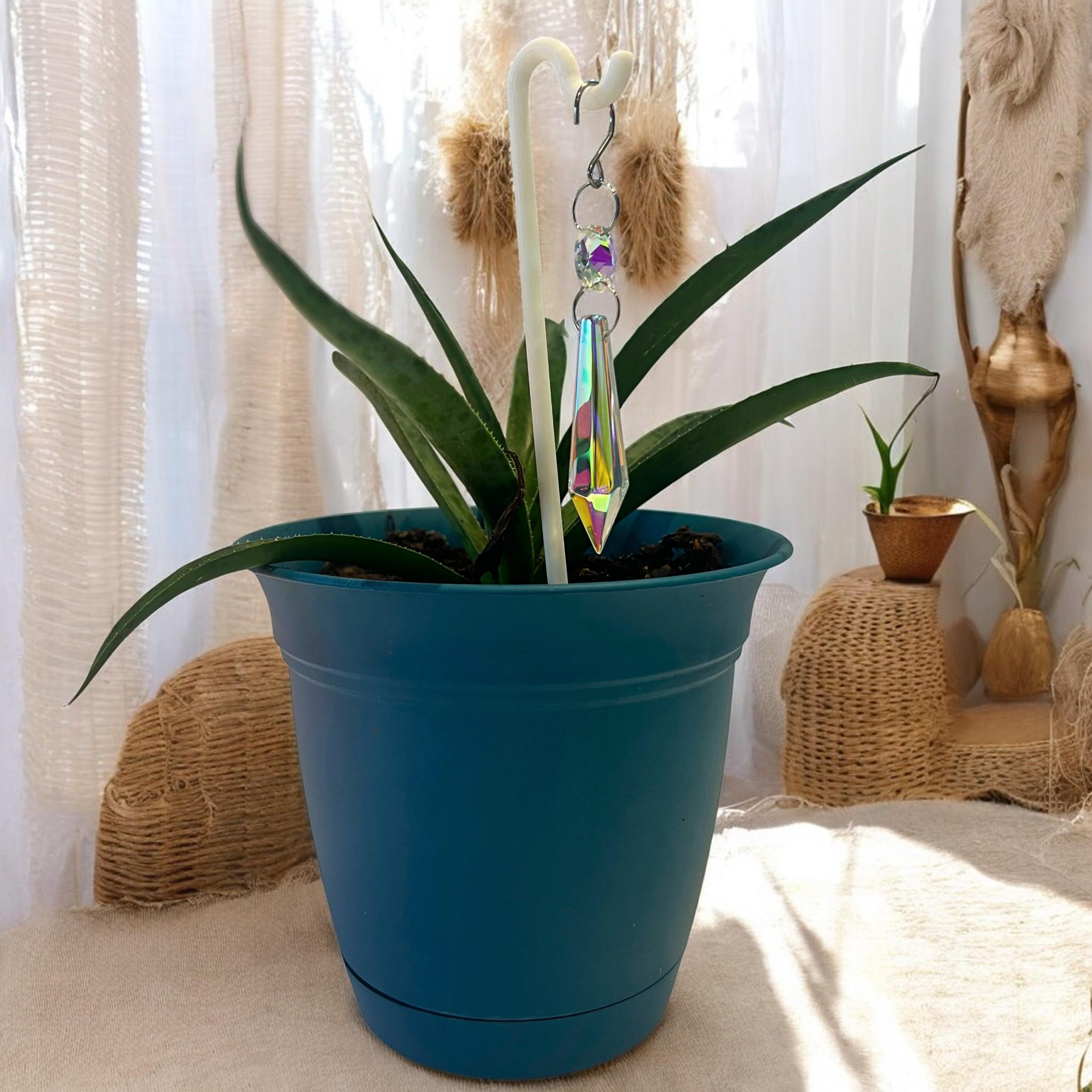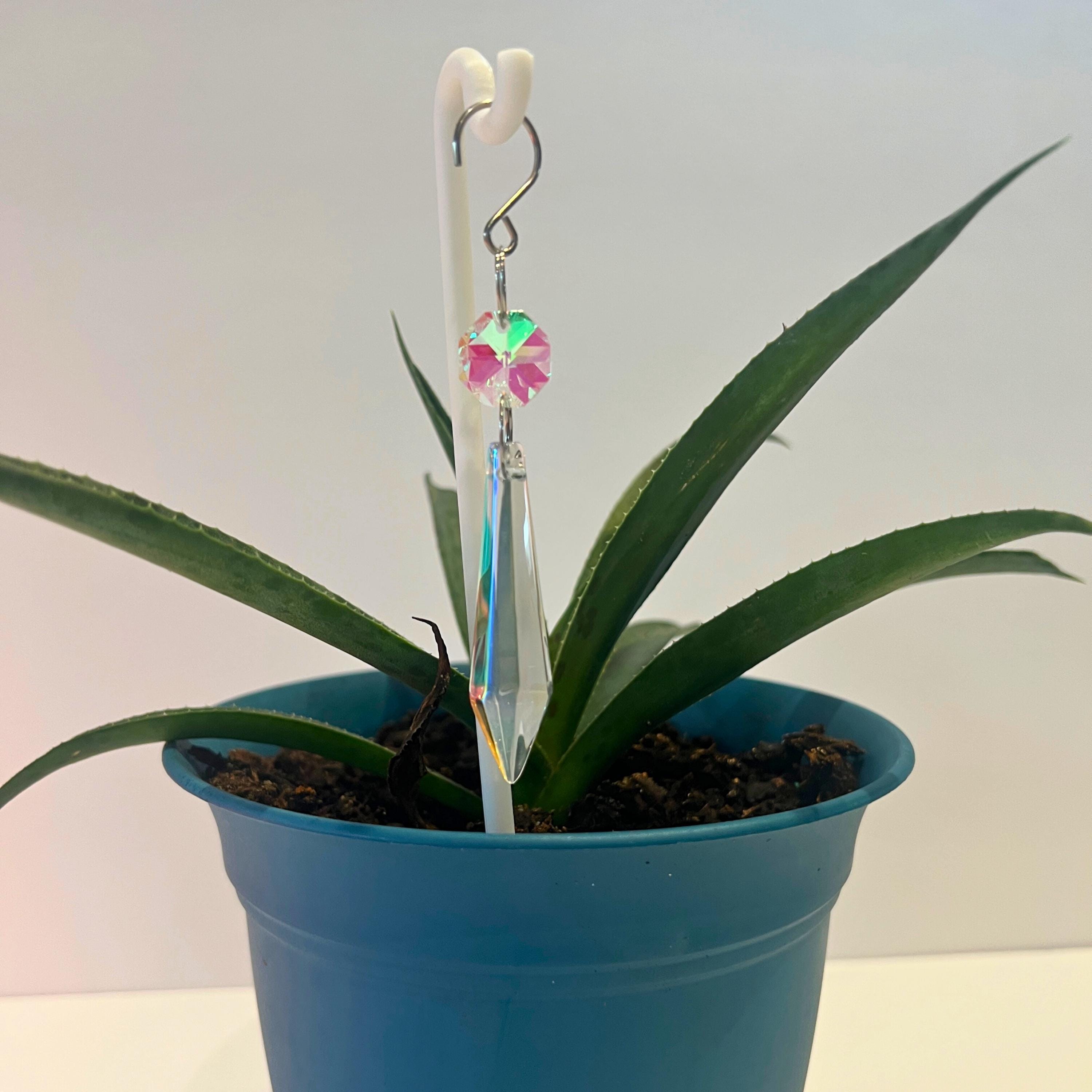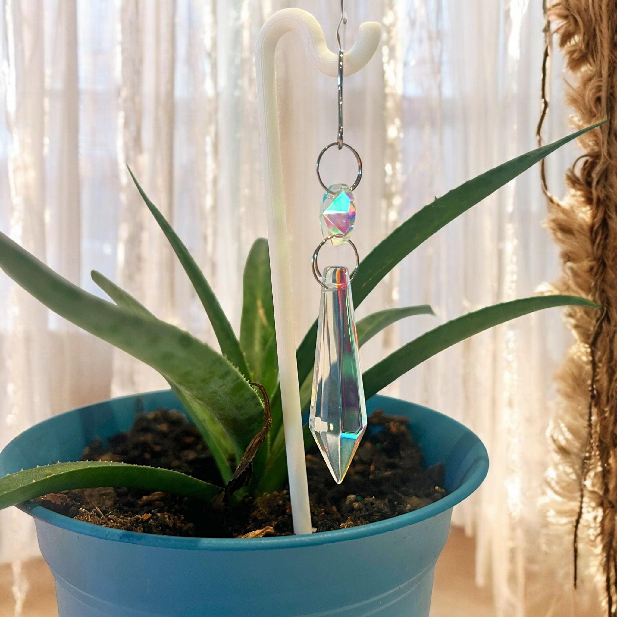 Prism Crystal Point Plant Sitter. 3D Printed Hook & Hanging Glass Crystal. Add a touch of light, love, and intention to your plants. Each Plant Pal Sitter features a genuine glass crystal point suspended from a 3D printed Shepherd’s Hook, designed to rest gently in your plant’s soil.