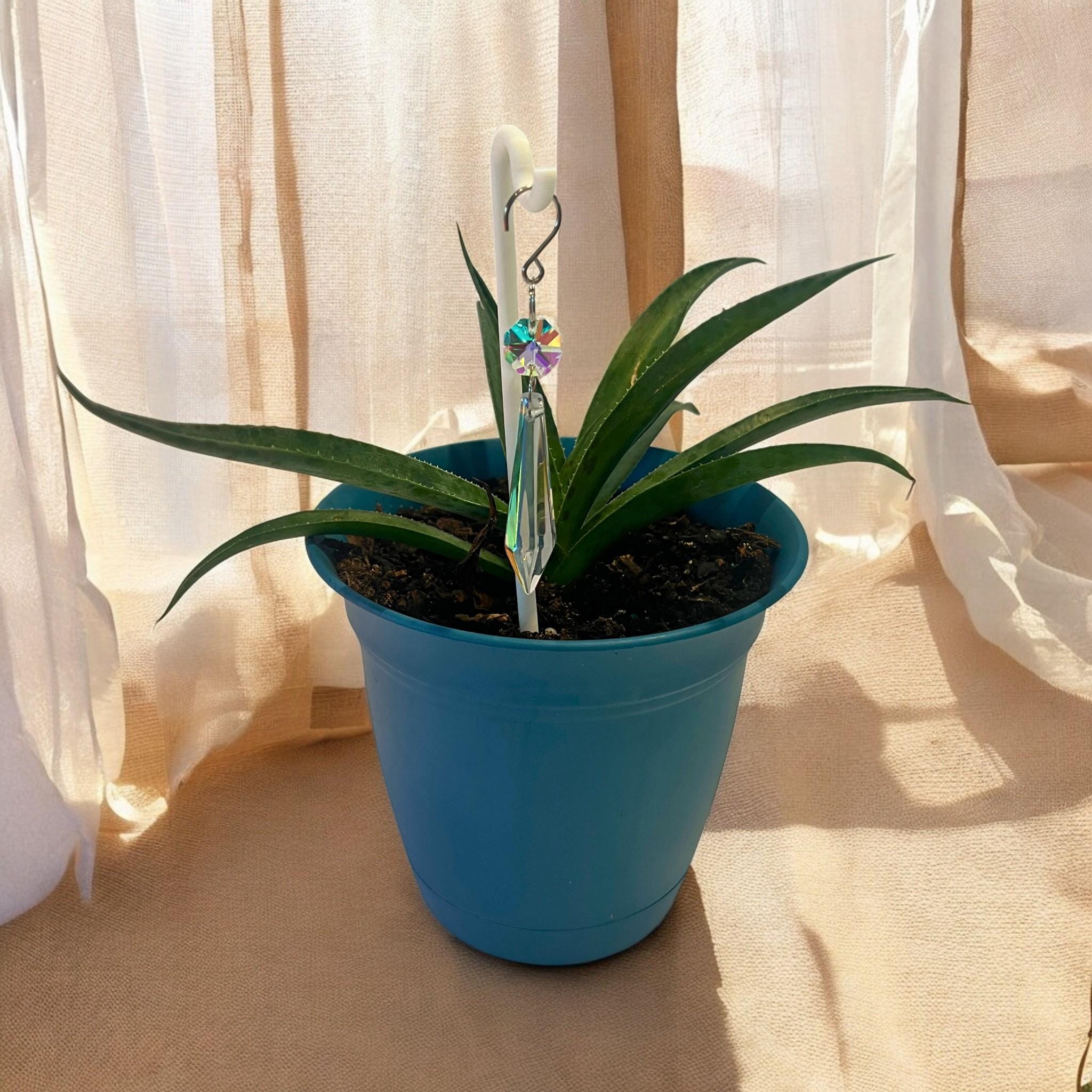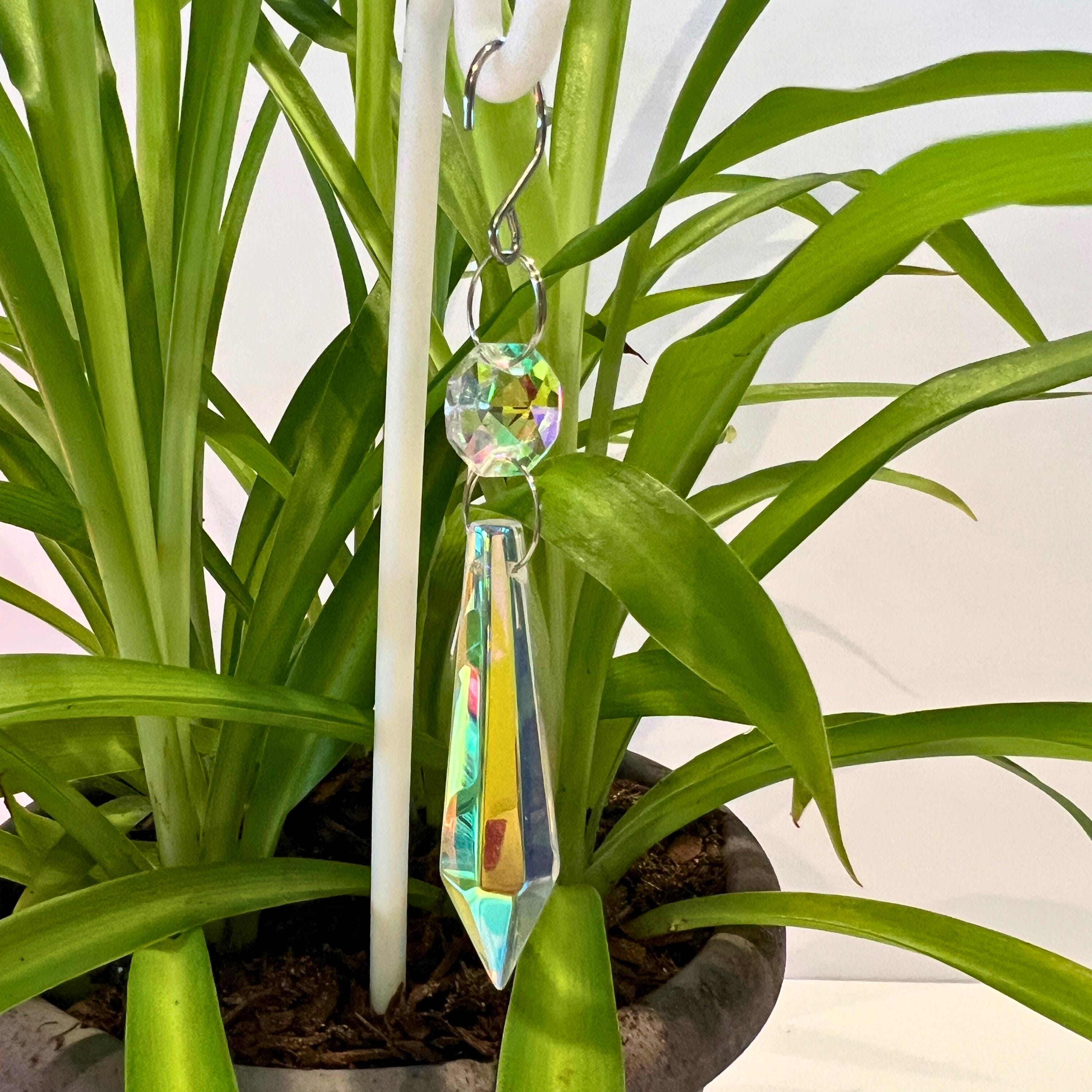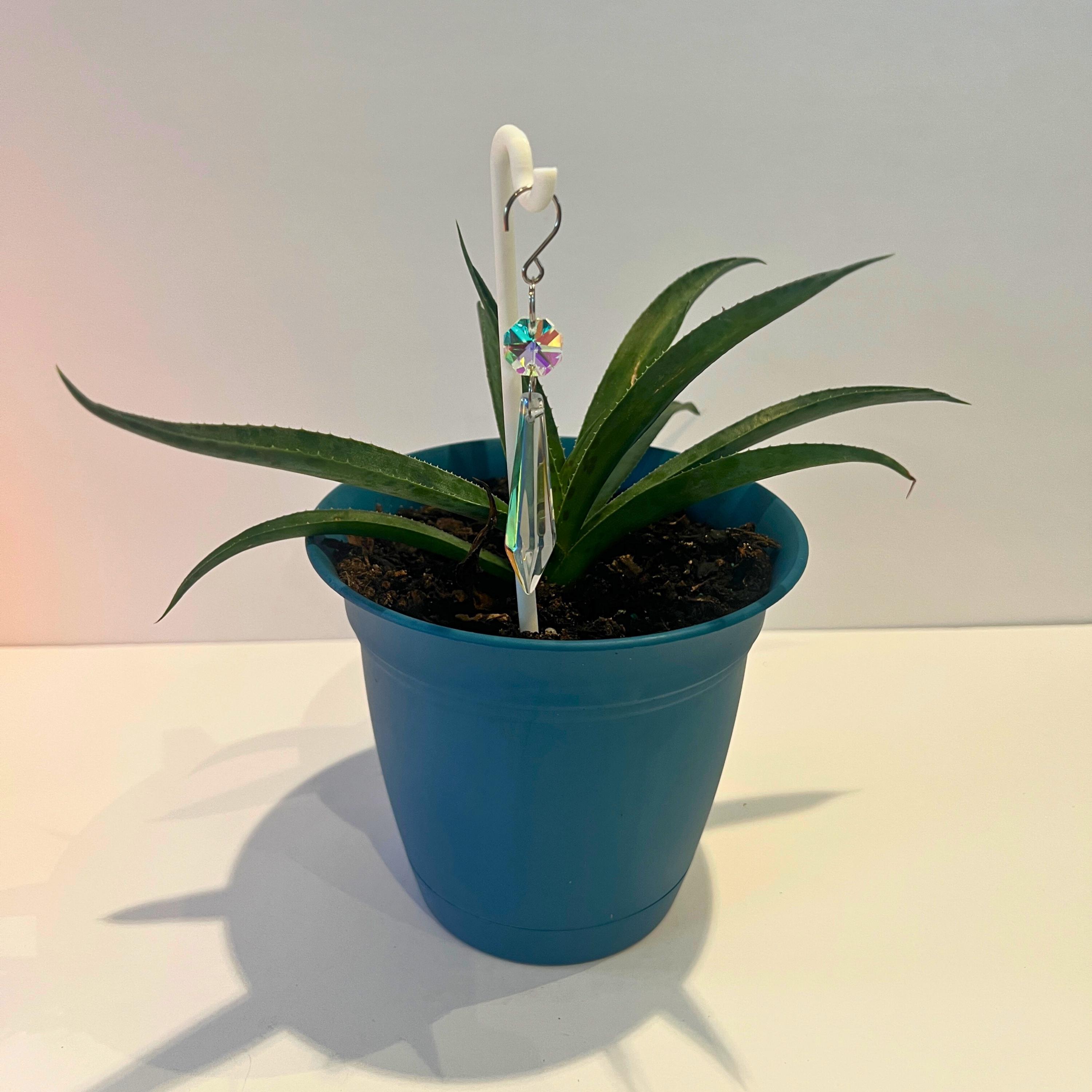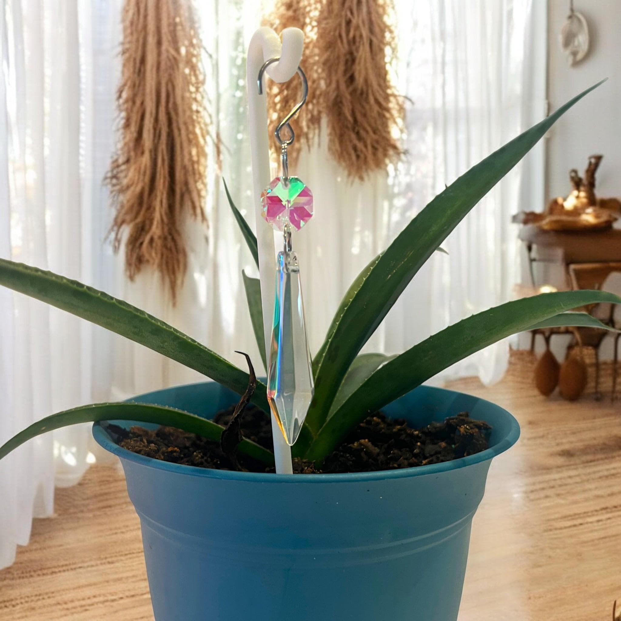 Prism Crystal Point Plant Sitter. 3D Printed Hook & Hanging Glass Crystal. Add a touch of light, love, and intention to your plants. Each Plant Pal Sitter features a genuine glass crystal point suspended from a 3D printed Shepherd’s Hook, designed to rest gently in your plant’s soil.