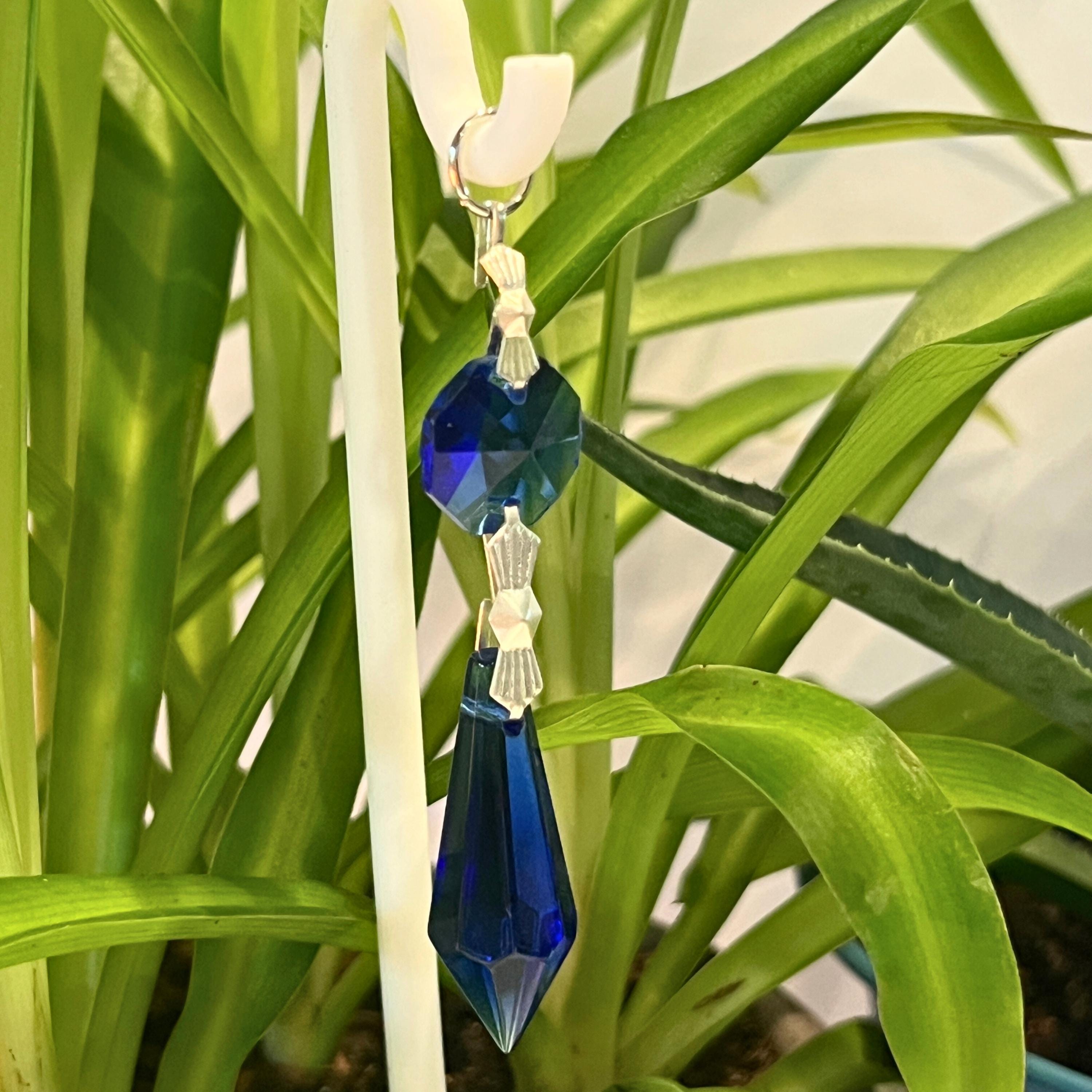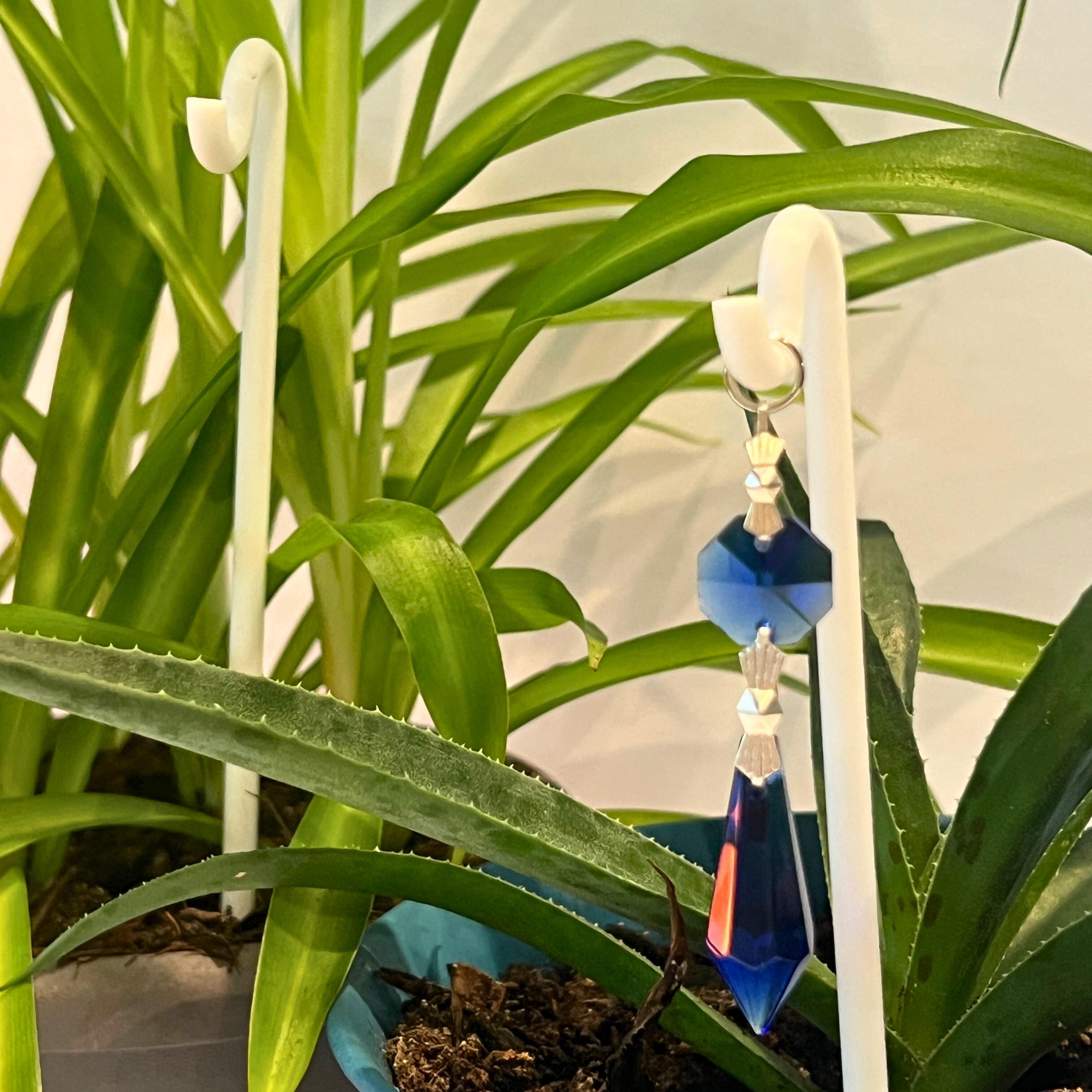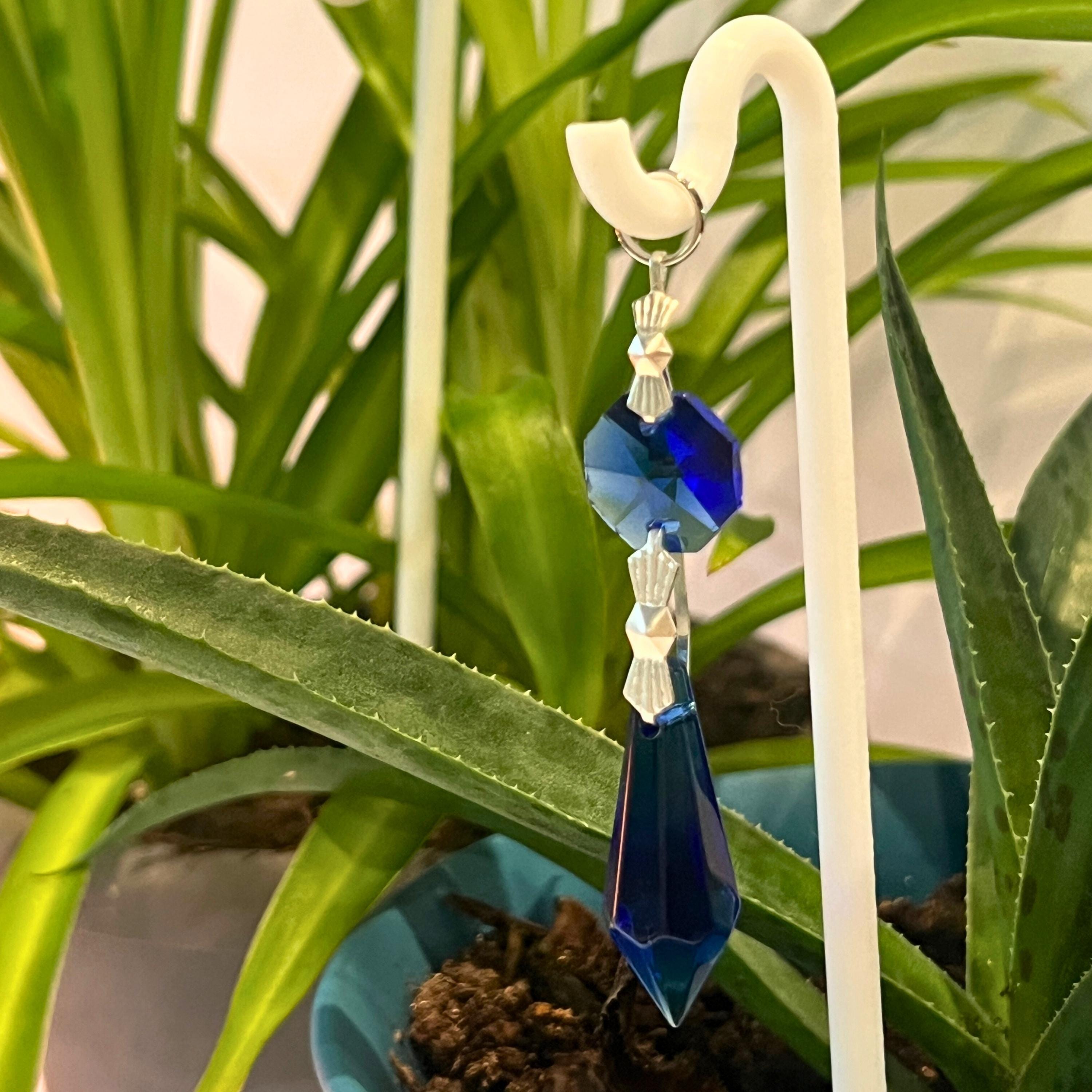 Blue Crystal Point Plant Stake Suncatcher. Add a touch of light, love, and intention to your plants. Each Plant Pal Sitter features a genuine glass crystal point suspended from a 3D printed Shepherd’s Hook, designed to rest gently in your plant’s soil.