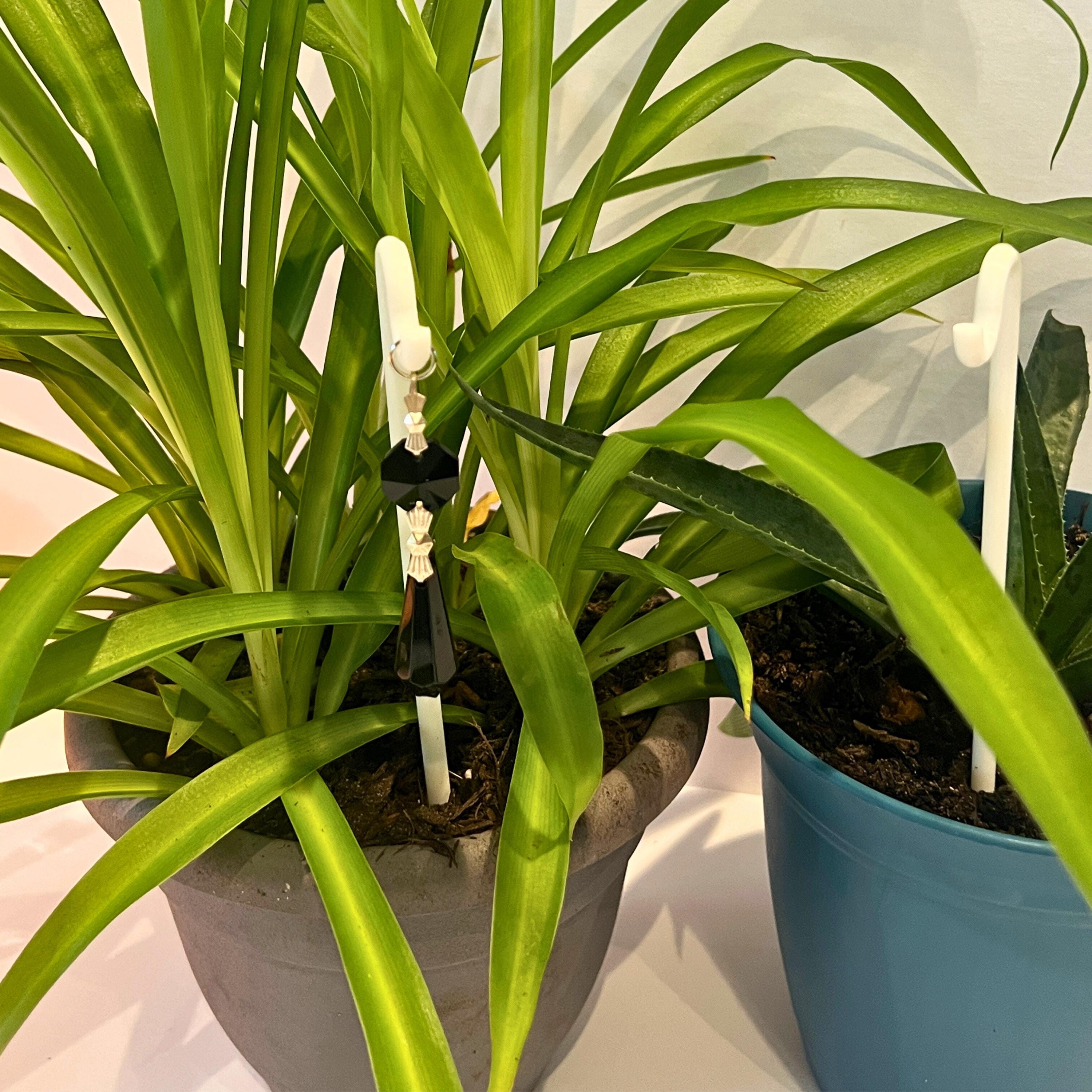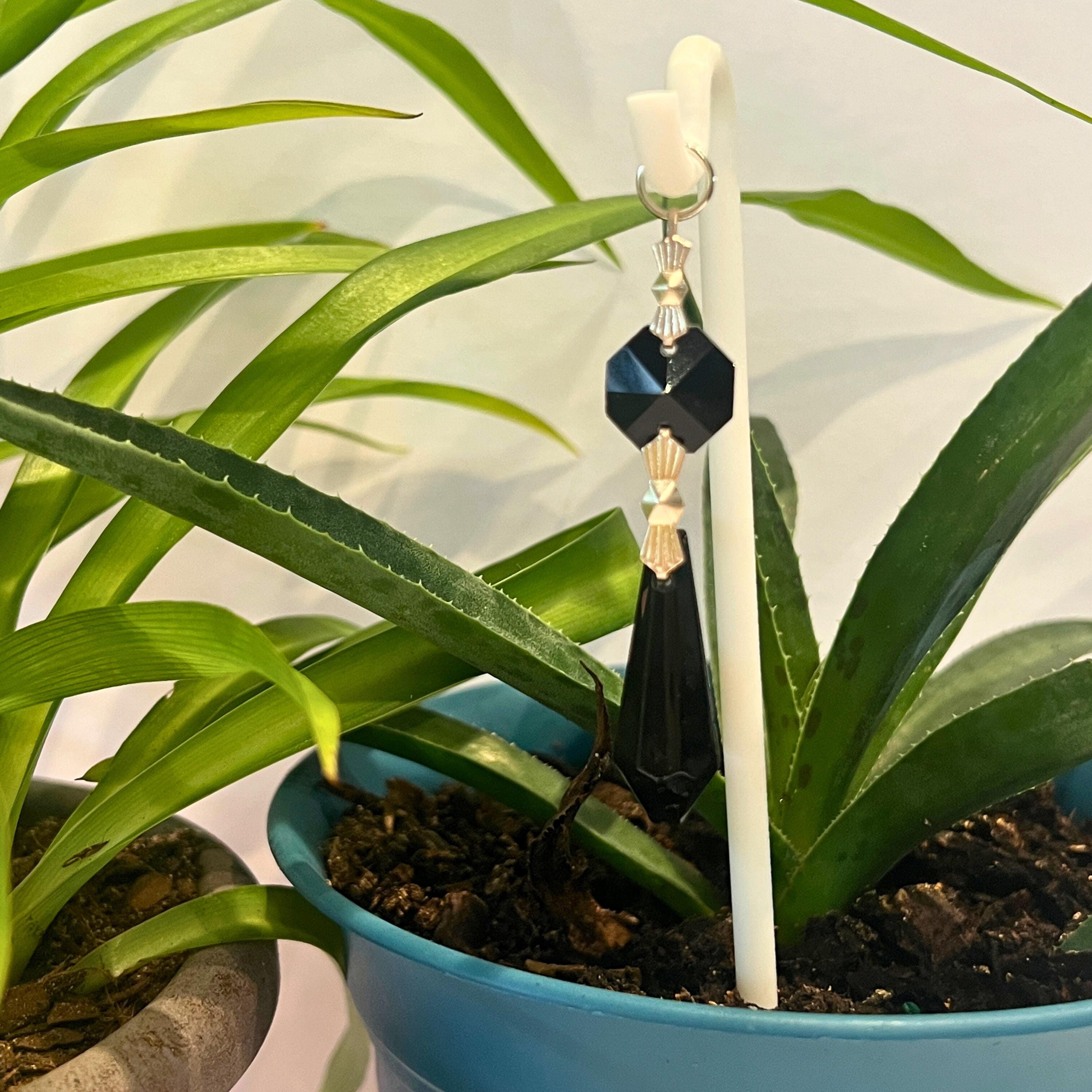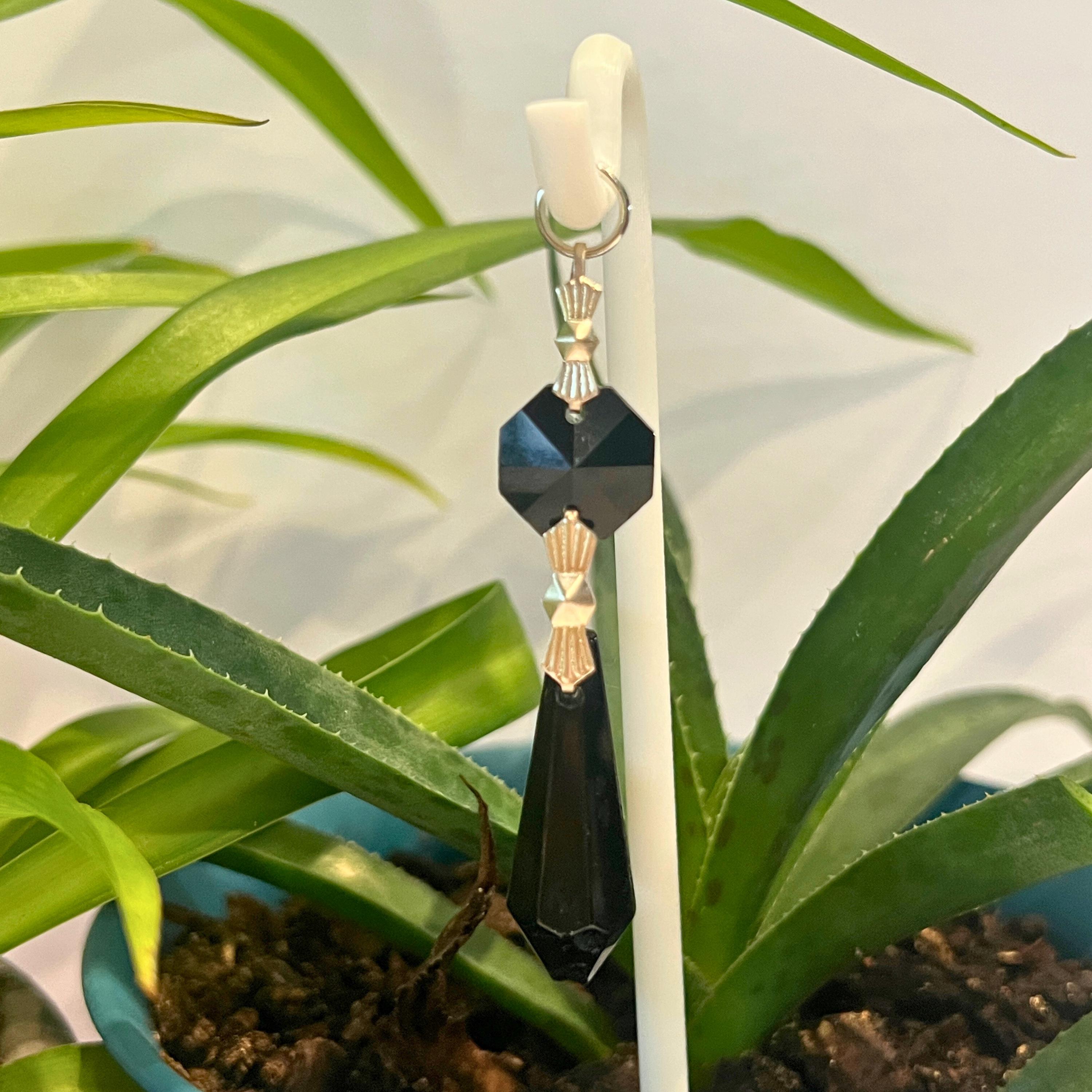 Black Crystal Point Plant Stake Suncatcher. Add a touch of light, love, and intention to your plants. Each Plant Pal Sitter features a genuine glass crystal point suspended from a 3D printed Shepherd’s Hook, designed to rest gently in your plant’s soil.