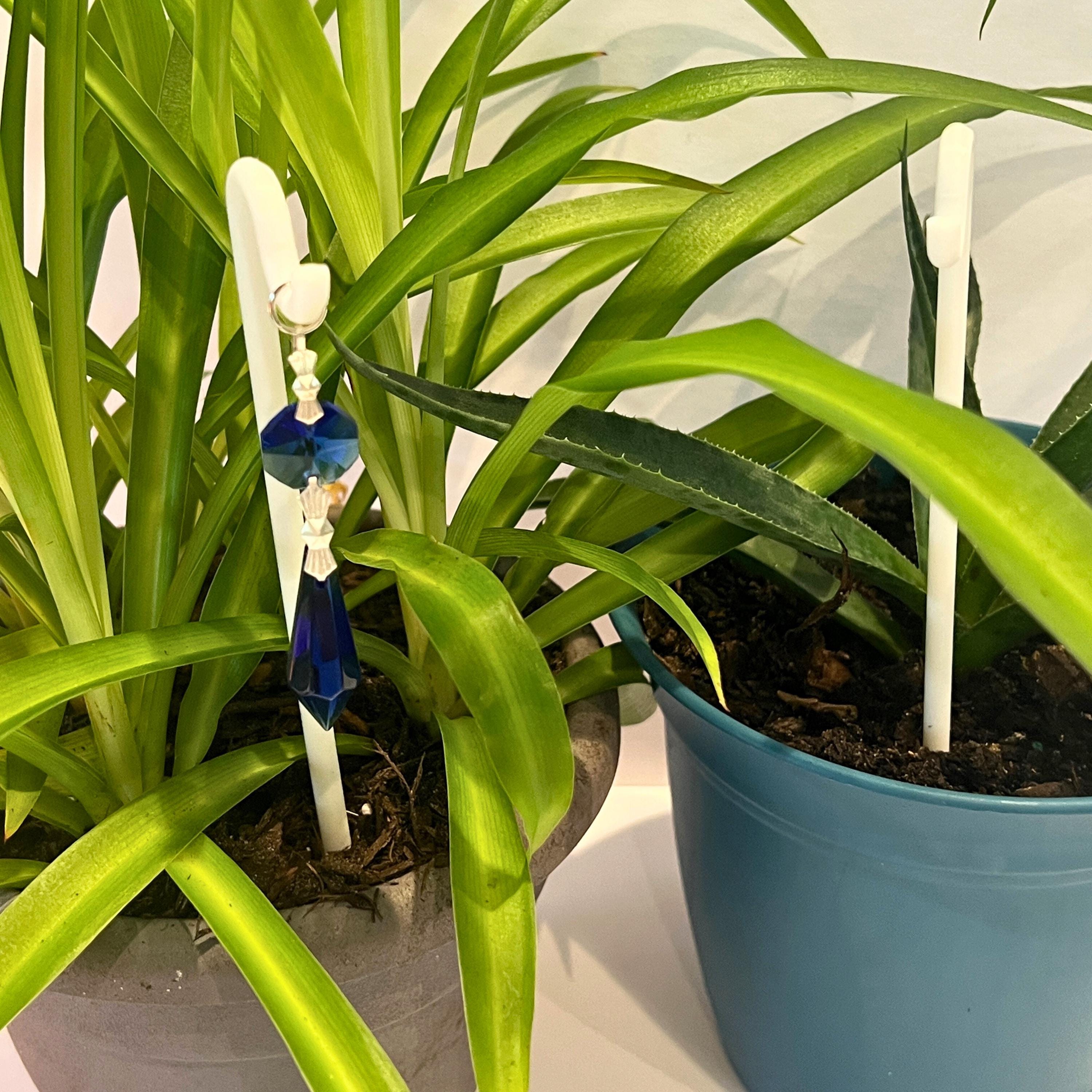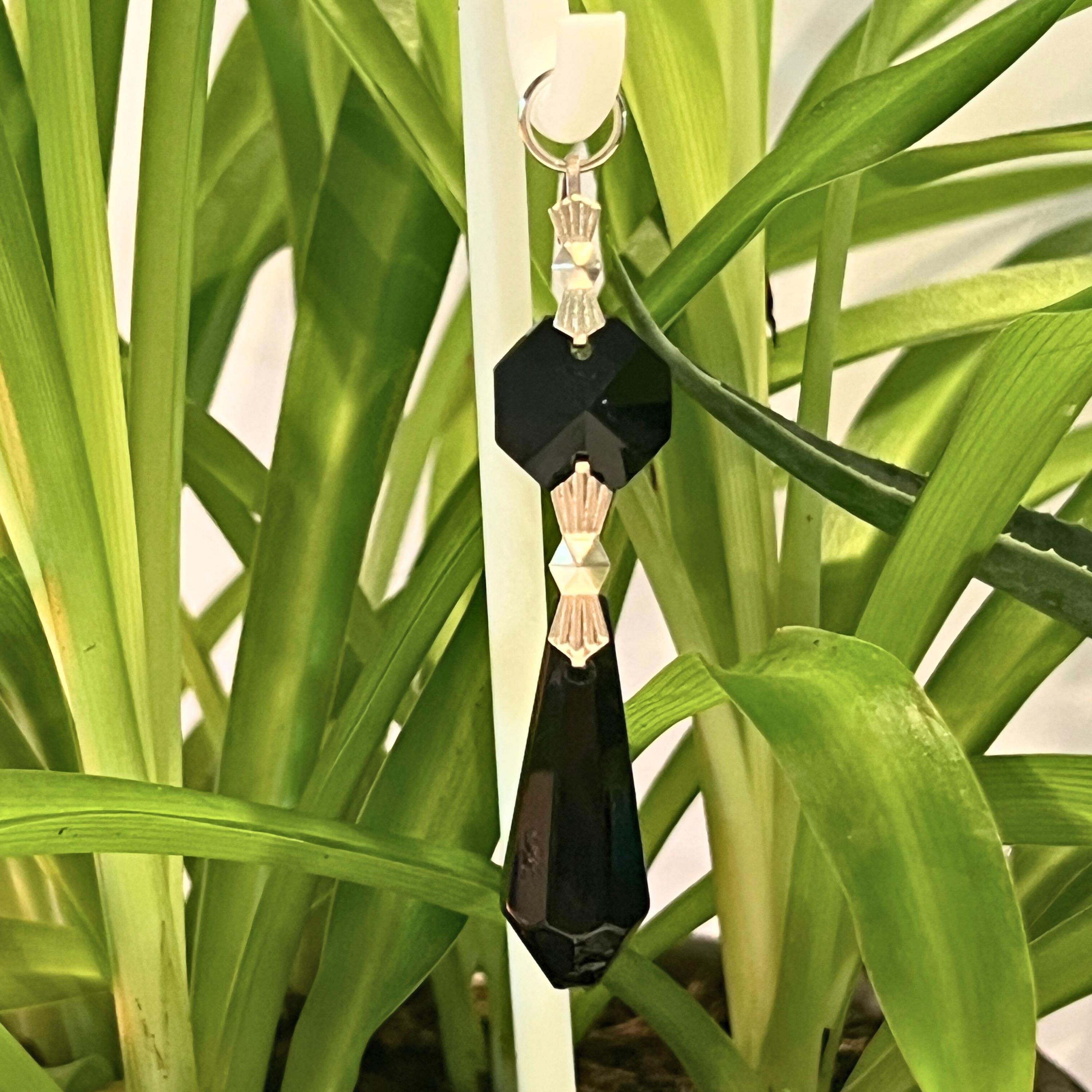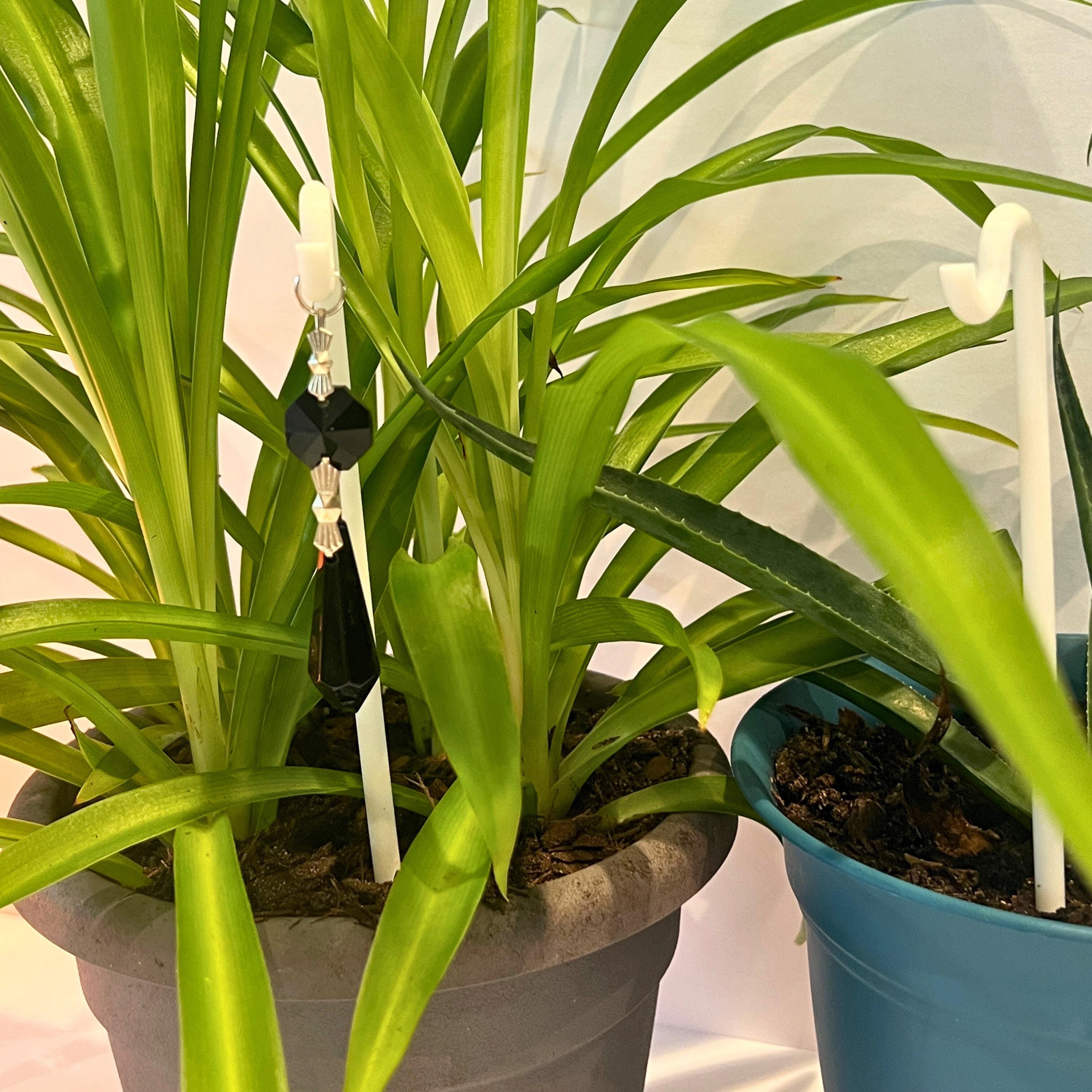 Black Crystal Point Plant Stake Suncatcher. Add a touch of light, love, and intention to your plants. Each Plant Pal Sitter features a genuine glass crystal point suspended from a 3D printed Shepherd’s Hook, designed to rest gently in your plant’s soil.