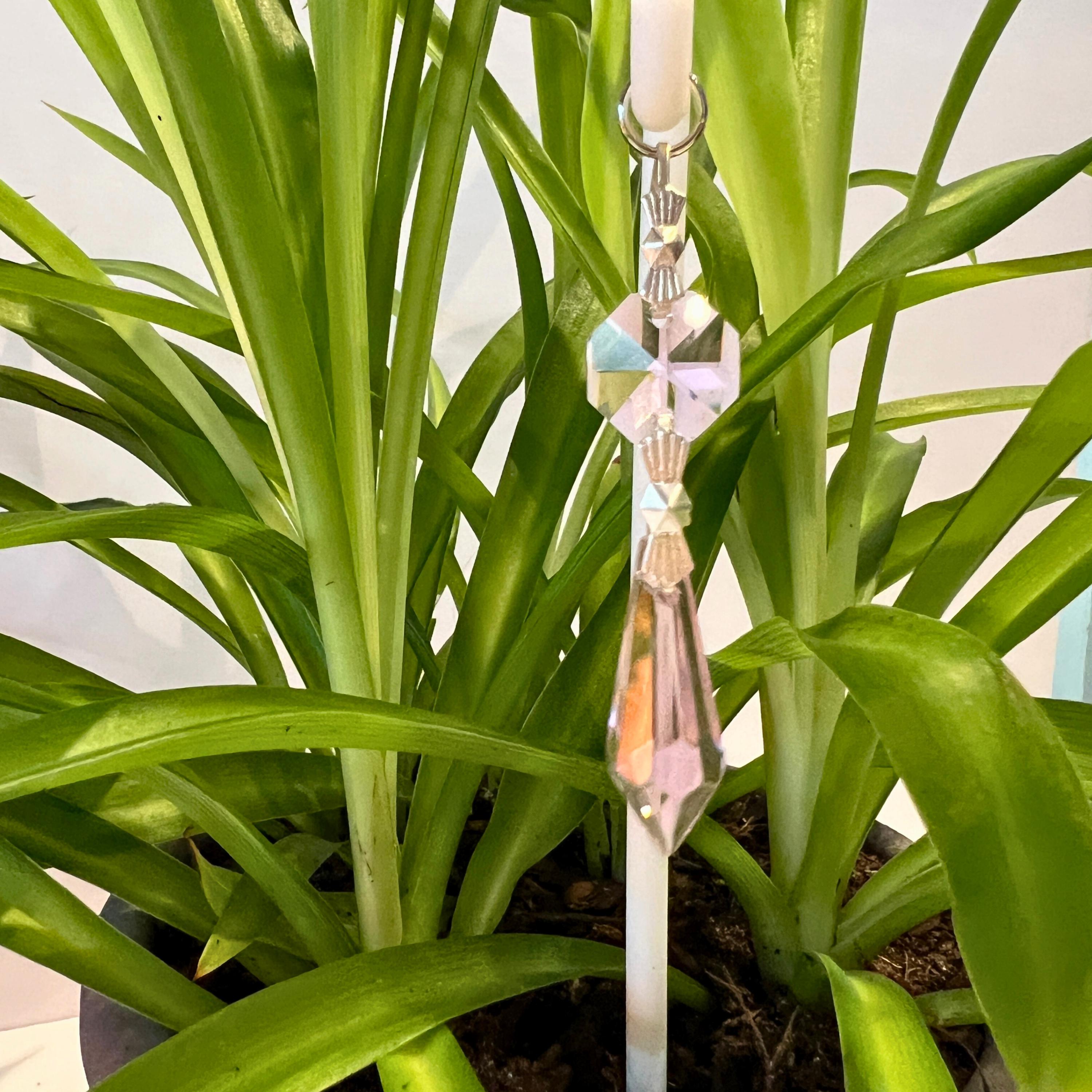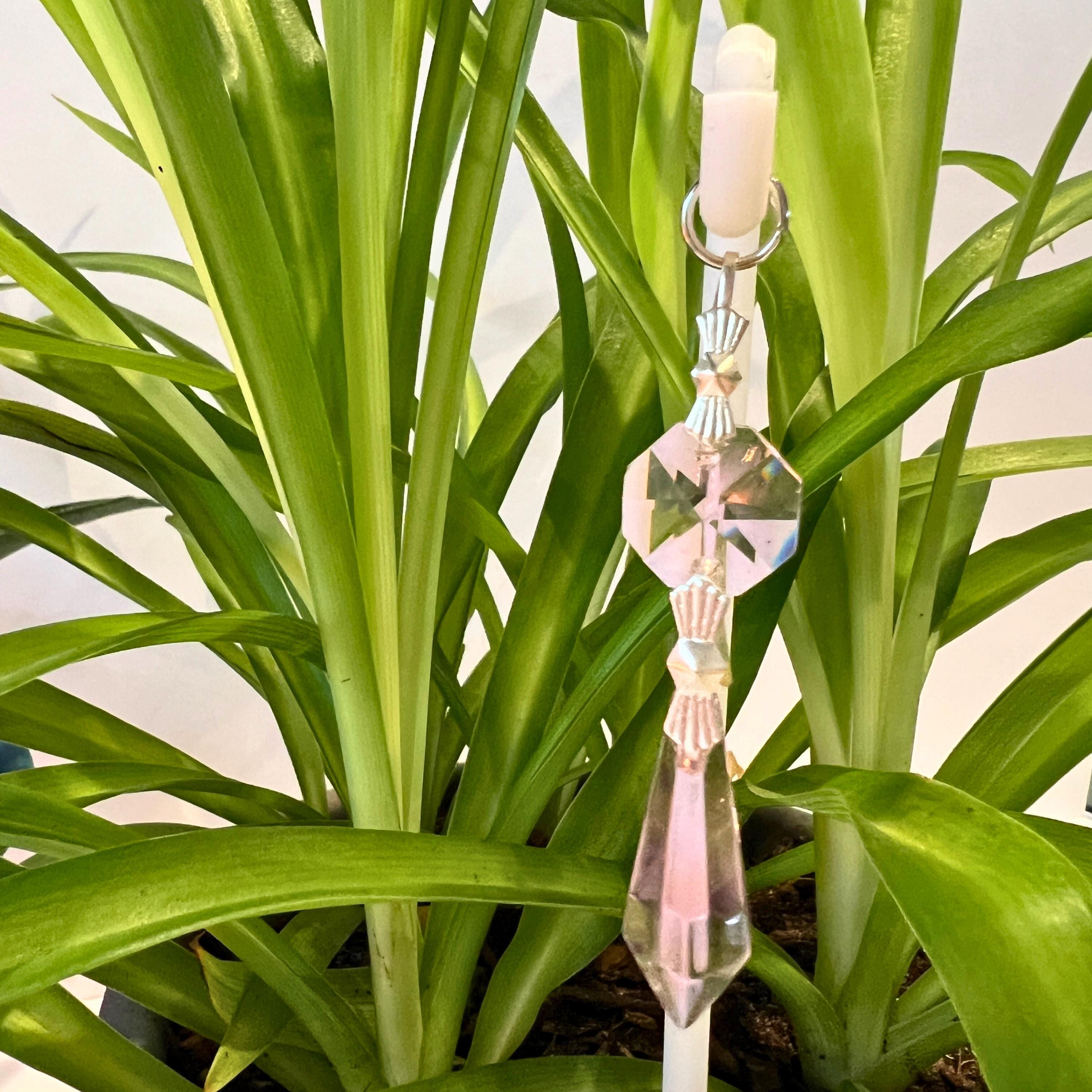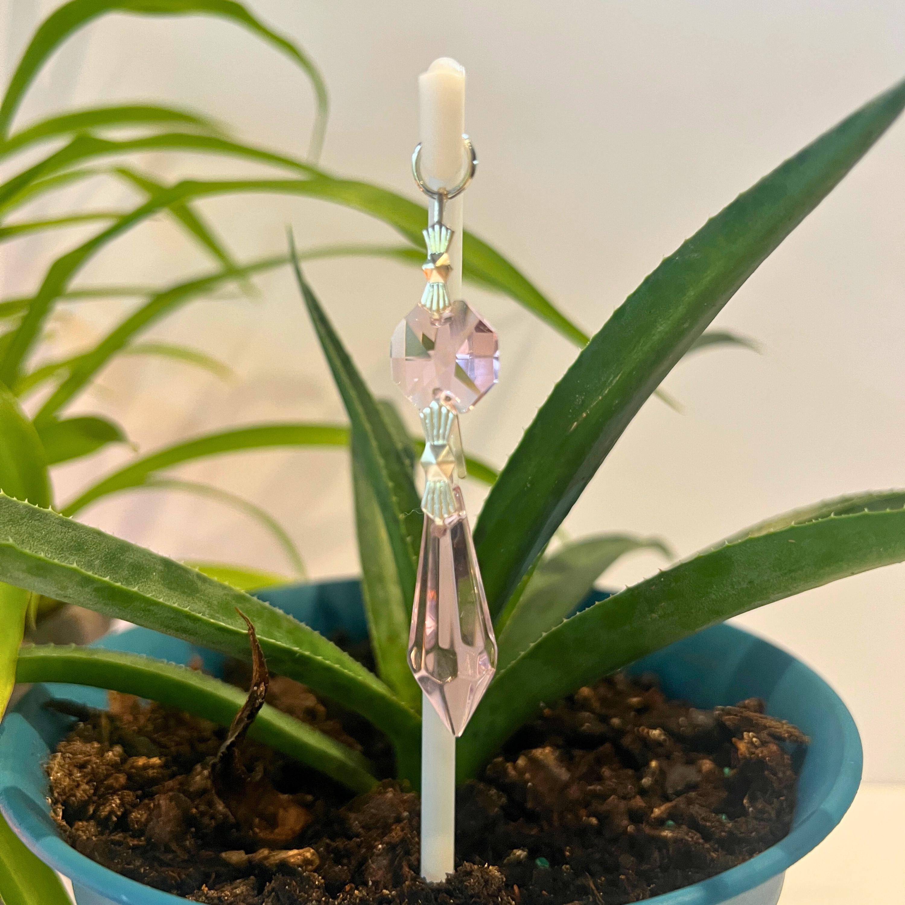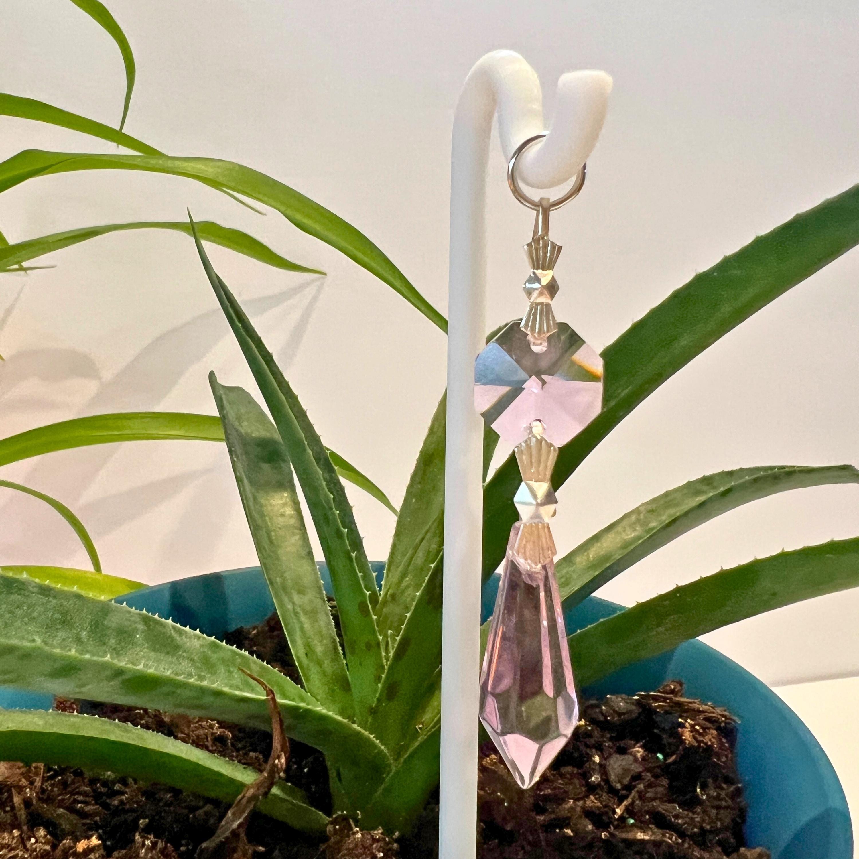 Pink Crystal Point Plant Stake Suncatcher. Add a touch of light, love, and intention to your plants. Each Plant Pal Sitter features a genuine glass crystal point suspended from a 3D printed Shepherd’s Hook, designed to rest gently in your plant’s soil.