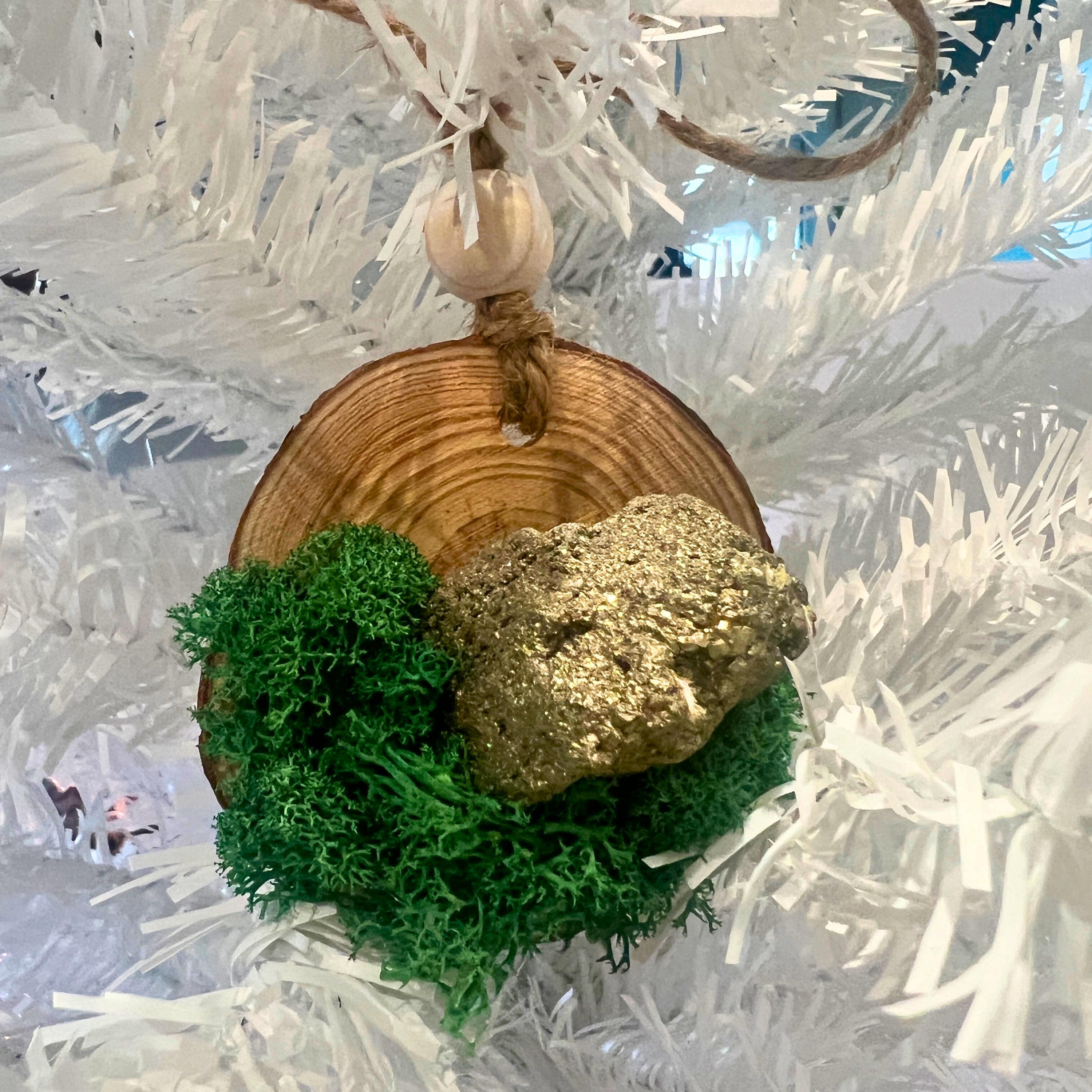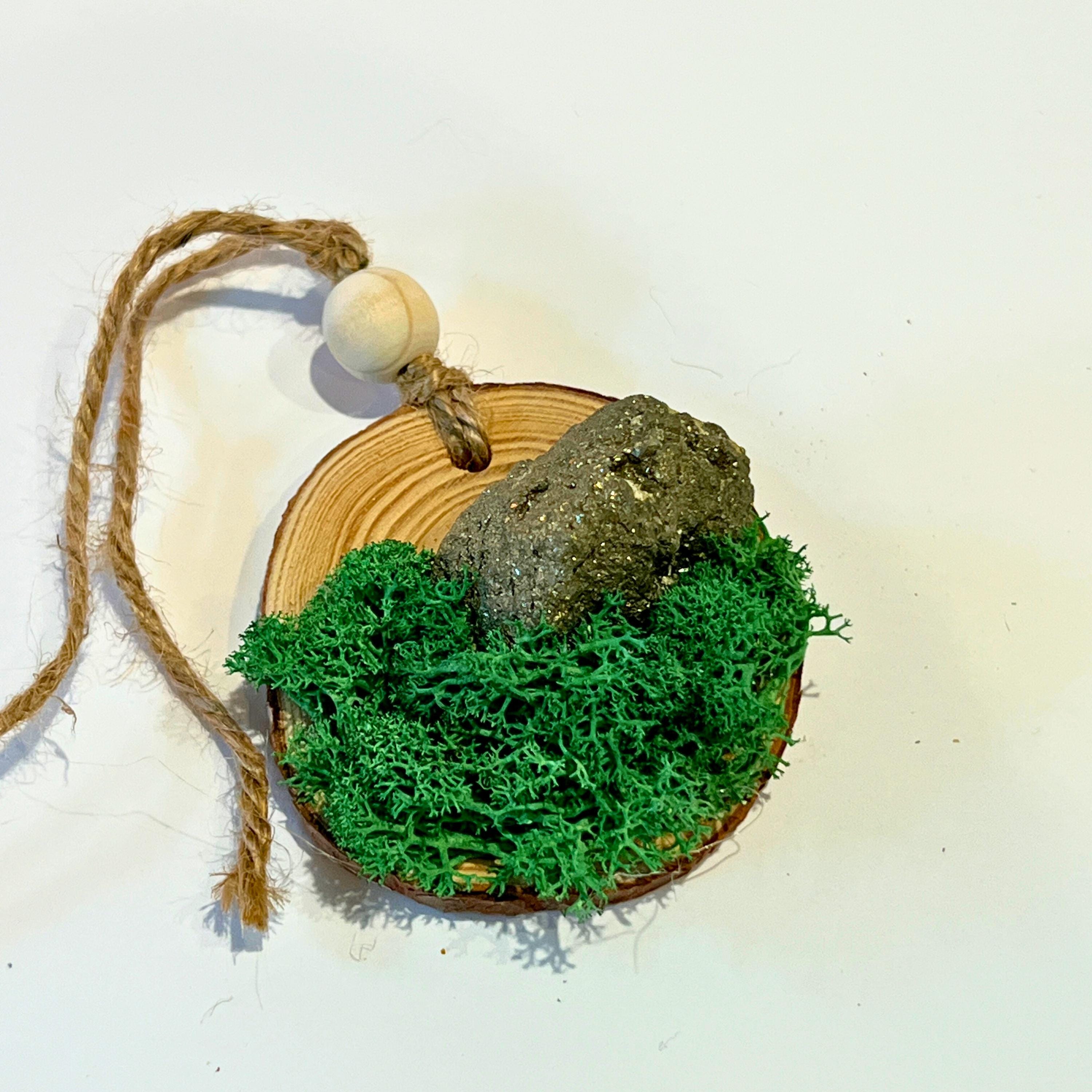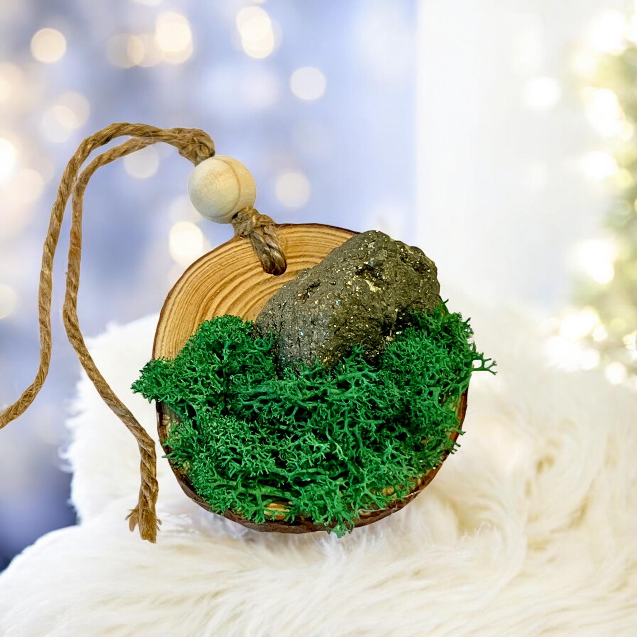 Known as “Fool’s Gold,” Pyrite is a symbol of protection and grounding energy. Each ornament pairs this powerful stone with a rustic wood slice and moss for a bold, natural look. Perfect for those drawn to earthy textures, spiritual décor, and meaningful handmade gifts.