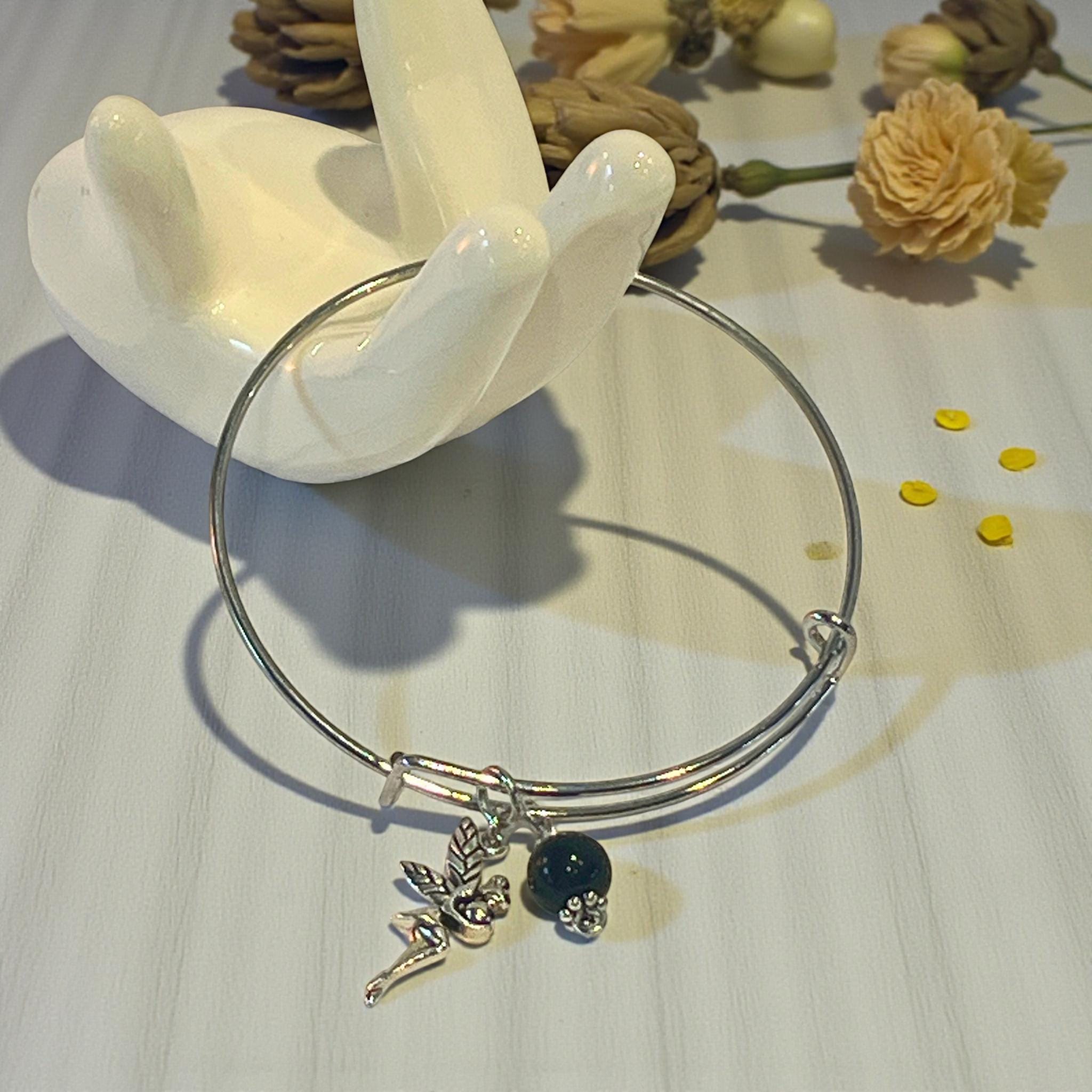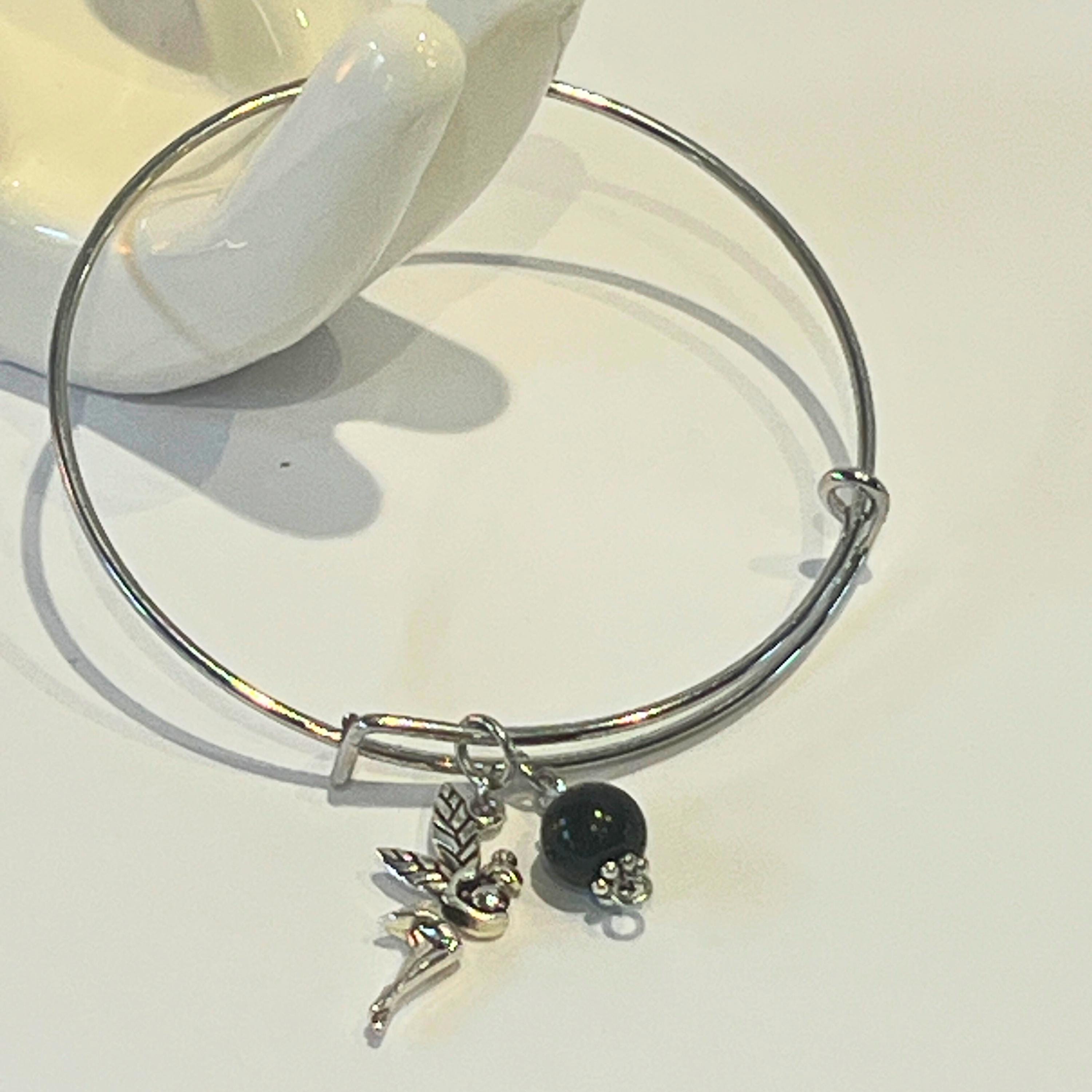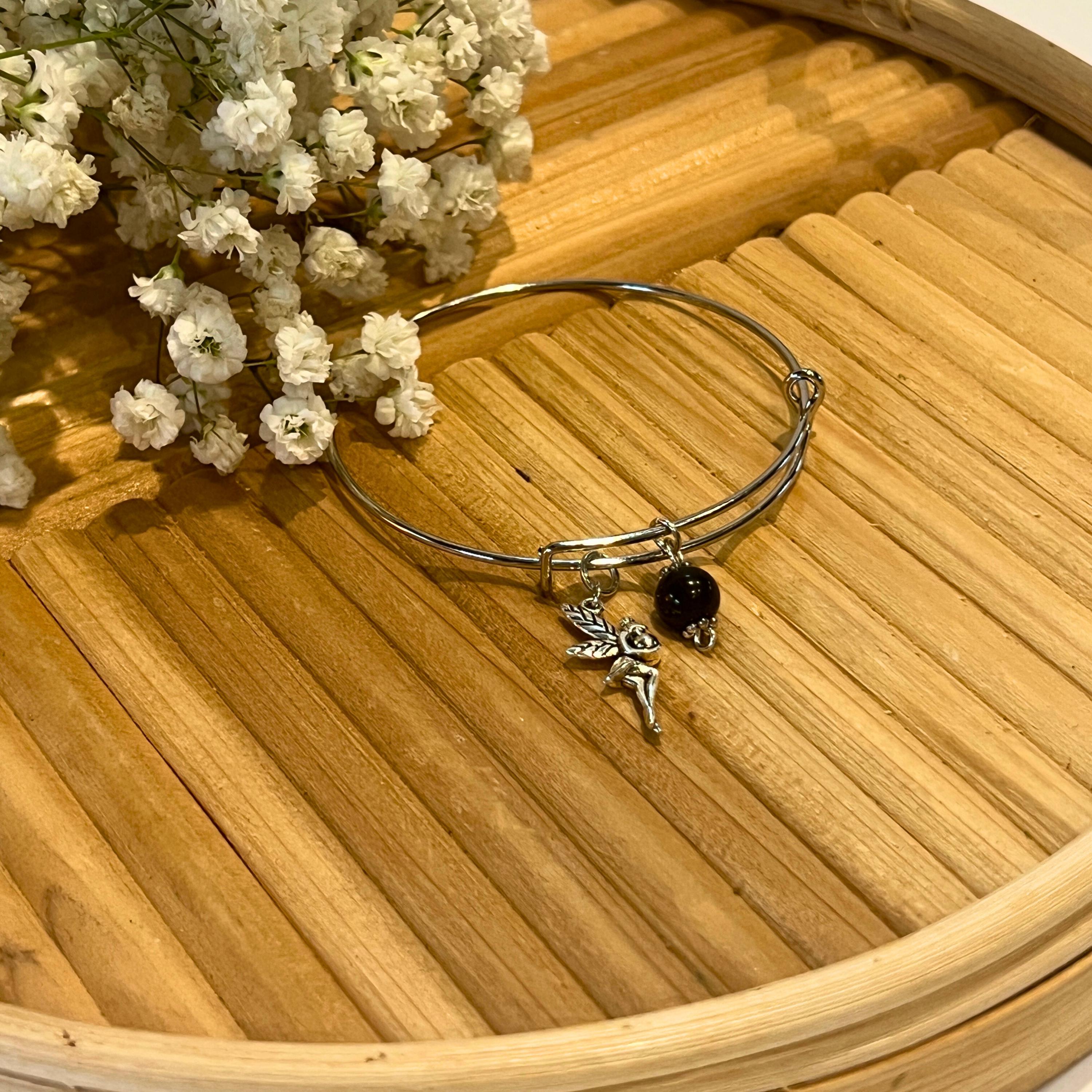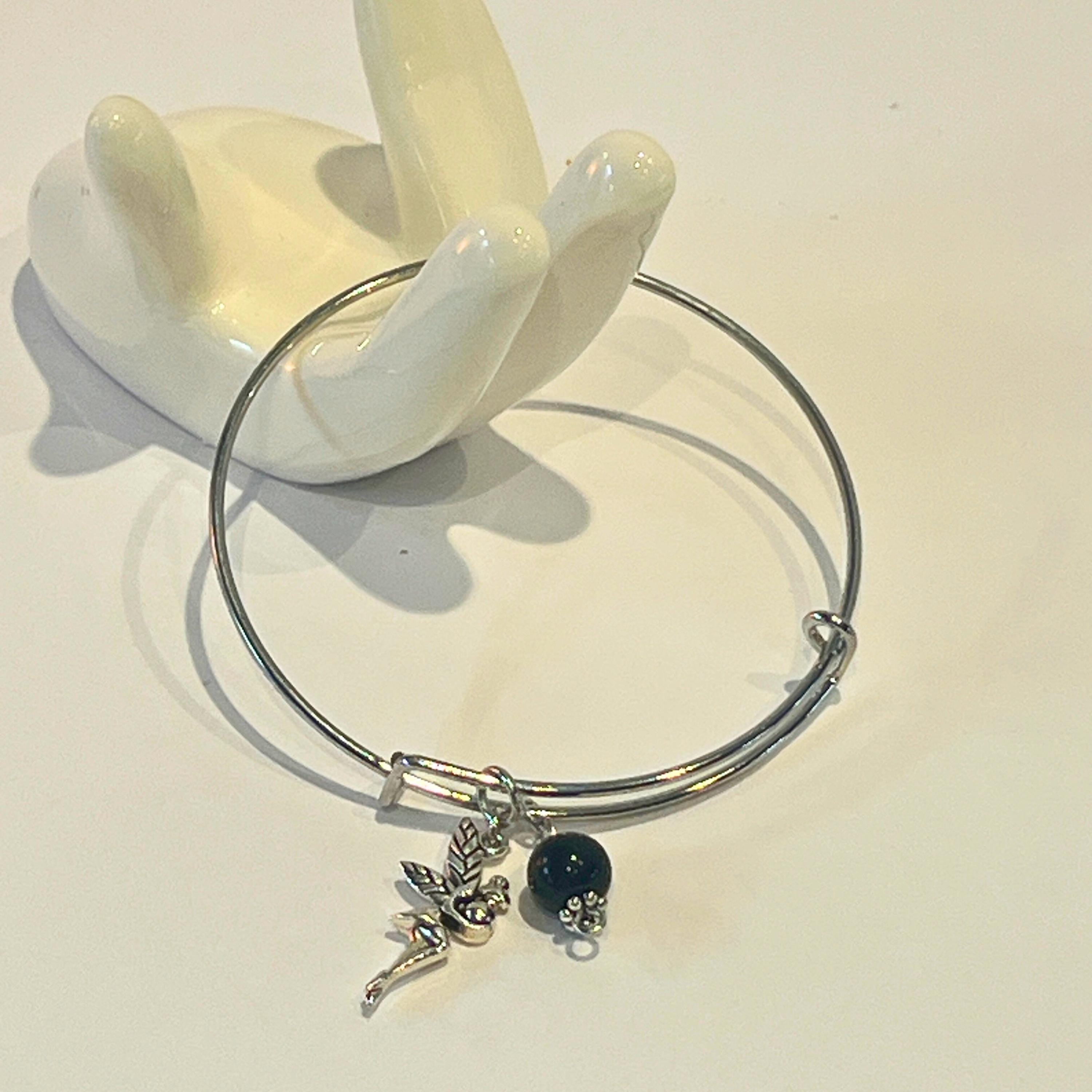 Where light meets magic. The Fairy Sitting on the Moon Bracelet brings a touch of enchantment to everyday life. A silver bangle with a black glass bead and detailed charm perfect for the woman who still believes in wonder. Comfortable, stackable, and easy to wear a meaningful token of beauty, light, and imagination.