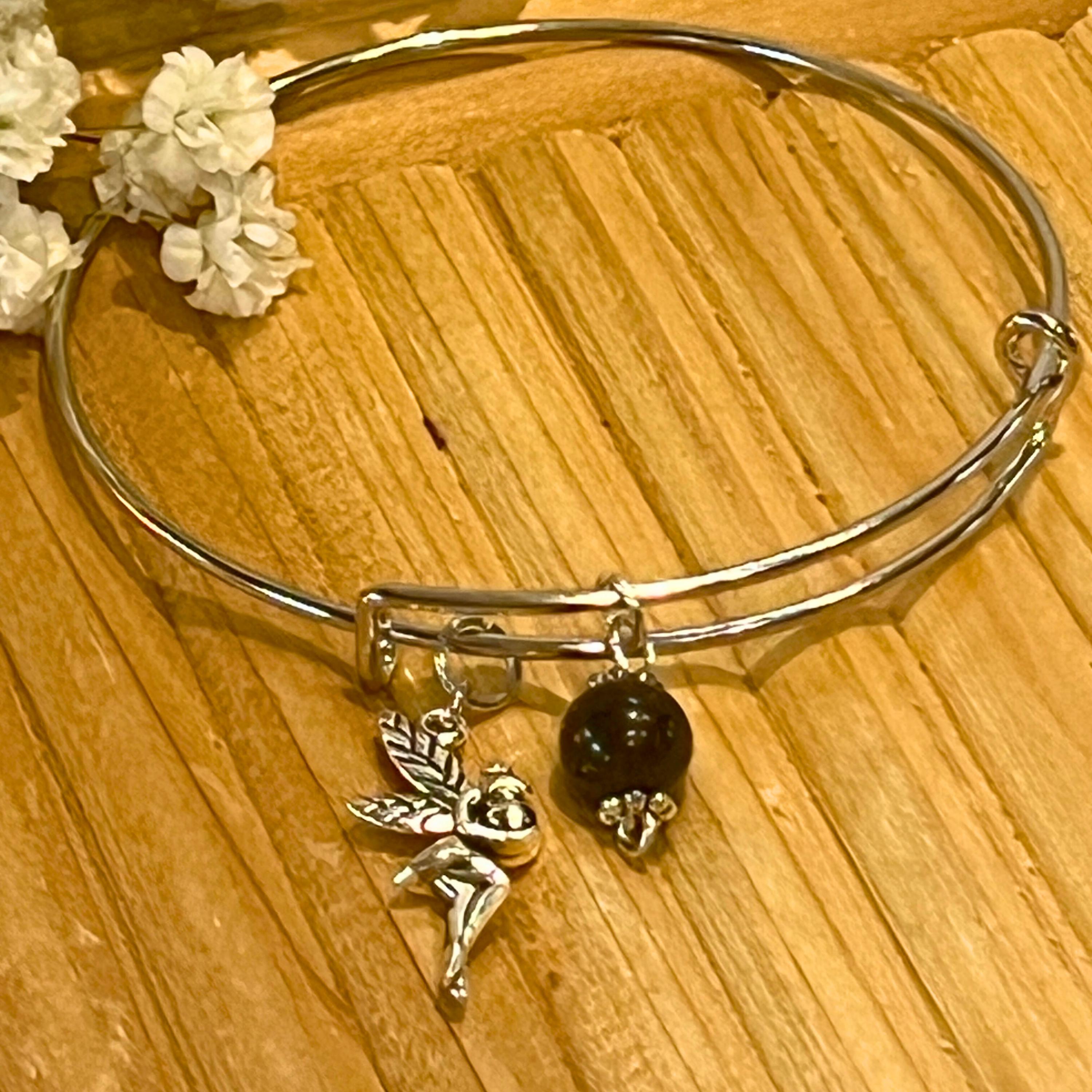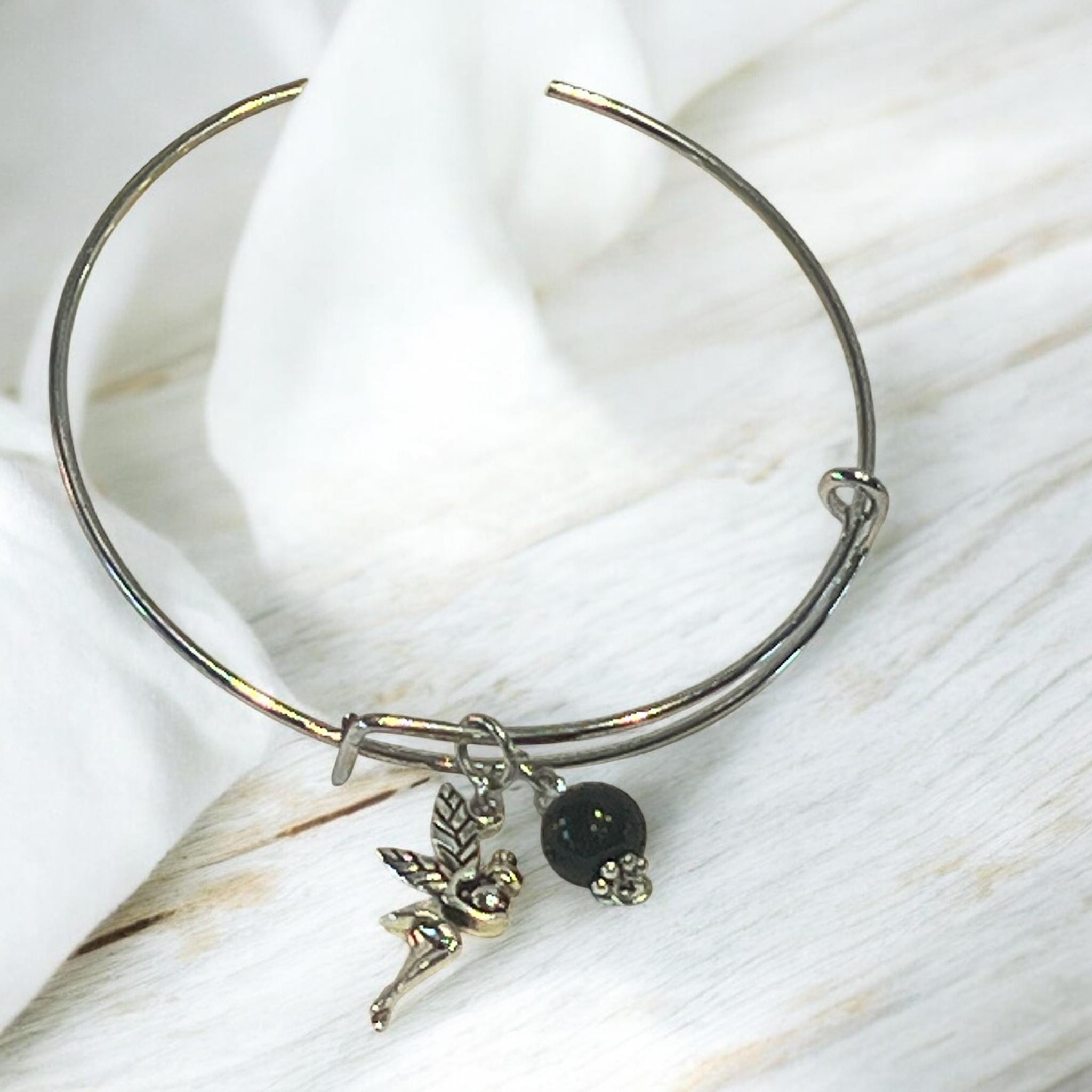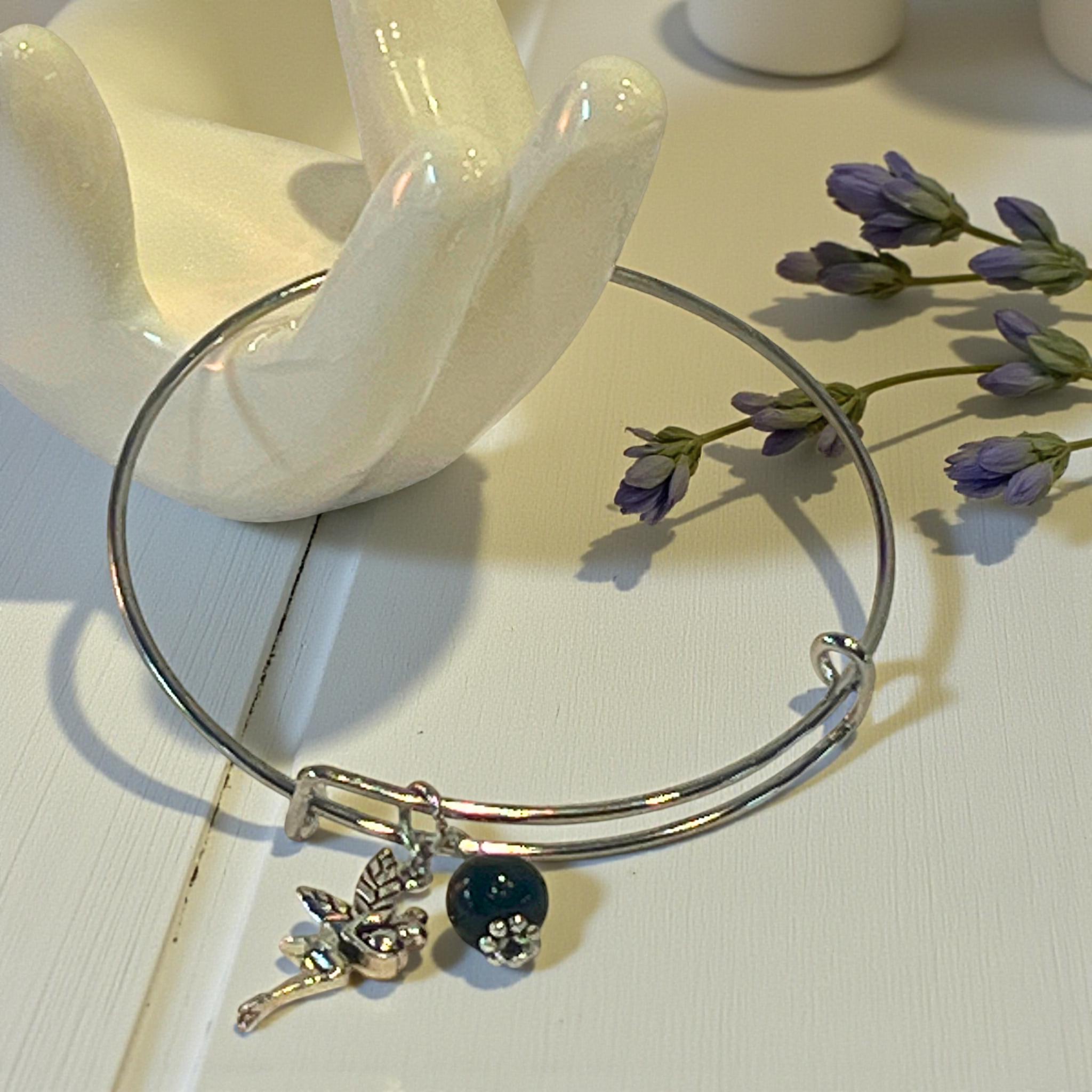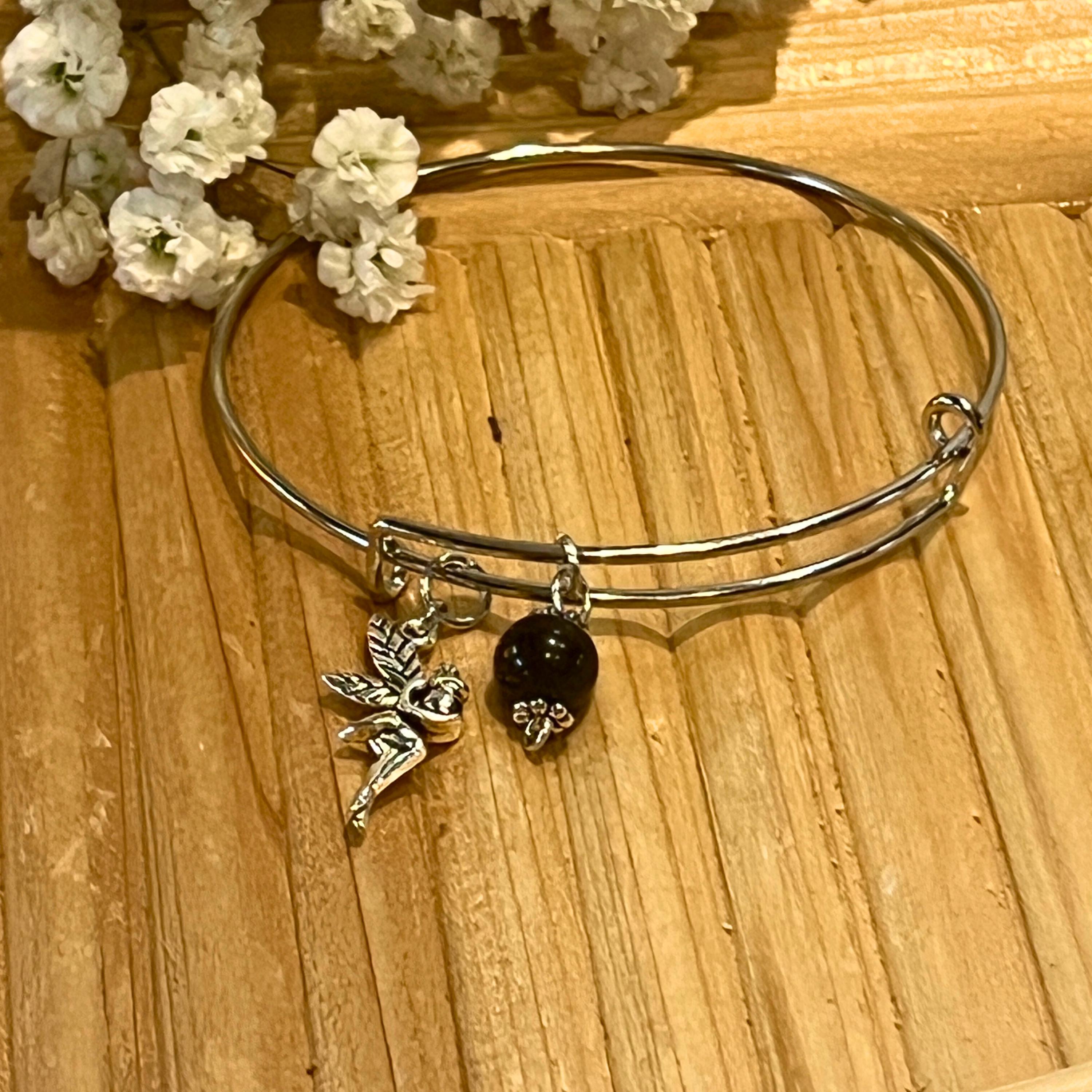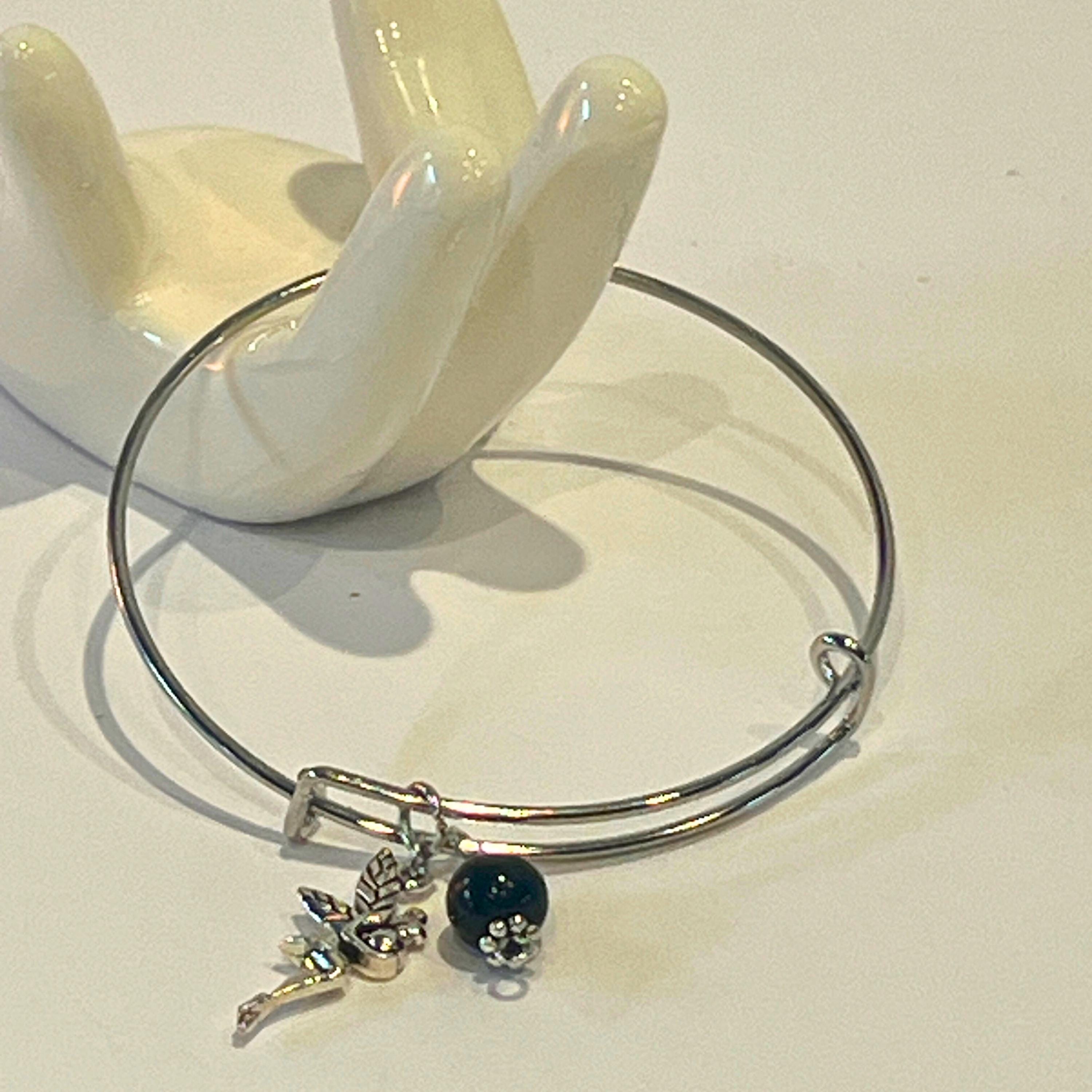Where light meets magic. The Fairy Sitting on the Moon Bracelet brings a touch of enchantment to everyday life. A silver bangle with a black glass bead and detailed charm perfect for the woman who still believes in wonder. Comfortable, stackable, and easy to wear a meaningful token of beauty, light, and imagination.