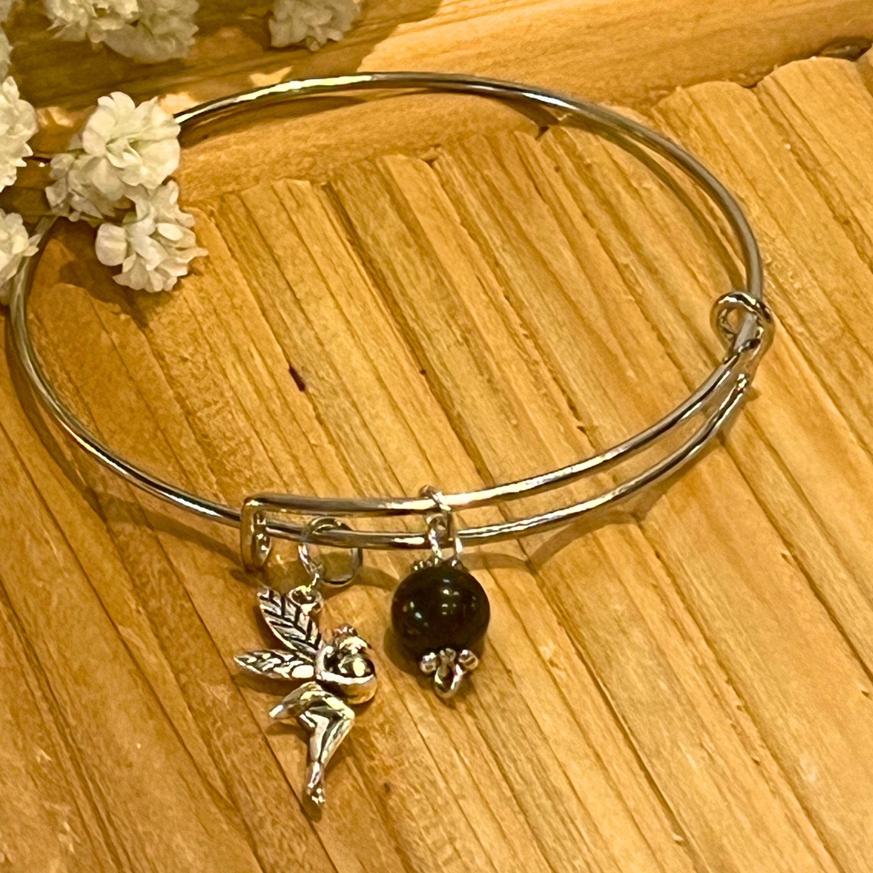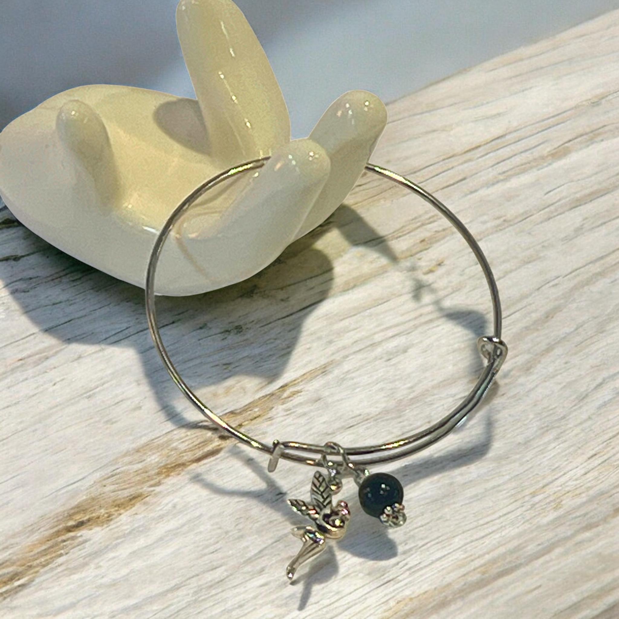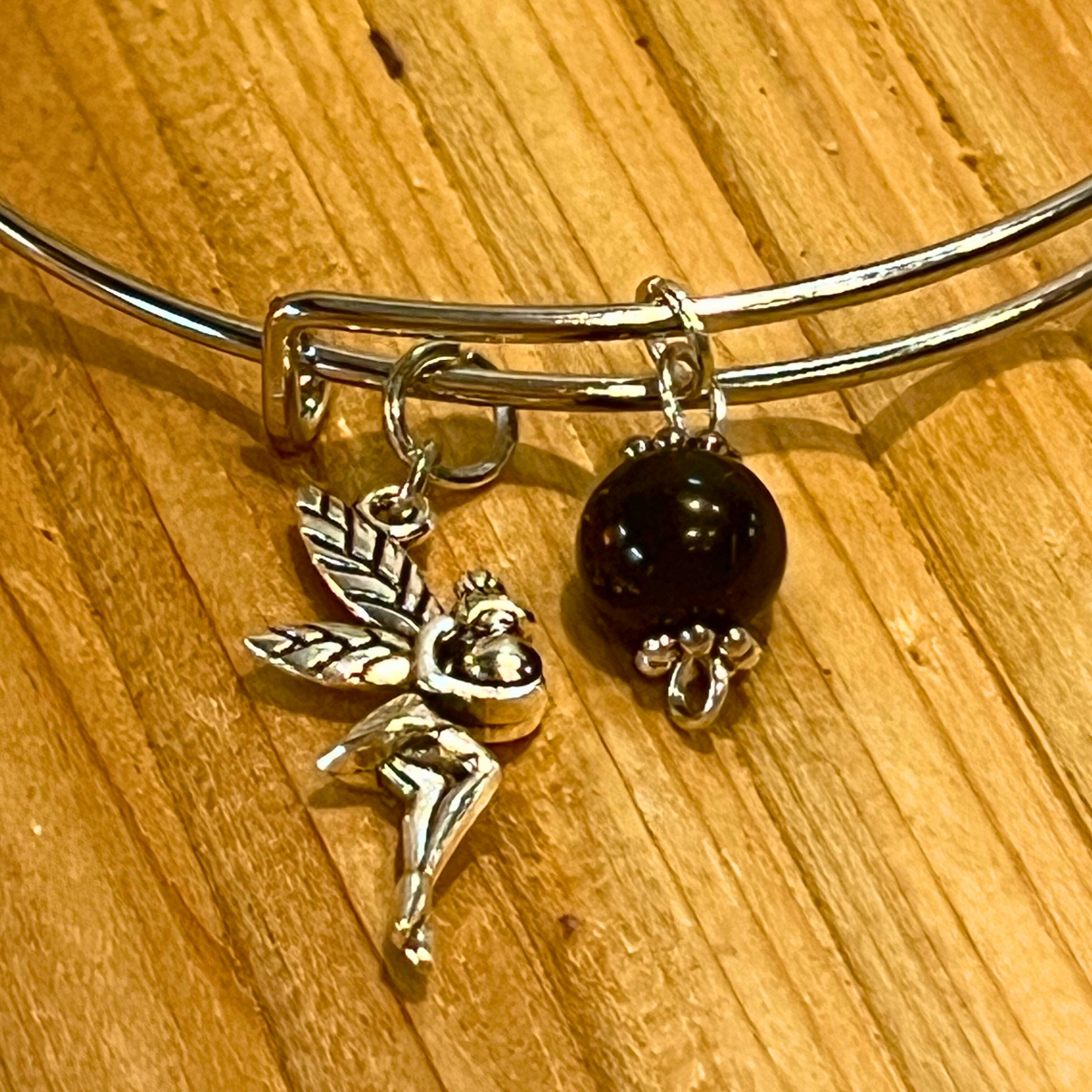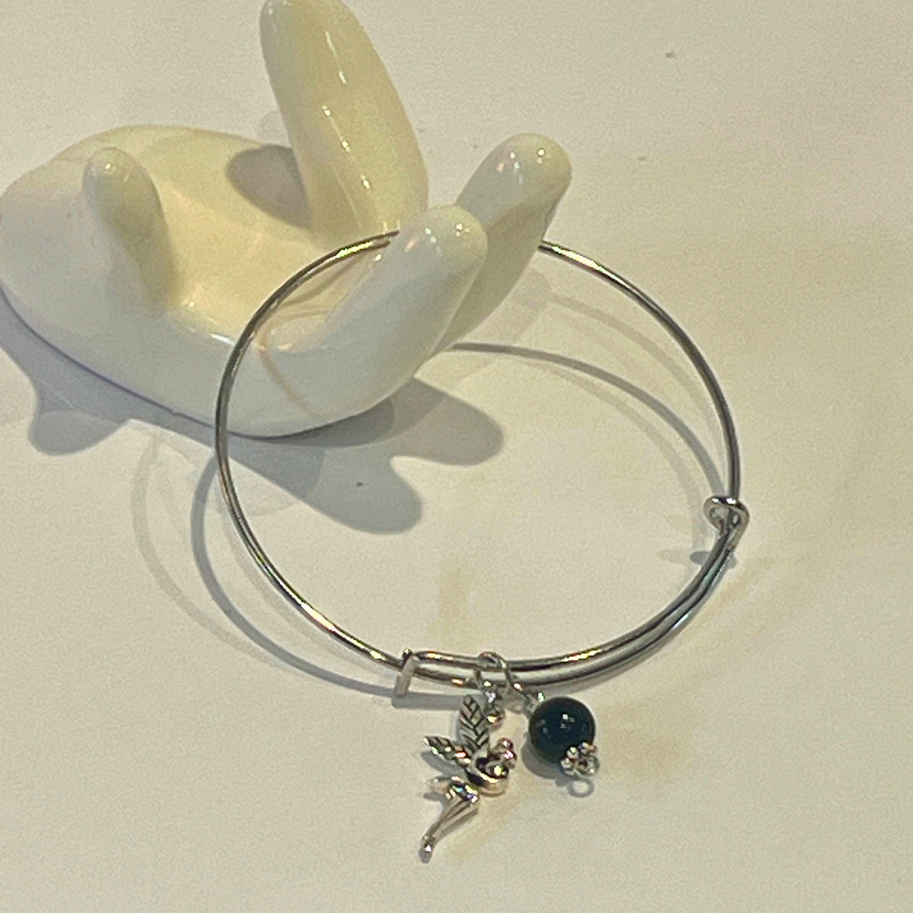 Where light meets magic. The Fairy Sitting on the Moon Bracelet brings a touch of enchantment to everyday life. A silver bangle with a black glass bead and detailed charm perfect for the woman who still believes in wonder. Comfortable, stackable, and easy to wear a meaningful token of beauty, light, and imagination.