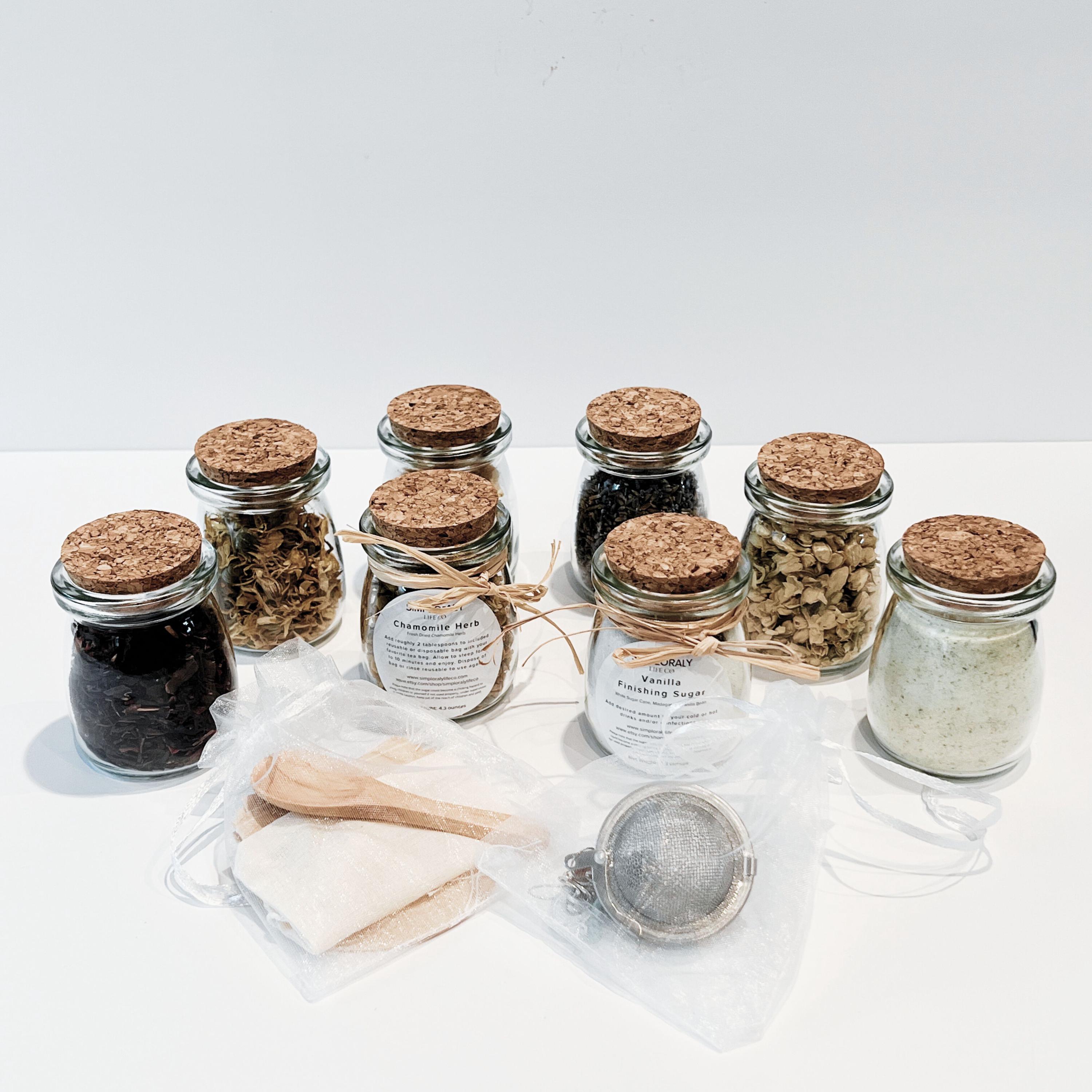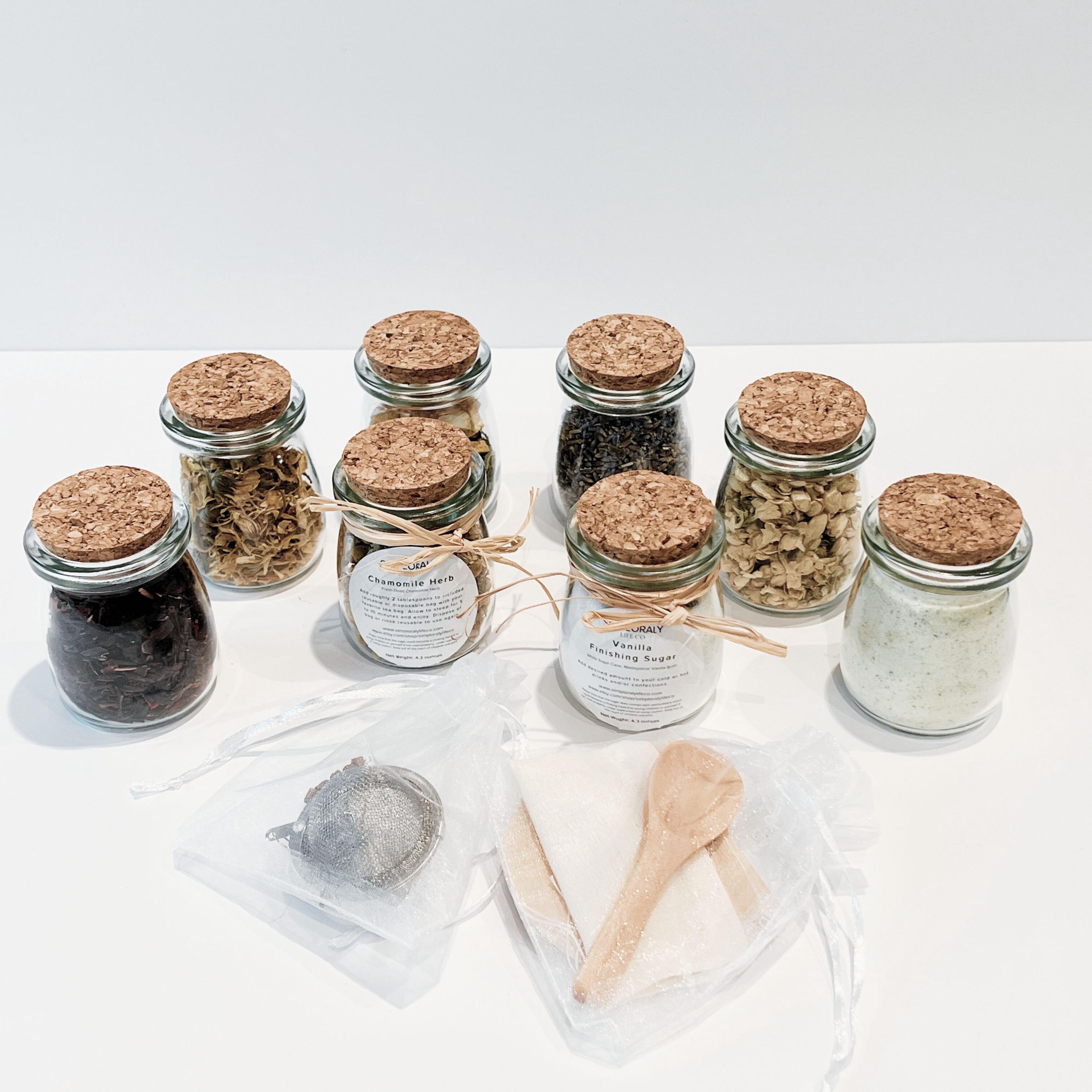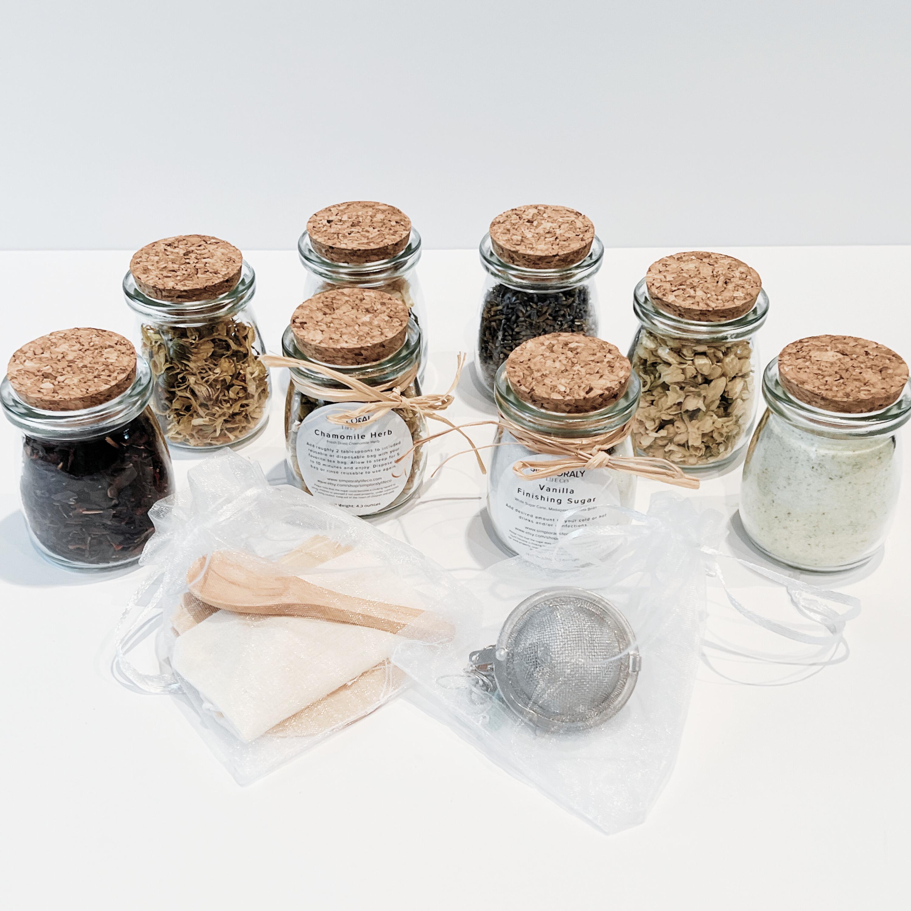 • (8) glass jars with cork lids: Hibiscus, Lavender, Jasmine, Chamomile, Calendula, Mint + dried lemon, • • • Mint finishing sugar, Vanilla bean finishing sugar (Madagascar vanilla pod + bean flecks)
