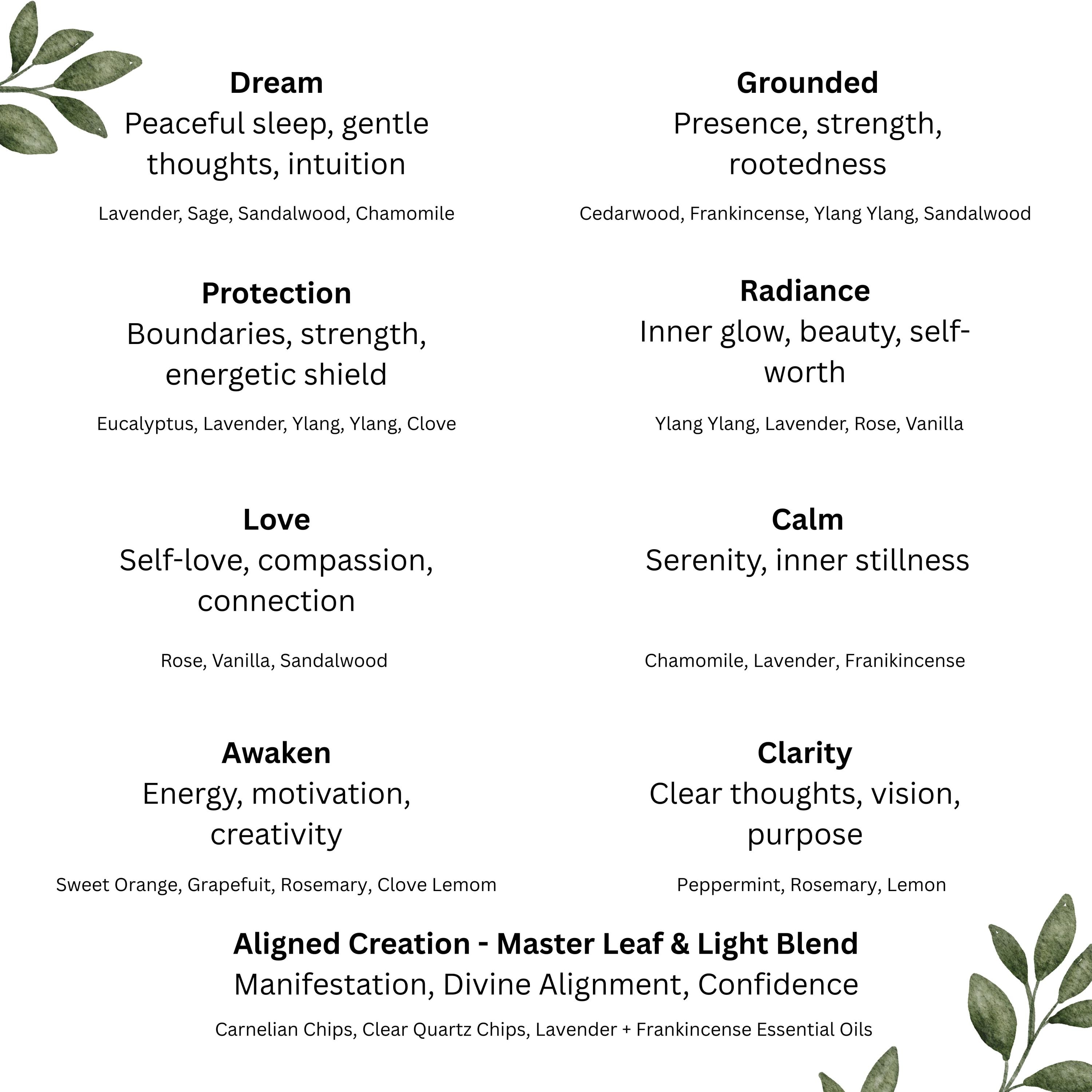 Made with jojoba + sweet almond oil base and therapeutic grade essential oils. Hand grown and dried Leaf of Life plant leaves from my own garden.