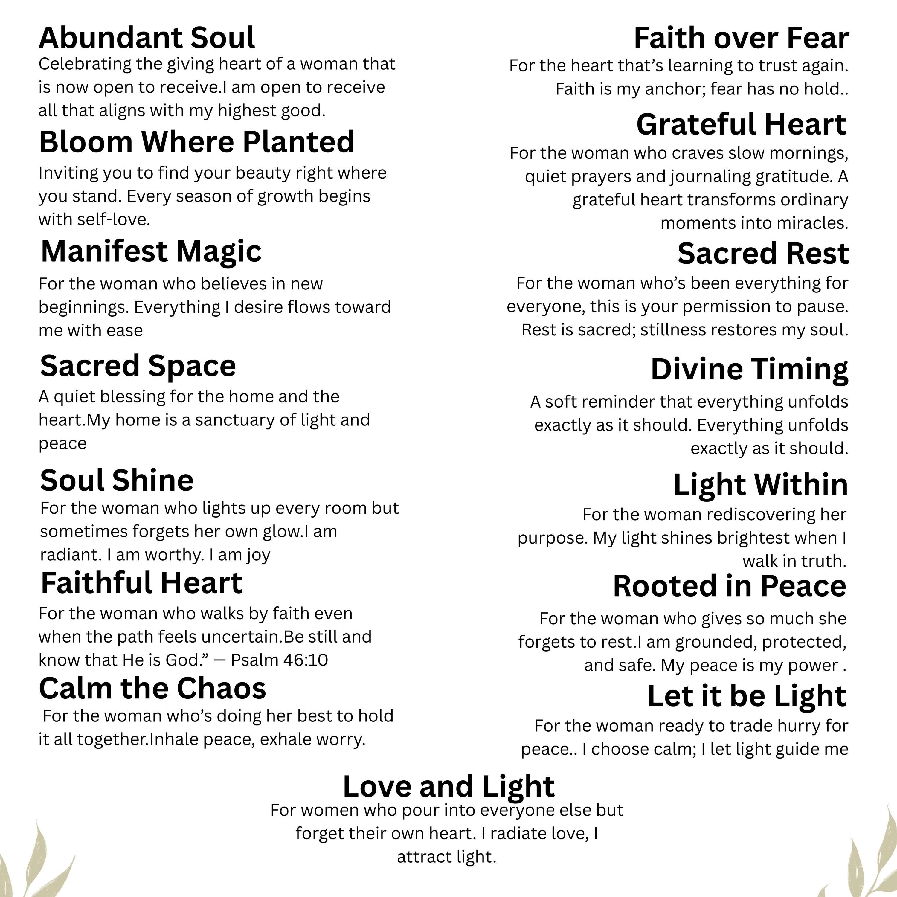 • choose (1) gift hang tag for the box (Abundant Soul, Faith Over Fear, Manifest Magic, Sacred Rest, Sacred Space, Rooted in Peace, Soul Shine, Light Within, Faithful Heart, Let It Be Light, Calm the Chaos, Love and Light, Bloom Where Planted, Grateful Heart, Divine Timing)