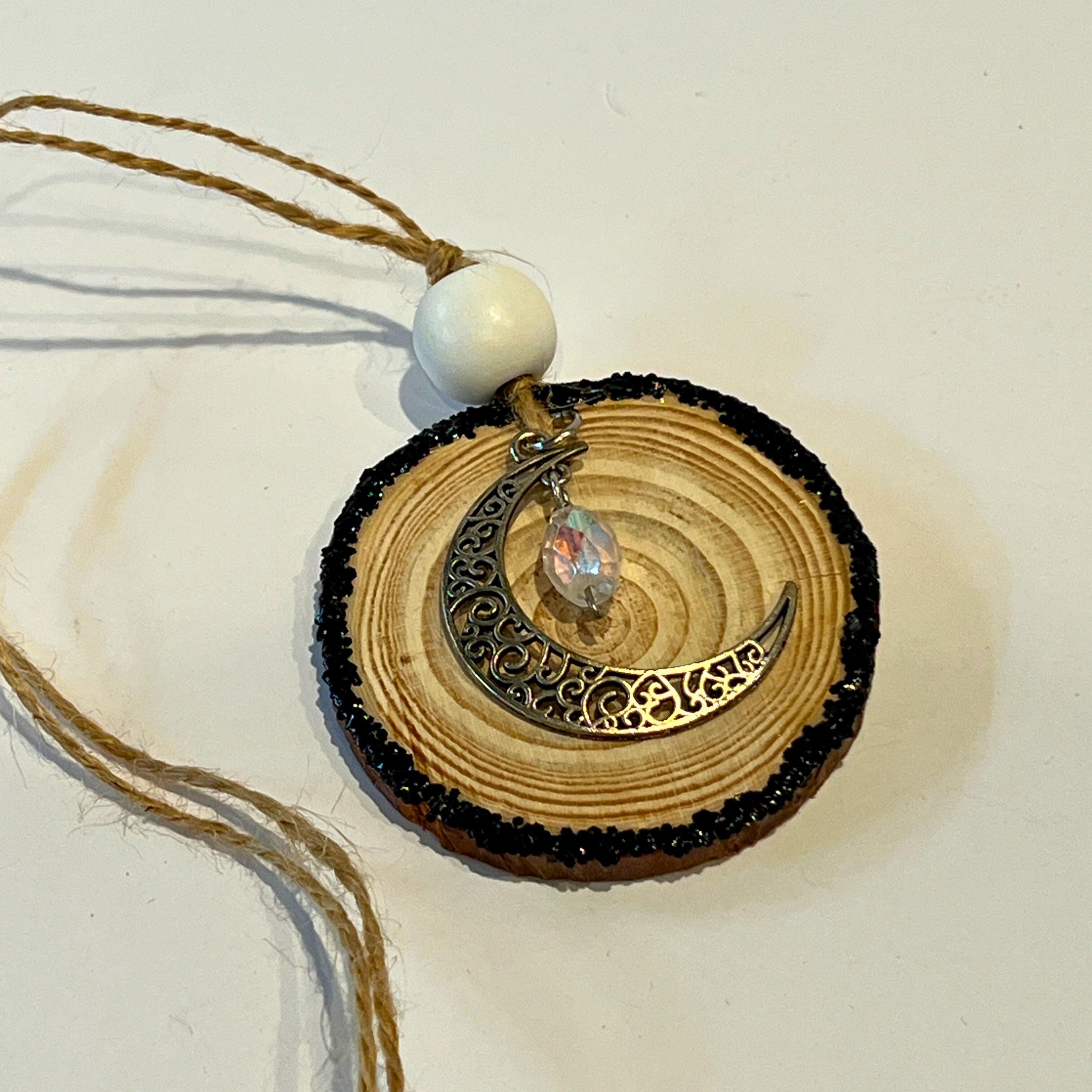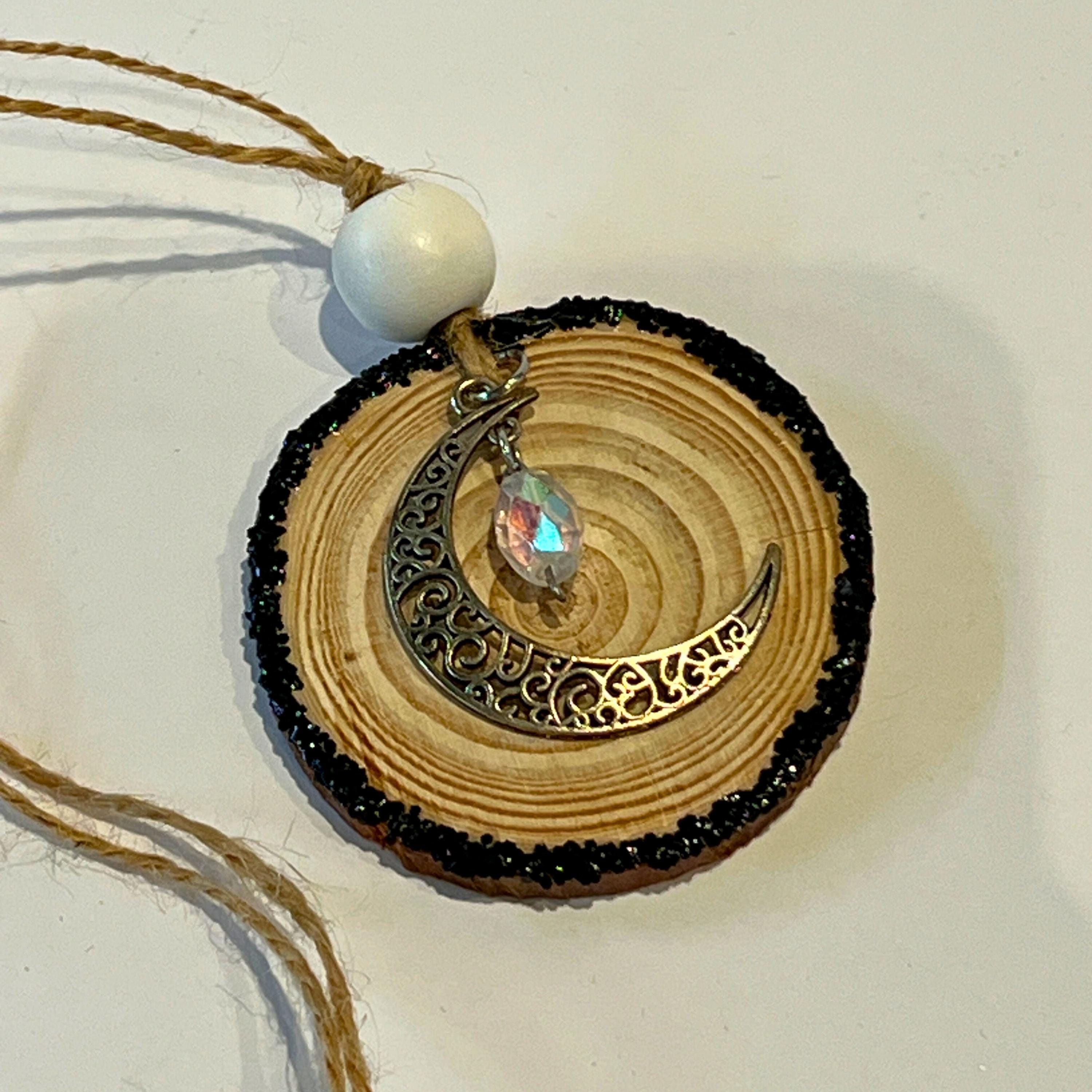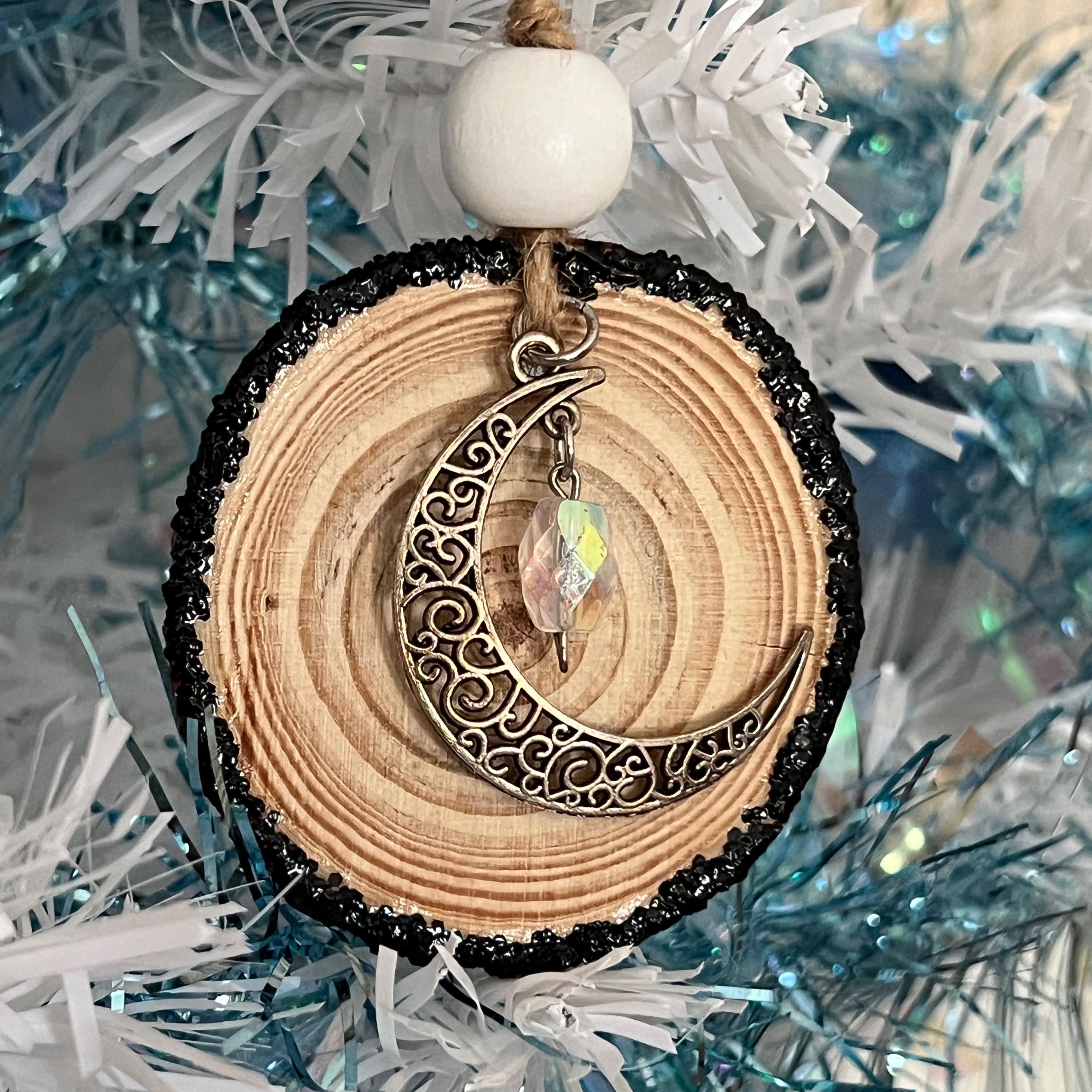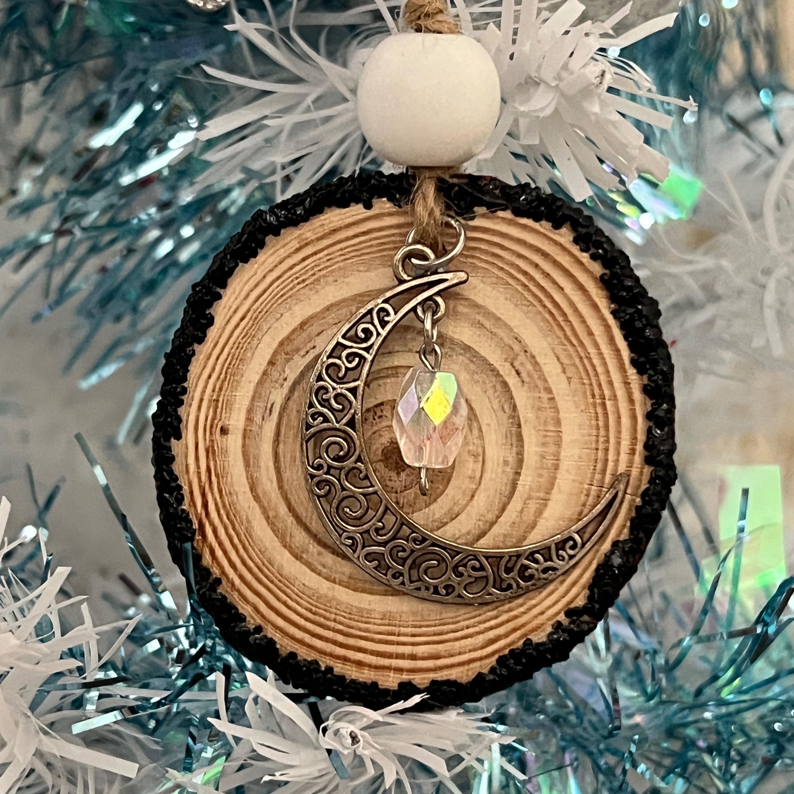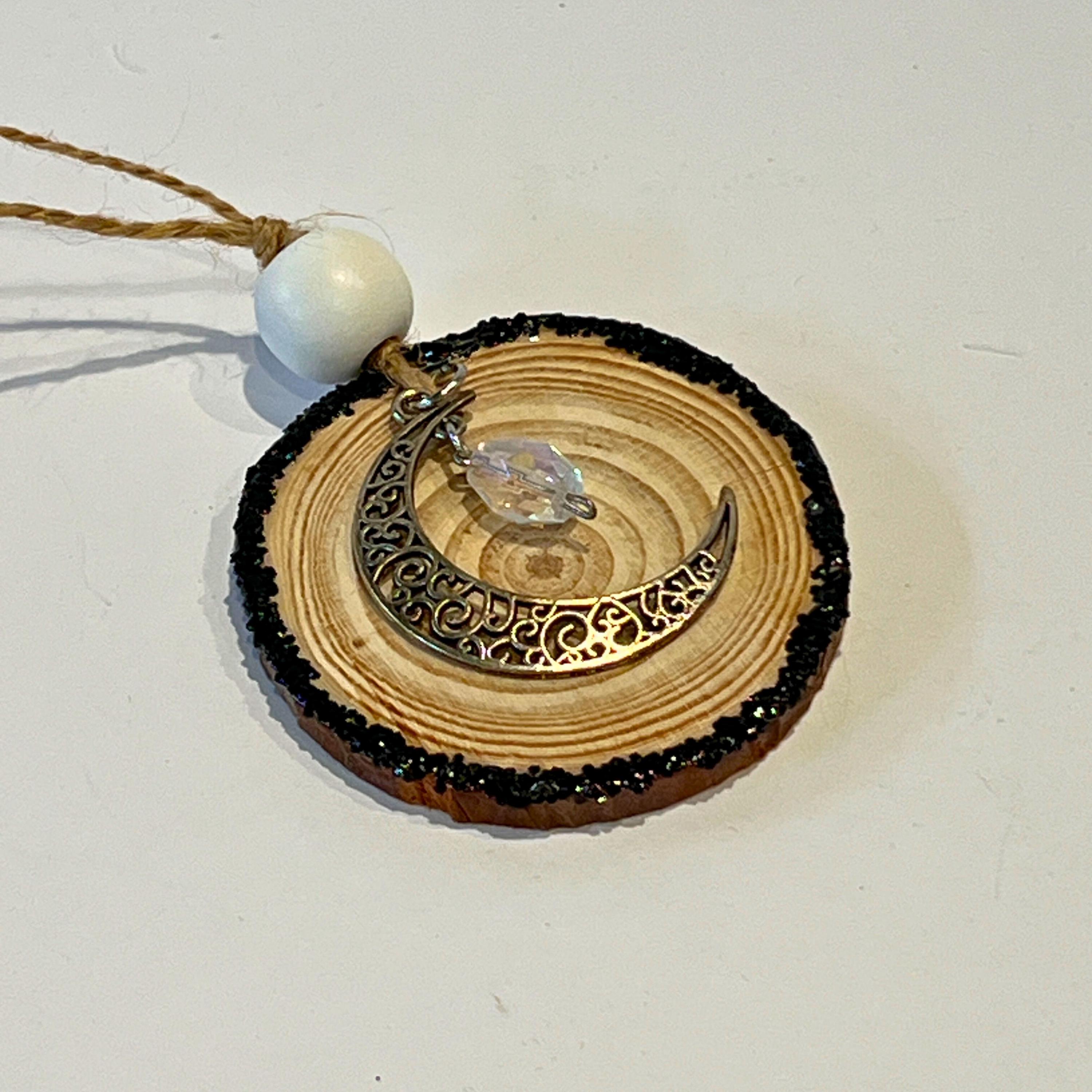 A little moonlight for your space. This Crescent Moon Ornament combines rustic nature and celestial charm. Made on a natural wood slice with black glitter around the edge (sealed glitter for no mess), featuring a silver crescent moon charm and hanging glass bead.