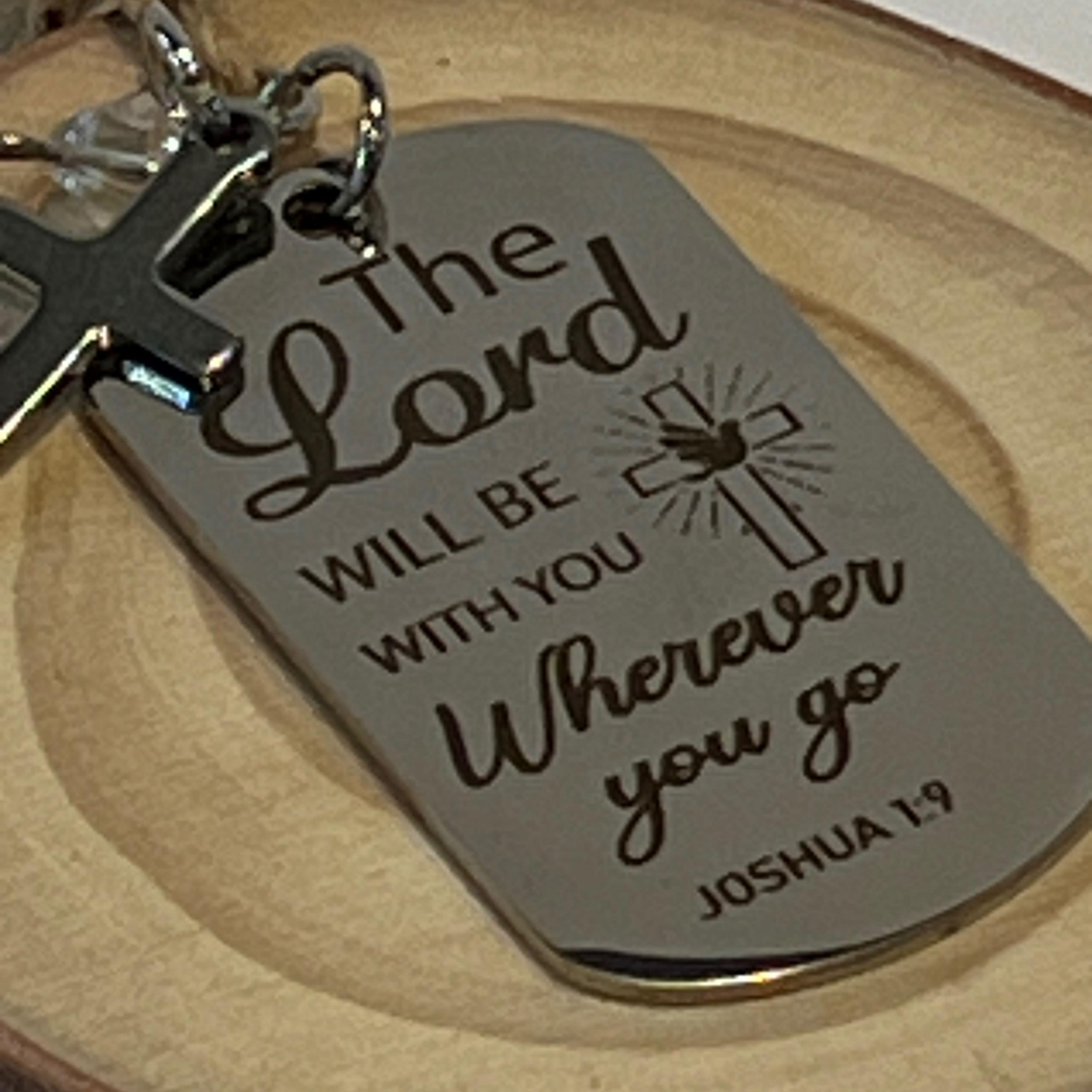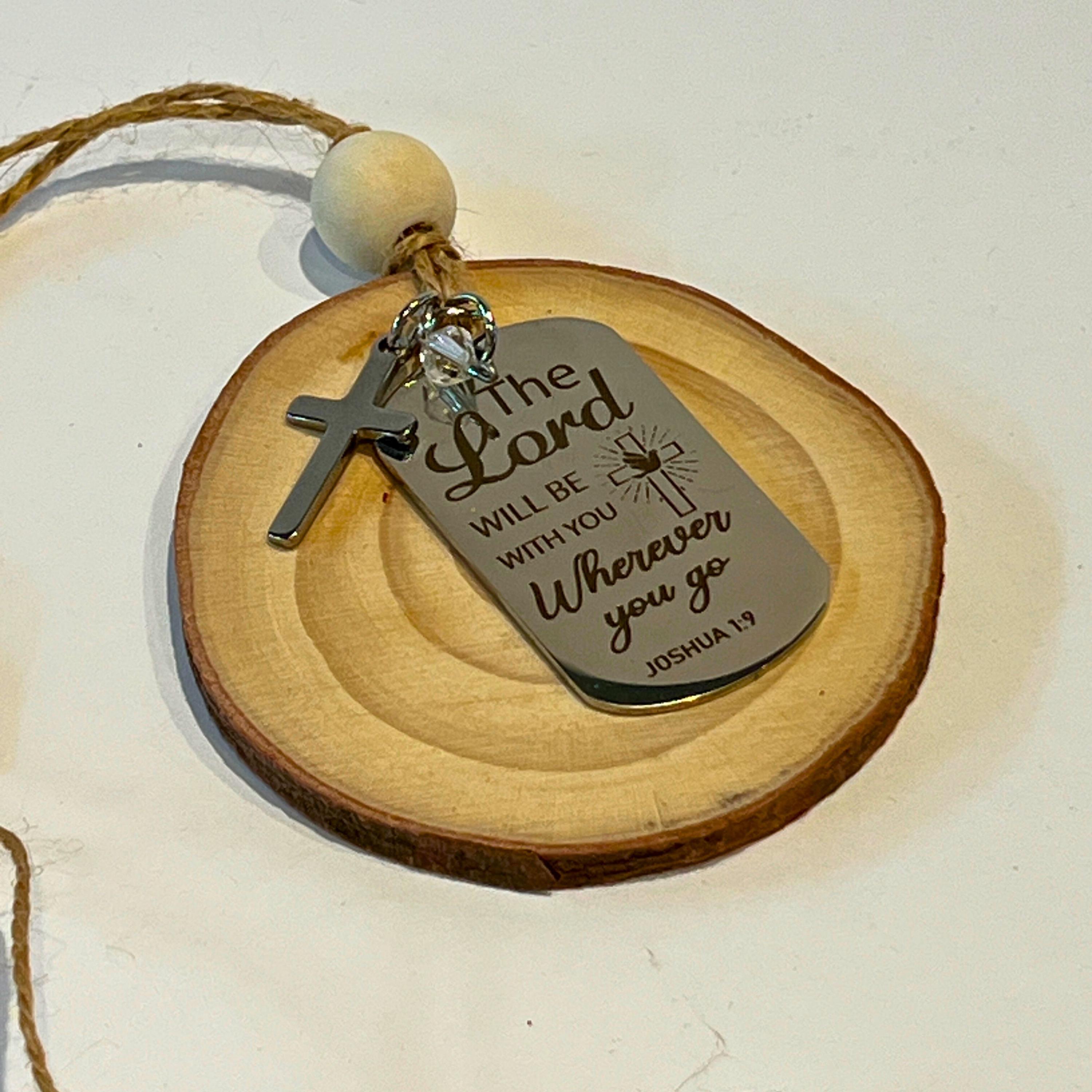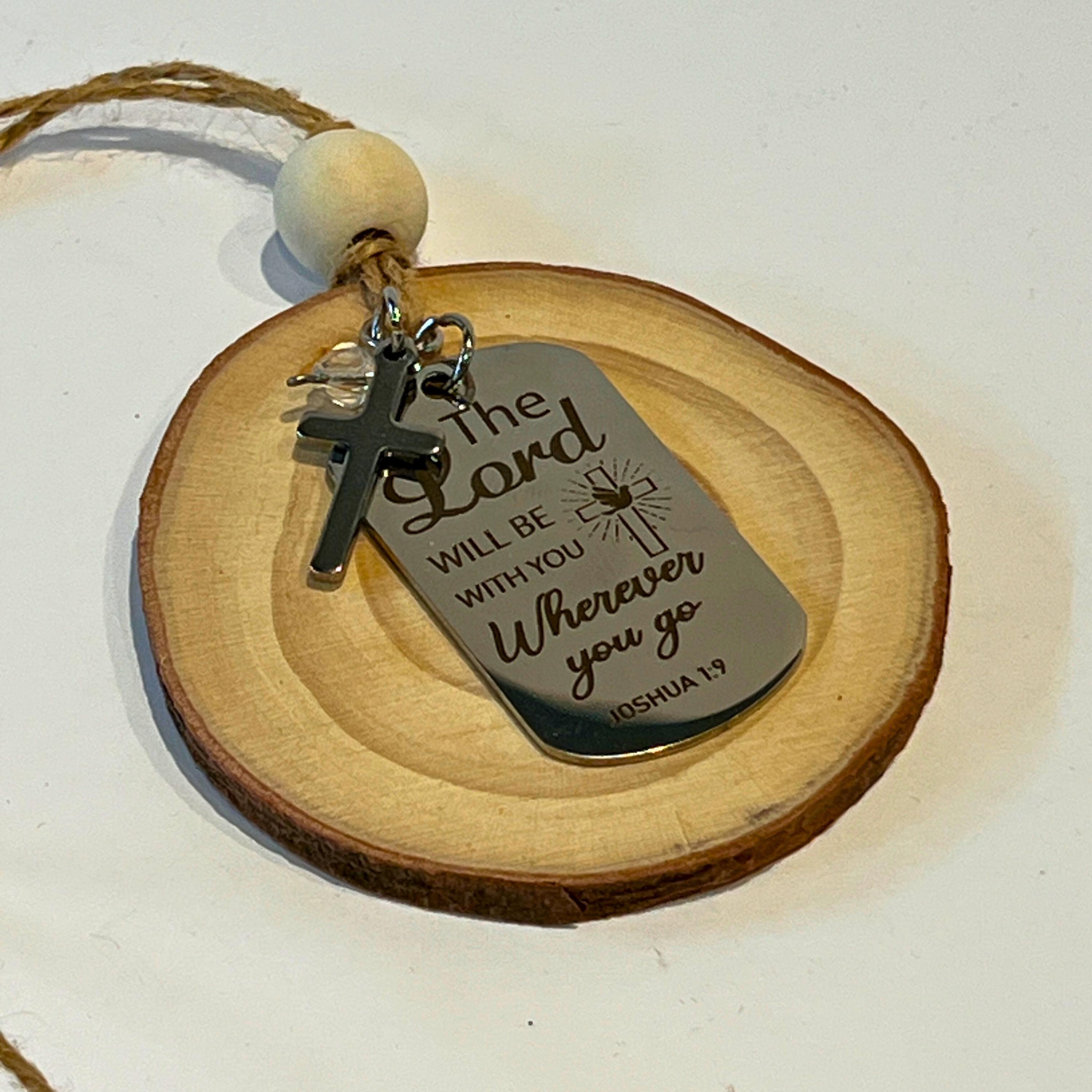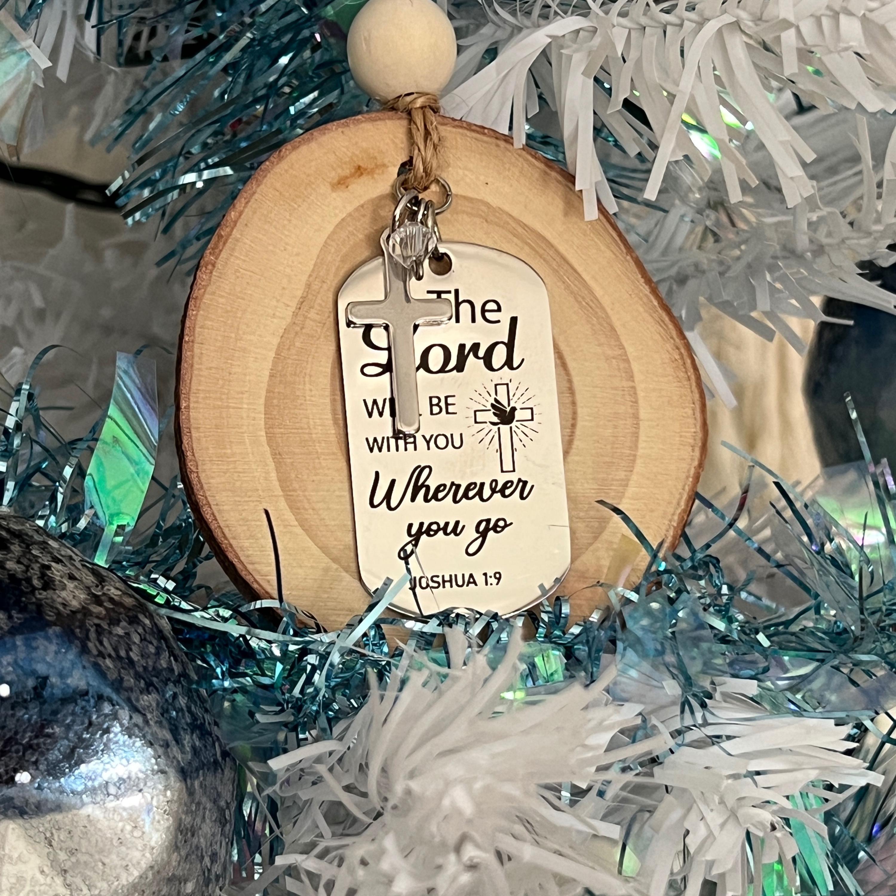 A keepsake of courage and comfort. This Joshua 1:9 Ornament features a handcrafted wood slice with natural bark edges and twine for hanging. The metal charm reads “The Lord will be with you wherever you go” and is paired with a clear glass bead and silver cross.