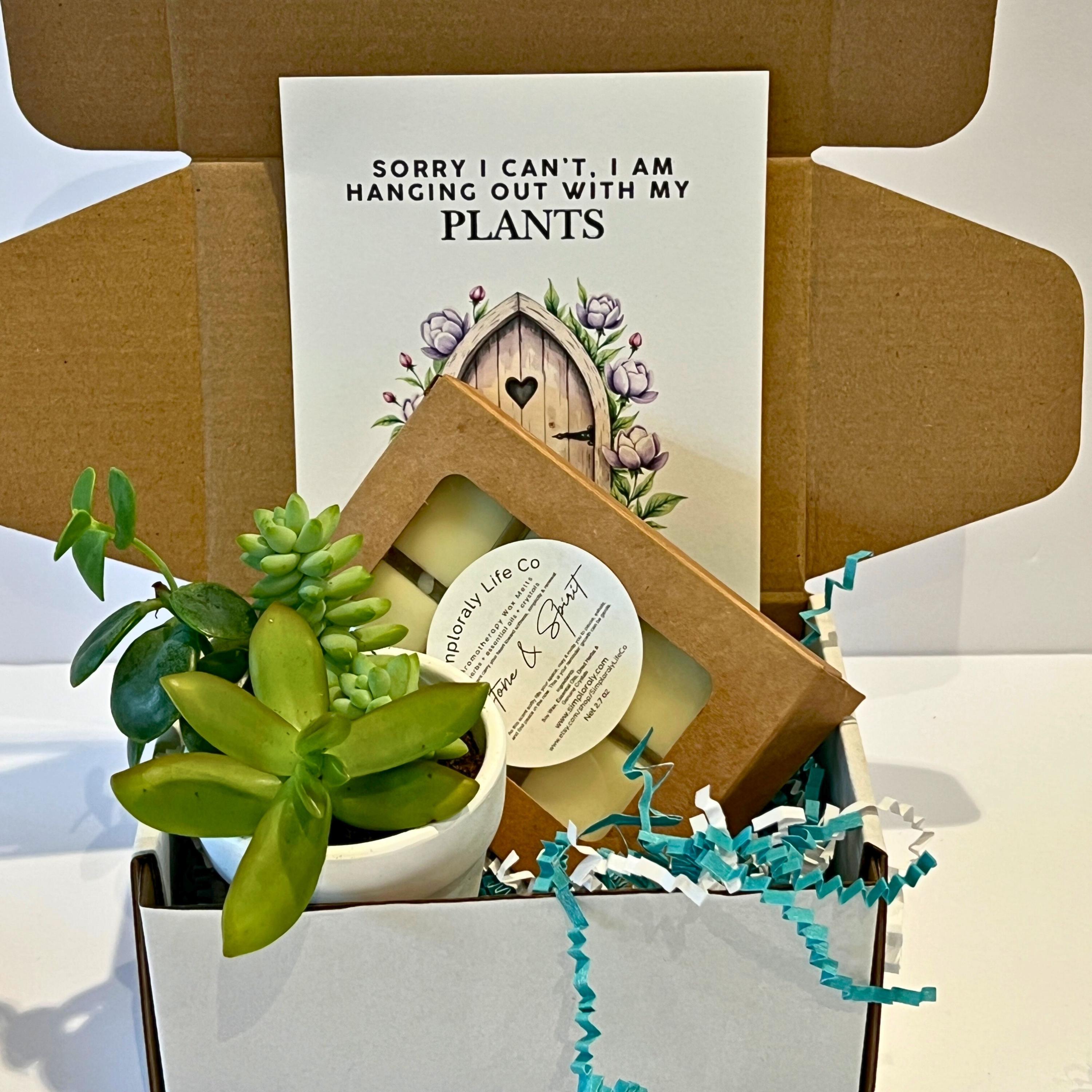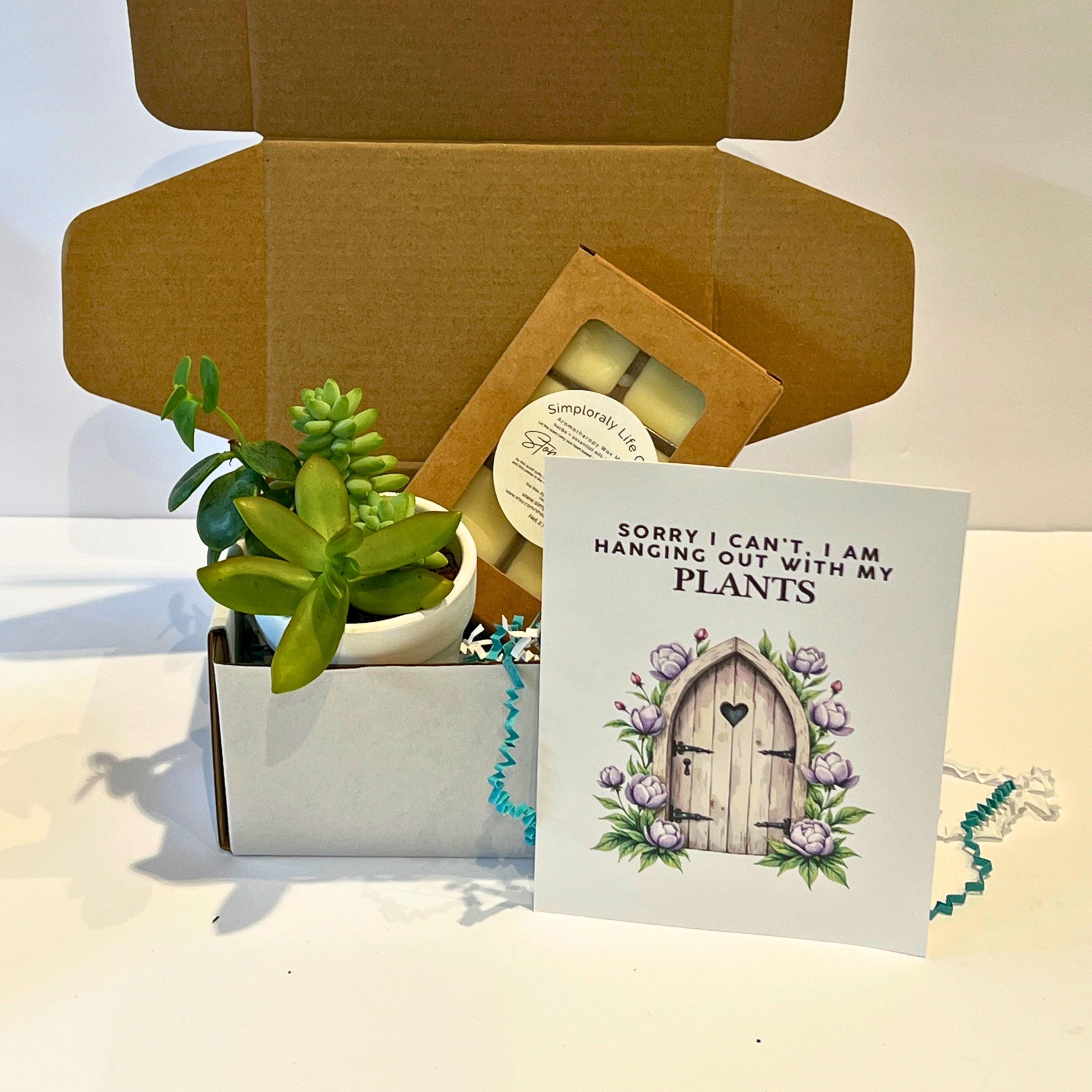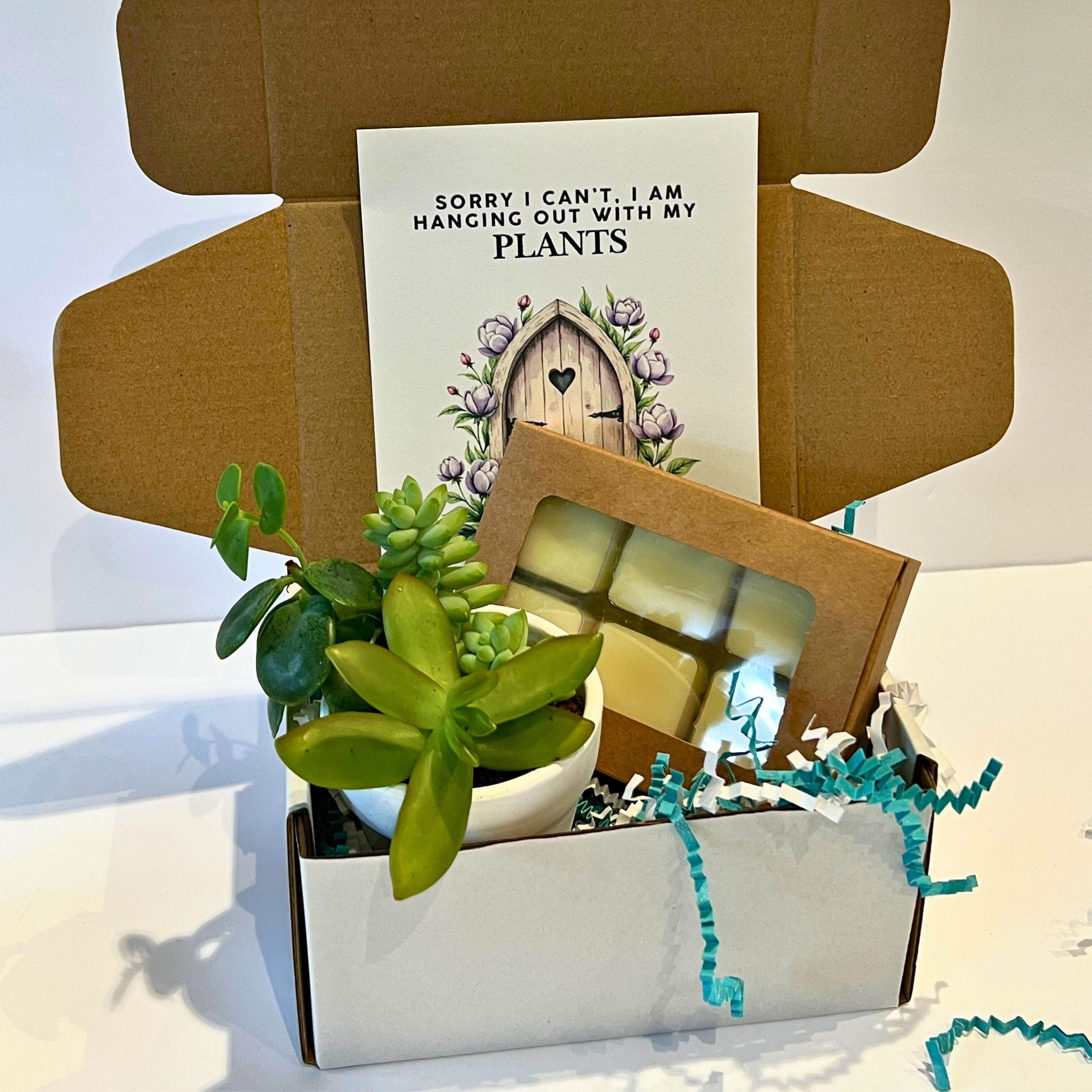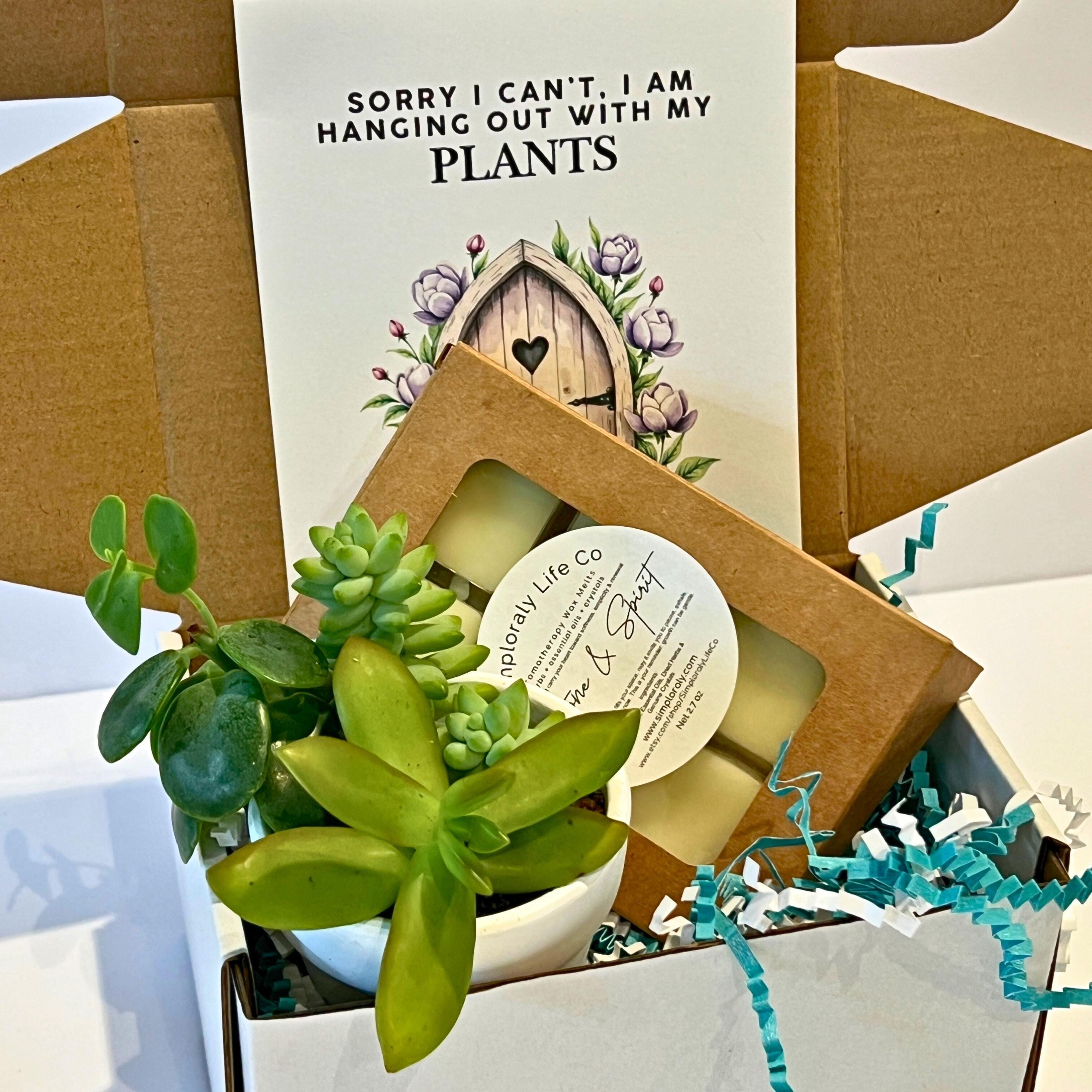 Inside she’ll find a cute succulent arrangement (3–4 little green besties), a 3" white planter, and a pack of calming soy wax melts perfect for creating a peaceful zone where no one talks, interrupts, or drains her energy.