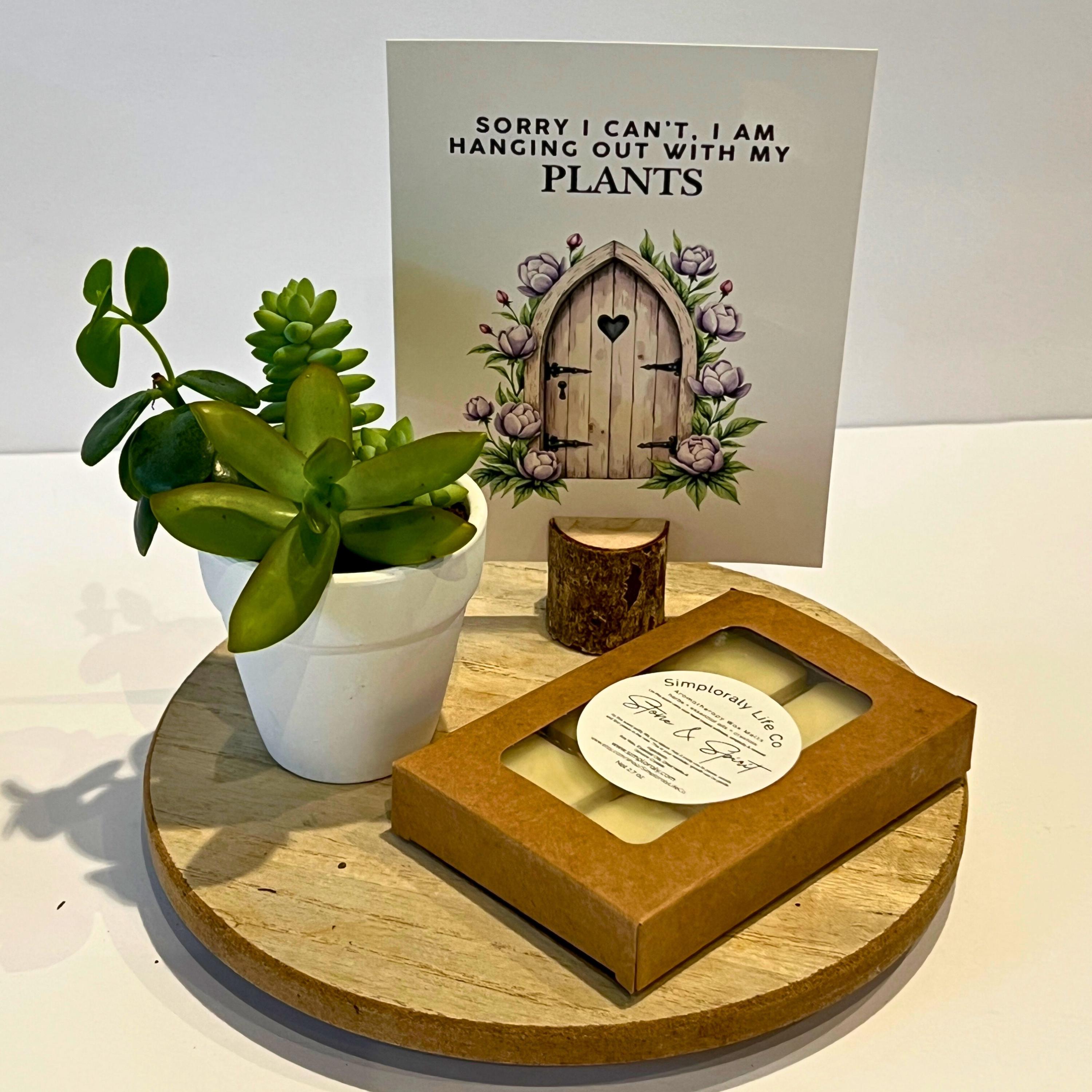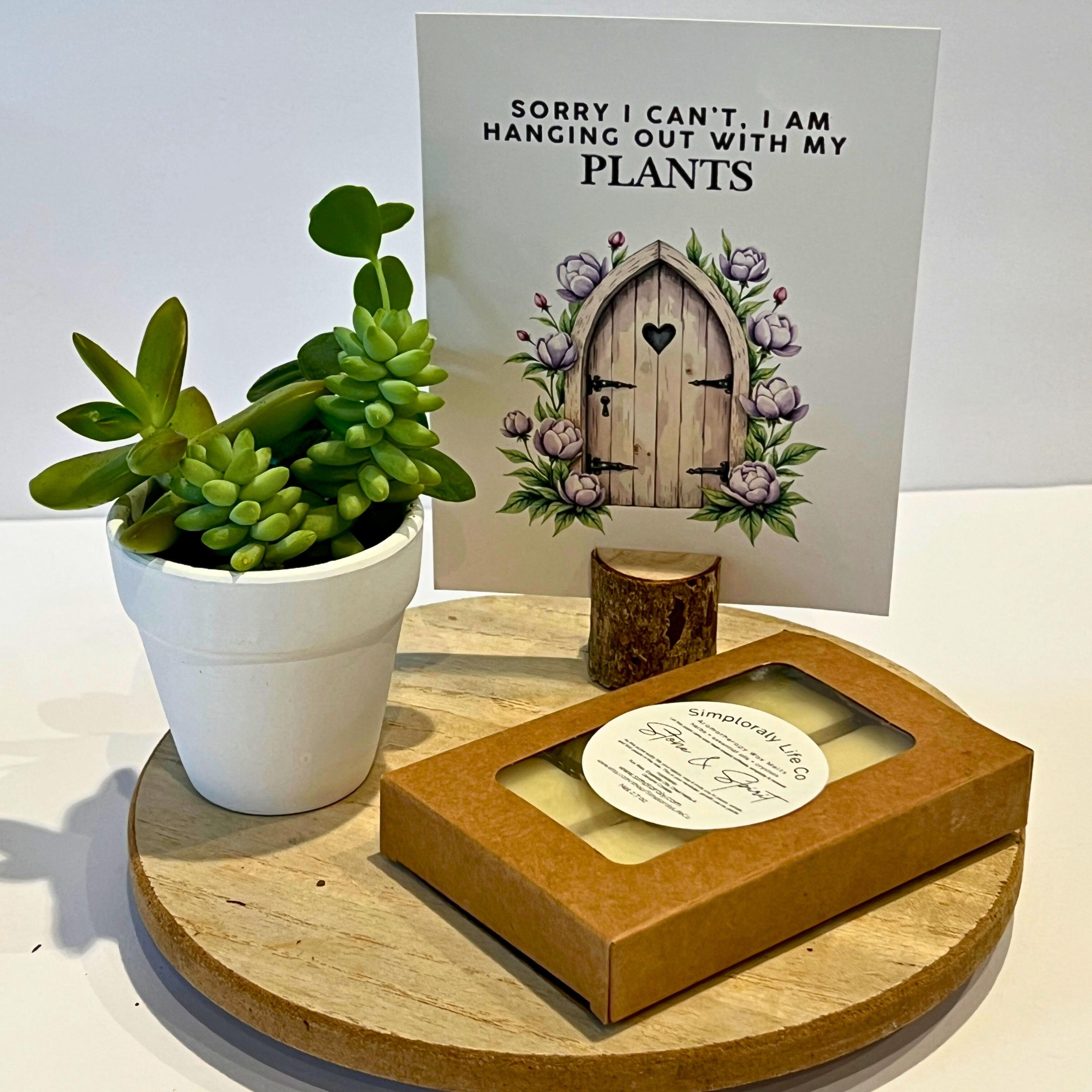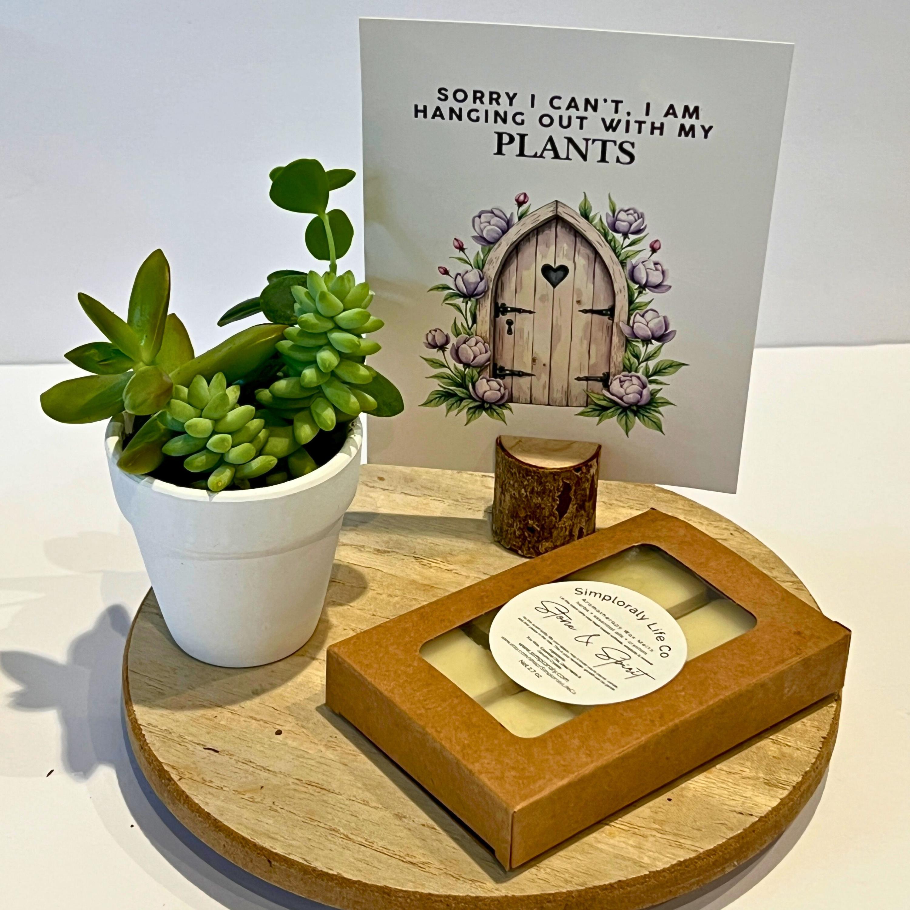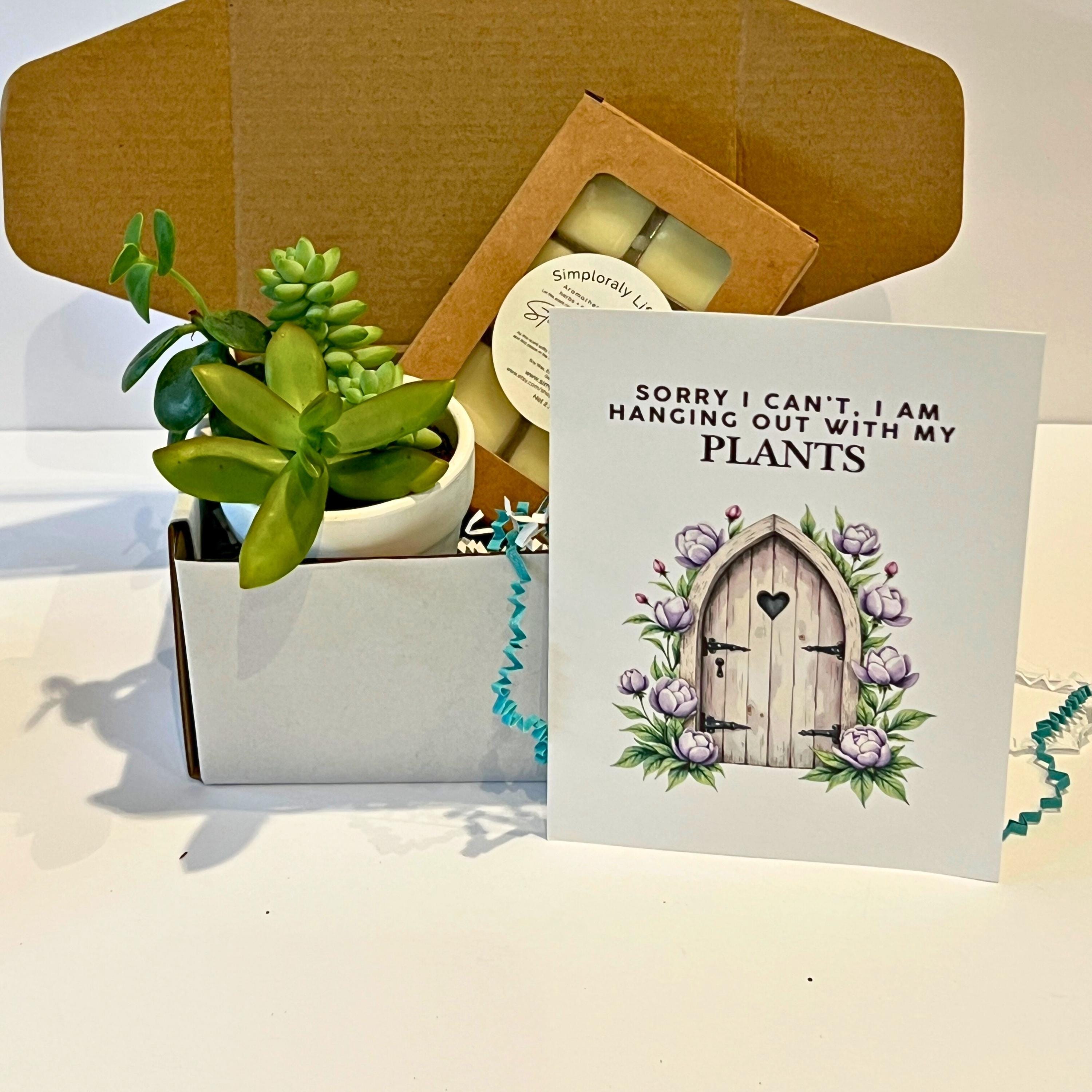 Inside she’ll find a cute succulent arrangement (3–4 little green besties), a 3" white planter, and a pack of calming soy wax melts perfect for creating a peaceful zone where no one talks, interrupts, or drains her energy.