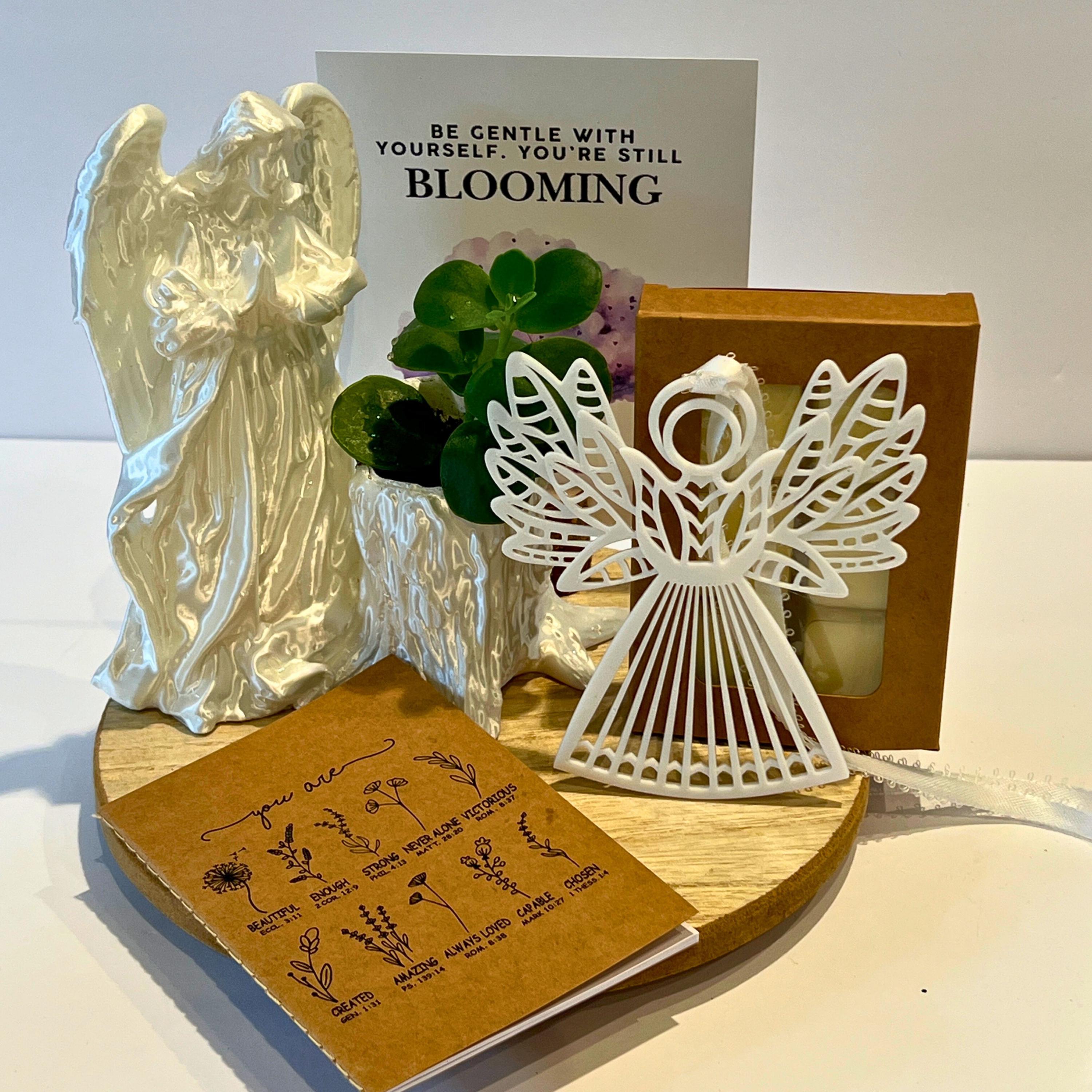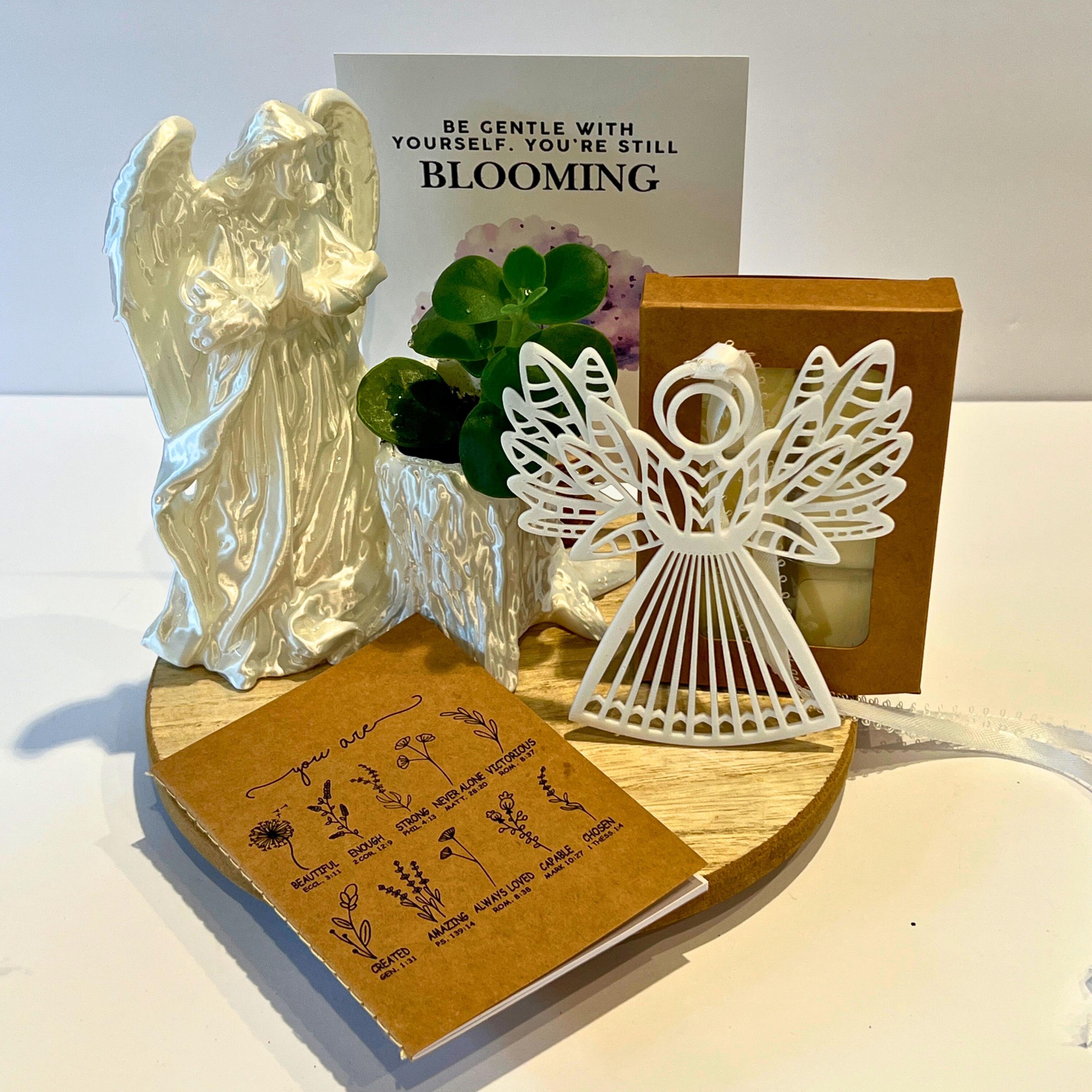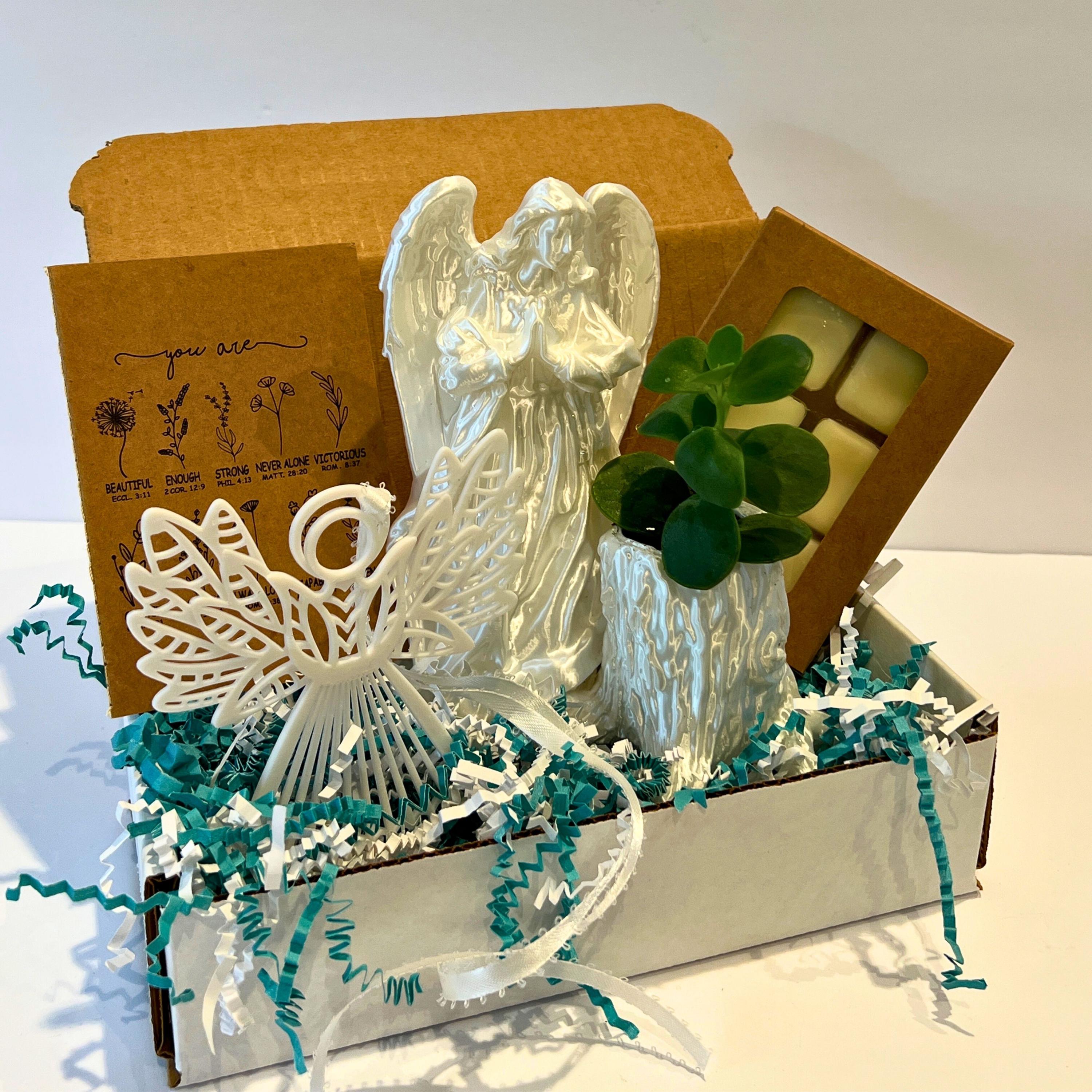 Inside is a beautiful 3D printed angel planter (approx. 6" x 6"), crafted in soft white and filled with 1–2 living succulents depending on plant size.