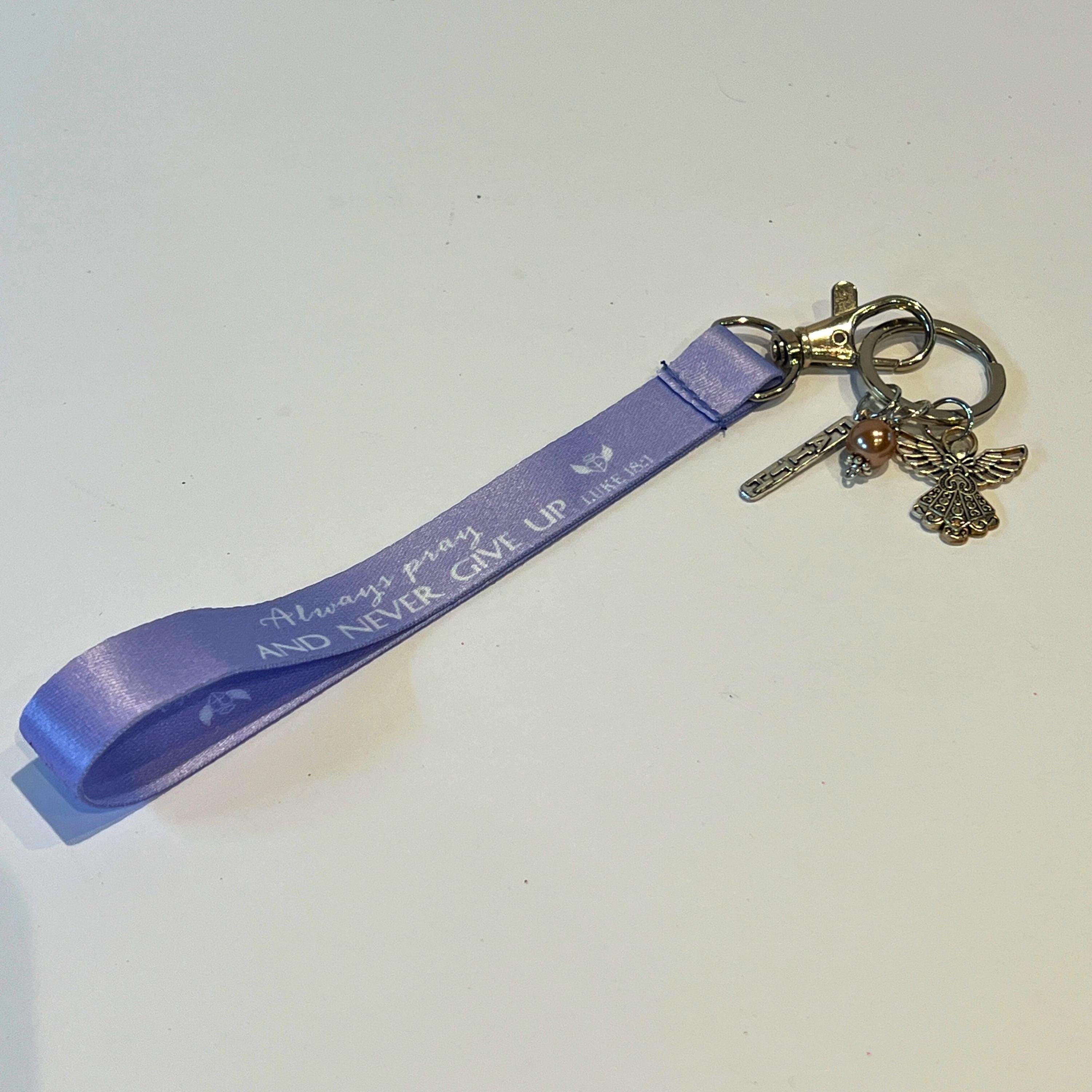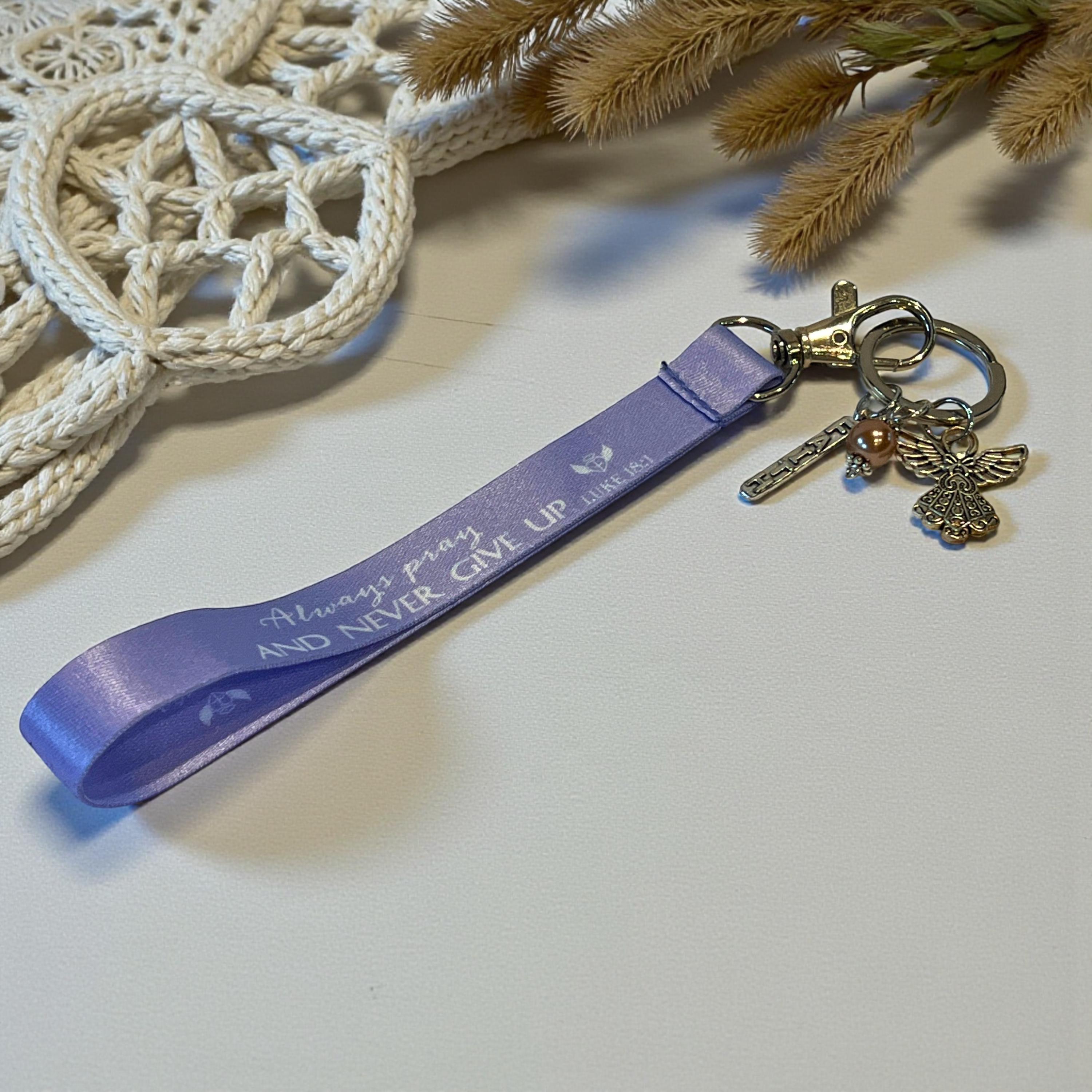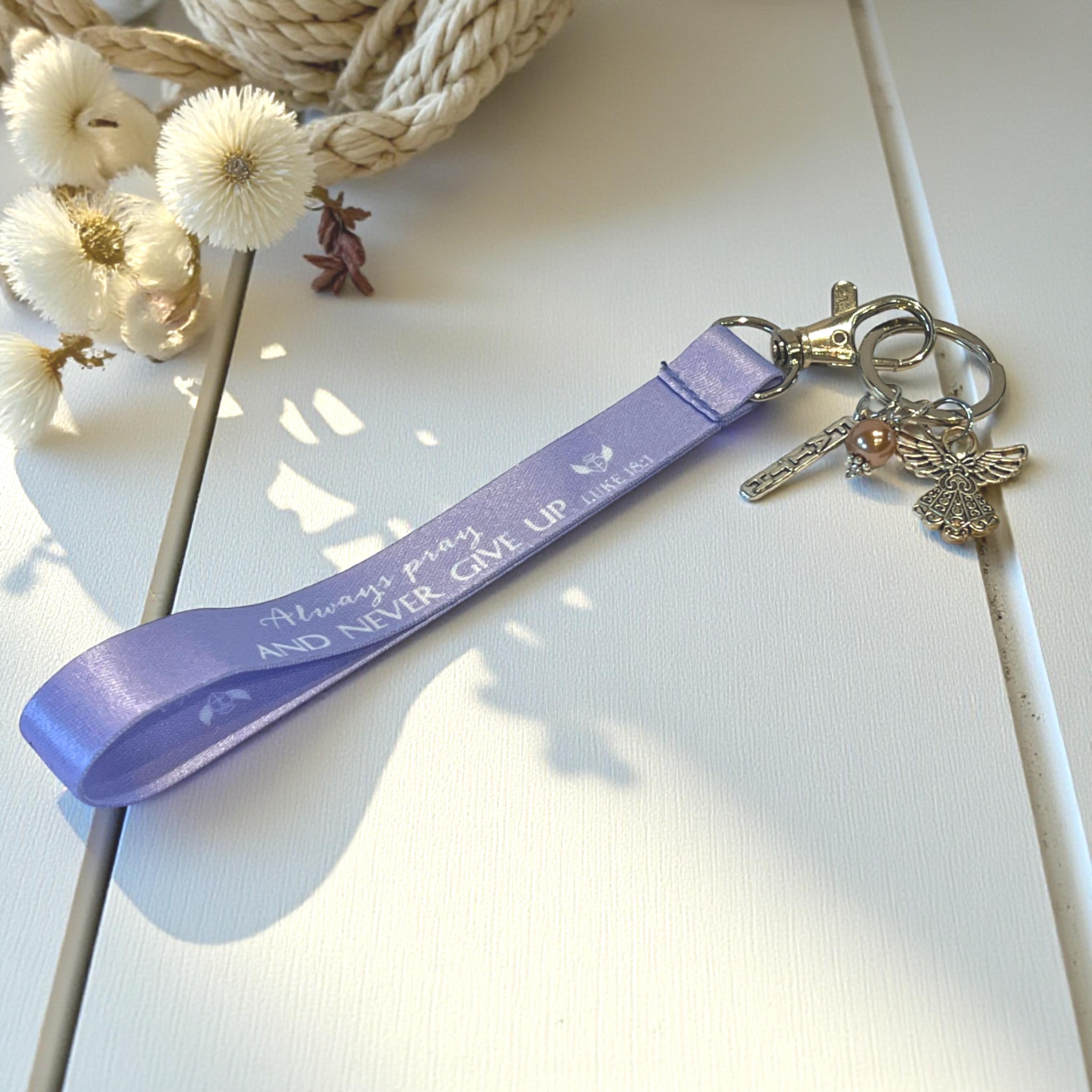 Soft, feminine, and filled with encouragement this Lilac Wristlet Keychain features a lightweight scripture wrist strap, dainty angel charm, champagne bead, and small “Faith” charm.