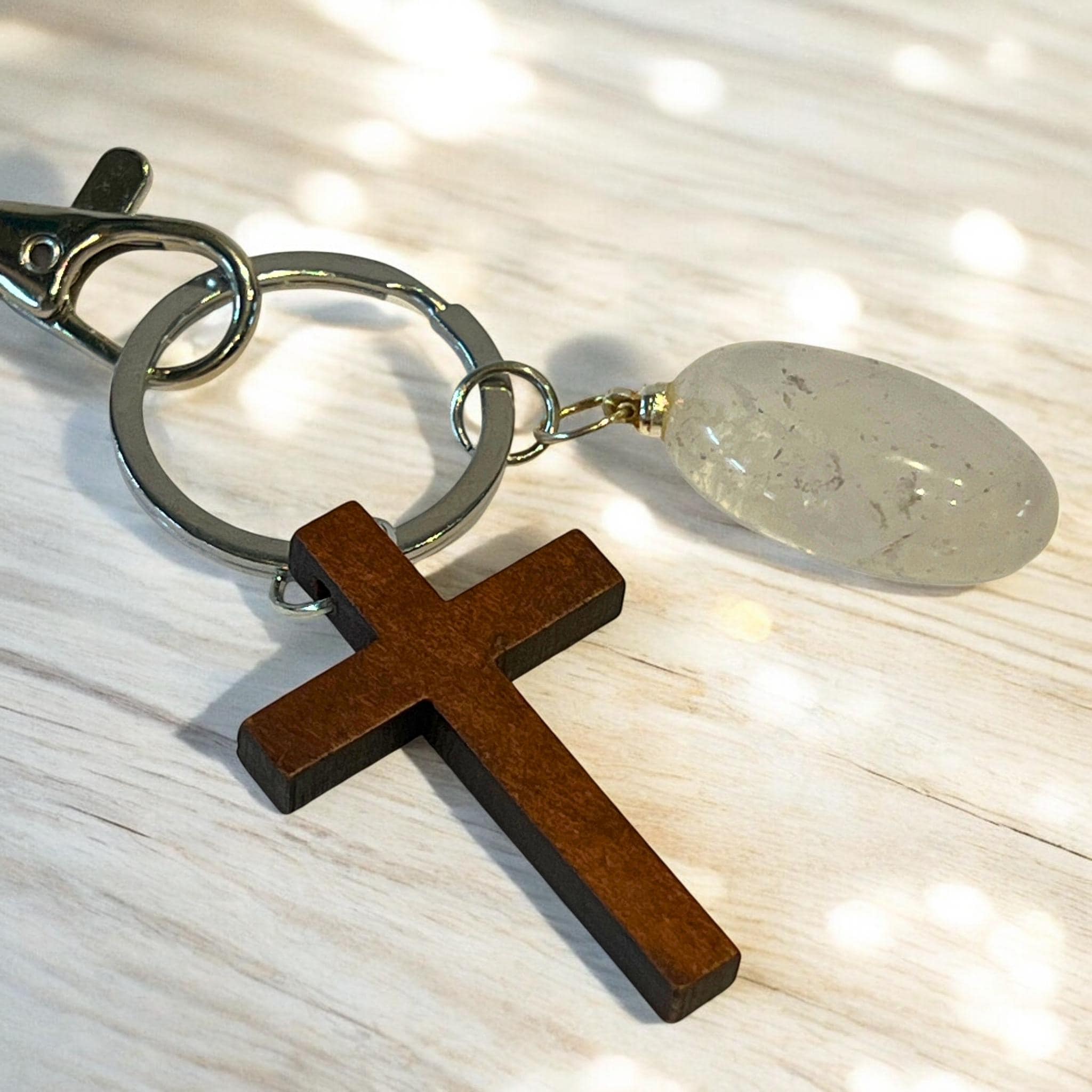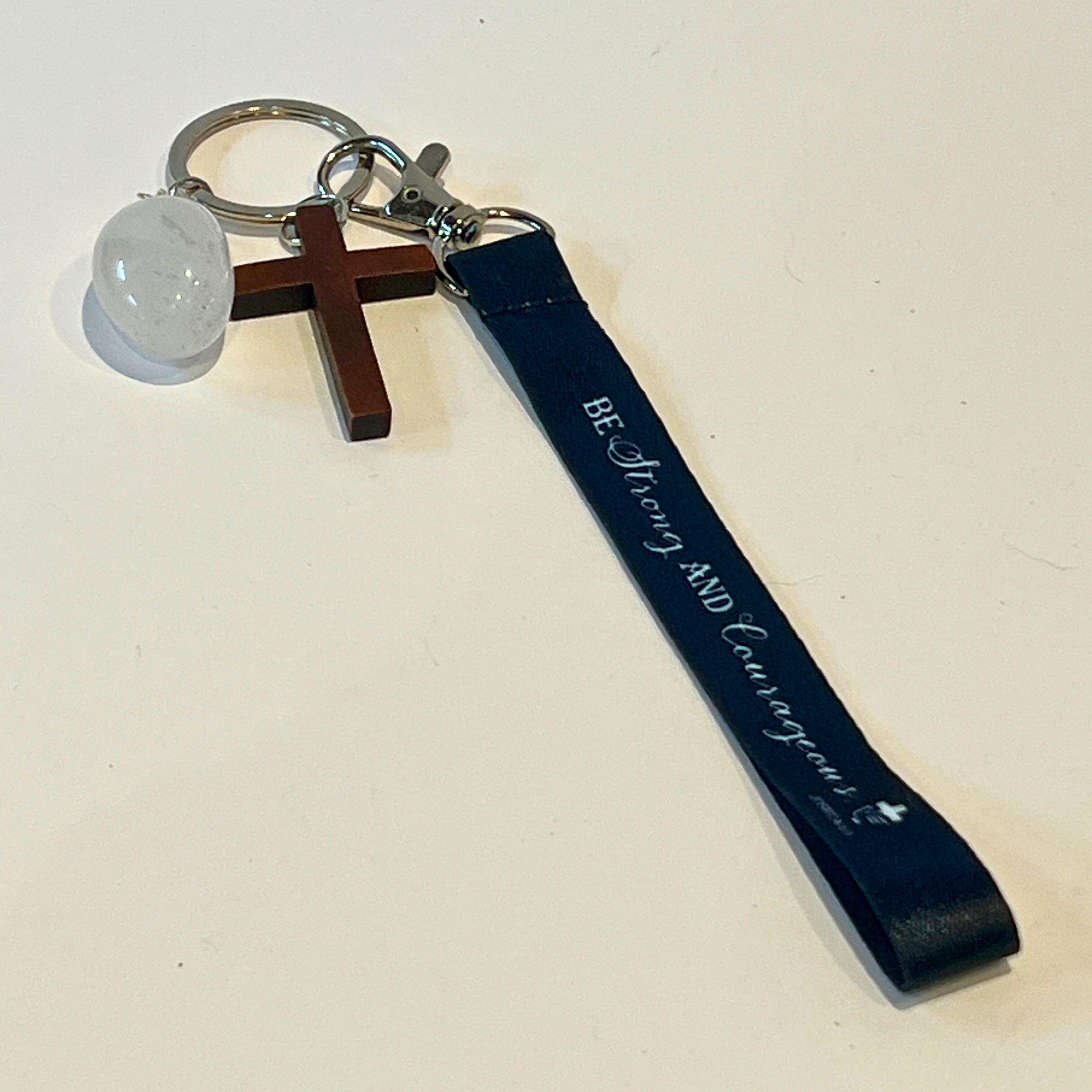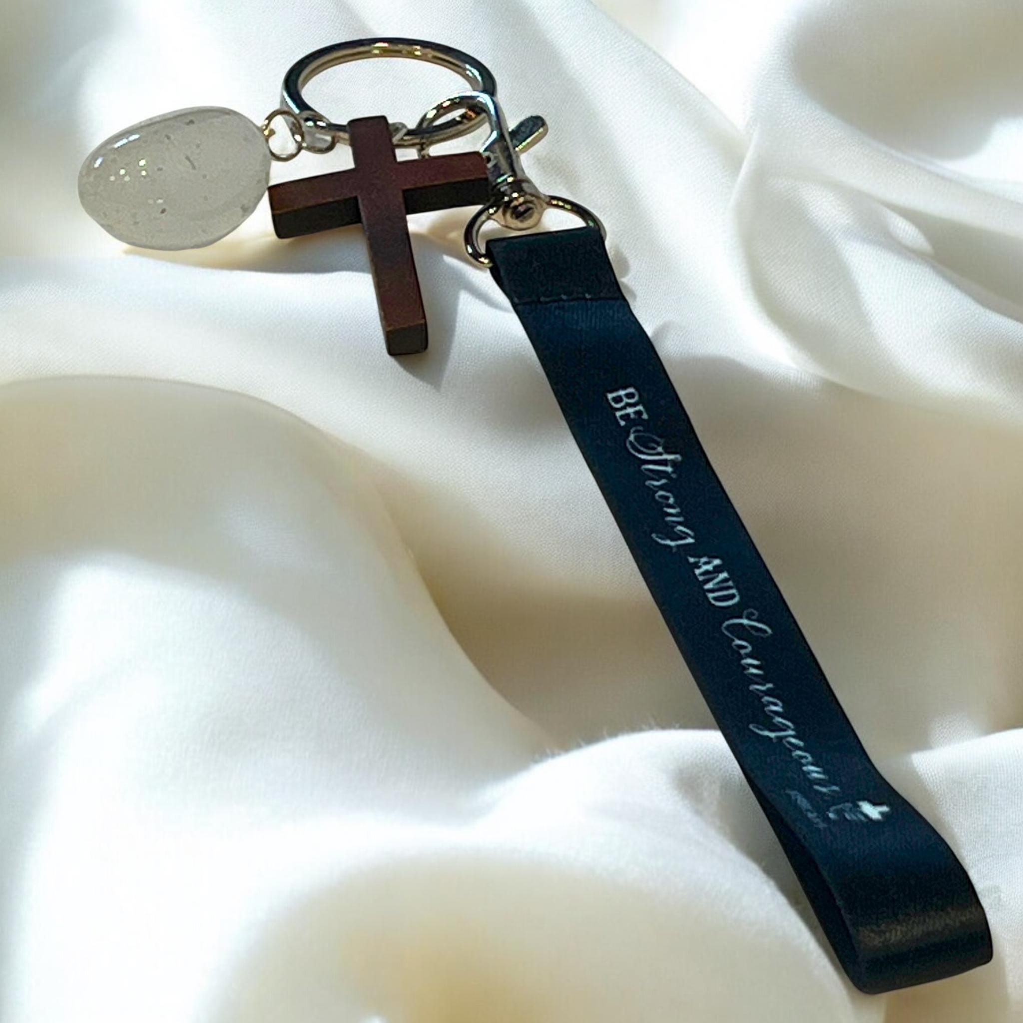 Carry a reminder of strength, faith, and protection with this meaningful Black Wood Cross Wristlet Keychain. Crafted with a scripture-printed wrist strap, natural clear quartz crystal, and a smooth wood cross, this keychain keeps encouragement close wherever you go.