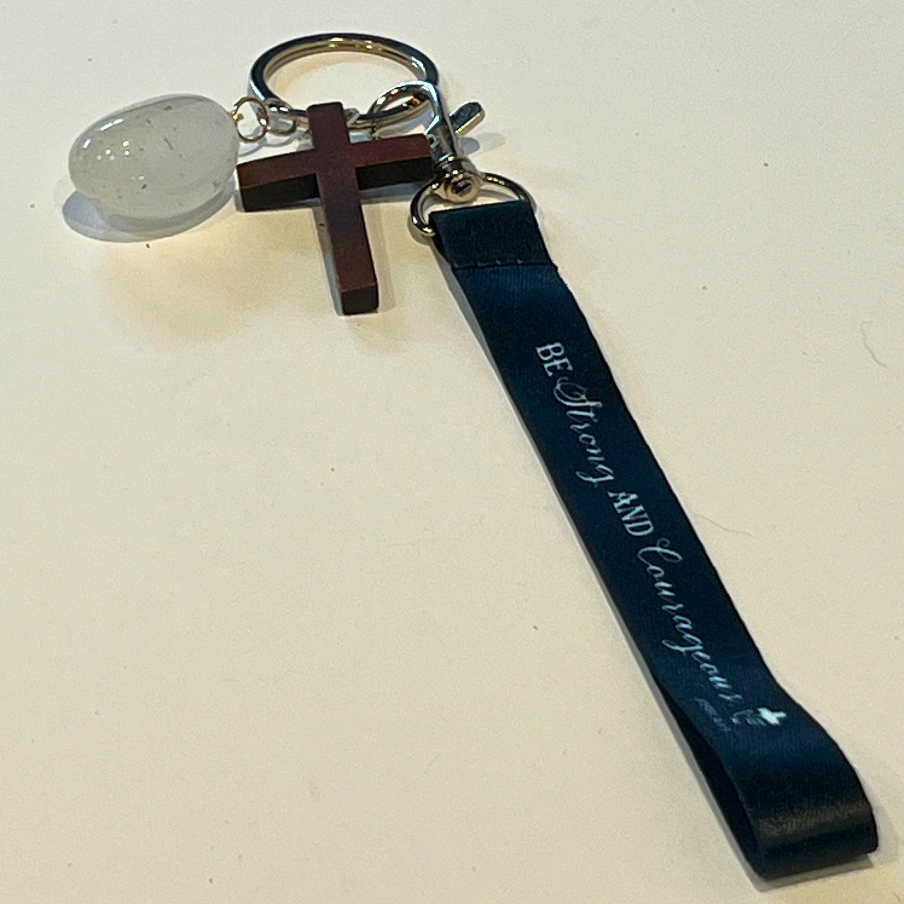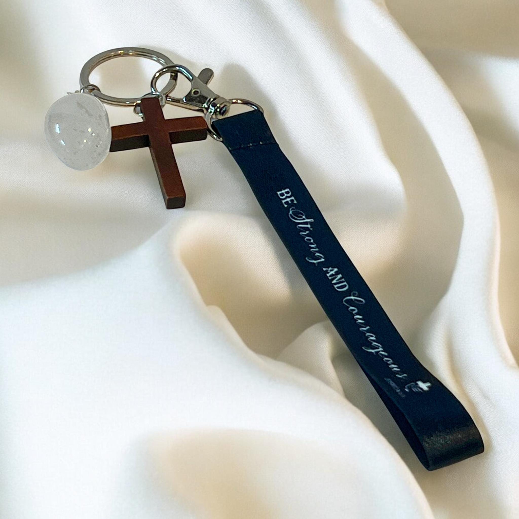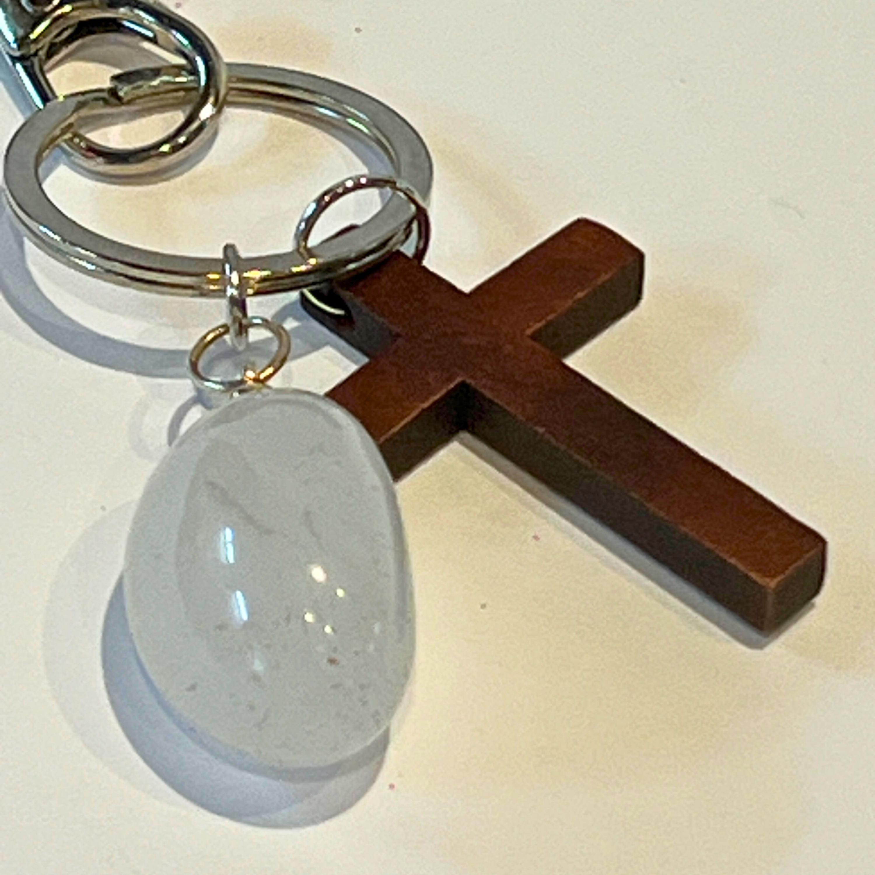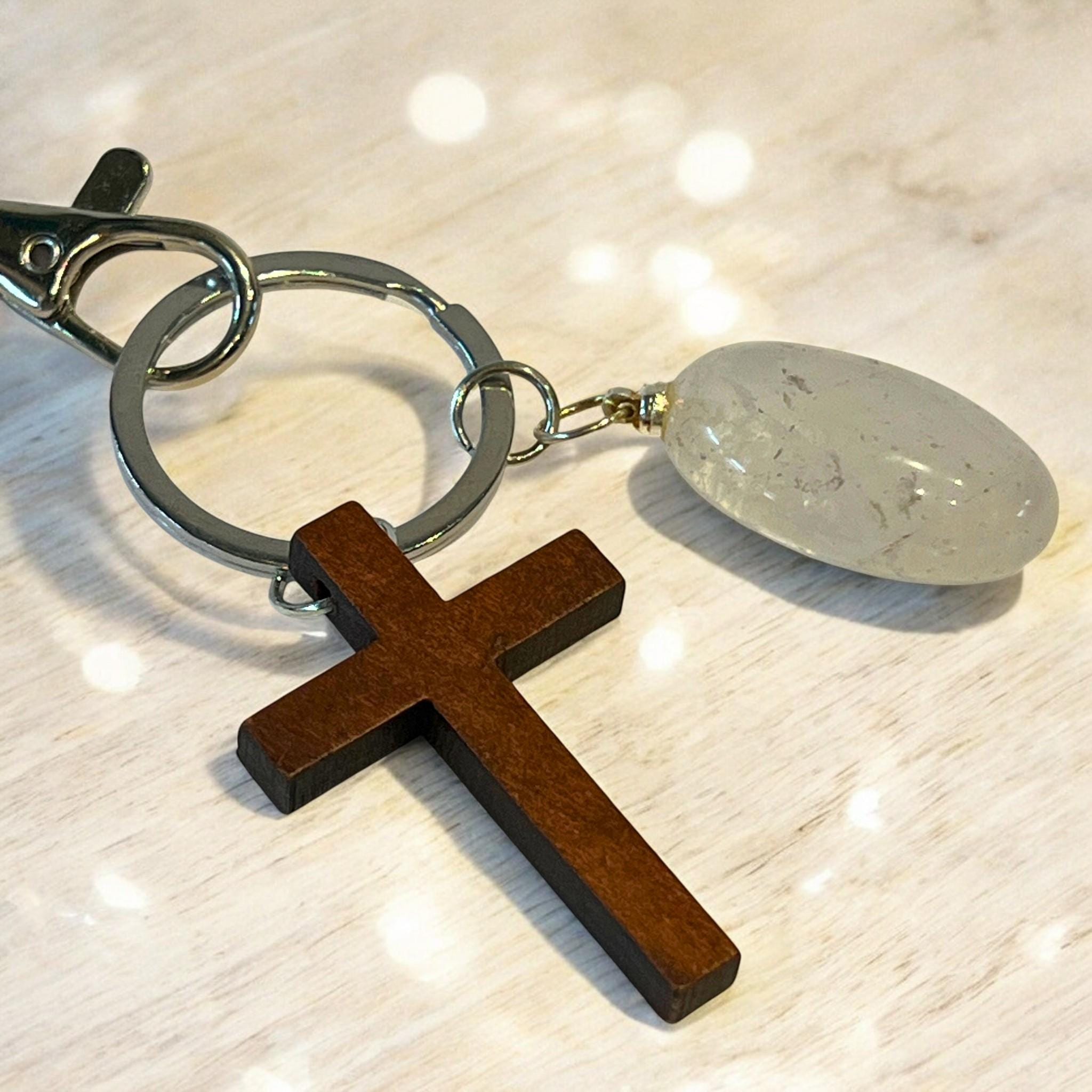 Carry a reminder of strength, faith, and protection with this meaningful Black Wood Cross Wristlet Keychain. Crafted with a scripture-printed wrist strap, natural clear quartz crystal, and a smooth wood cross, this keychain keeps encouragement close wherever you go.