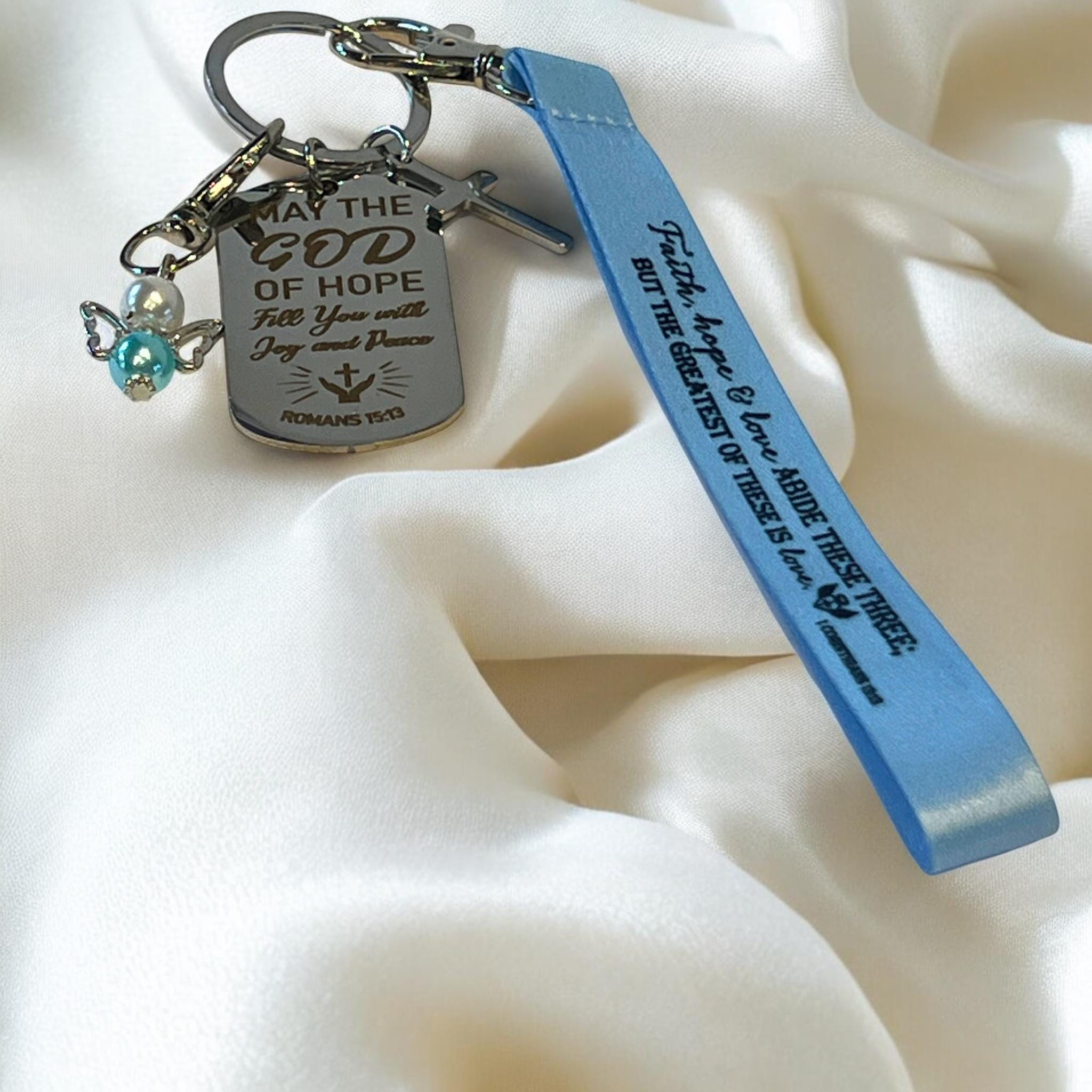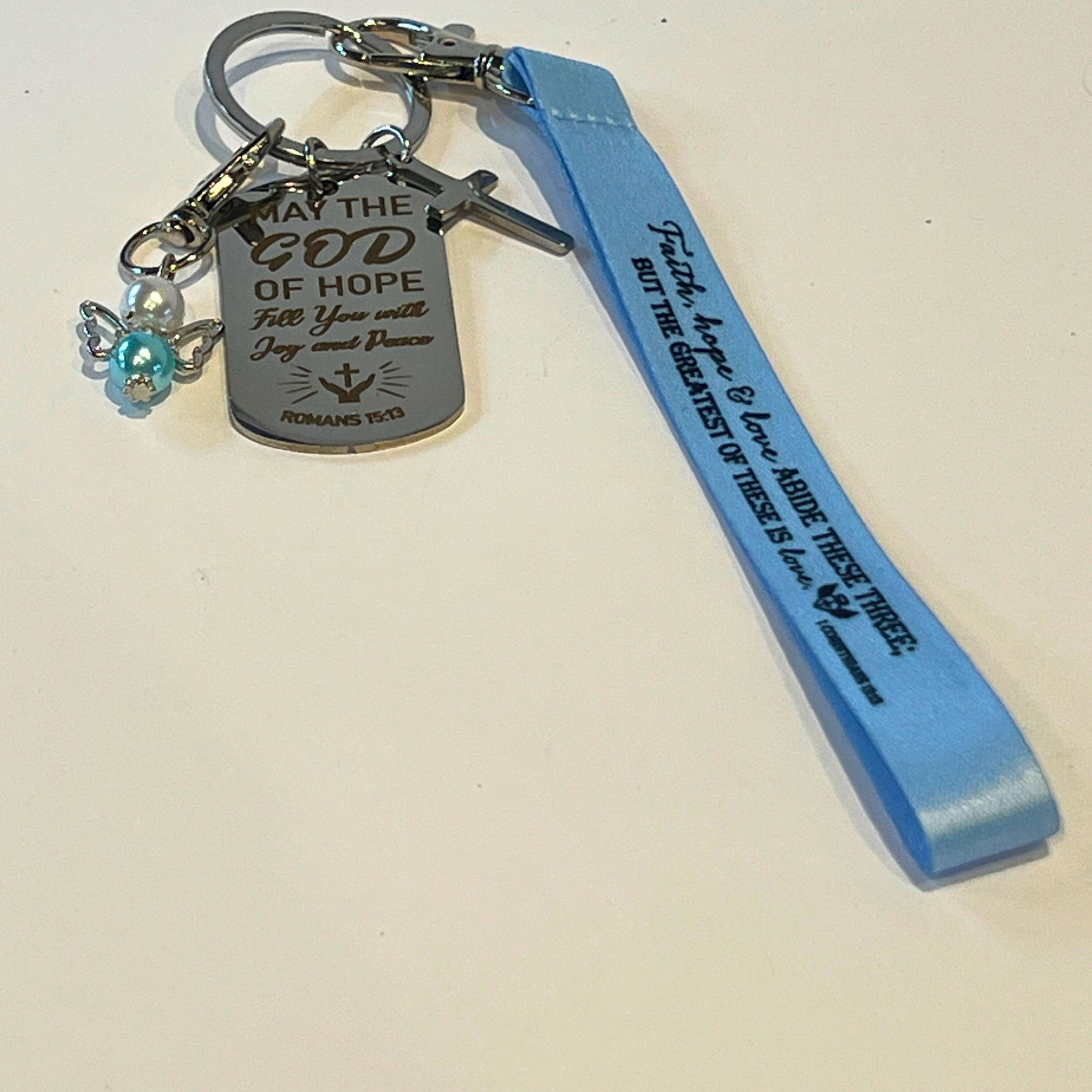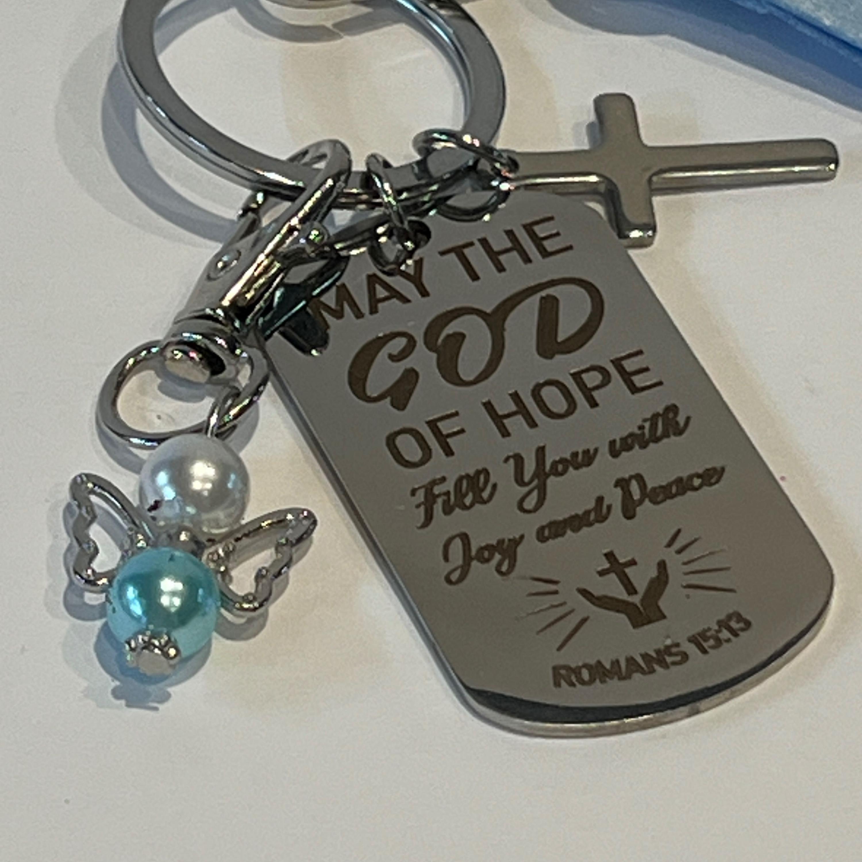 A comforting keepsake filled with hope, peace, and angelic protection. This Blue Angel Wristlet Keychain features a scripture wrist strap, engraved dog tag with “May the God of Hope Fill You with Joy and Peace,” a delicate silver cross, and an angel charm. Perfect for dressing up lanyards, keyrings, adding to zippers and bags and more.