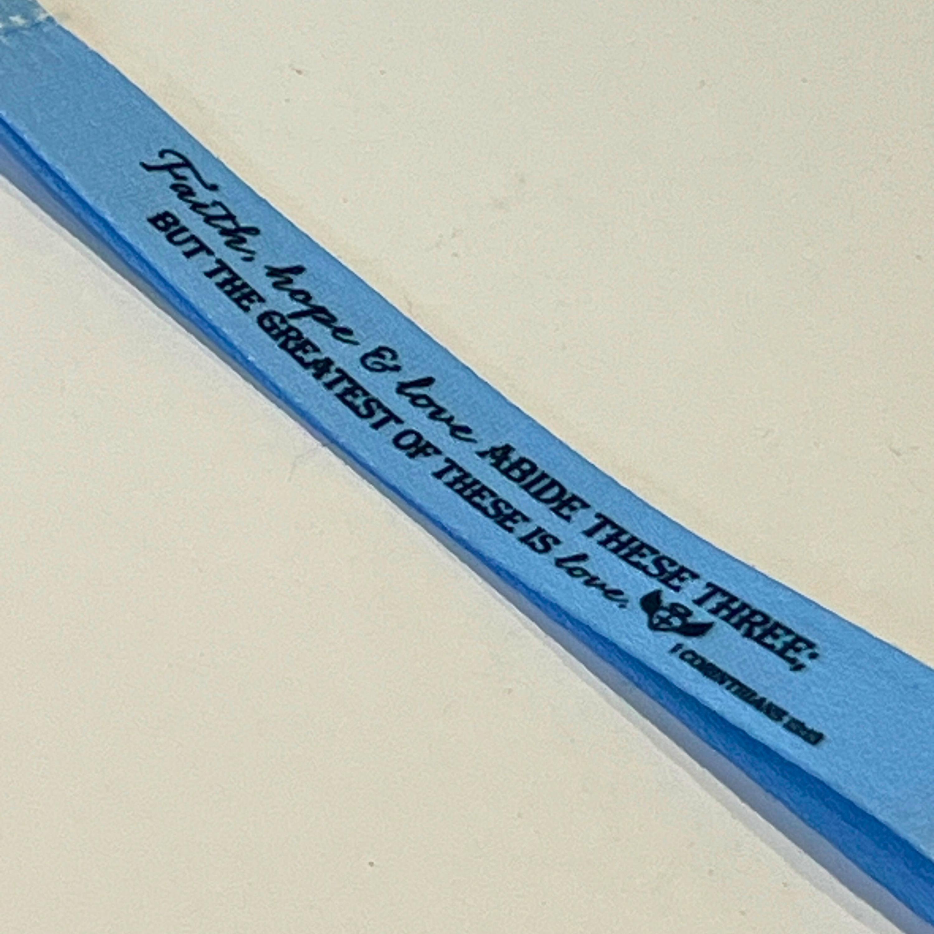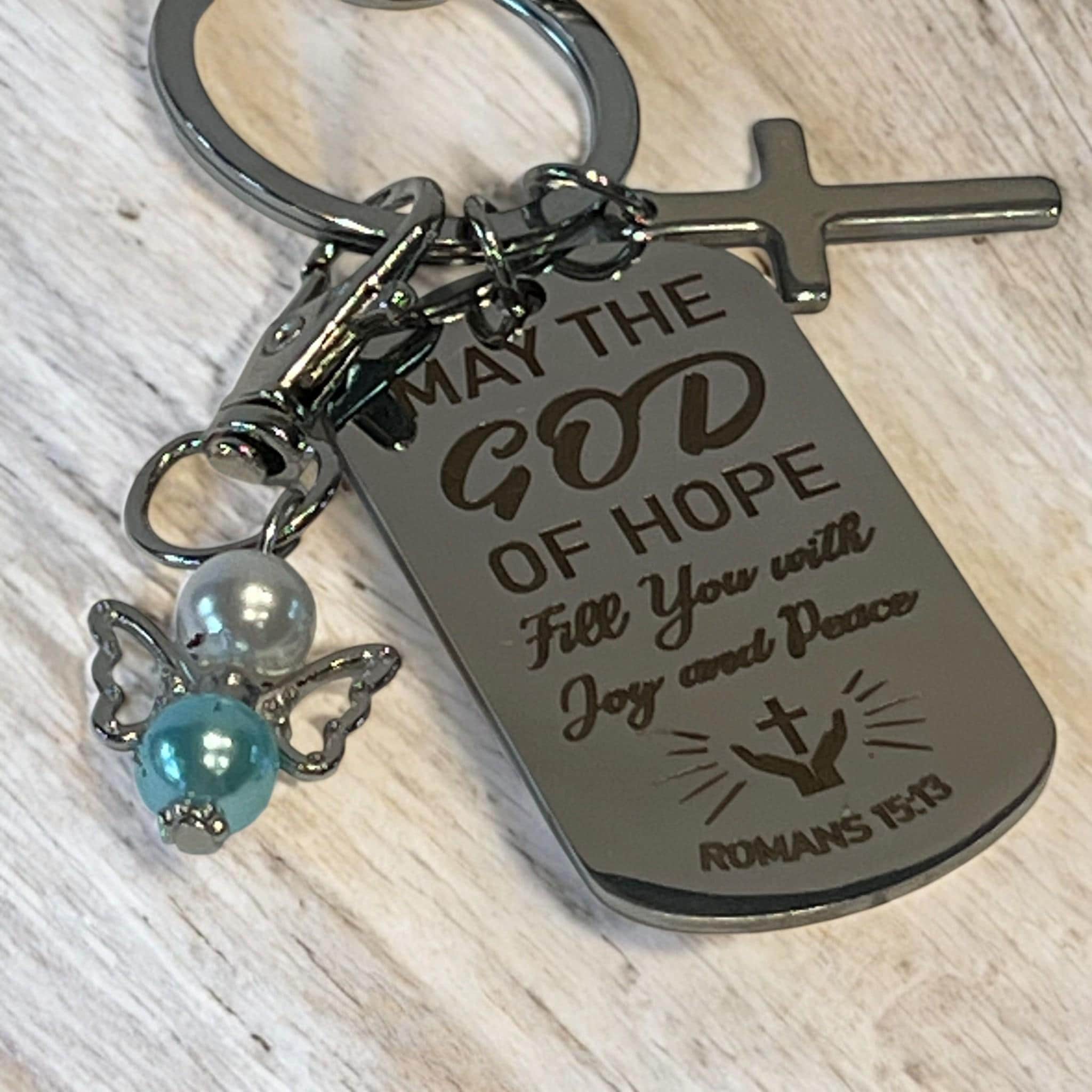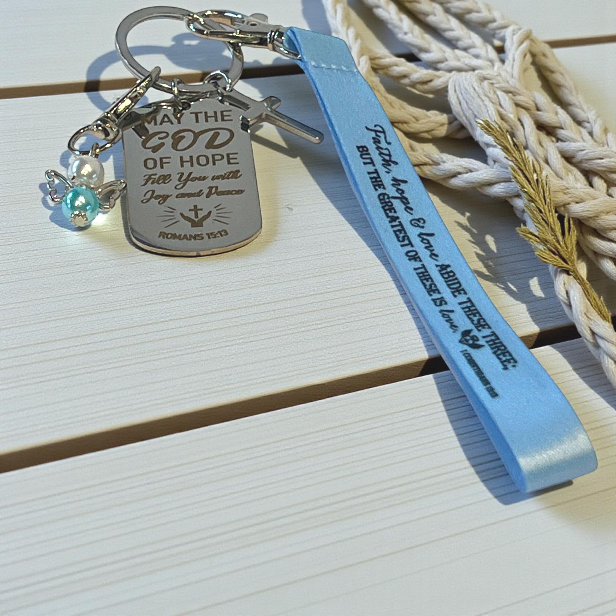 A comforting keepsake filled with hope, peace, and angelic protection. This Blue Angel Wristlet Keychain features a scripture wrist strap, engraved dog tag with “May the God of Hope Fill You with Joy and Peace,” a delicate silver cross, and an angel charm. Perfect for dressing up lanyards, keyrings, adding to zippers and bags and more.
