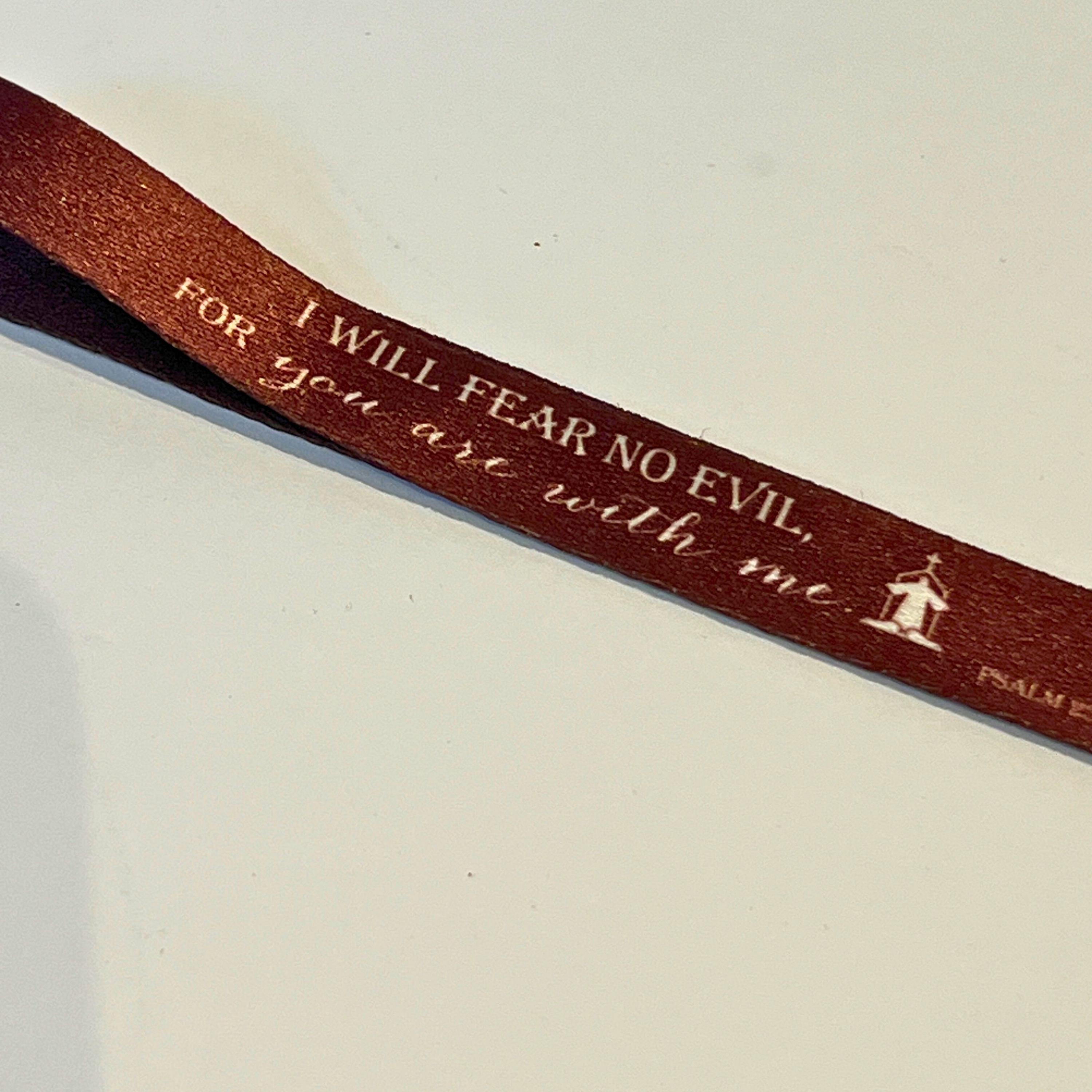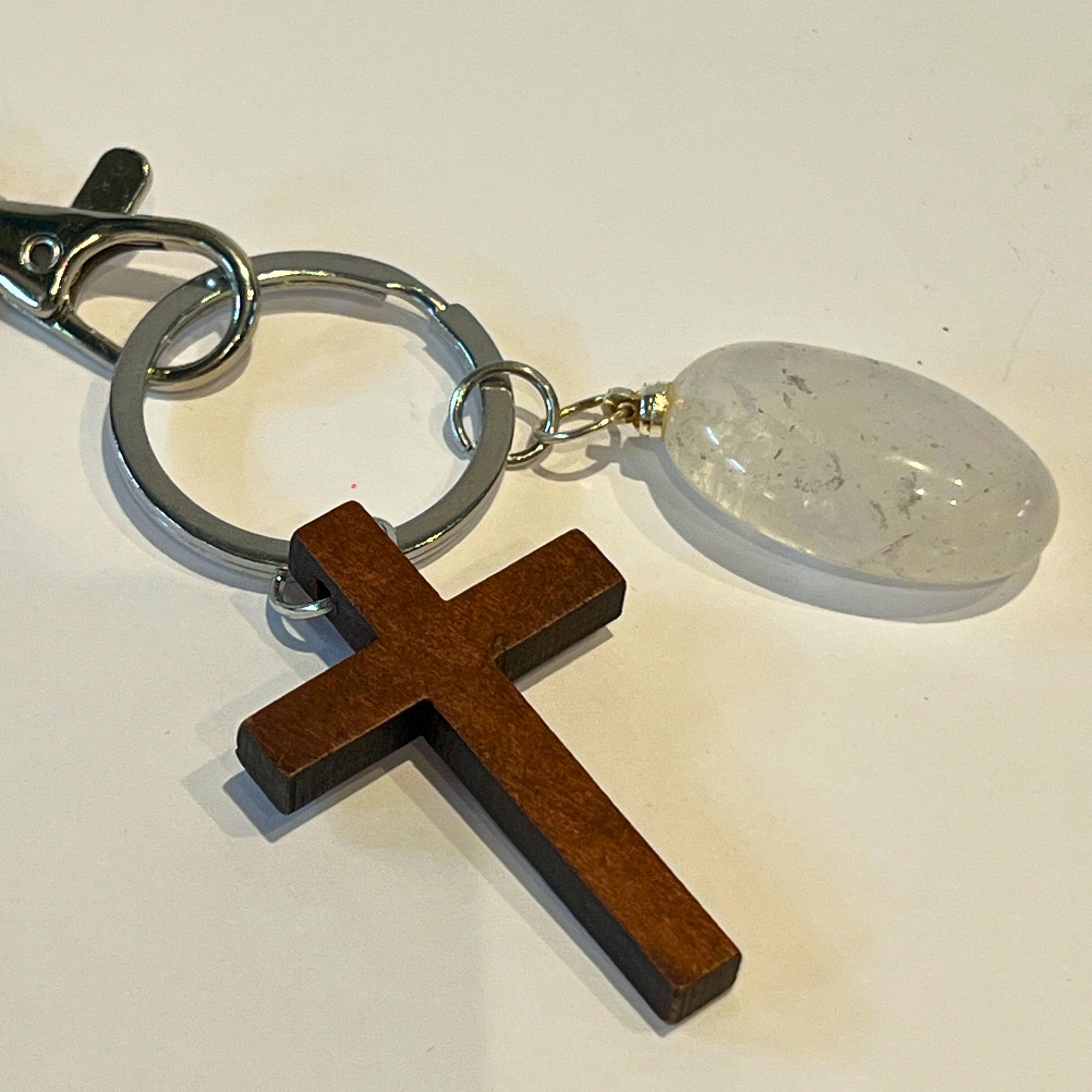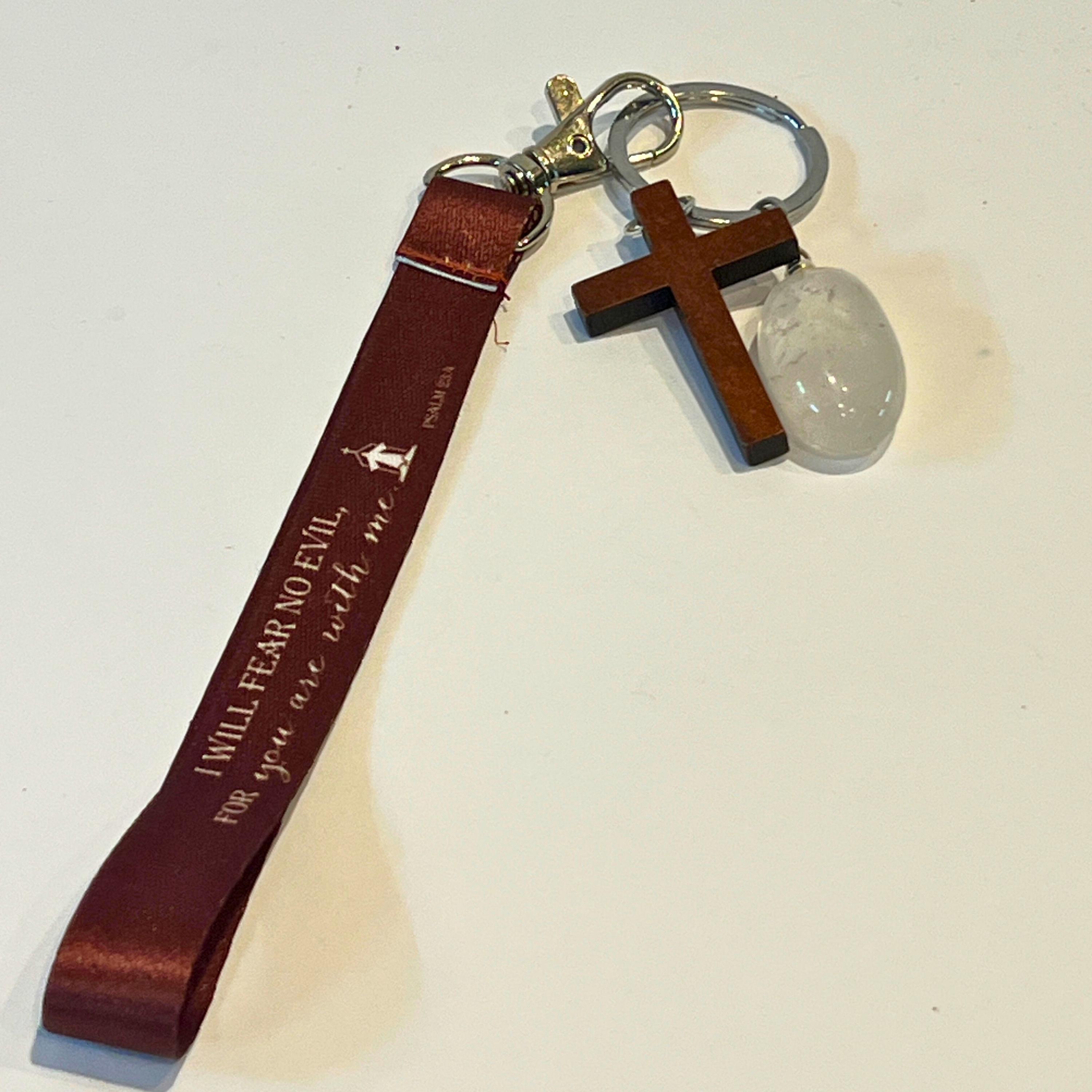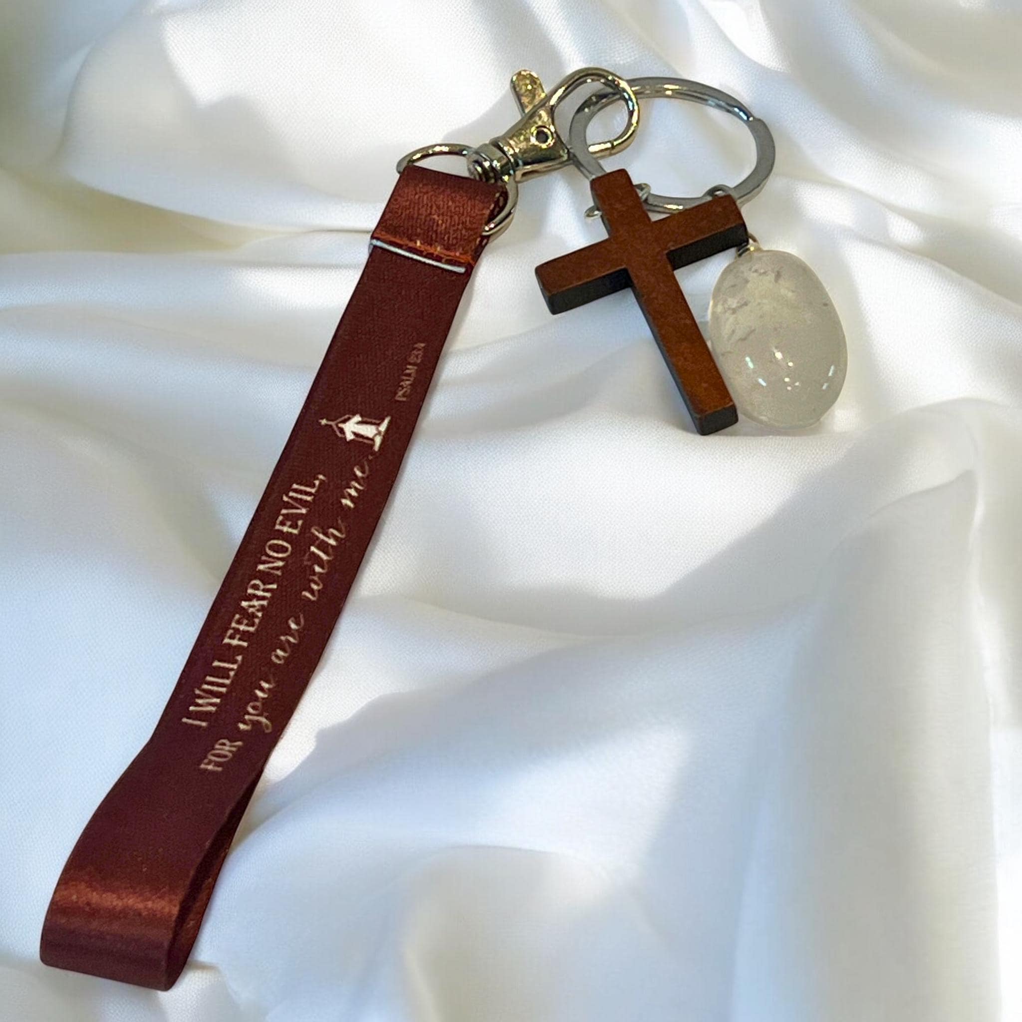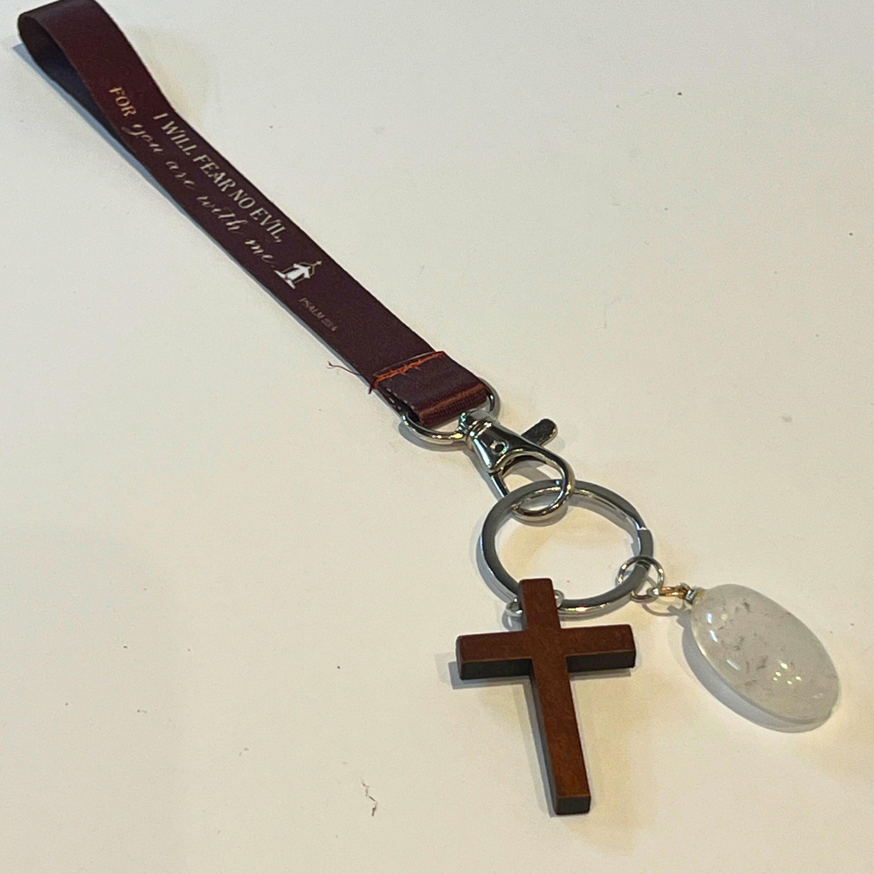 This earthy brown wristlet keychain carries a message of protection and courage. Includes a wood cross, natural clear quartz crystal, and scripture wristlet reading “I will fear no evil, for You are with me.”