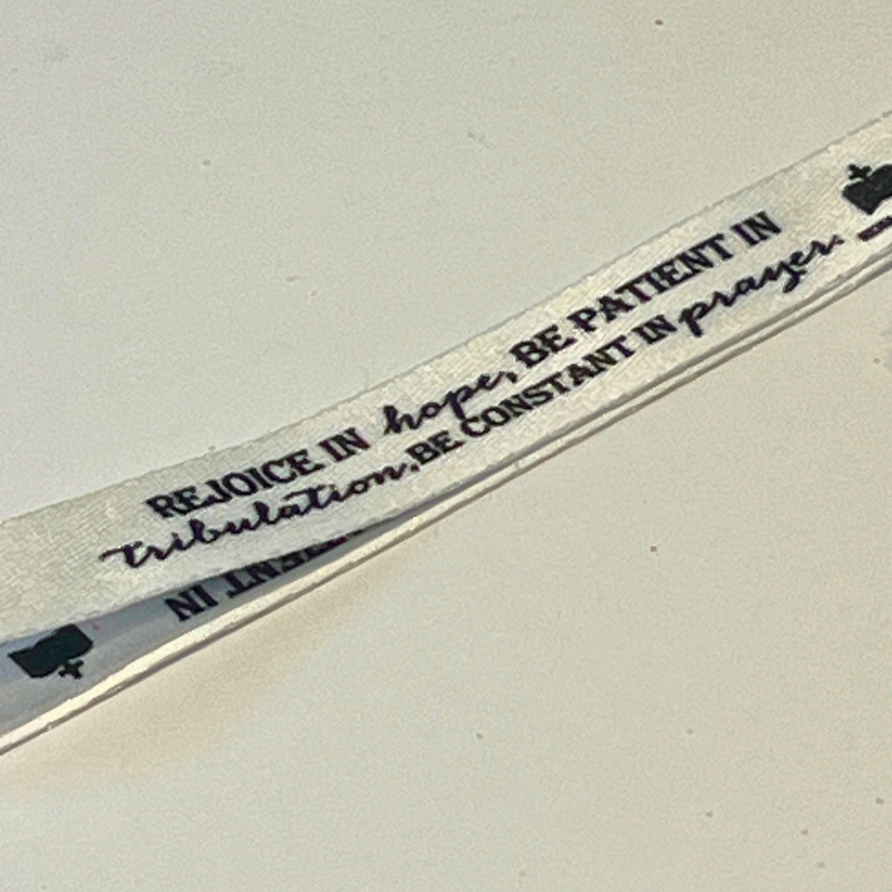 Includes an angel charm, pink glass bead, and “Blessed” charm. Scripture wristlet reads: “Rejoice in hope, be patient in tribulation, be constant in prayer.”