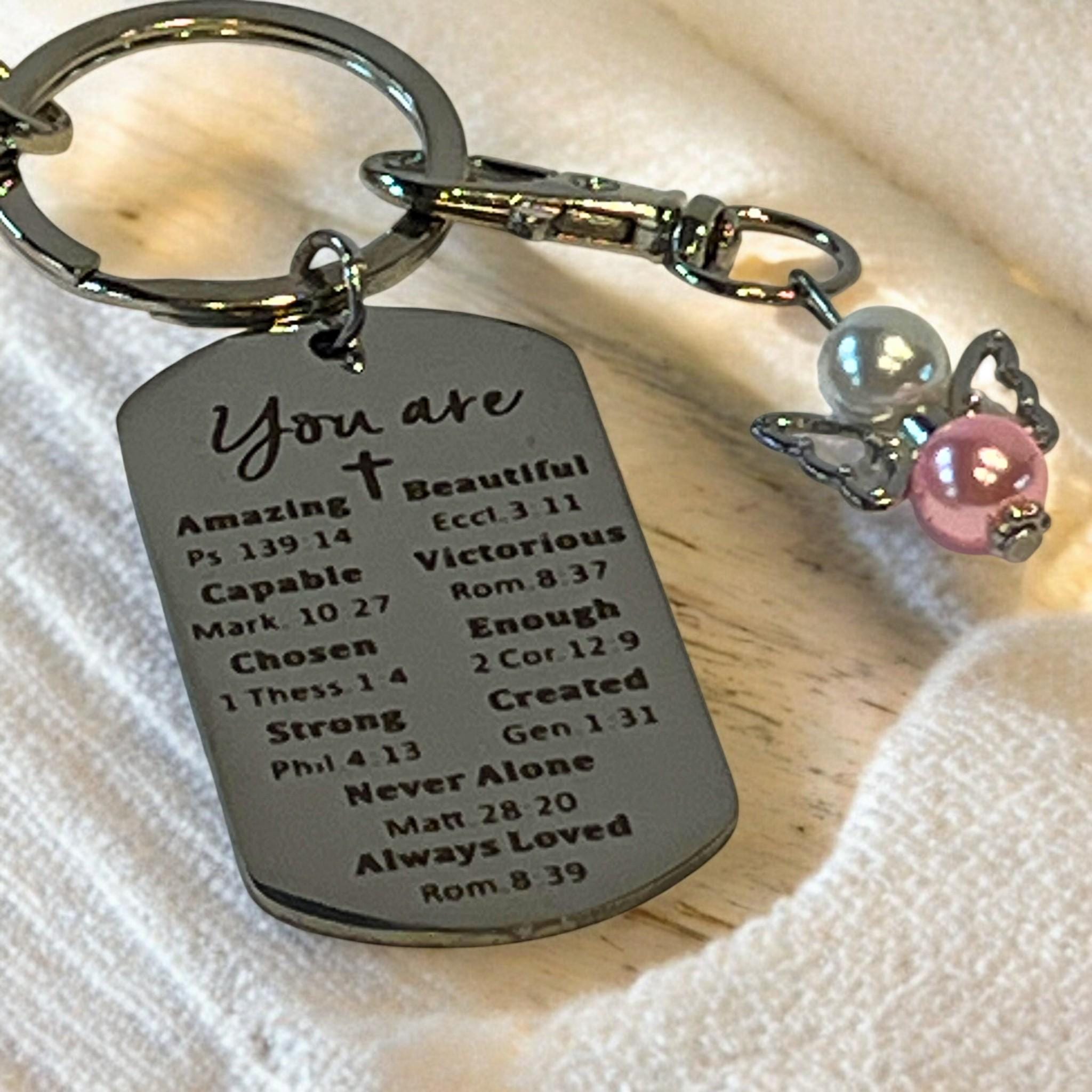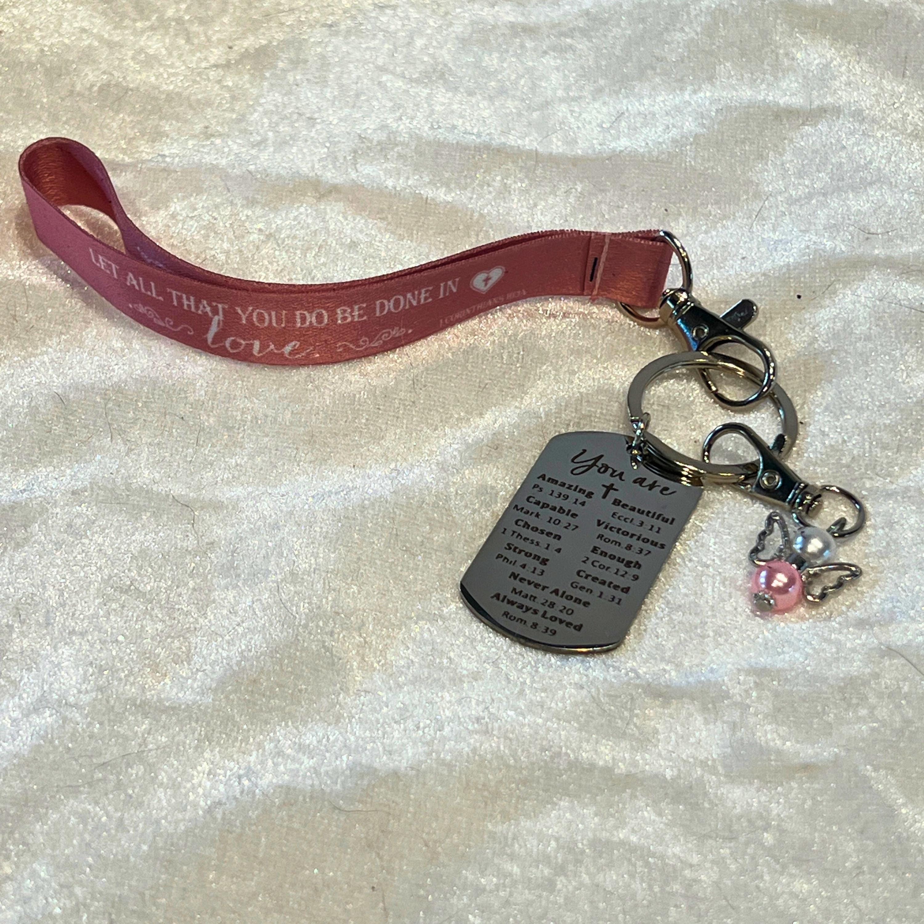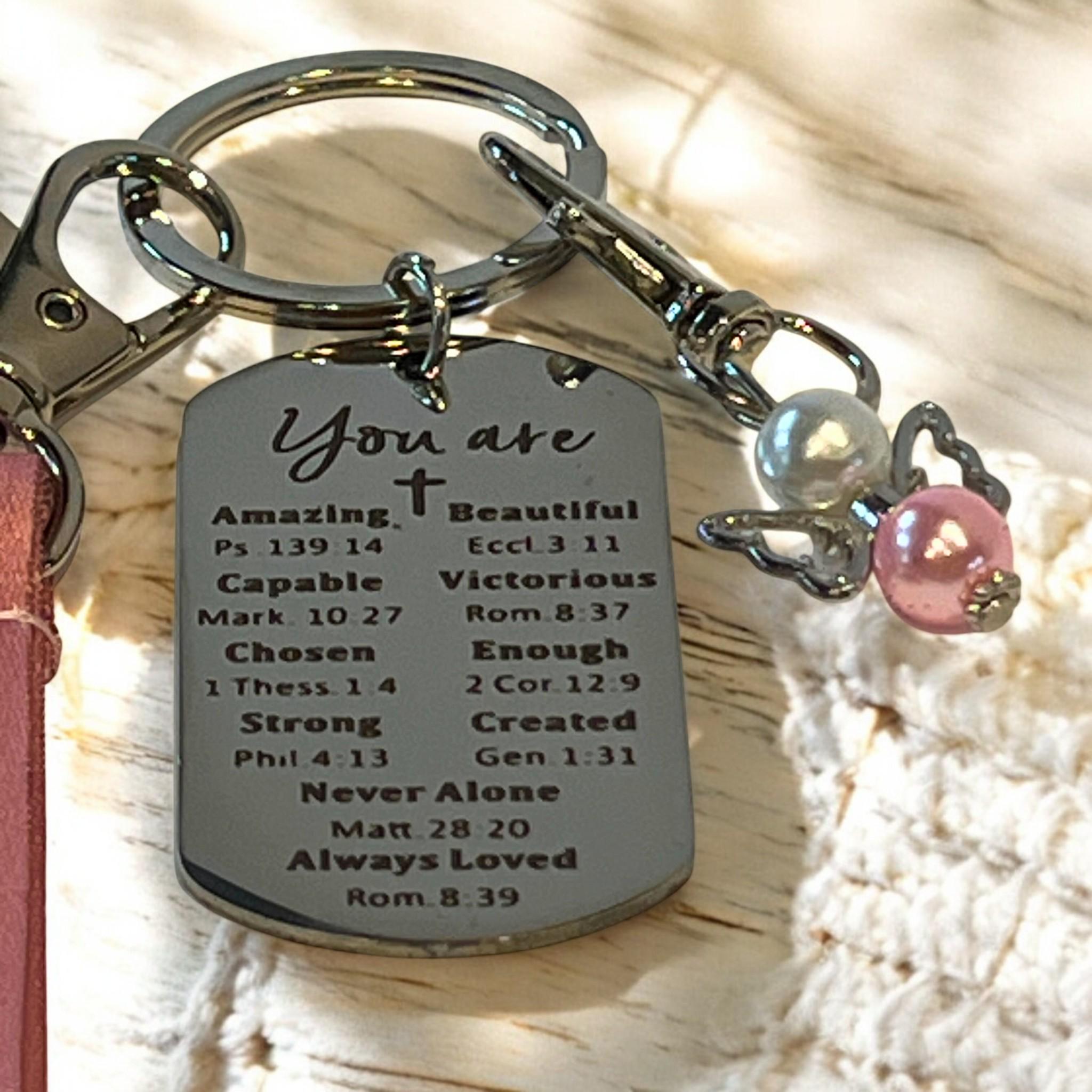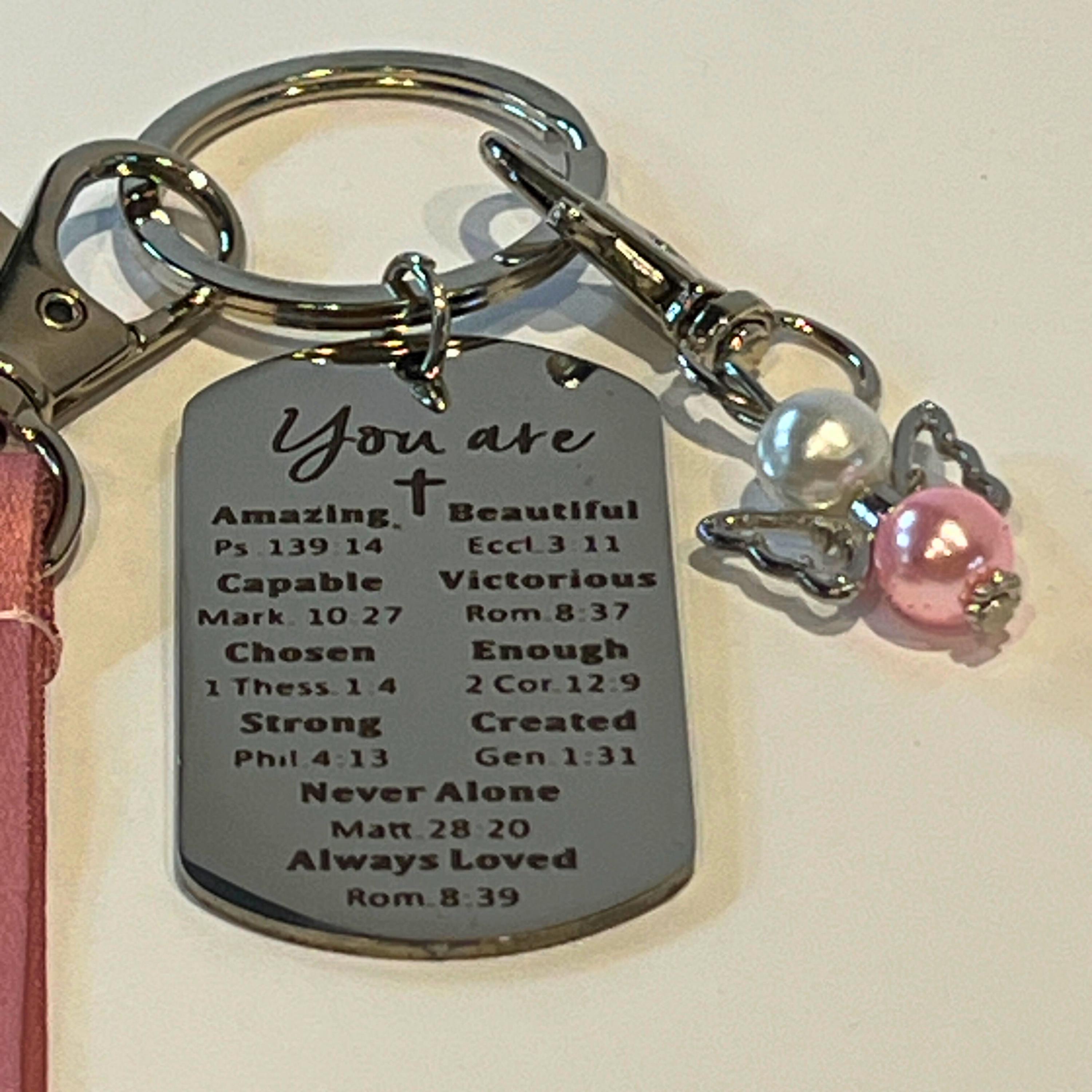 This pink wristlet includes a stainless tag engraved with uplifting biblical affirmations (You are enough, chosen, loved…), plus an angel charm.