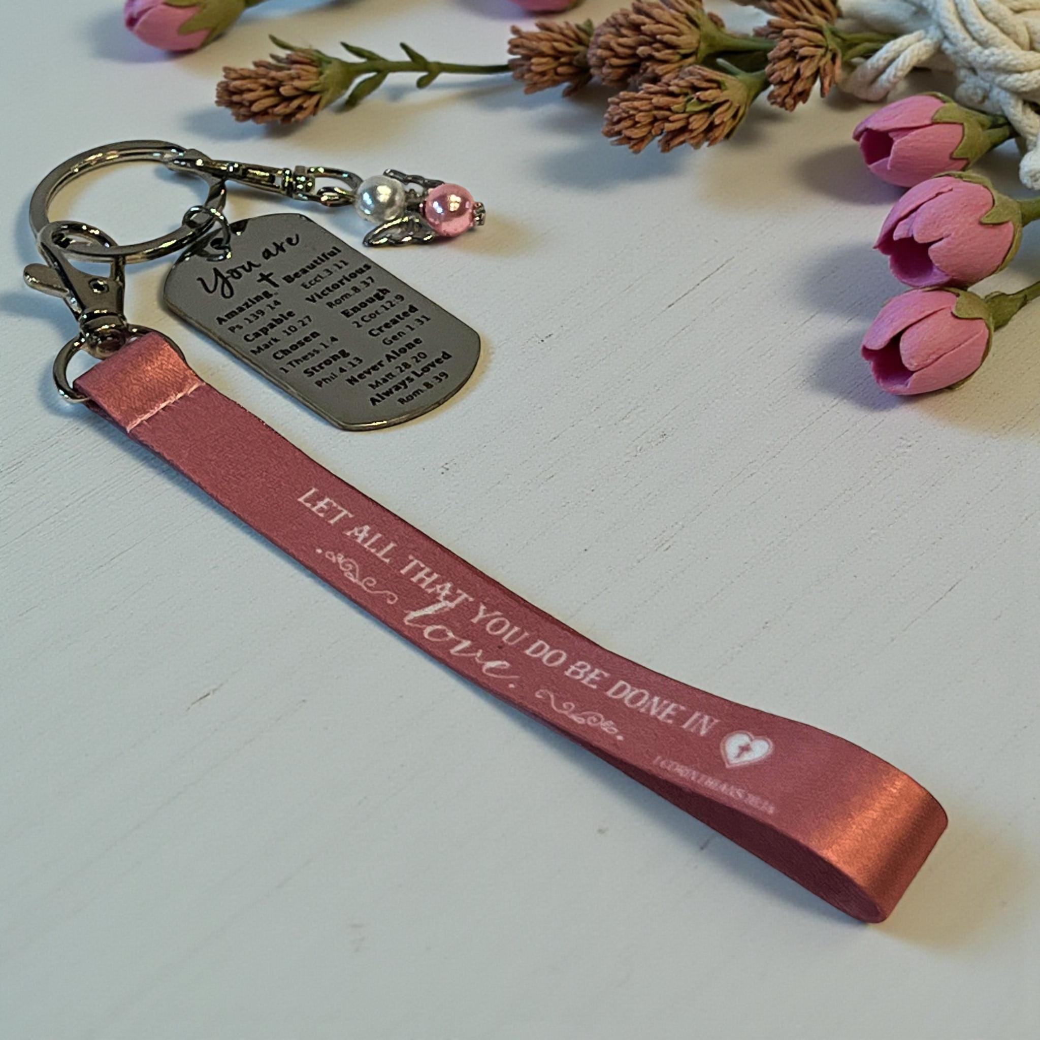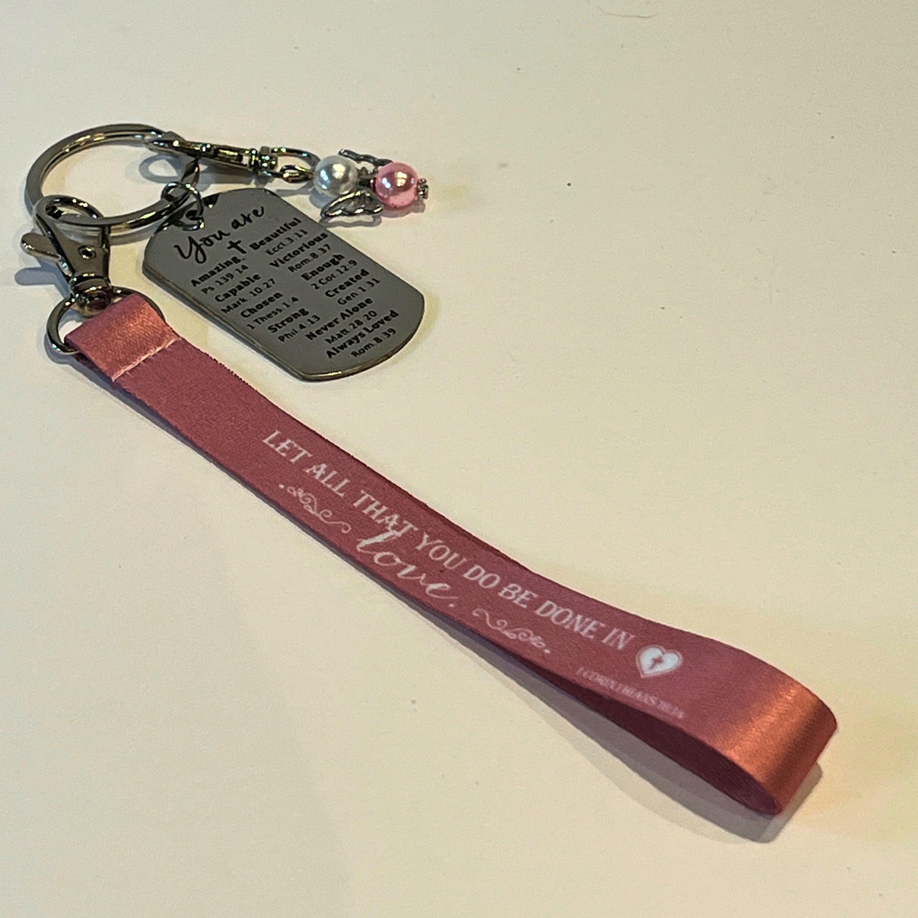 Scripture wristlet reads: “Let all that you do be done in love.”