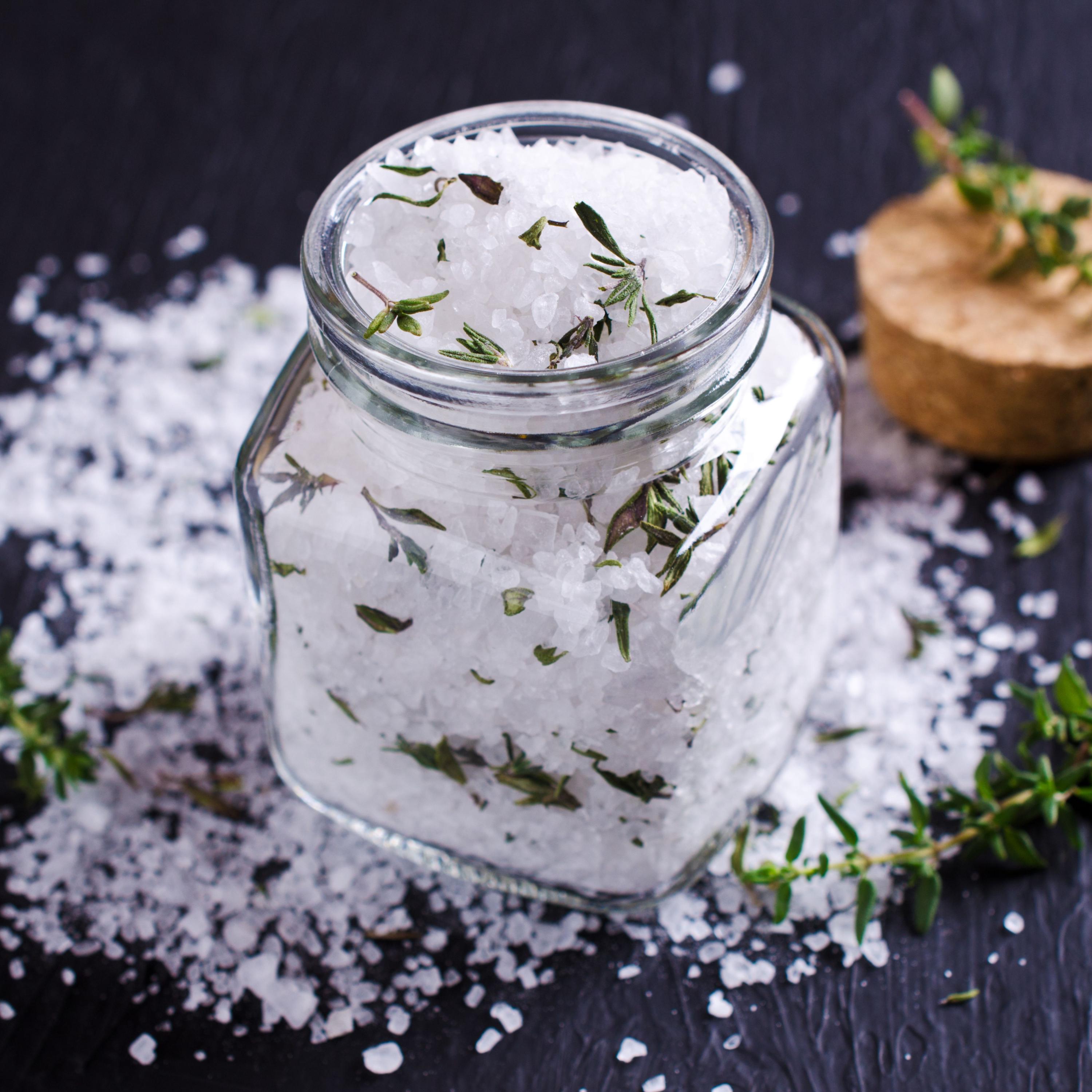 Earthy, aromatic Thyme Salt handcrafted with real dried thyme and premium kosher salt. Perfect for roasted chicken, potatoes, vegetables, bread dips, soups, and everyday cooking.