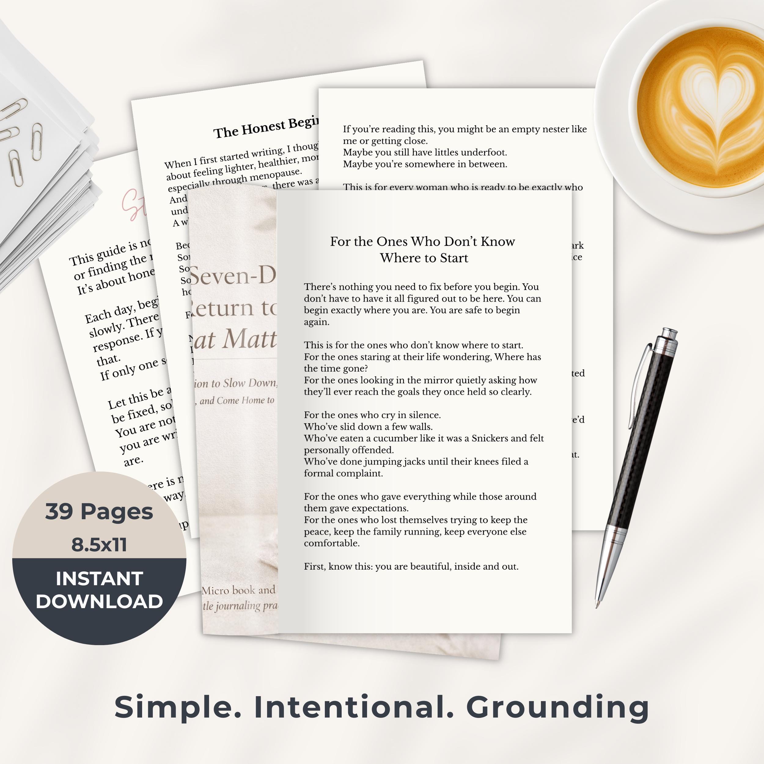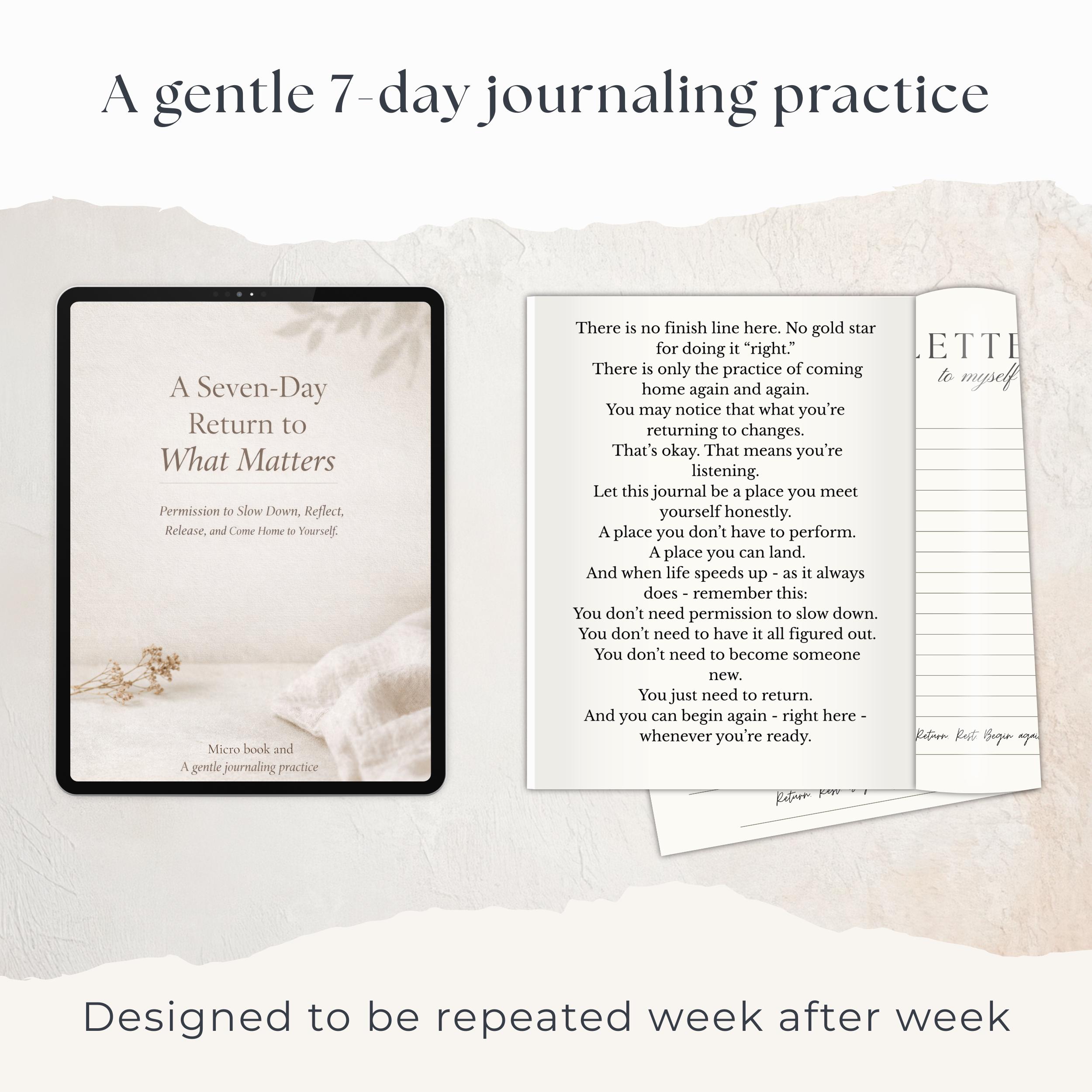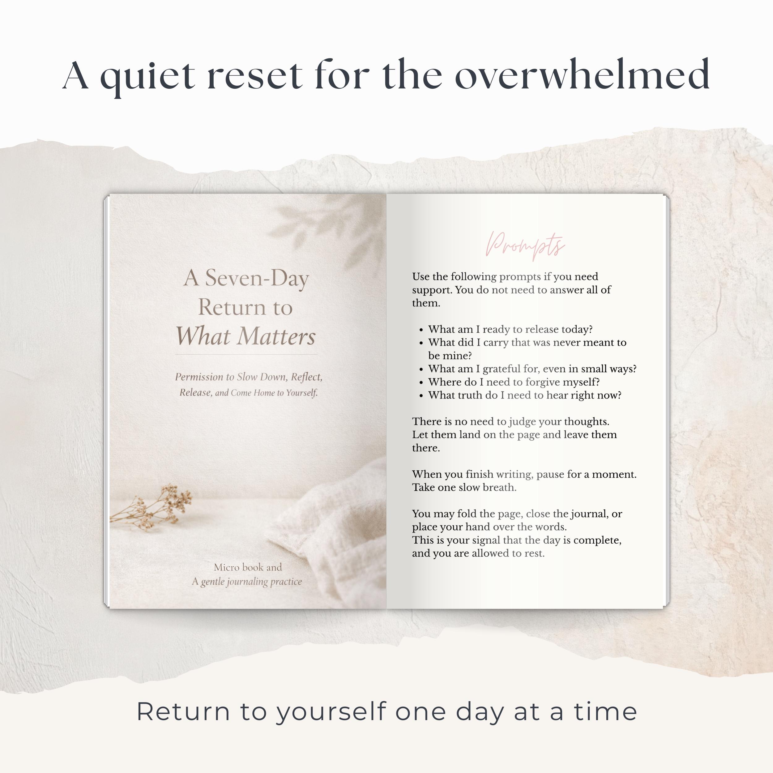 A Seven-Day Return to What Matters is a gentle, repeatable journaling practice designed to help you slow down, reflect, release what no longer serves you, and come home to yourself, one day at a time.