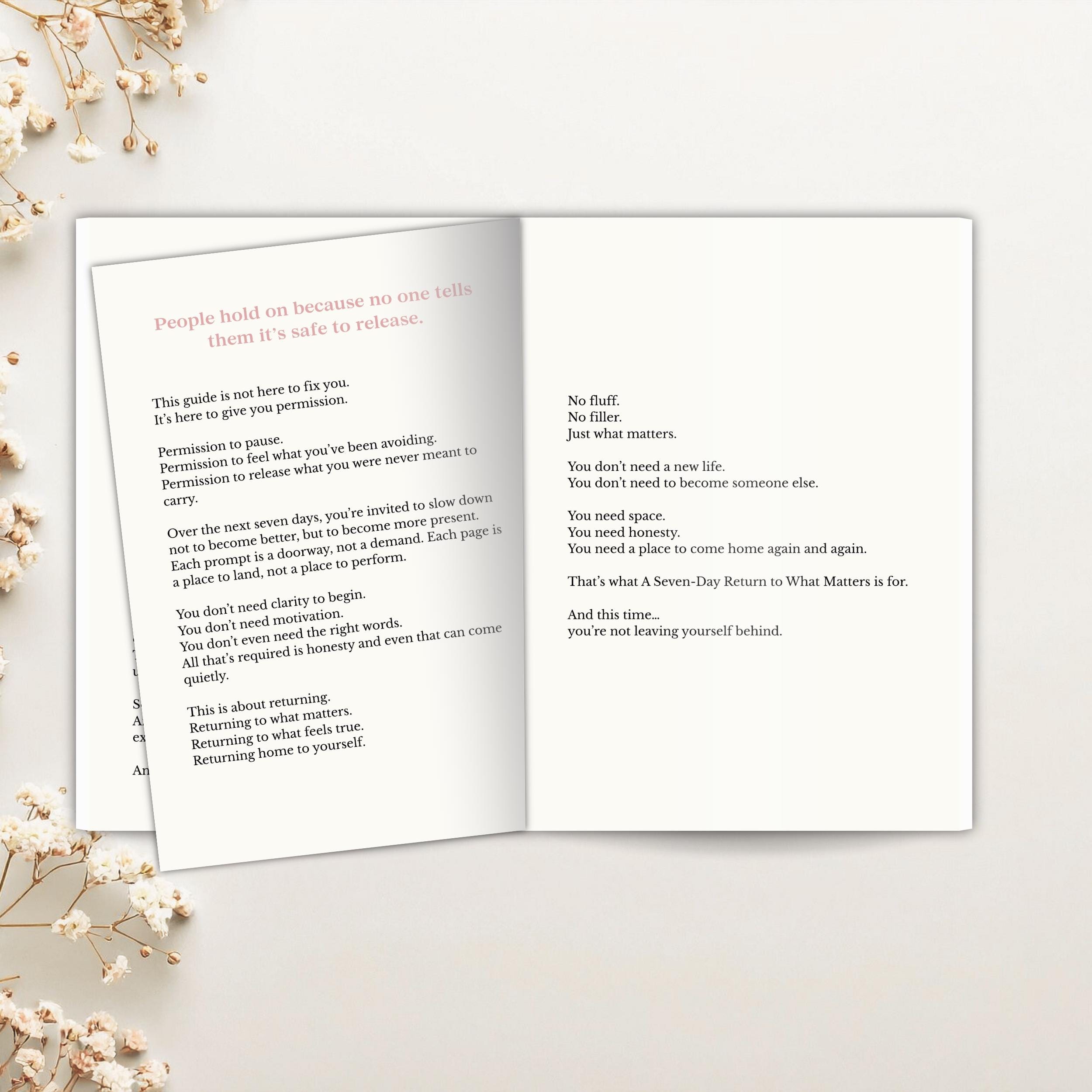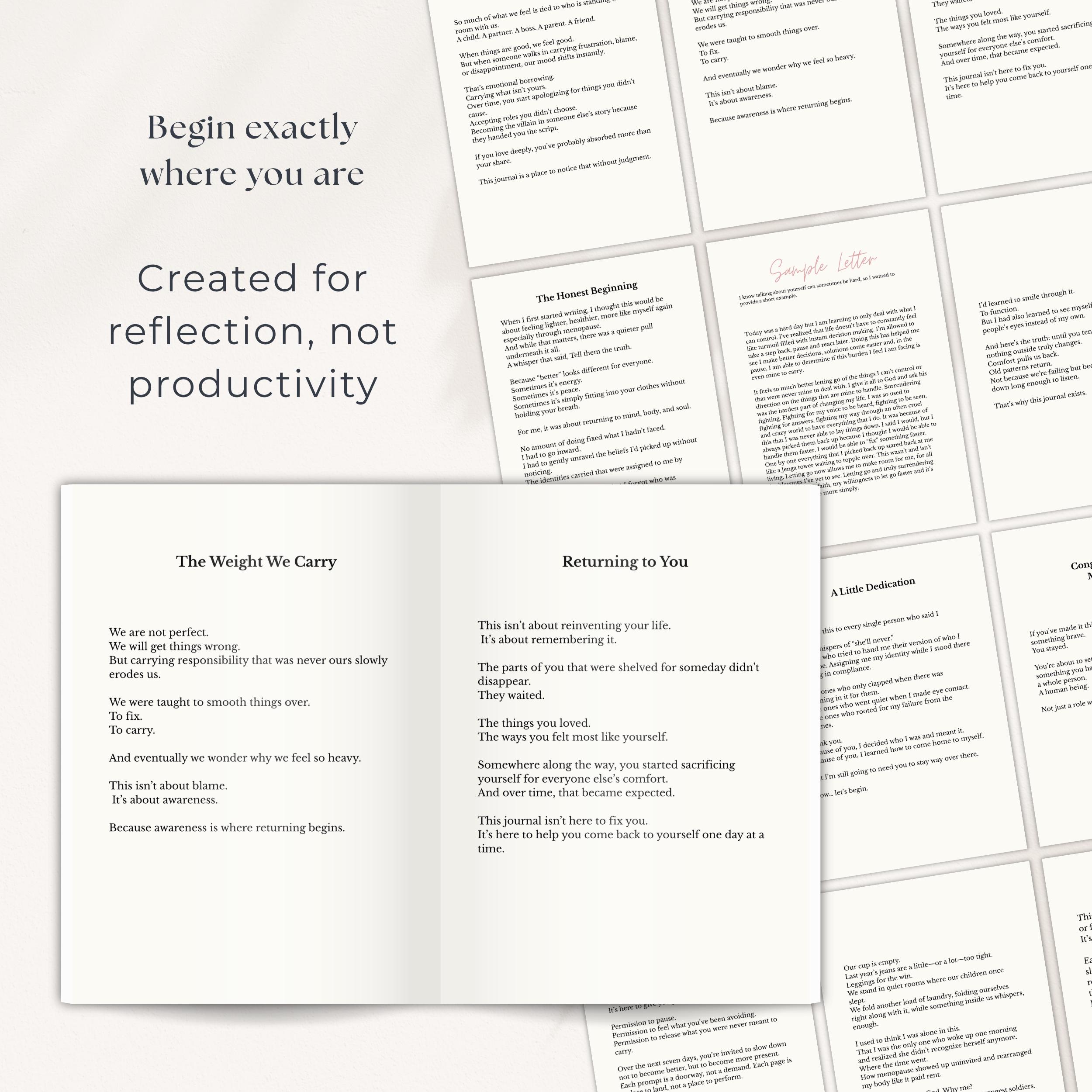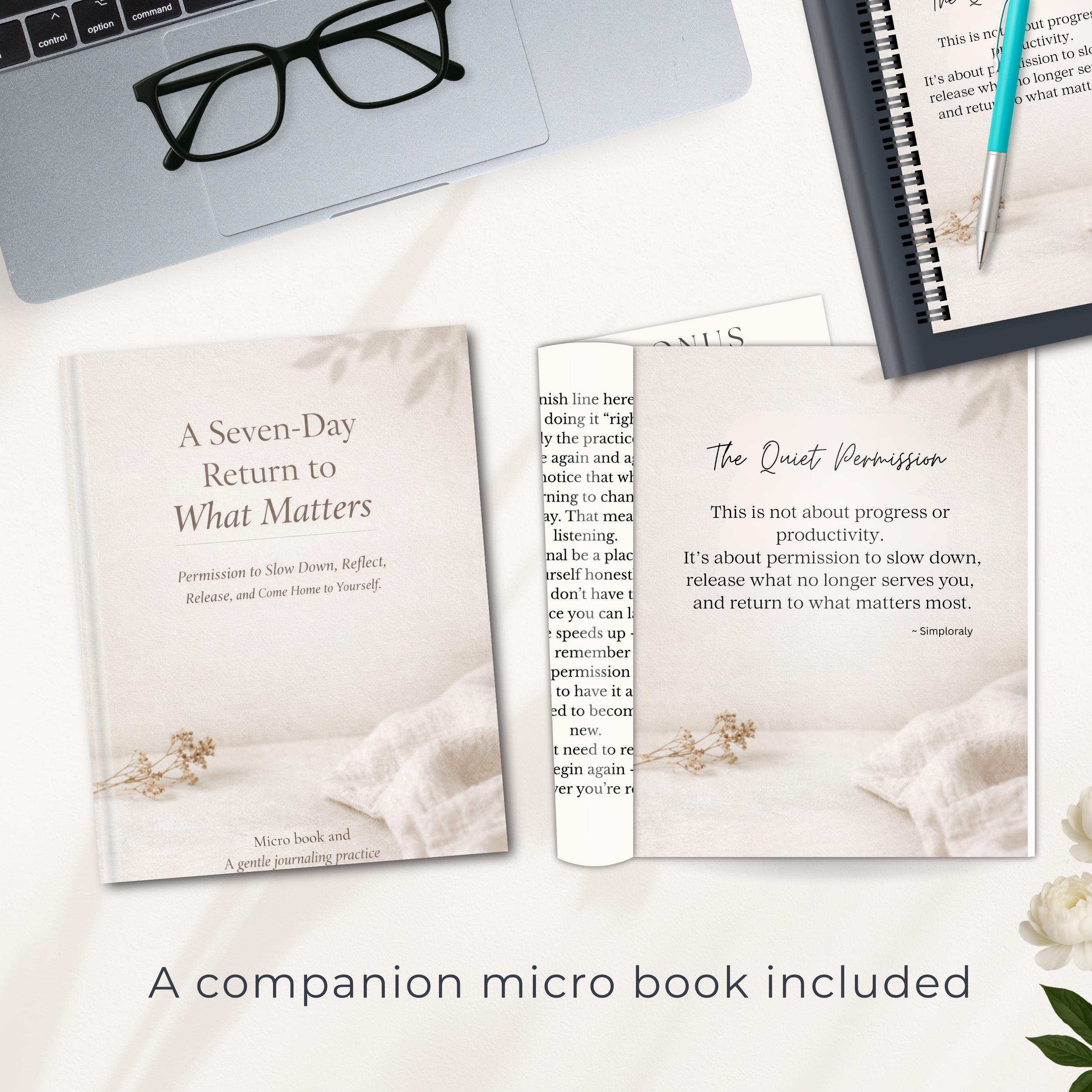 A Seven-Day Return to What Matters is a gentle, repeatable journaling practice designed to help you slow down, reflect, release what no longer serves you, and come home to yourself, one day at a time.