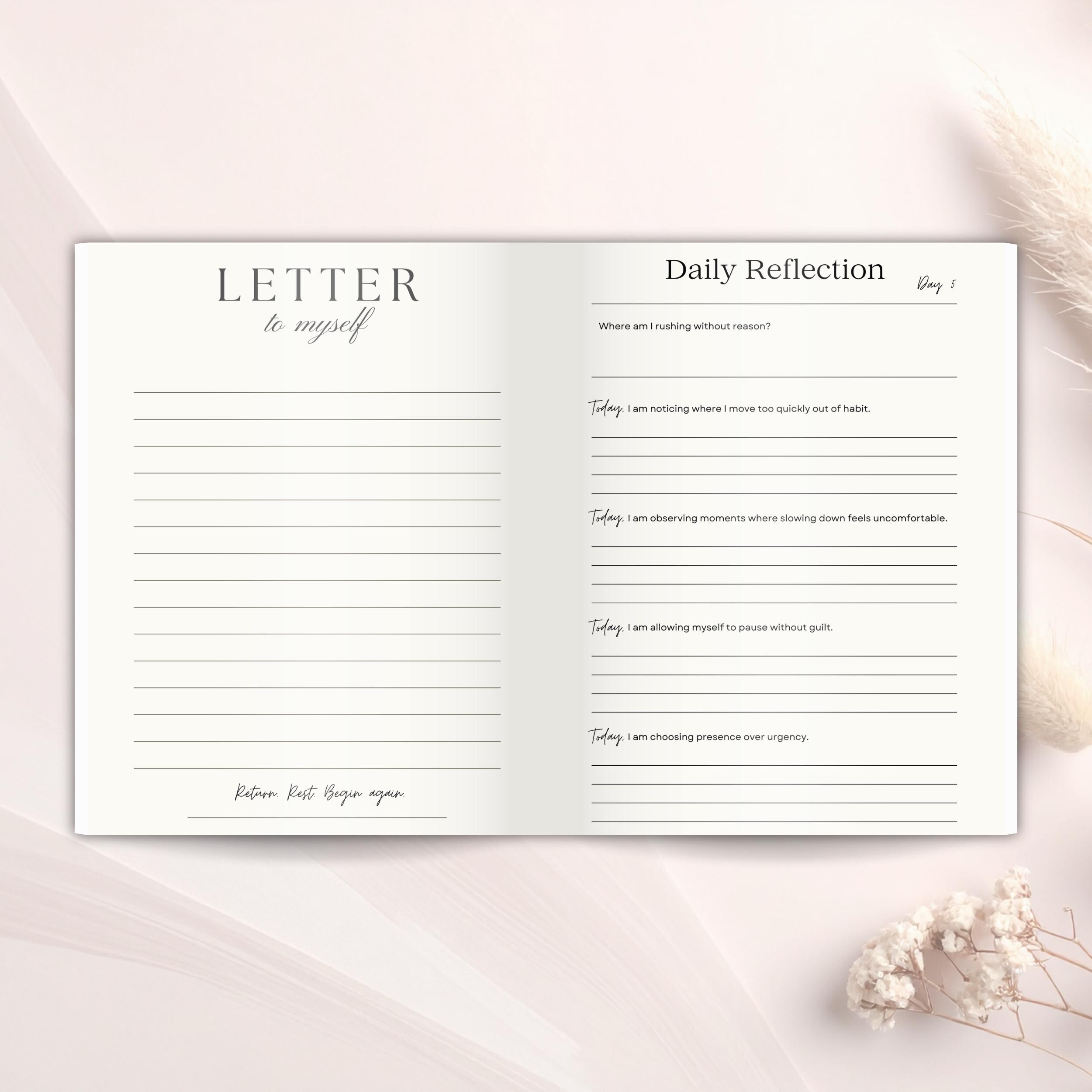 Created for women who feel tired, stretched thin, or disconnected from themselves, this journal invites you to step out of urgency and back into awareness. Each day offers a simple prompt and reflective space. No overwhelm, no pressure, no perfection required.