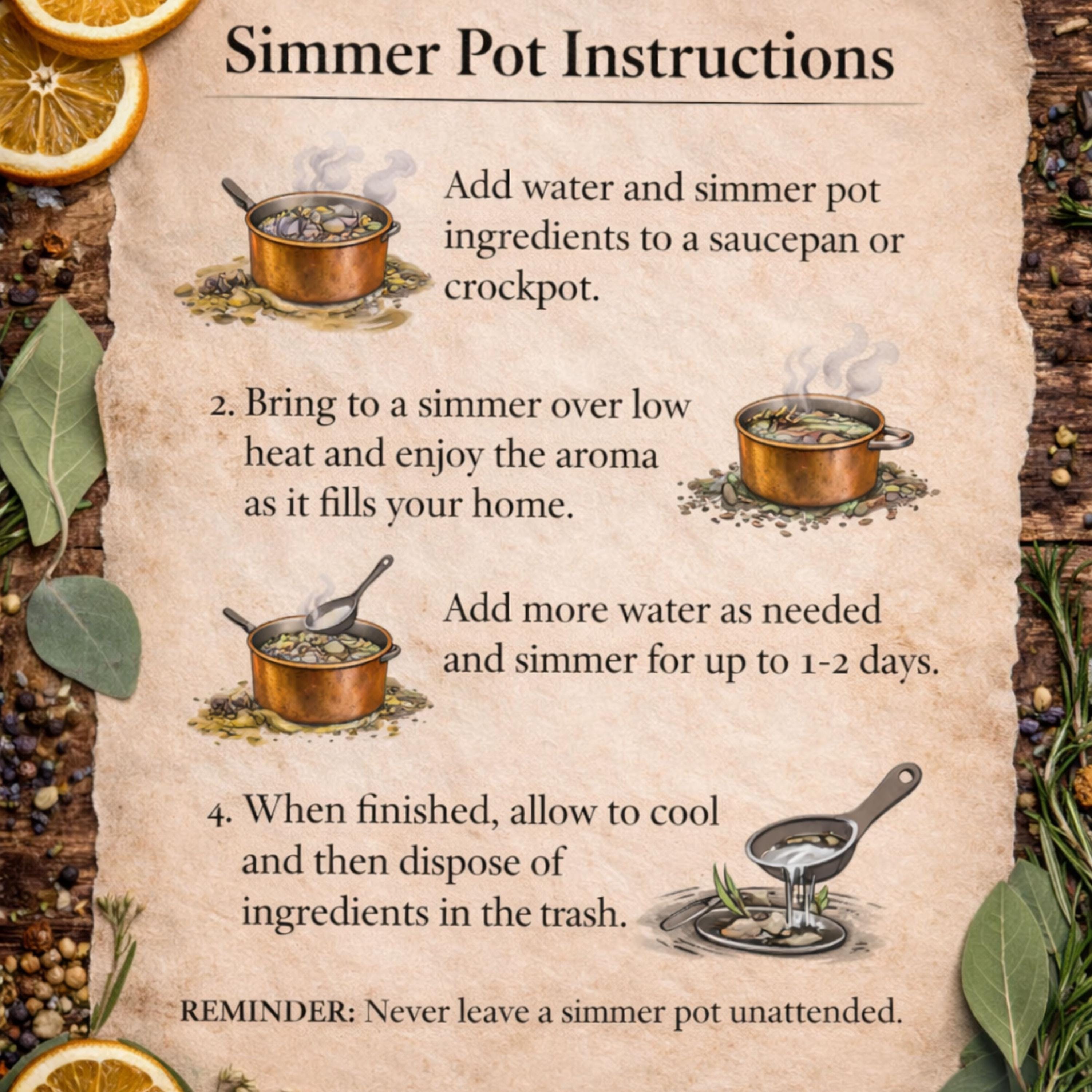 • One botanical simmer pot blend (approx. 4.3oz dried mix) allowing for multiple or one use depending on pot size