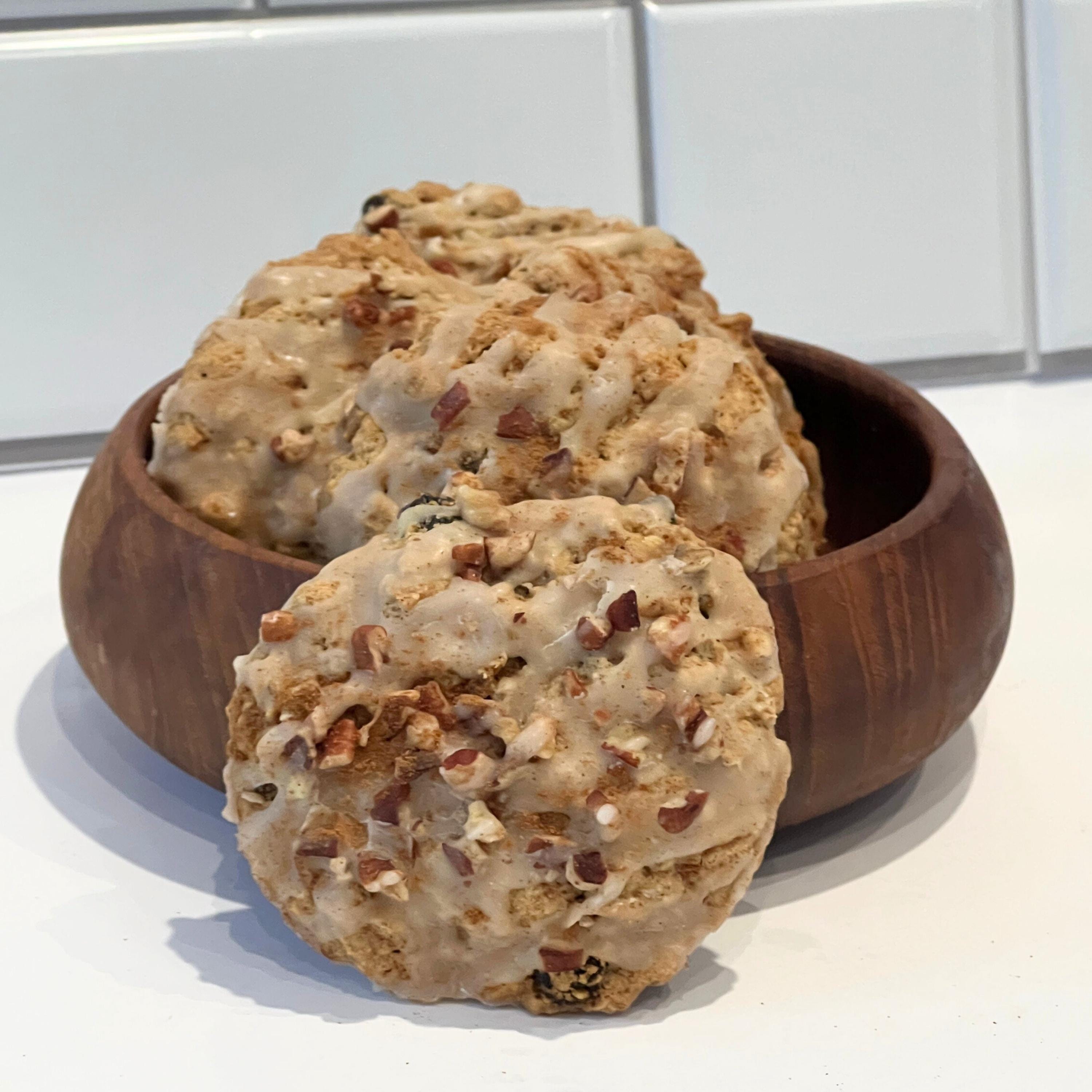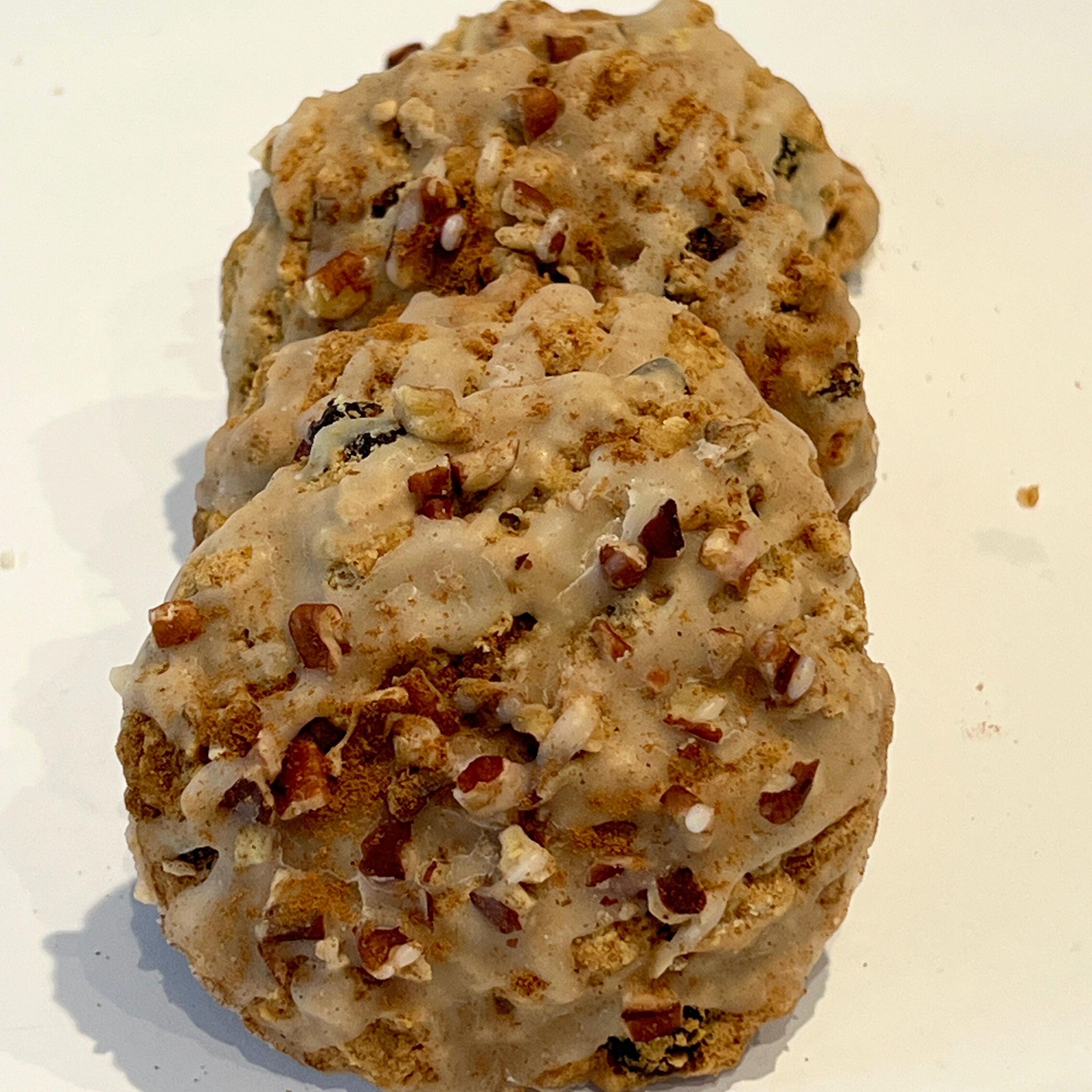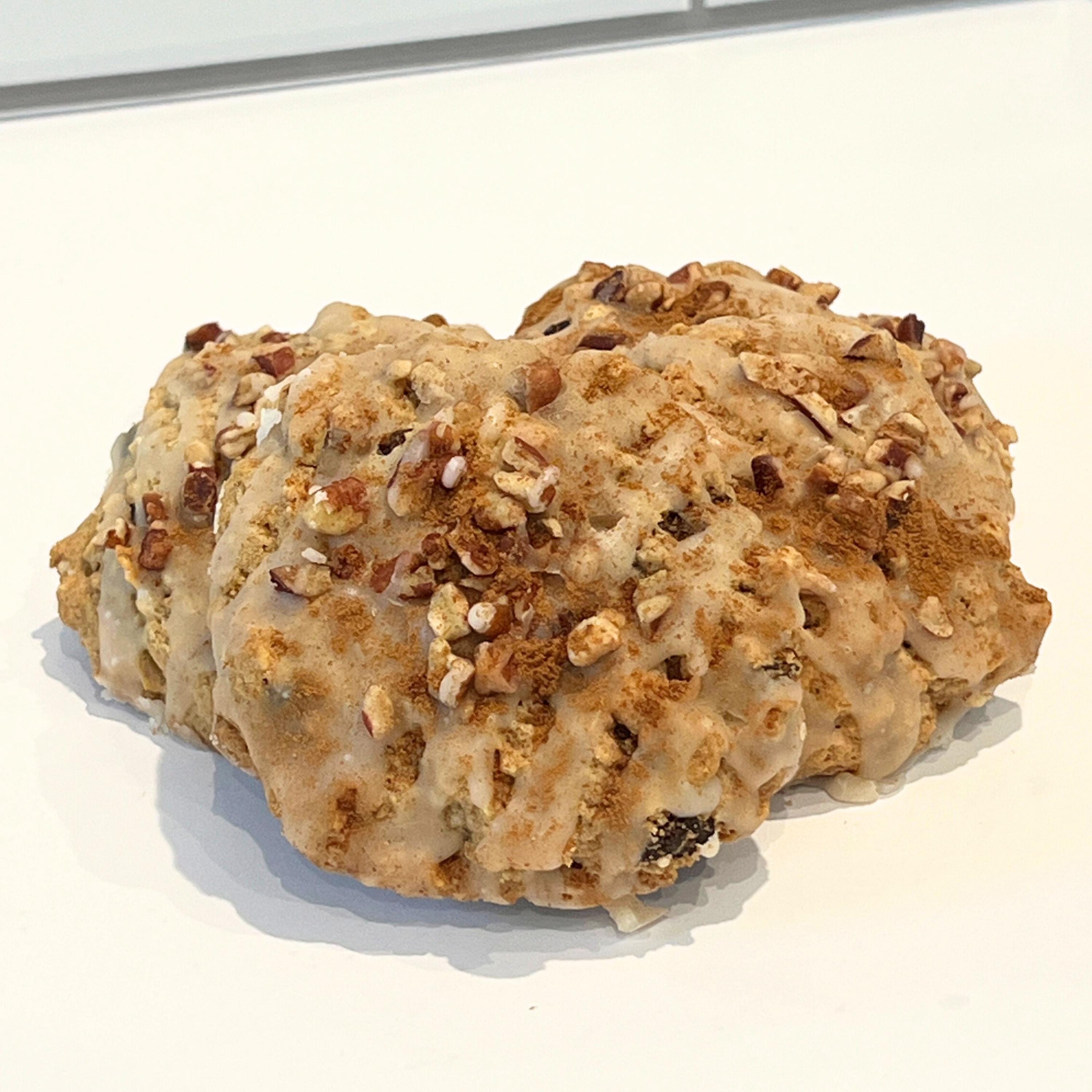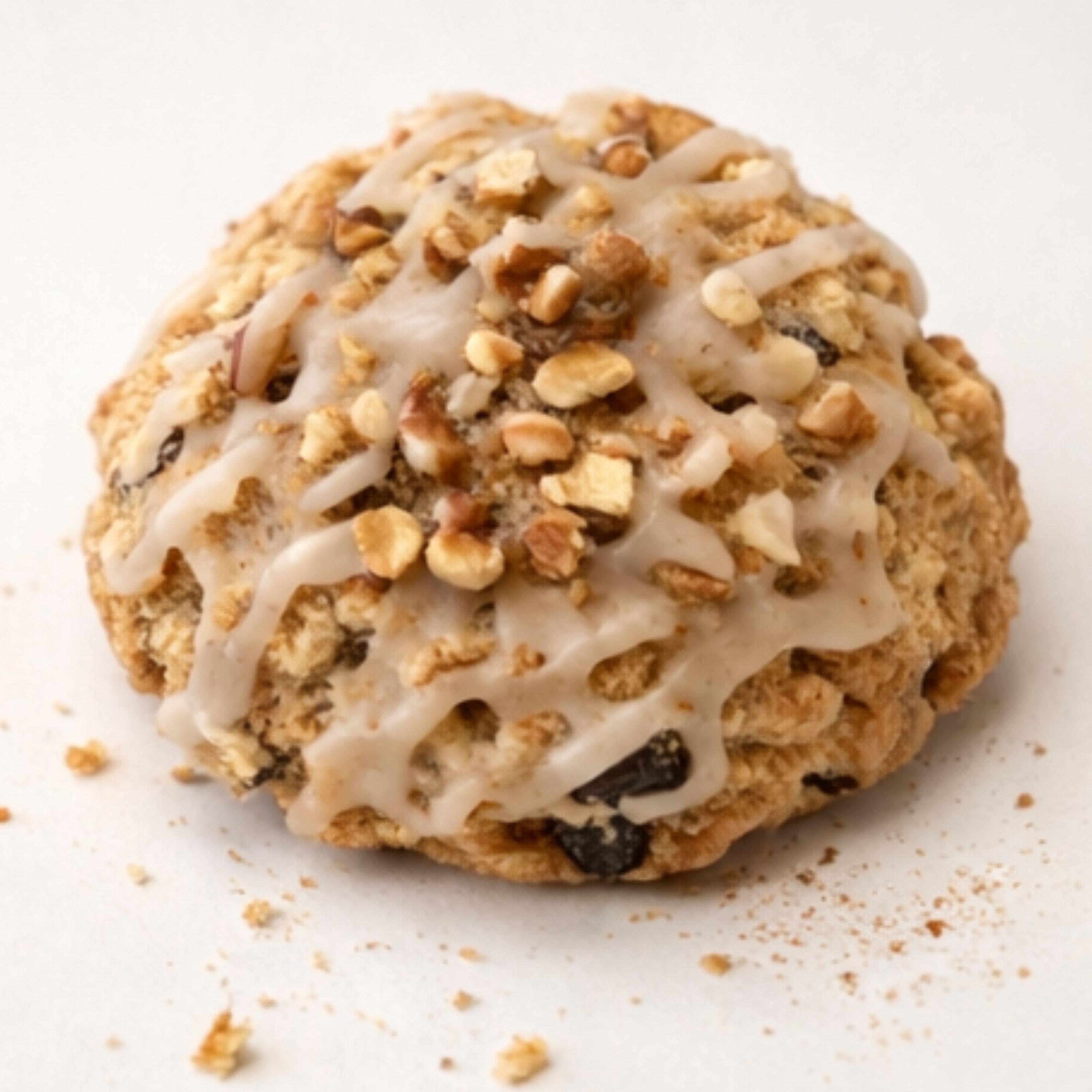 It all starts with a comforting classic, soft oatmeal raisin cookie and then finished with a light vanilla glaze drizzle and topped with cinnamon and your choice of walnuts or toasted pecans.
