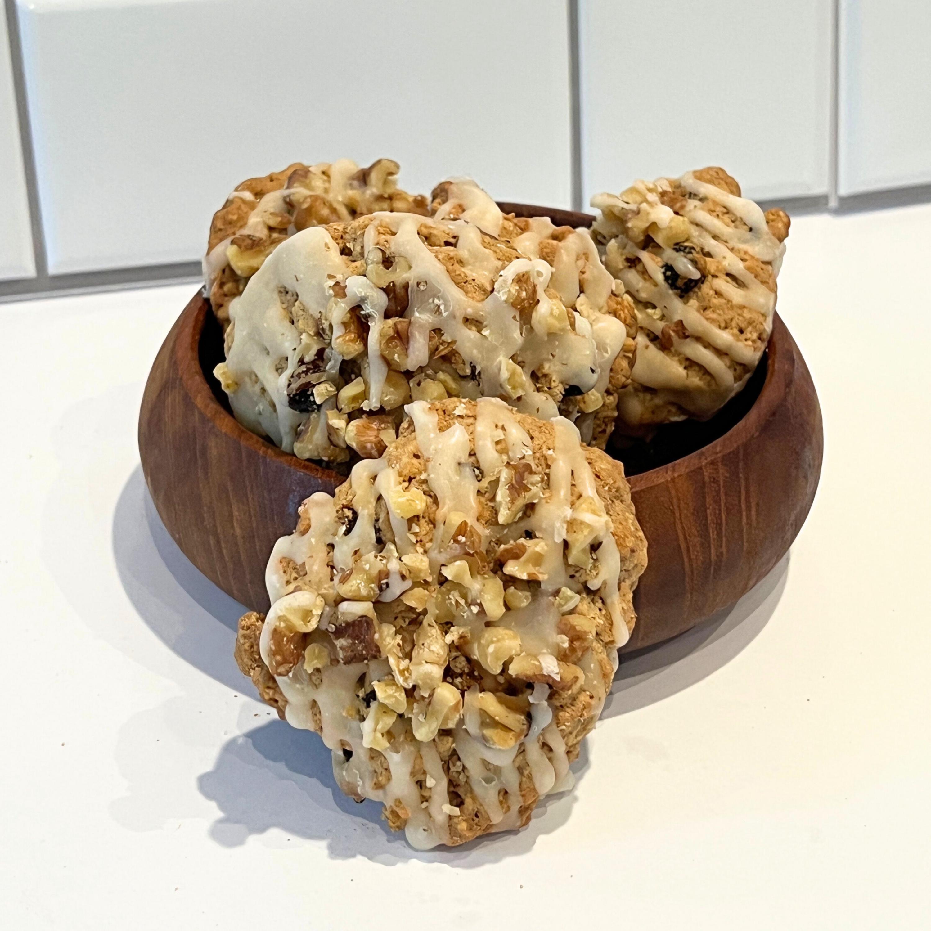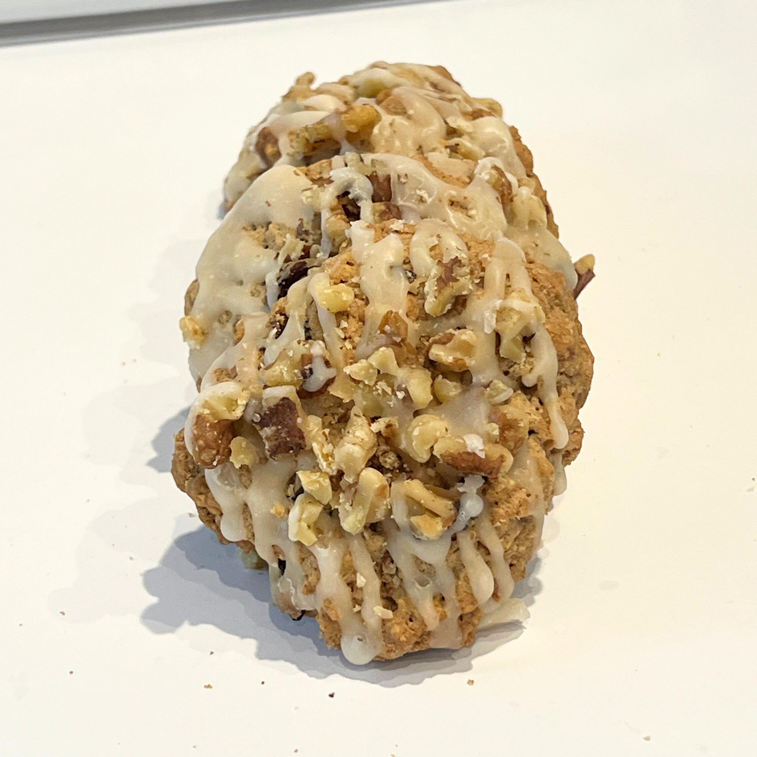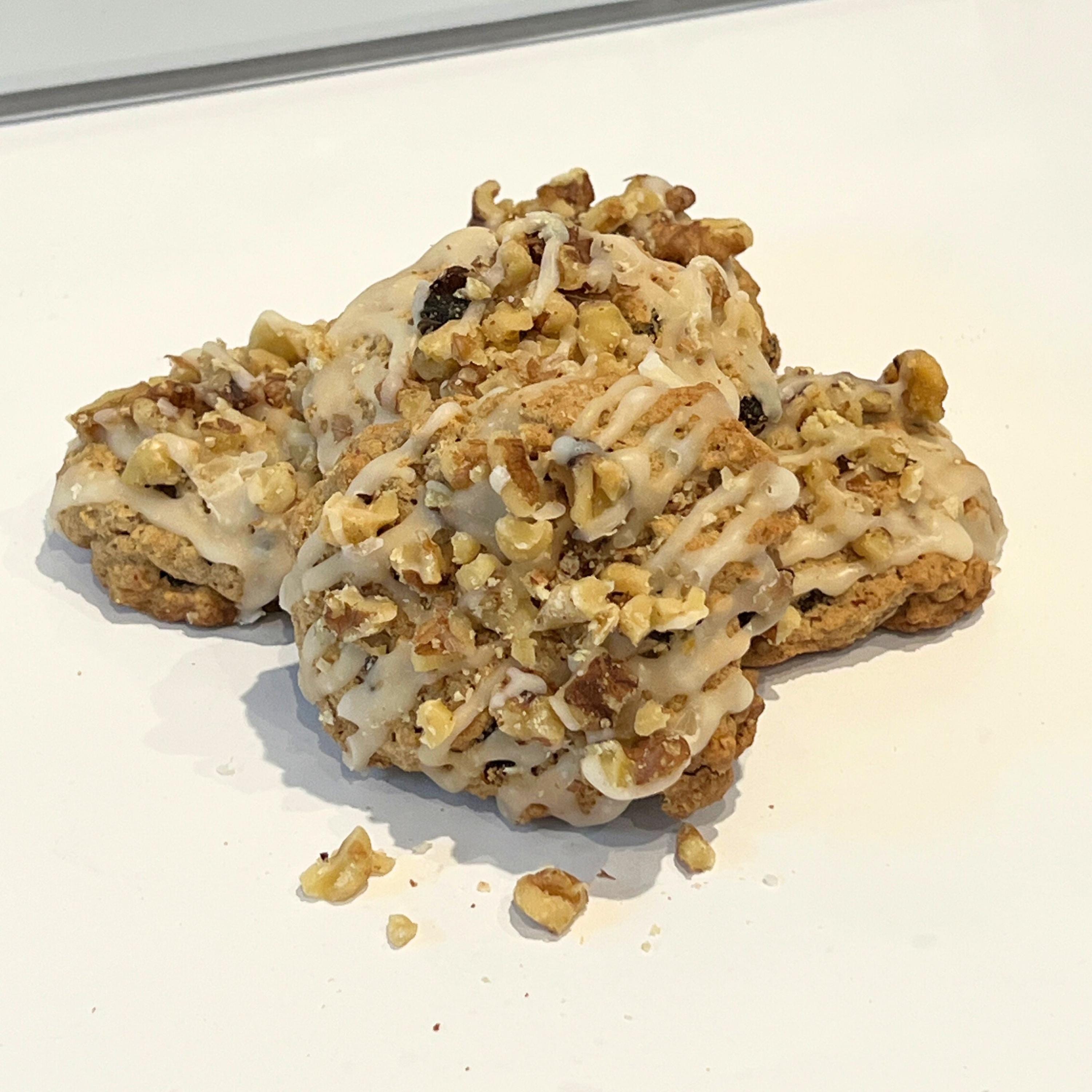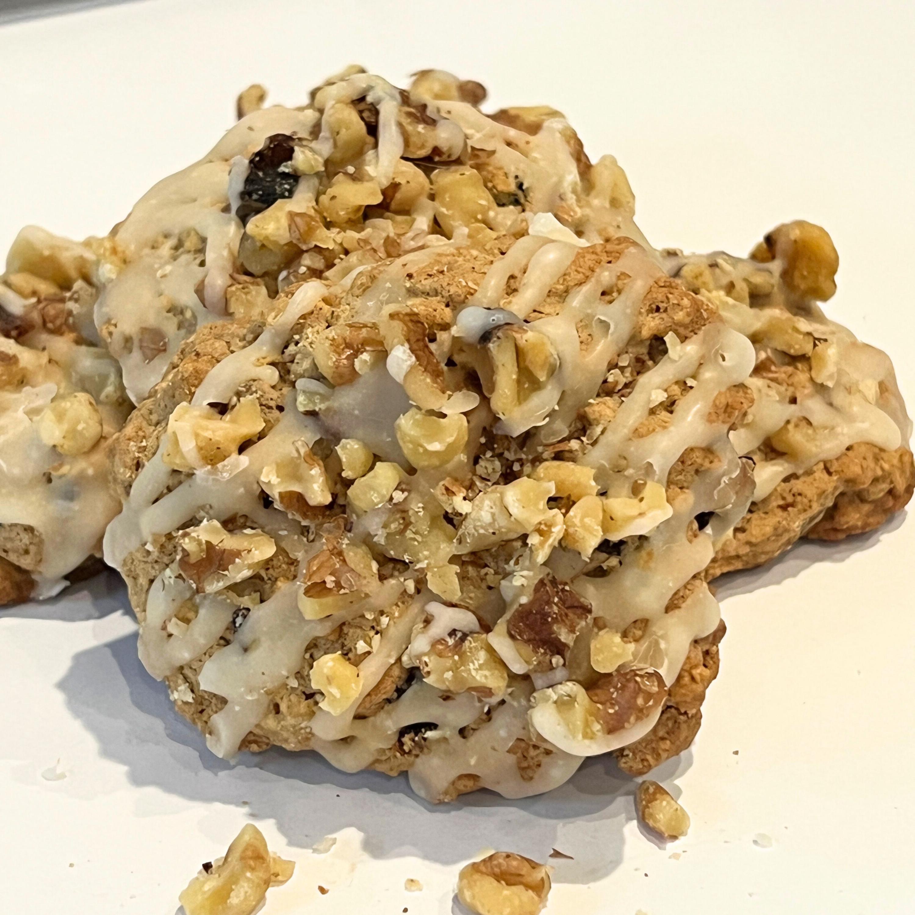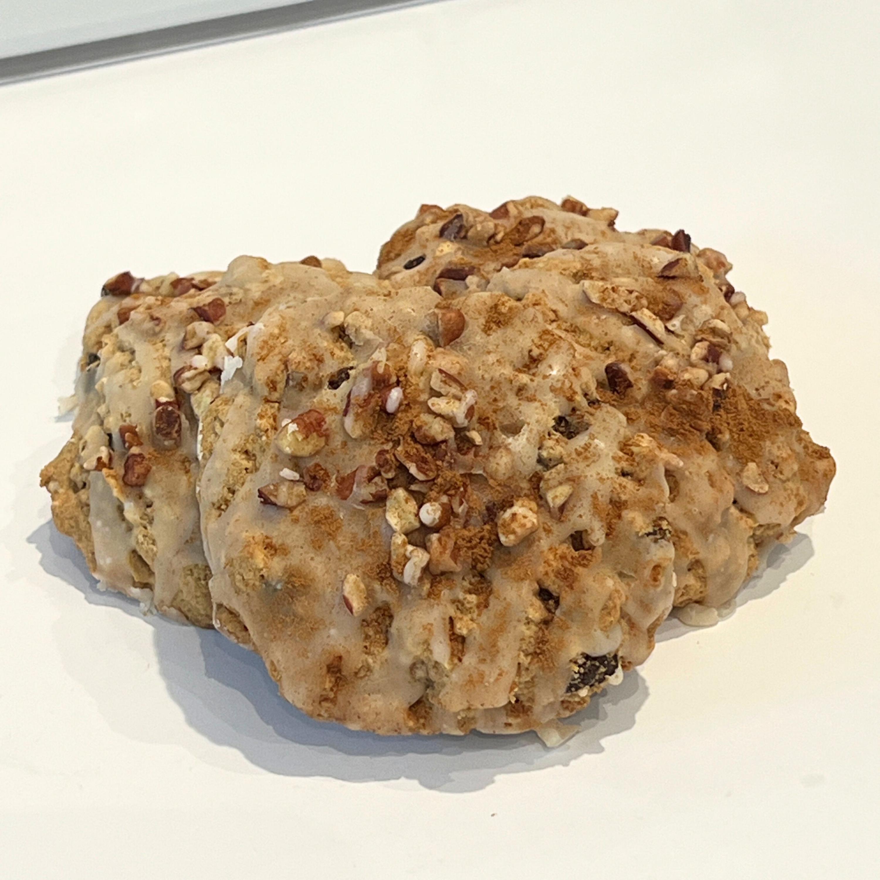 It all starts with a comforting classic, soft oatmeal raisin cookie and then finished with a light vanilla glaze drizzle and topped with cinnamon and your choice of walnuts or toasted pecans.