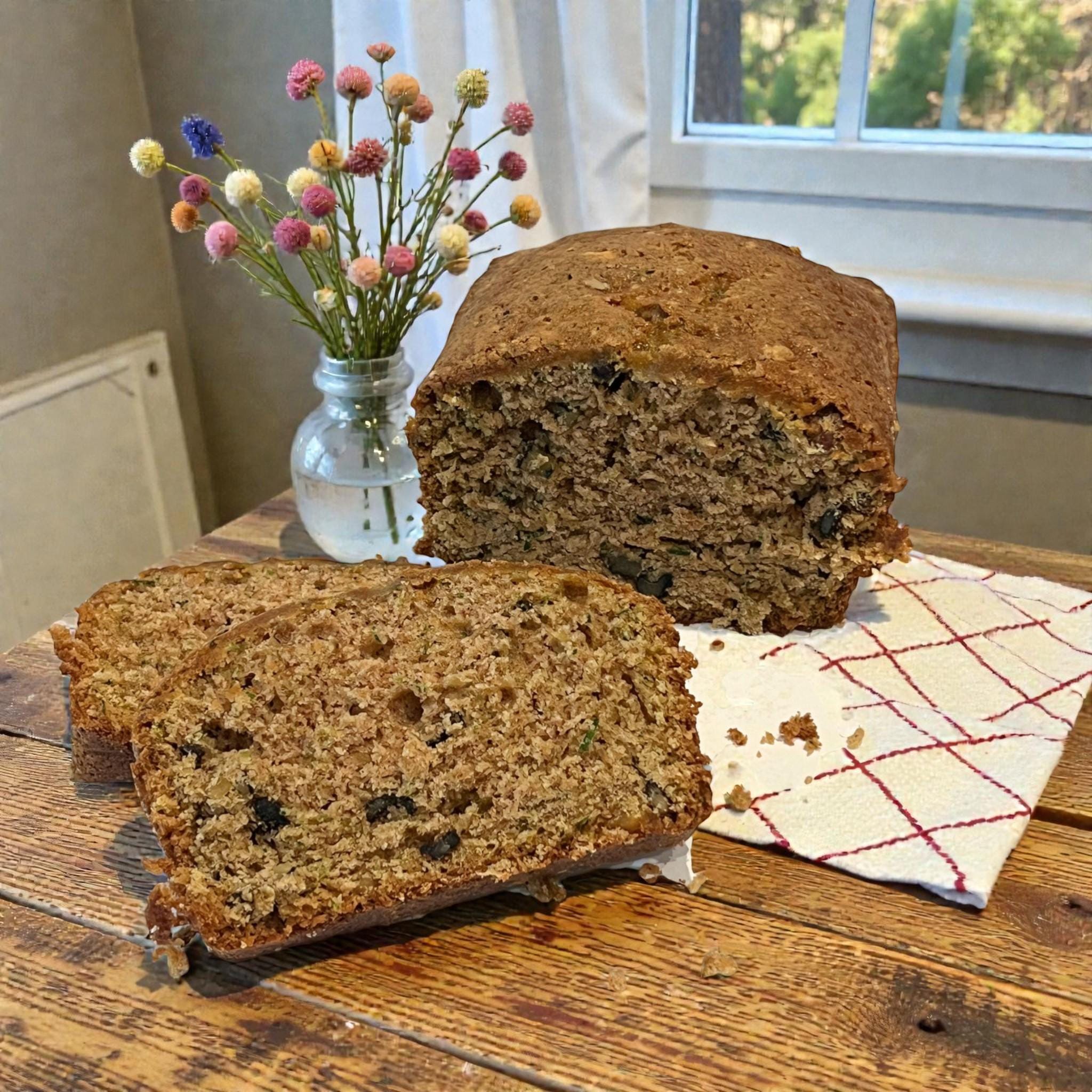 Moist, tender zucchini bread made from scratch and baked fresh. Available plain or with your choice of walnuts or toasted pecans for added texture and richness. The perfect bread for a late-night snack, with tea, breakfast and just anytime.